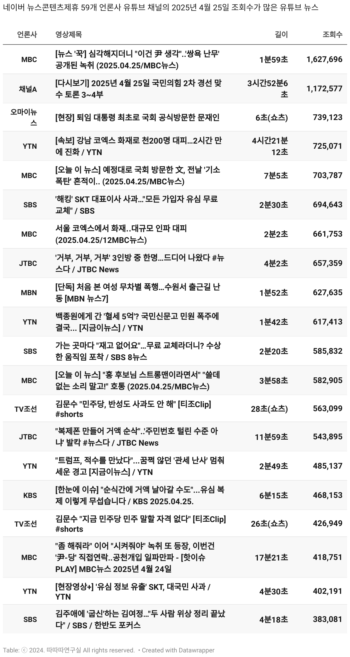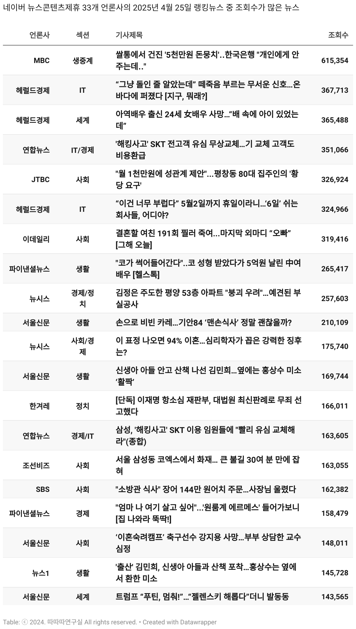 *데이터 수집 기간 : 2024년 6월 10일 *데이터 수집 대상 : 네이버 뉴스콘텐츠제휴 60개 언론사. 종합일간지 10개(경향신문, 국민일보, 동아일보, 문화일보, 서울신문, 세계일보, 조선일보, 중앙일보, 한겨레신문, 한국일보), 방송/통신사 14개(뉴스1, 뉴시스, 연합뉴스, 연합뉴스TV, 채널A, 한국경제TV, JTBC, KBS, MBC, MBN, SBS, SBS BIZ, TV조선, YTN), 경제지 11개(매일경제, 머니투데이, 비즈워치, 서울경제, 아시아경제, 이데일리, 조선비즈, 조세일보, 파이낸셜뉴스, 한국경제(유튜브제외), 헤럴드경제) 인터넷 8개(노컷뉴스, 더팩트, 데일리안, 머니S, 미디어오늘, 아이뉴스24, 오마이뉴스, 프레시안), IT 5개(디지털데일리,디지털타임스, 블로터, 전자신문, 지디넷코리아), 지역 12개(강원도민일보, 강원일보, 경기일보, 국제신문, 대구MBC, 대전일보, 매일신문, 부산일보, 전주MBC, CJB청주방송, JIBS, kbc광주방송)