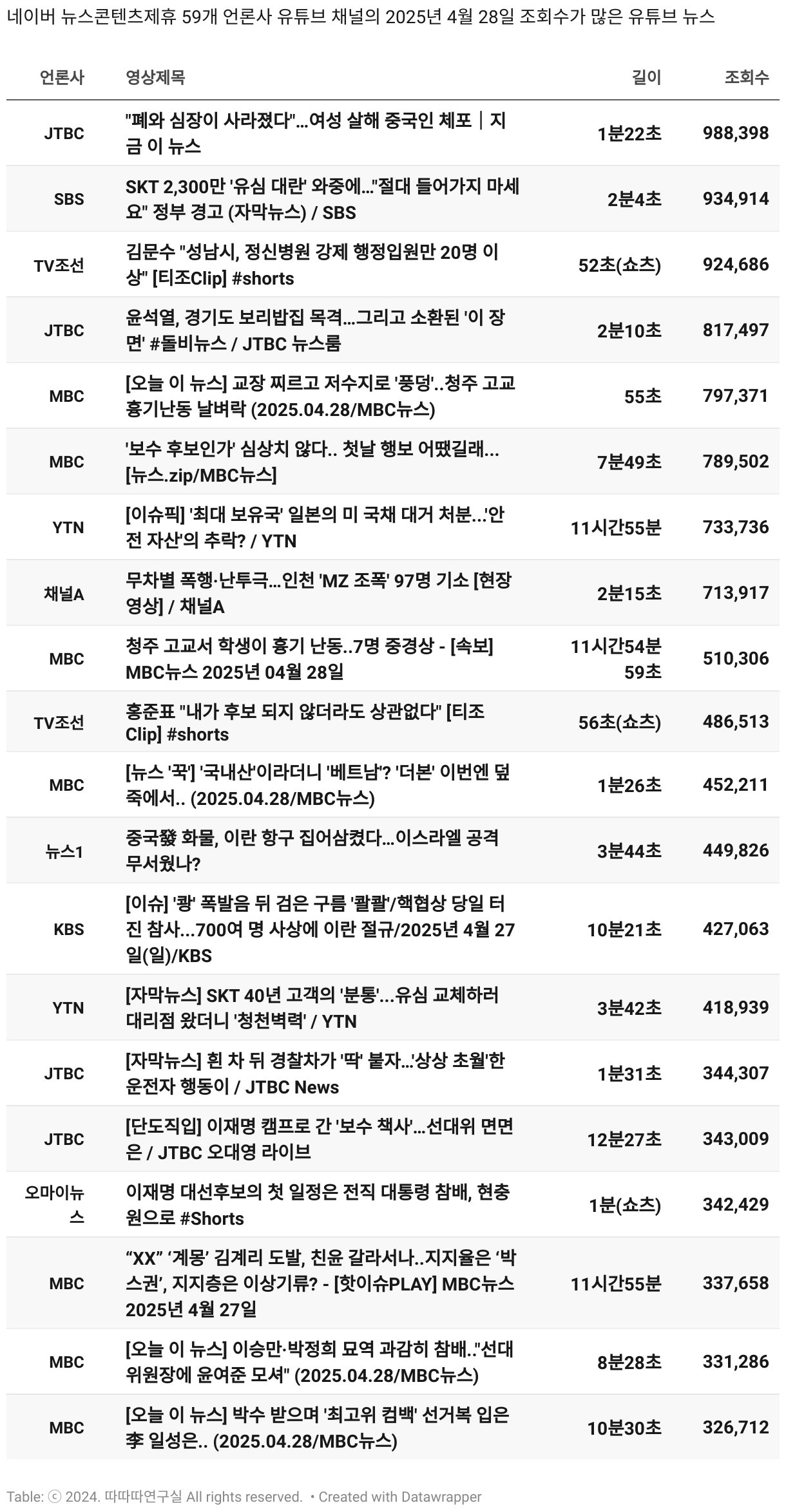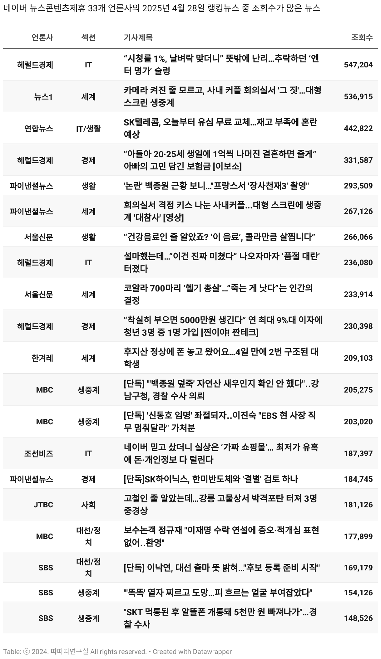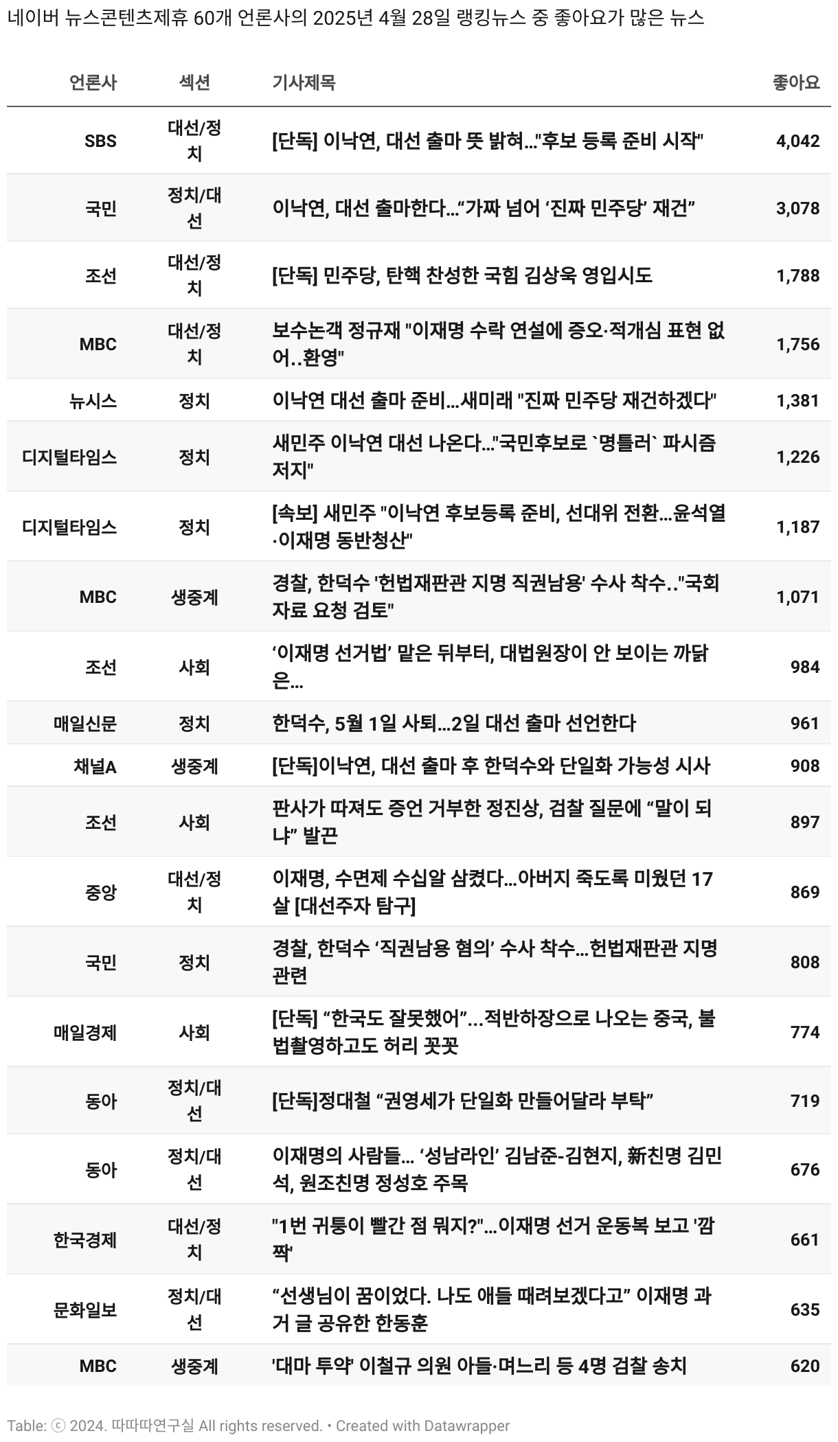 *데이터 수집 기간 : 2024년 6월 10일 *데이터 수집 대상 : 네이버 뉴스콘텐츠제휴 60개 언론사. 종합일간지 10개(경향신문, 국민일보, 동아일보, 문화일보, 서울신문, 세계일보, 조선일보, 중앙일보, 한겨레신문, 한국일보), 방송/통신사 14개(뉴스1, 뉴시스, 연합뉴스, 연합뉴스TV, 채널A, 한국경제TV, JTBC, KBS, MBC, MBN, SBS, SBS BIZ, TV조선, YTN), 경제지 11개(매일경제, 머니투데이, 비즈워치, 서울경제, 아시아경제, 이데일리, 조선비즈, 조세일보, 파이낸셜뉴스, 한국경제(유튜브제외), 헤럴드경제) 인터넷 8개(노컷뉴스, 더팩트, 데일리안, 머니S, 미디어오늘, 아이뉴스24, 오마이뉴스, 프레시안), IT 5개(디지털데일리,디지털타임스, 블로터, 전자신문, 지디넷코리아), 지역 12개(강원도민일보, 강원일보, 경기일보, 국제신문, 대구MBC, 대전일보, 매일신문, 부산일보, 전주MBC, CJB청주방송, JIBS, kbc광주방송)