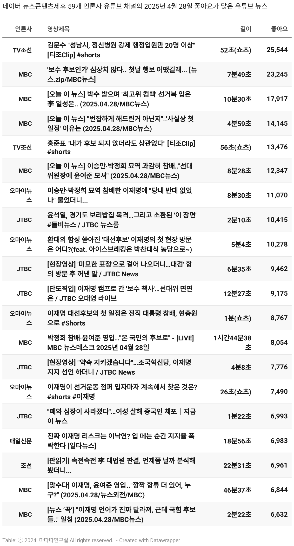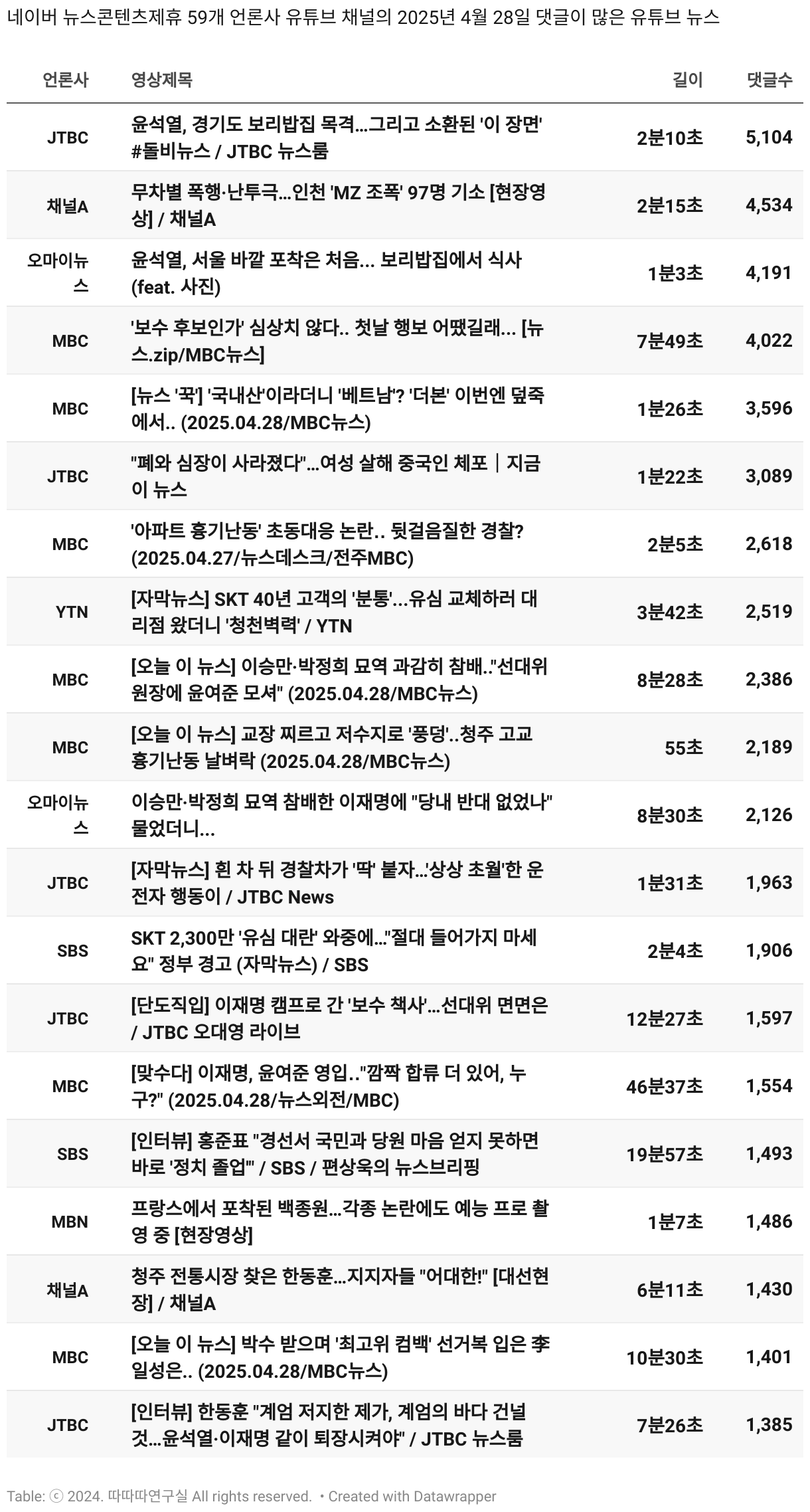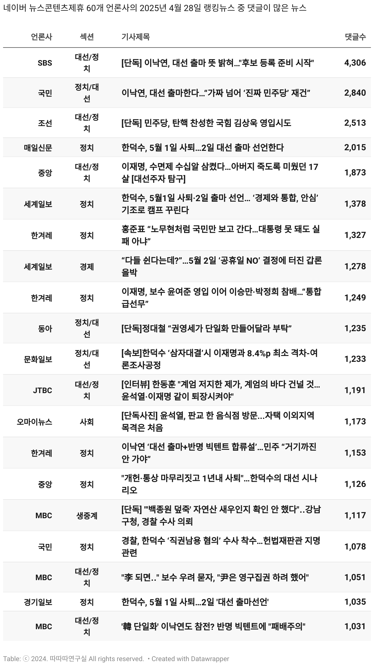 *데이터 수집 기간 : 2024년 6월 10일 *데이터 수집 대상 : 네이버 뉴스콘텐츠제휴 60개 언론사. 종합일간지 10개(경향신문, 국민일보, 동아일보, 문화일보, 서울신문, 세계일보, 조선일보, 중앙일보, 한겨레신문, 한국일보), 방송/통신사 14개(뉴스1, 뉴시스, 연합뉴스, 연합뉴스TV, 채널A, 한국경제TV, JTBC, KBS, MBC, MBN, SBS, SBS BIZ, TV조선, YTN), 경제지 11개(매일경제, 머니투데이, 비즈워치, 서울경제, 아시아경제, 이데일리, 조선비즈, 조세일보, 파이낸셜뉴스, 한국경제(유튜브제외), 헤럴드경제) 인터넷 8개(노컷뉴스, 더팩트, 데일리안, 머니S, 미디어오늘, 아이뉴스24, 오마이뉴스, 프레시안), IT 5개(디지털데일리,디지털타임스, 블로터, 전자신문, 지디넷코리아), 지역 12개(강원도민일보, 강원일보, 경기일보, 국제신문, 대구MBC, 대전일보, 매일신문, 부산일보, 전주MBC, CJB청주방송, JIBS, kbc광주방송)