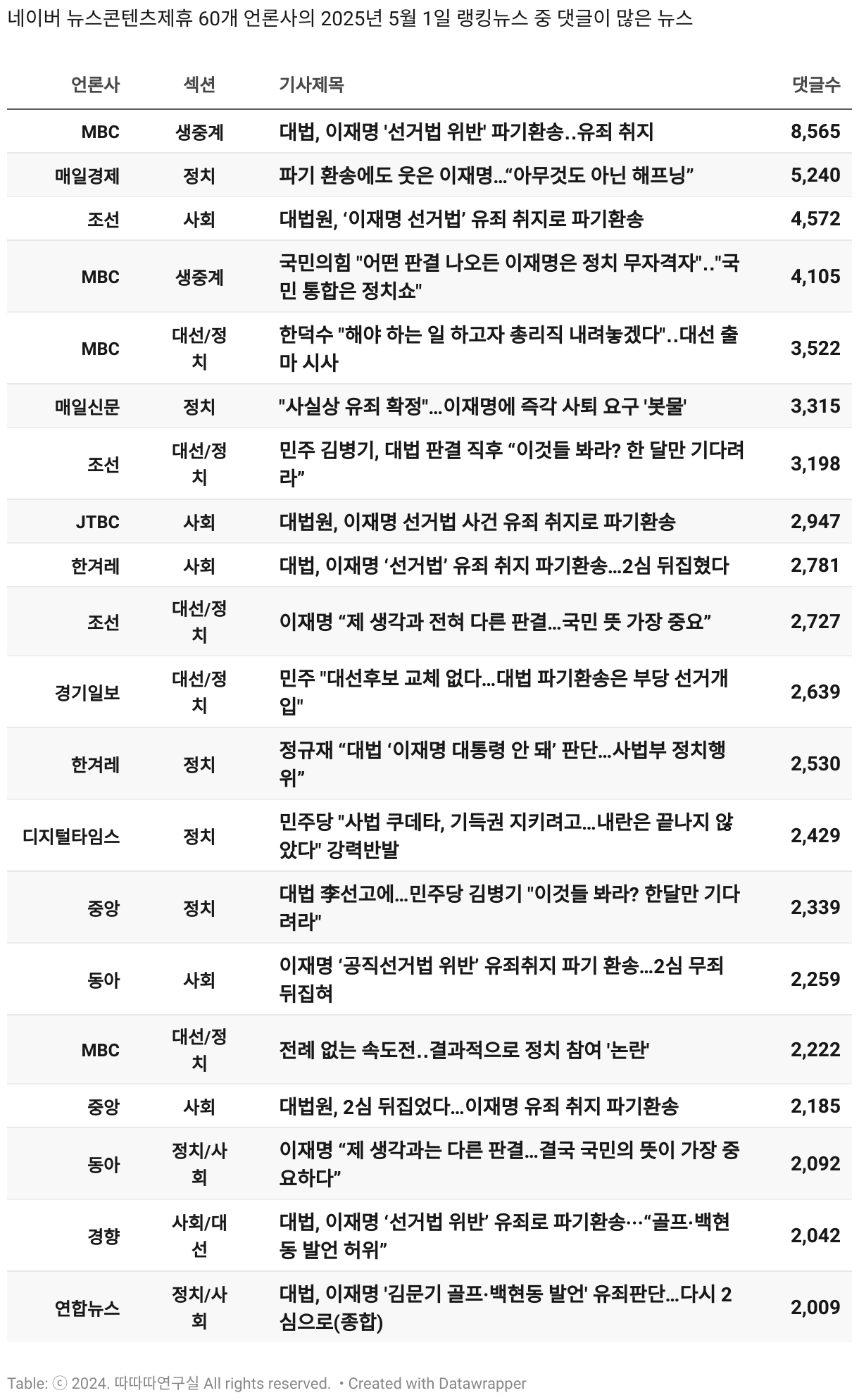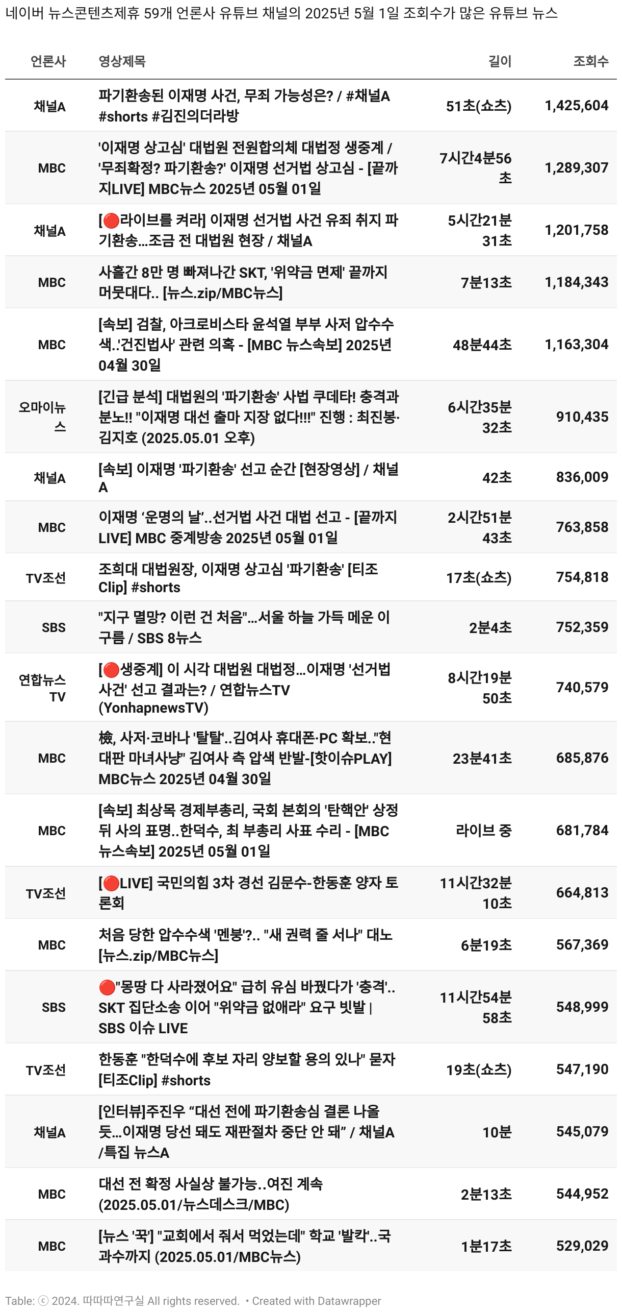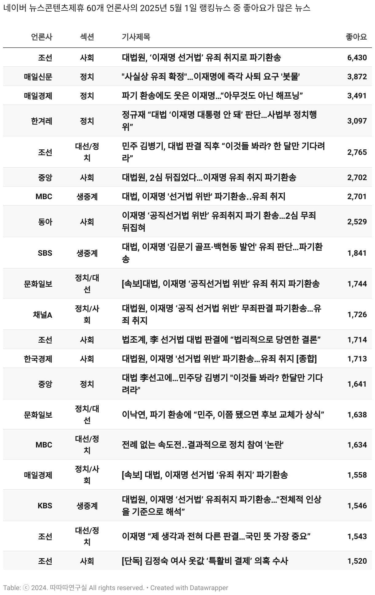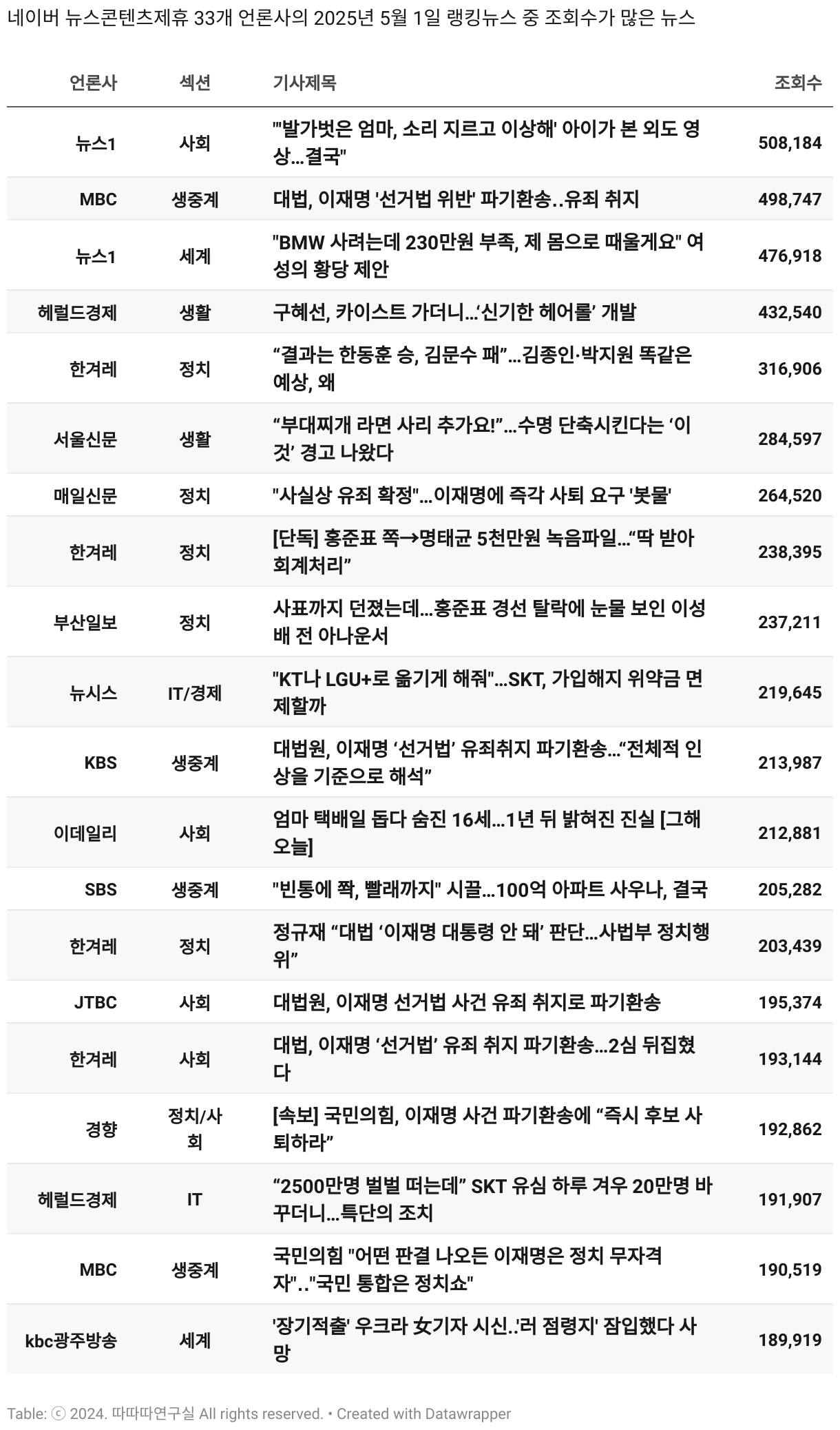 *데이터 수집 기간 : 2024년 6월 10일 *데이터 수집 대상 : 네이버 뉴스콘텐츠제휴 60개 언론사. 종합일간지 10개(경향신문, 국민일보, 동아일보, 문화일보, 서울신문, 세계일보, 조선일보, 중앙일보, 한겨레신문, 한국일보), 방송/통신사 14개(뉴스1, 뉴시스, 연합뉴스, 연합뉴스TV, 채널A, 한국경제TV, JTBC, KBS, MBC, MBN, SBS, SBS BIZ, TV조선, YTN), 경제지 11개(매일경제, 머니투데이, 비즈워치, 서울경제, 아시아경제, 이데일리, 조선비즈, 조세일보, 파이낸셜뉴스, 한국경제(유튜브제외), 헤럴드경제) 인터넷 8개(노컷뉴스, 더팩트, 데일리안, 머니S, 미디어오늘, 아이뉴스24, 오마이뉴스, 프레시안), IT 5개(디지털데일리,디지털타임스, 블로터, 전자신문, 지디넷코리아), 지역 12개(강원도민일보, 강원일보, 경기일보, 국제신문, 대구MBC, 대전일보, 매일신문, 부산일보, 전주MBC, CJB청주방송, JIBS, kbc광주방송)
