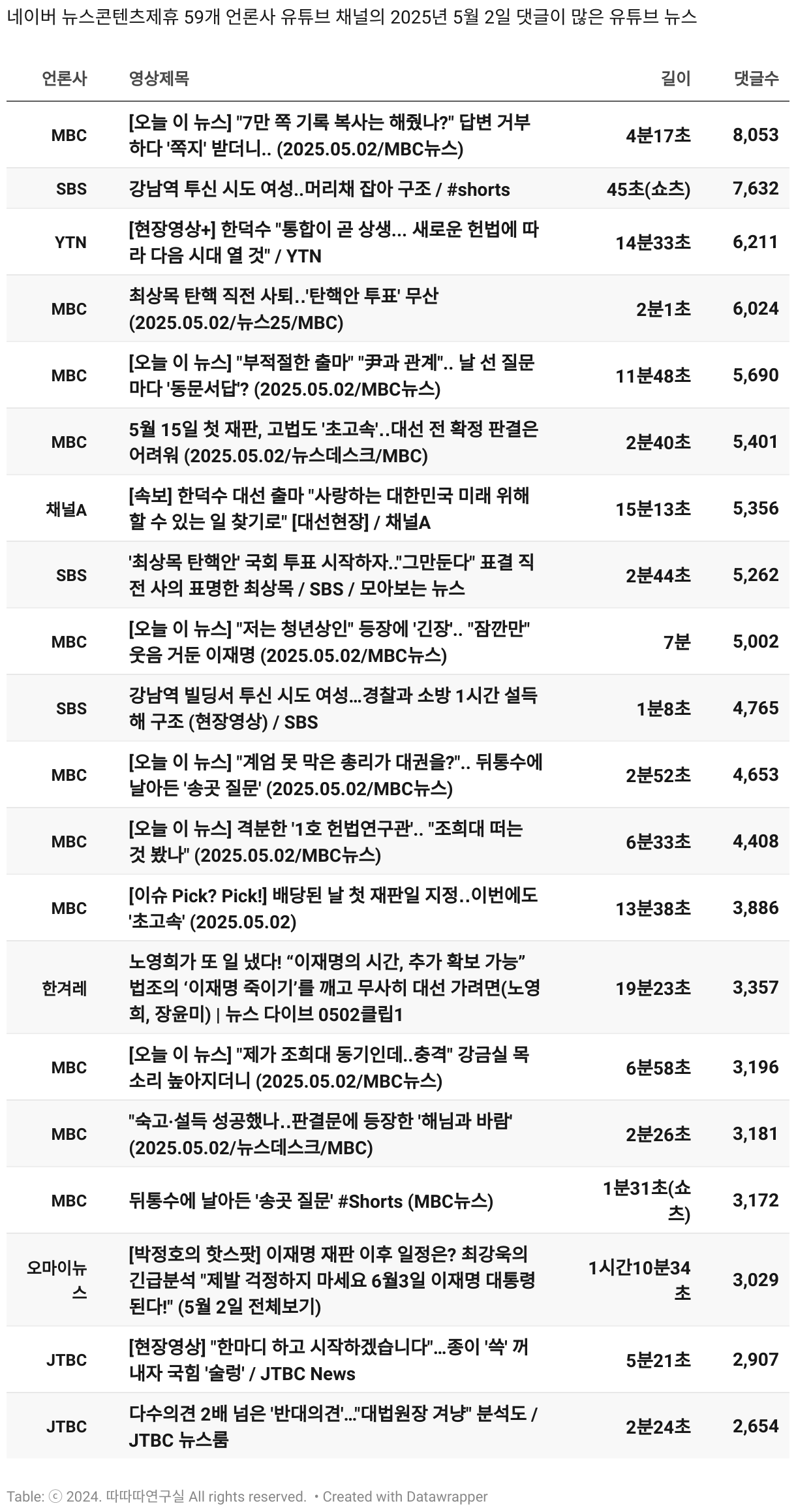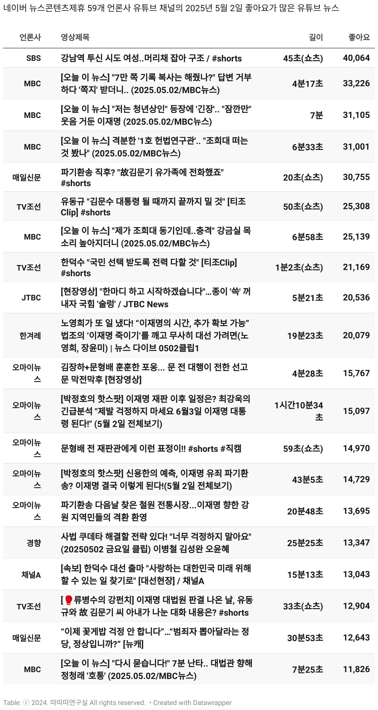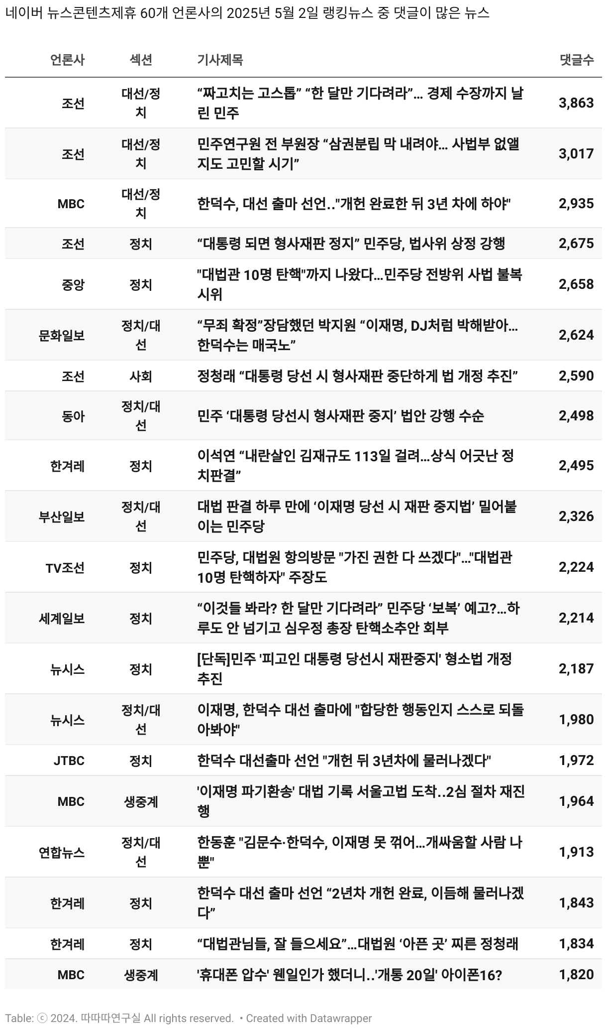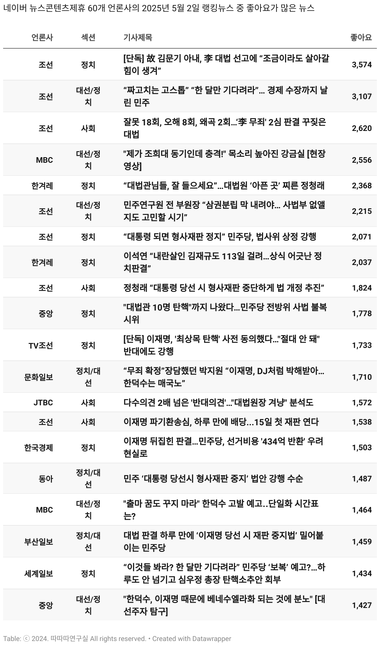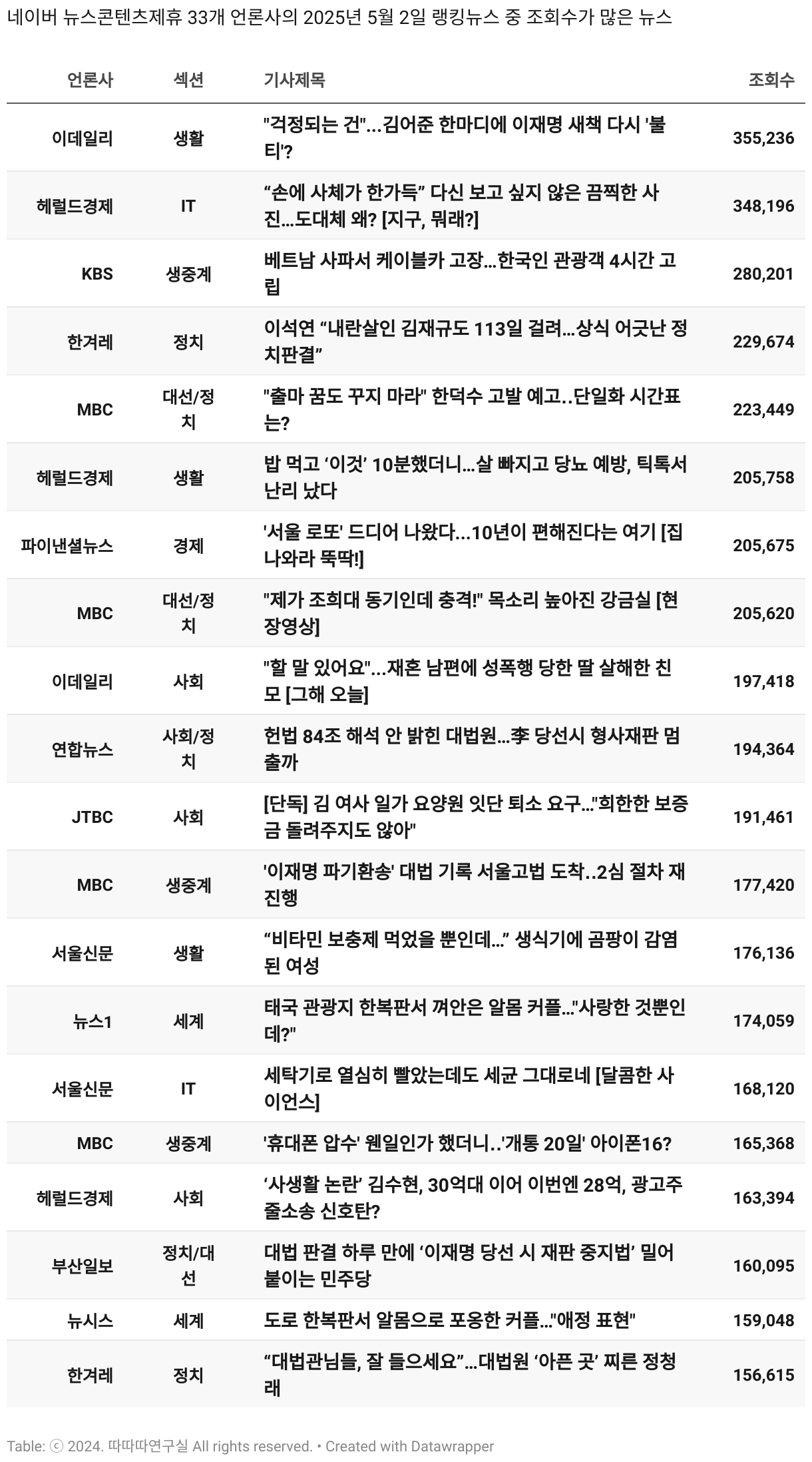 *데이터 수집 기간 : 2024년 6월 10일 *데이터 수집 대상 : 네이버 뉴스콘텐츠제휴 60개 언론사. 종합일간지 10개(경향신문, 국민일보, 동아일보, 문화일보, 서울신문, 세계일보, 조선일보, 중앙일보, 한겨레신문, 한국일보), 방송/통신사 14개(뉴스1, 뉴시스, 연합뉴스, 연합뉴스TV, 채널A, 한국경제TV, JTBC, KBS, MBC, MBN, SBS, SBS BIZ, TV조선, YTN), 경제지 11개(매일경제, 머니투데이, 비즈워치, 서울경제, 아시아경제, 이데일리, 조선비즈, 조세일보, 파이낸셜뉴스, 한국경제(유튜브제외), 헤럴드경제) 인터넷 8개(노컷뉴스, 더팩트, 데일리안, 머니S, 미디어오늘, 아이뉴스24, 오마이뉴스, 프레시안), IT 5개(디지털데일리,디지털타임스, 블로터, 전자신문, 지디넷코리아), 지역 12개(강원도민일보, 강원일보, 경기일보, 국제신문, 대구MBC, 대전일보, 매일신문, 부산일보, 전주MBC, CJB청주방송, JIBS, kbc광주방송)