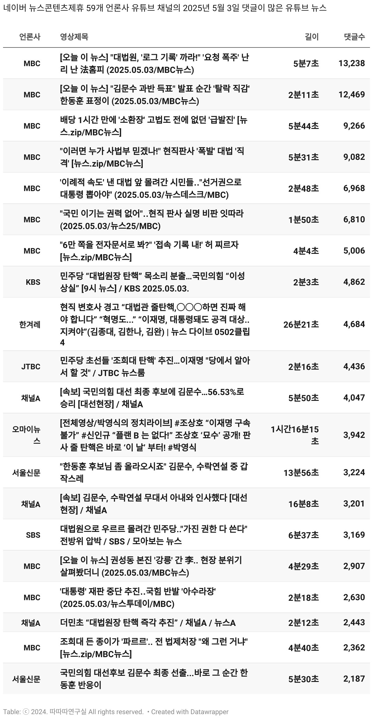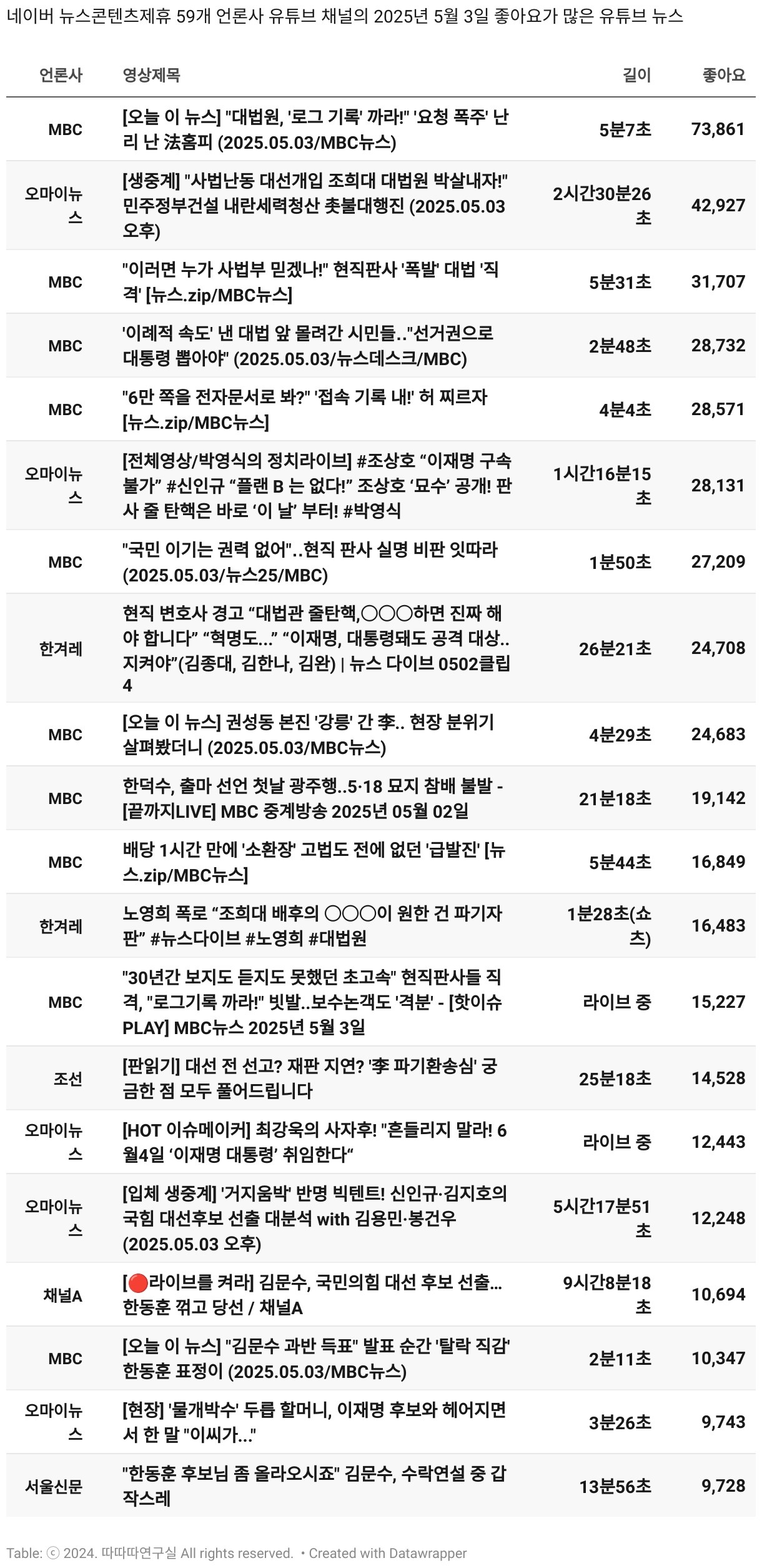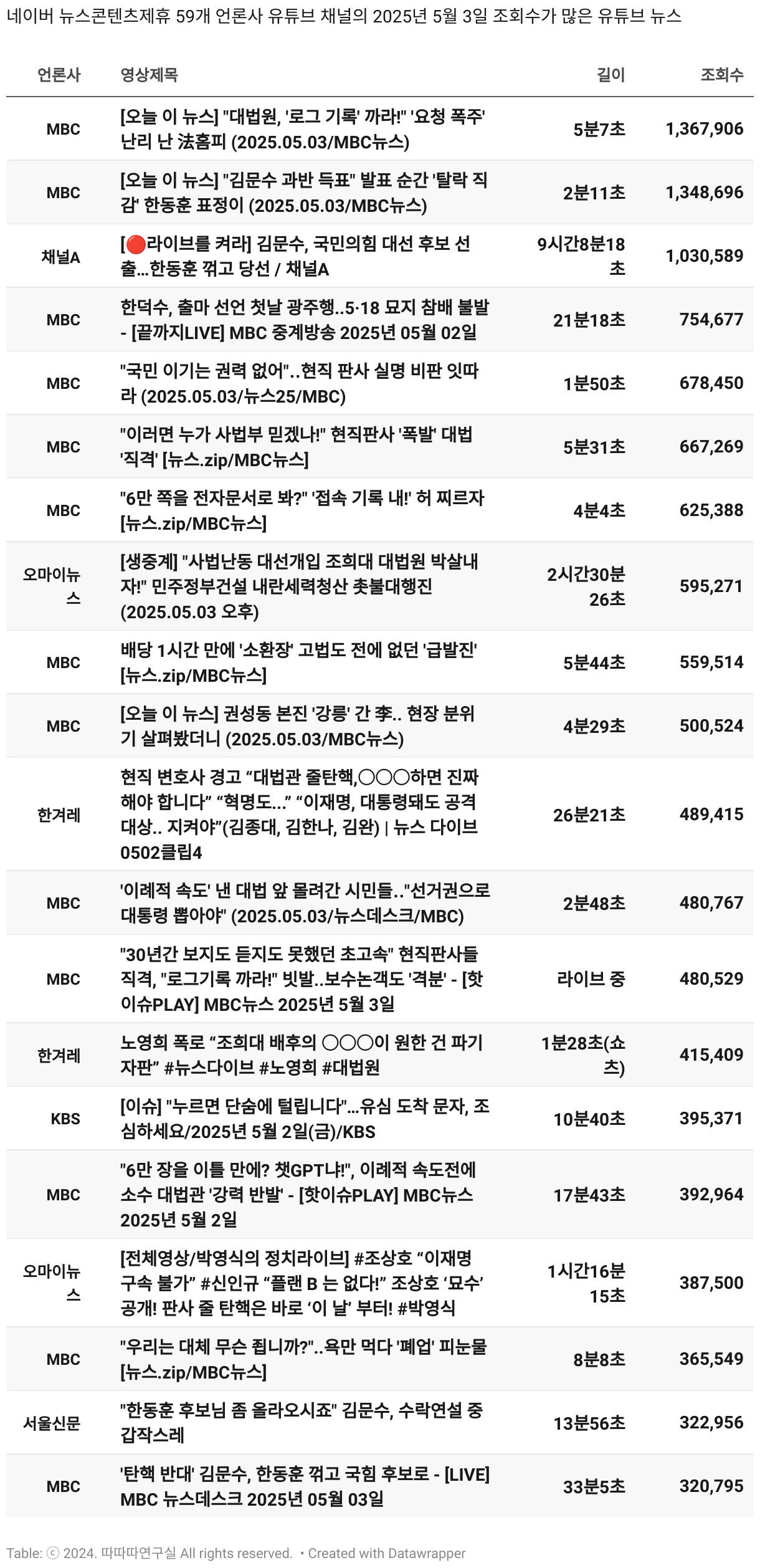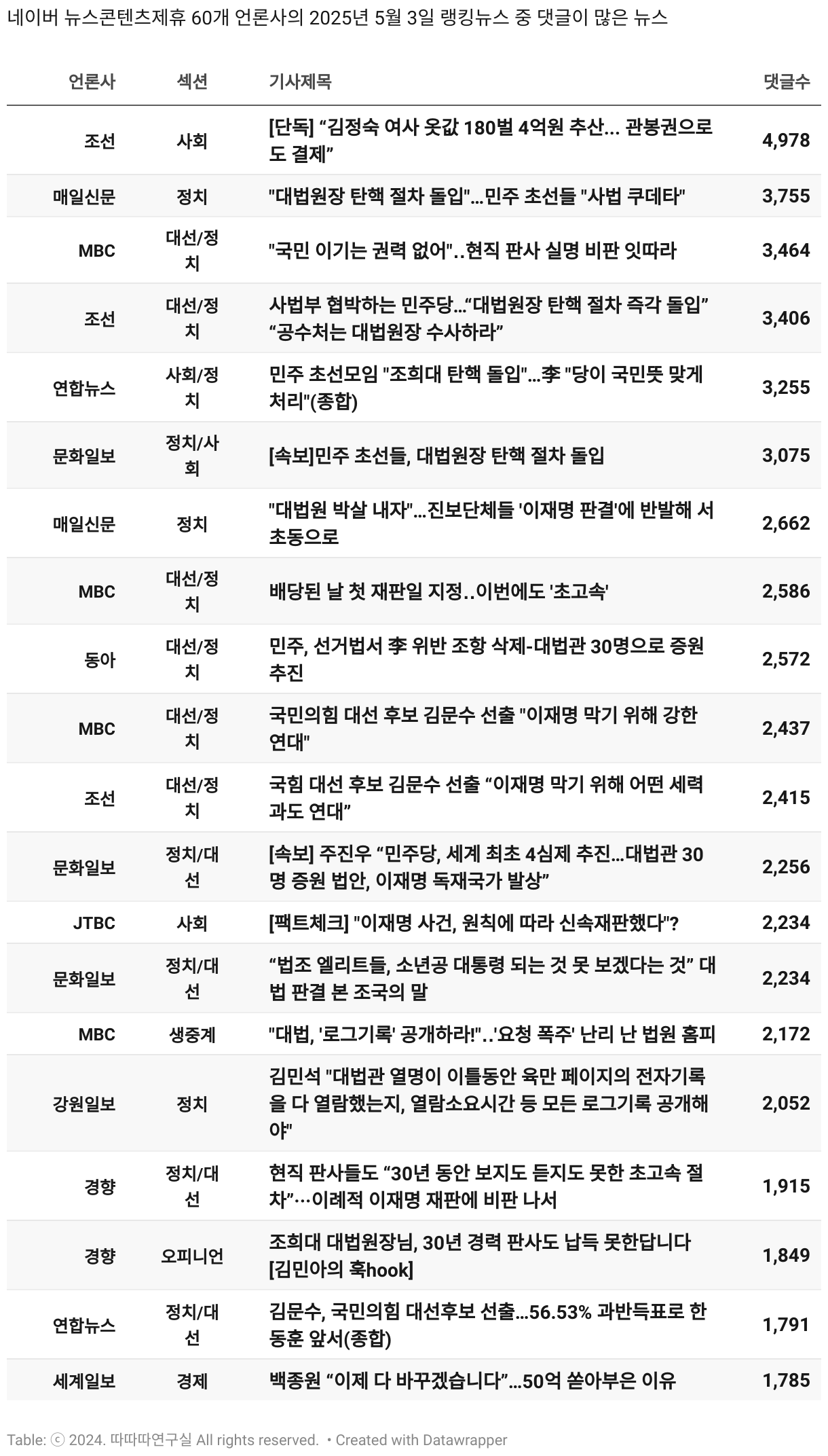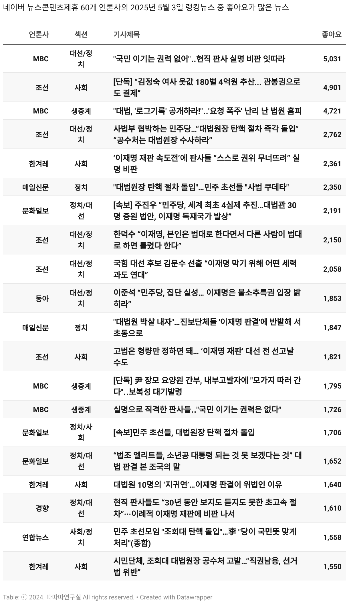 *데이터 수집 기간 : 2024년 6월 10일 *데이터 수집 대상 : 네이버 뉴스콘텐츠제휴 60개 언론사. 종합일간지 10개(경향신문, 국민일보, 동아일보, 문화일보, 서울신문, 세계일보, 조선일보, 중앙일보, 한겨레신문, 한국일보), 방송/통신사 14개(뉴스1, 뉴시스, 연합뉴스, 연합뉴스TV, 채널A, 한국경제TV, JTBC, KBS, MBC, MBN, SBS, SBS BIZ, TV조선, YTN), 경제지 11개(매일경제, 머니투데이, 비즈워치, 서울경제, 아시아경제, 이데일리, 조선비즈, 조세일보, 파이낸셜뉴스, 한국경제(유튜브제외), 헤럴드경제) 인터넷 8개(노컷뉴스, 더팩트, 데일리안, 머니S, 미디어오늘, 아이뉴스24, 오마이뉴스, 프레시안), IT 5개(디지털데일리,디지털타임스, 블로터, 전자신문, 지디넷코리아), 지역 12개(강원도민일보, 강원일보, 경기일보, 국제신문, 대구MBC, 대전일보, 매일신문, 부산일보, 전주MBC, CJB청주방송, JIBS, kbc광주방송)