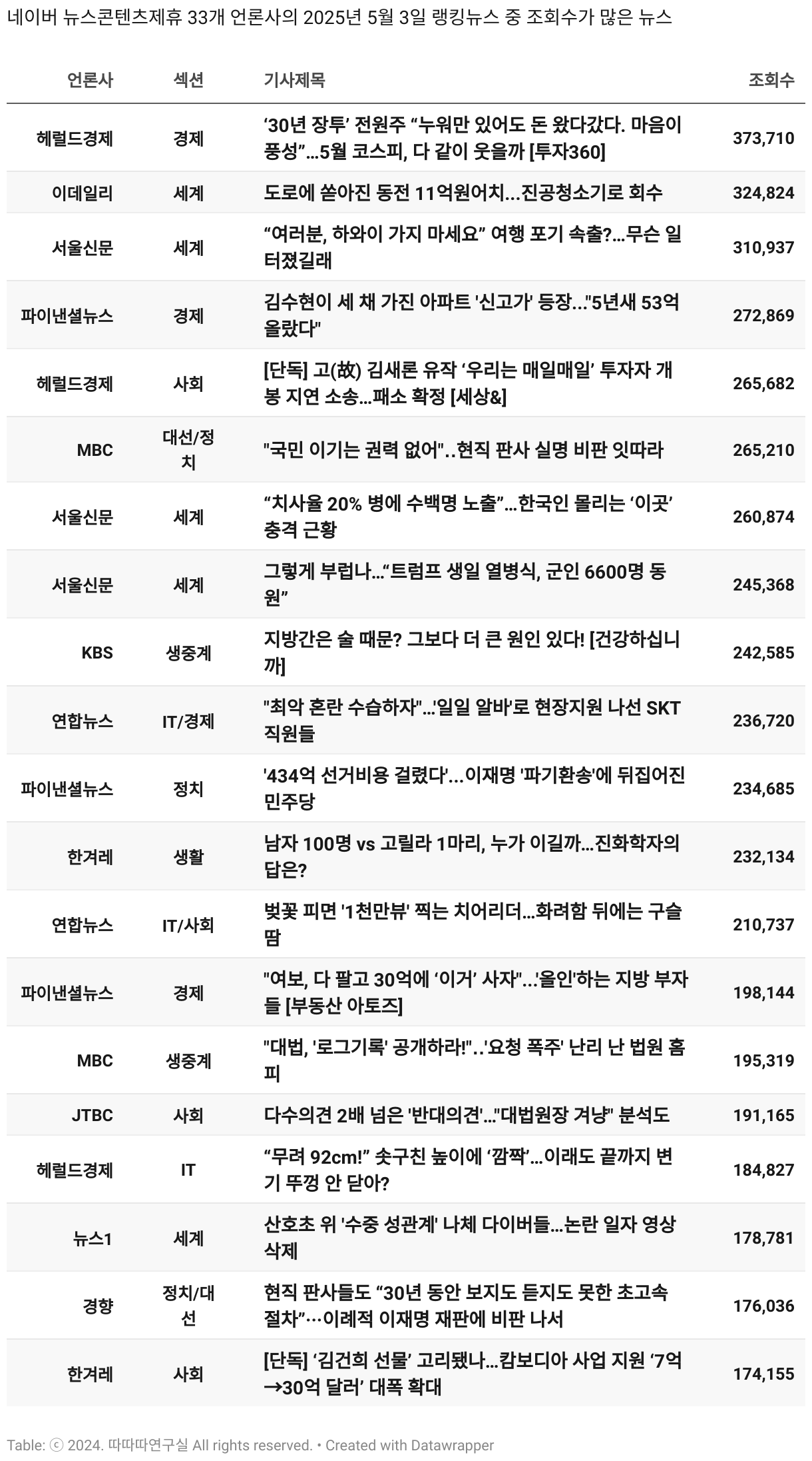 보도 시간대 기준 가장 흥한 기사 3건이 표시됩니다.