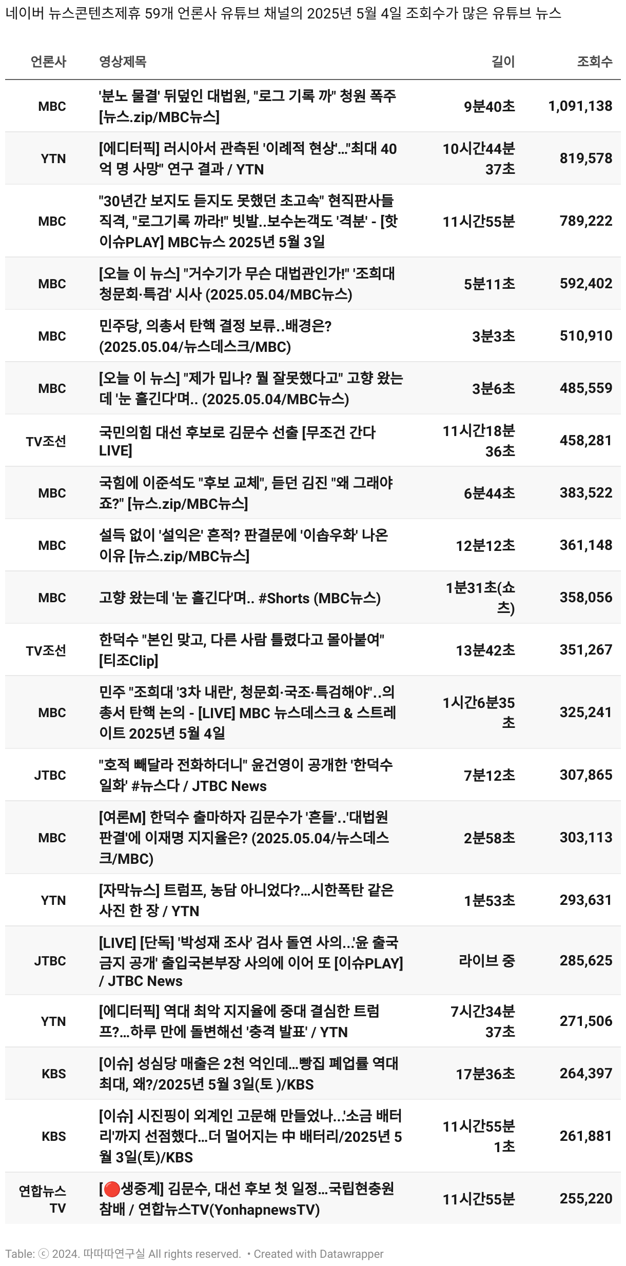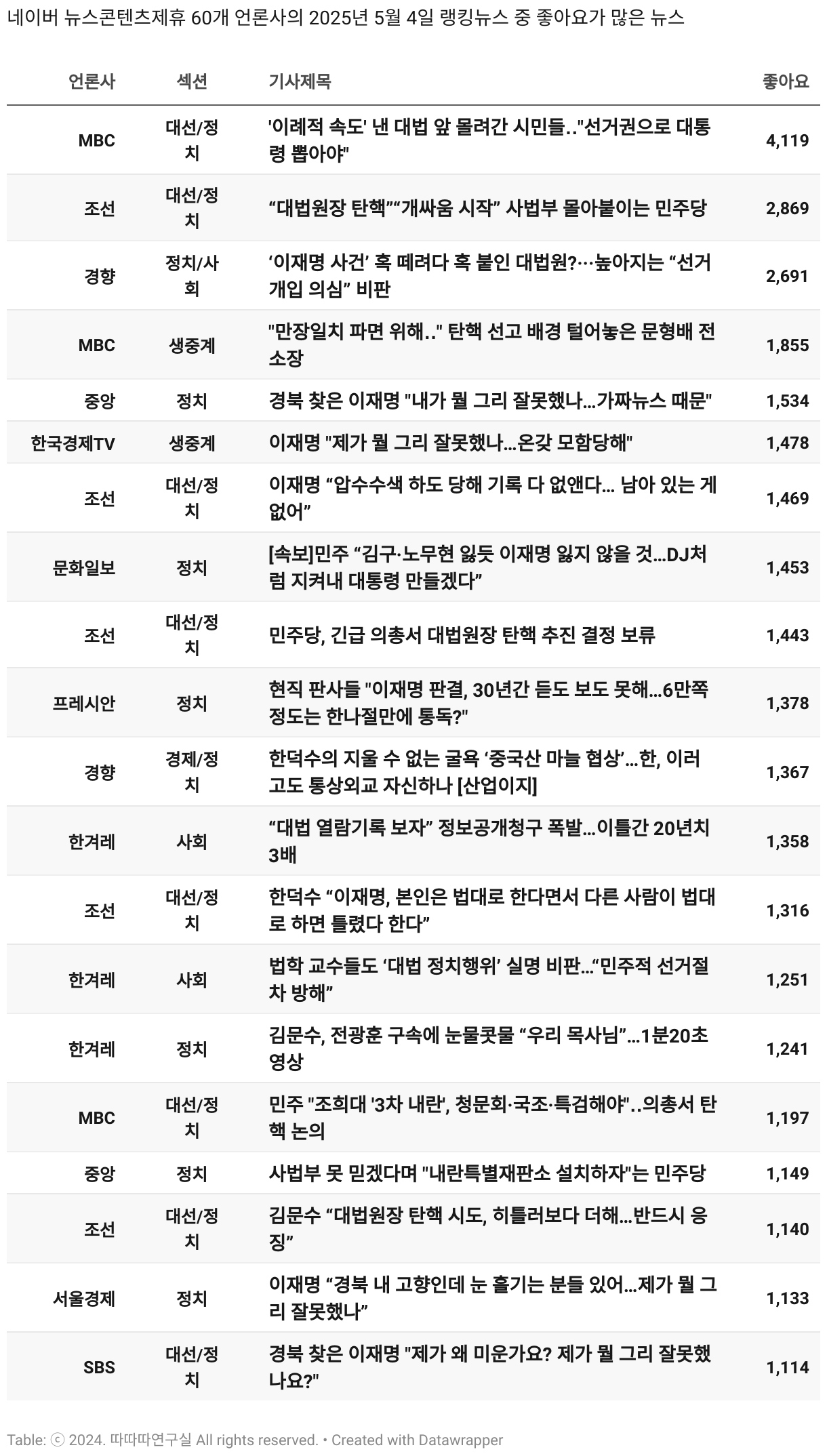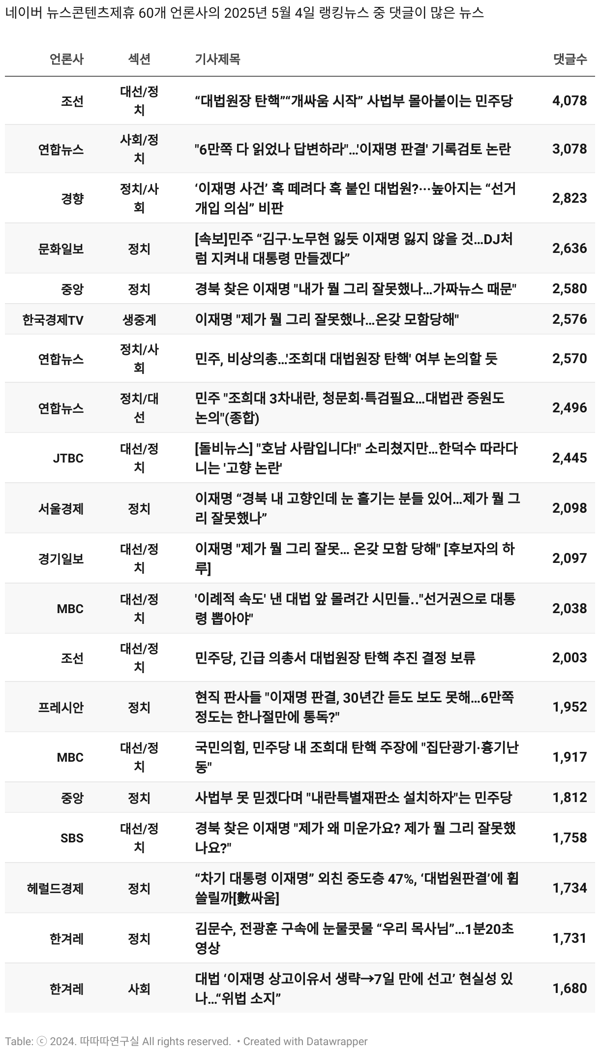 *데이터 수집 기간 : 2024년 6월 10일 *데이터 수집 대상 : 네이버 뉴스콘텐츠제휴 60개 언론사. 종합일간지 10개(경향신문, 국민일보, 동아일보, 문화일보, 서울신문, 세계일보, 조선일보, 중앙일보, 한겨레신문, 한국일보), 방송/통신사 14개(뉴스1, 뉴시스, 연합뉴스, 연합뉴스TV, 채널A, 한국경제TV, JTBC, KBS, MBC, MBN, SBS, SBS BIZ, TV조선, YTN), 경제지 11개(매일경제, 머니투데이, 비즈워치, 서울경제, 아시아경제, 이데일리, 조선비즈, 조세일보, 파이낸셜뉴스, 한국경제(유튜브제외), 헤럴드경제) 인터넷 8개(노컷뉴스, 더팩트, 데일리안, 머니S, 미디어오늘, 아이뉴스24, 오마이뉴스, 프레시안), IT 5개(디지털데일리,디지털타임스, 블로터, 전자신문, 지디넷코리아), 지역 12개(강원도민일보, 강원일보, 경기일보, 국제신문, 대구MBC, 대전일보, 매일신문, 부산일보, 전주MBC, CJB청주방송, JIBS, kbc광주방송)