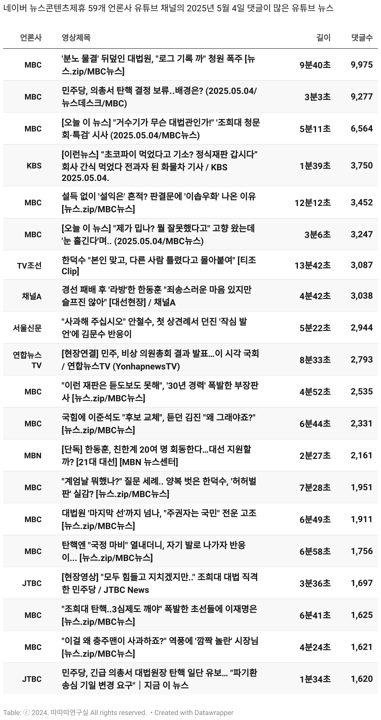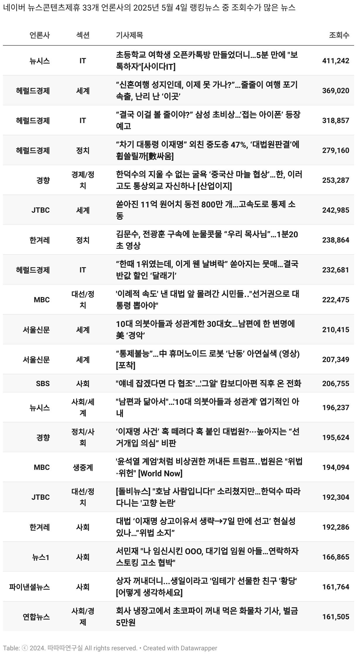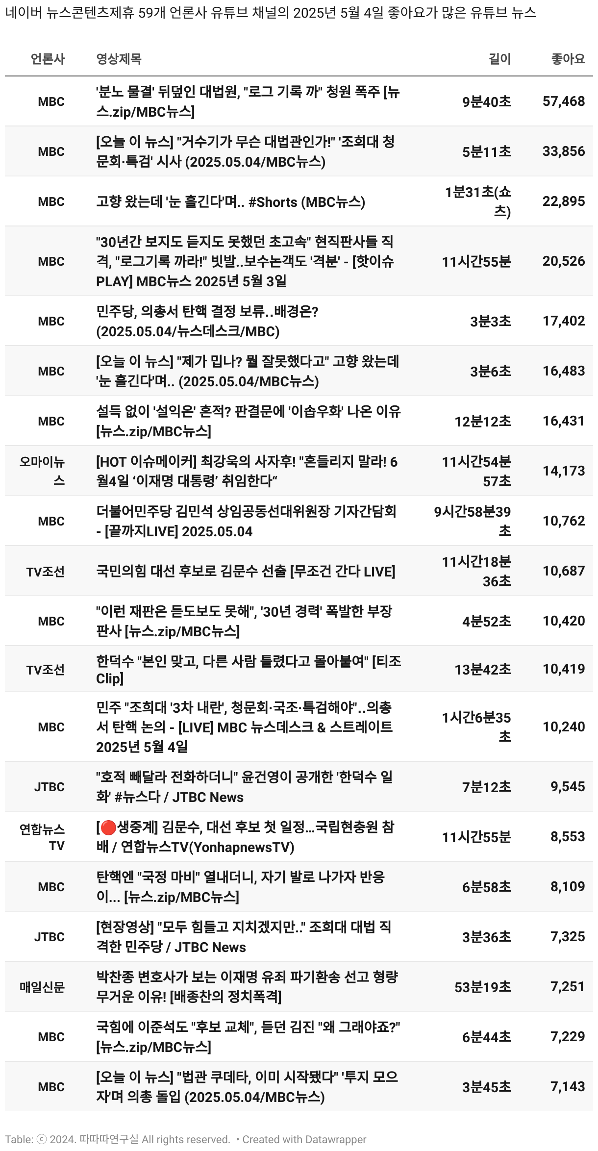 *데이터 수집 기간 : 2024년 6월 10일 *데이터 수집 대상 : 네이버 뉴스콘텐츠제휴 60개 언론사. 종합일간지 10개(경향신문, 국민일보, 동아일보, 문화일보, 서울신문, 세계일보, 조선일보, 중앙일보, 한겨레신문, 한국일보), 방송/통신사 14개(뉴스1, 뉴시스, 연합뉴스, 연합뉴스TV, 채널A, 한국경제TV, JTBC, KBS, MBC, MBN, SBS, SBS BIZ, TV조선, YTN), 경제지 11개(매일경제, 머니투데이, 비즈워치, 서울경제, 아시아경제, 이데일리, 조선비즈, 조세일보, 파이낸셜뉴스, 한국경제(유튜브제외), 헤럴드경제) 인터넷 8개(노컷뉴스, 더팩트, 데일리안, 머니S, 미디어오늘, 아이뉴스24, 오마이뉴스, 프레시안), IT 5개(디지털데일리,디지털타임스, 블로터, 전자신문, 지디넷코리아), 지역 12개(강원도민일보, 강원일보, 경기일보, 국제신문, 대구MBC, 대전일보, 매일신문, 부산일보, 전주MBC, CJB청주방송, JIBS, kbc광주방송)