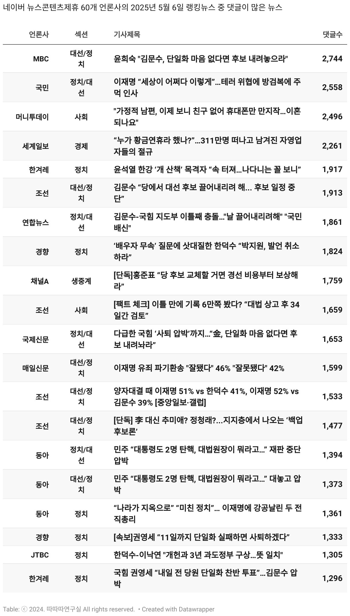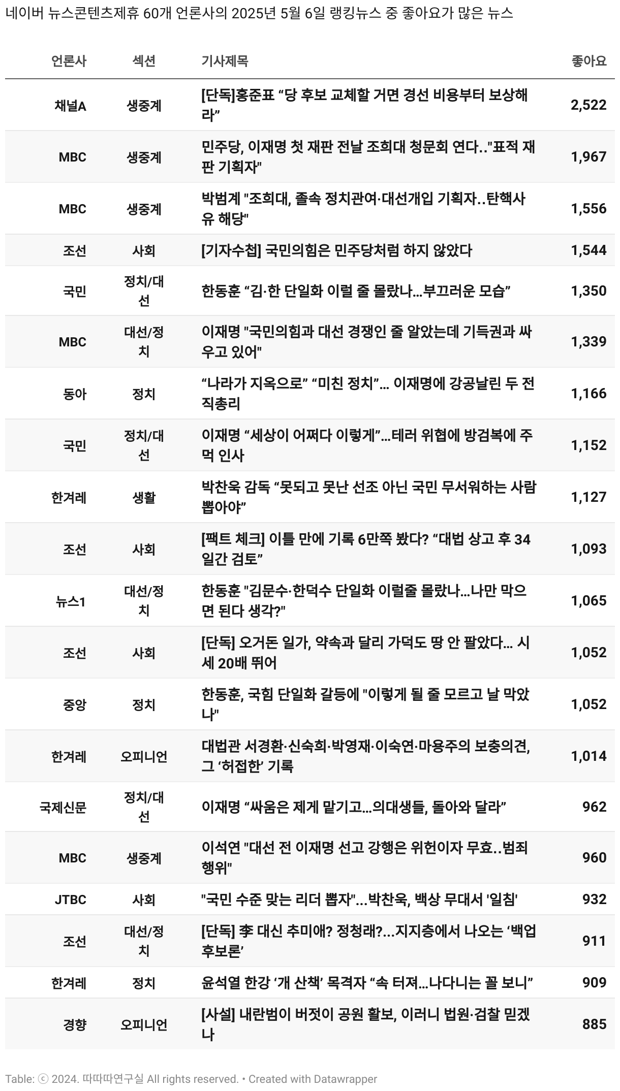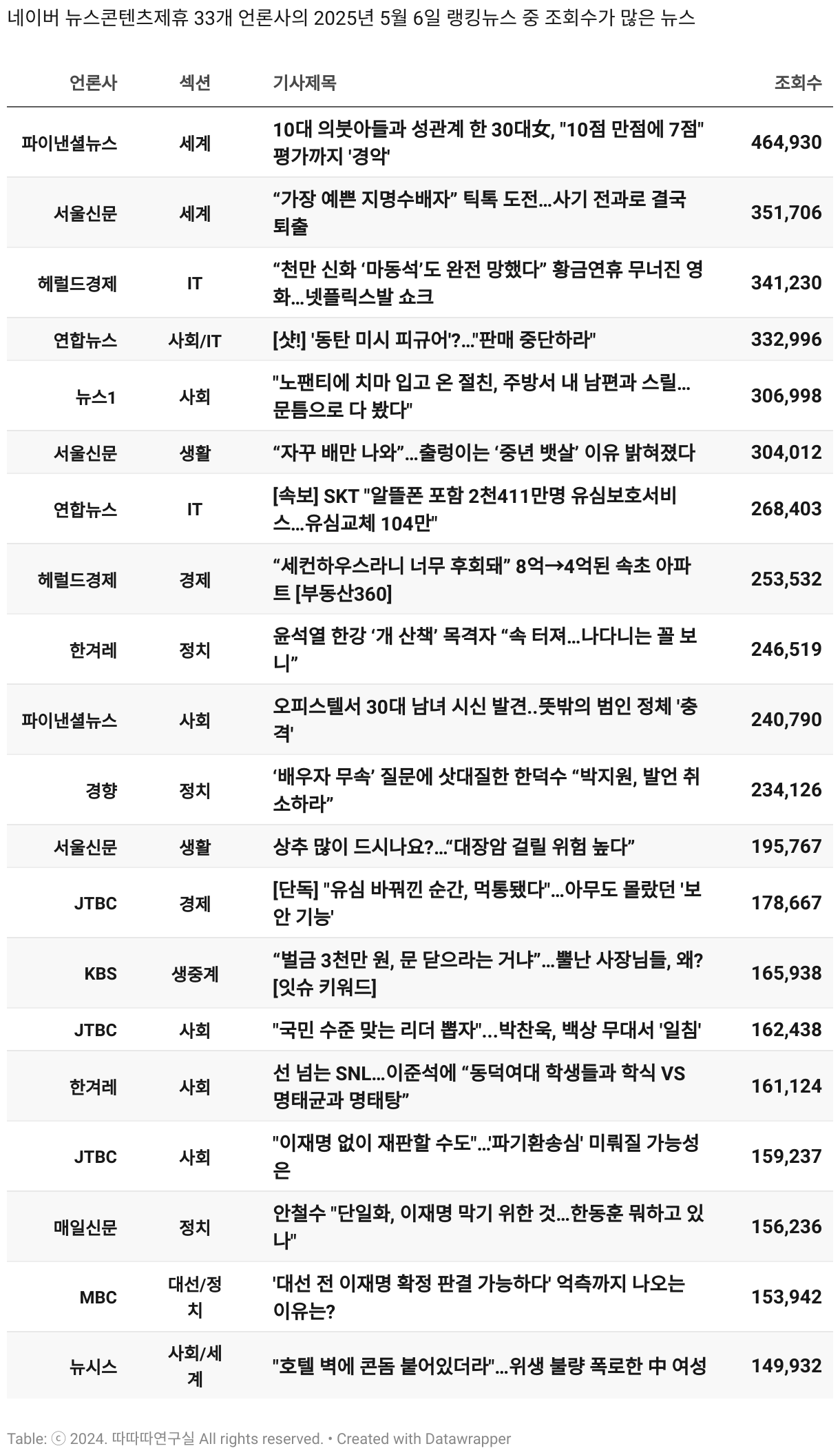 *데이터 수집 기간 : 2024년 6월 10일 *데이터 수집 대상 : 네이버 뉴스콘텐츠제휴 60개 언론사. 종합일간지 10개(경향신문, 국민일보, 동아일보, 문화일보, 서울신문, 세계일보, 조선일보, 중앙일보, 한겨레신문, 한국일보), 방송/통신사 14개(뉴스1, 뉴시스, 연합뉴스, 연합뉴스TV, 채널A, 한국경제TV, JTBC, KBS, MBC, MBN, SBS, SBS BIZ, TV조선, YTN), 경제지 11개(매일경제, 머니투데이, 비즈워치, 서울경제, 아시아경제, 이데일리, 조선비즈, 조세일보, 파이낸셜뉴스, 한국경제(유튜브제외), 헤럴드경제) 인터넷 8개(노컷뉴스, 더팩트, 데일리안, 머니S, 미디어오늘, 아이뉴스24, 오마이뉴스, 프레시안), IT 5개(디지털데일리,디지털타임스, 블로터, 전자신문, 지디넷코리아), 지역 12개(강원도민일보, 강원일보, 경기일보, 국제신문, 대구MBC, 대전일보, 매일신문, 부산일보, 전주MBC, CJB청주방송, JIBS, kbc광주방송)