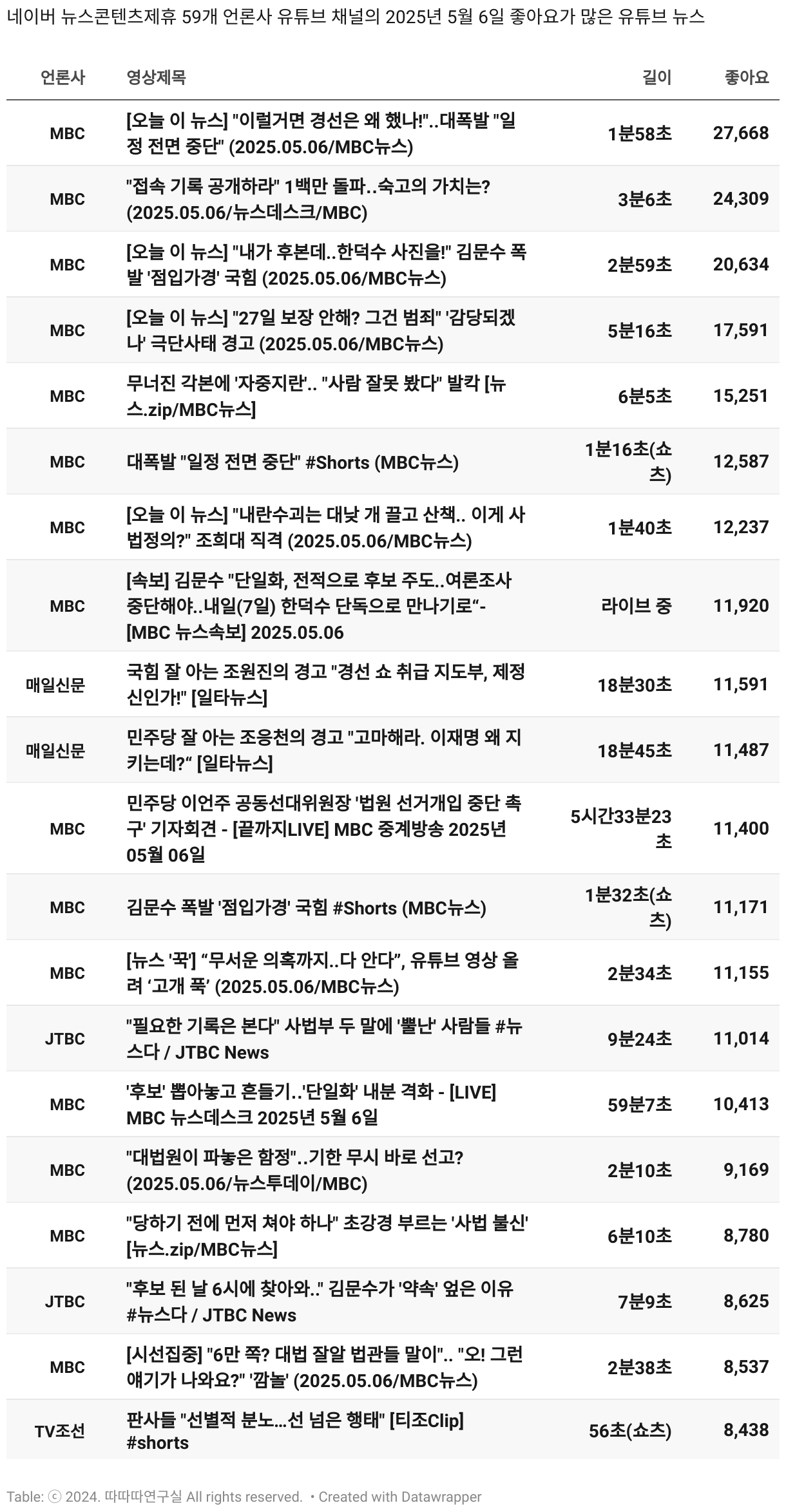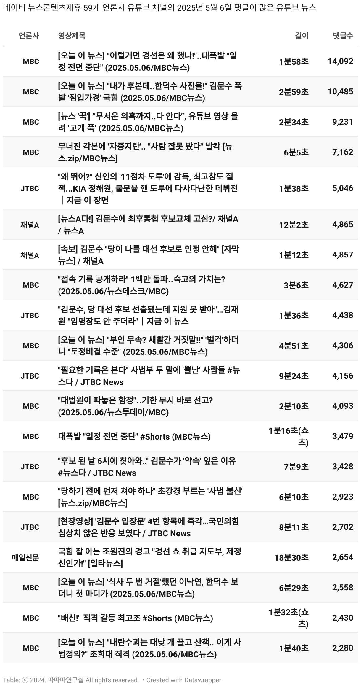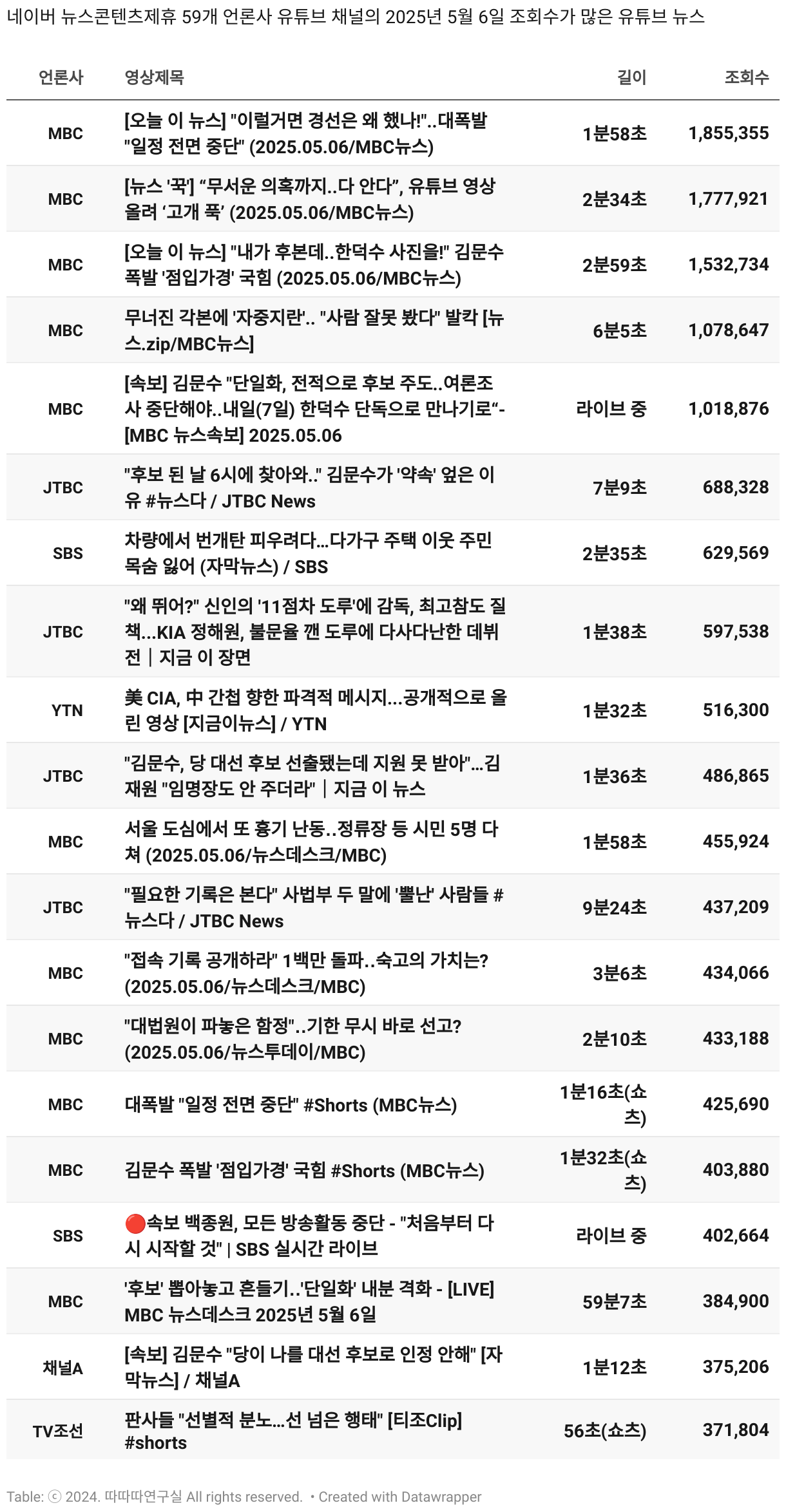 *데이터 수집 기간 : 2024년 6월 10일 *데이터 수집 대상 : 네이버 뉴스콘텐츠제휴 60개 언론사. 종합일간지 10개(경향신문, 국민일보, 동아일보, 문화일보, 서울신문, 세계일보, 조선일보, 중앙일보, 한겨레신문, 한국일보), 방송/통신사 14개(뉴스1, 뉴시스, 연합뉴스, 연합뉴스TV, 채널A, 한국경제TV, JTBC, KBS, MBC, MBN, SBS, SBS BIZ, TV조선, YTN), 경제지 11개(매일경제, 머니투데이, 비즈워치, 서울경제, 아시아경제, 이데일리, 조선비즈, 조세일보, 파이낸셜뉴스, 한국경제(유튜브제외), 헤럴드경제) 인터넷 8개(노컷뉴스, 더팩트, 데일리안, 머니S, 미디어오늘, 아이뉴스24, 오마이뉴스, 프레시안), IT 5개(디지털데일리,디지털타임스, 블로터, 전자신문, 지디넷코리아), 지역 12개(강원도민일보, 강원일보, 경기일보, 국제신문, 대구MBC, 대전일보, 매일신문, 부산일보, 전주MBC, CJB청주방송, JIBS, kbc광주방송)