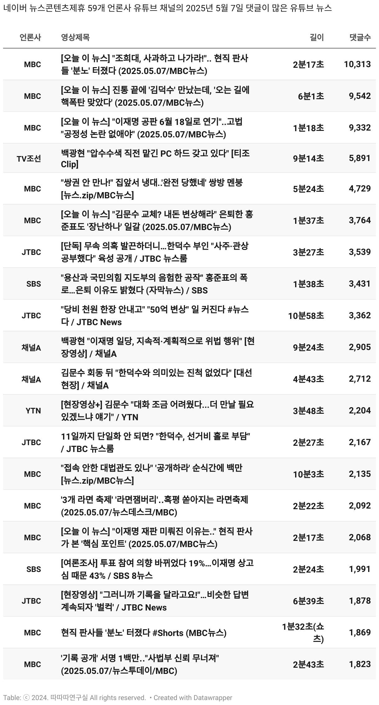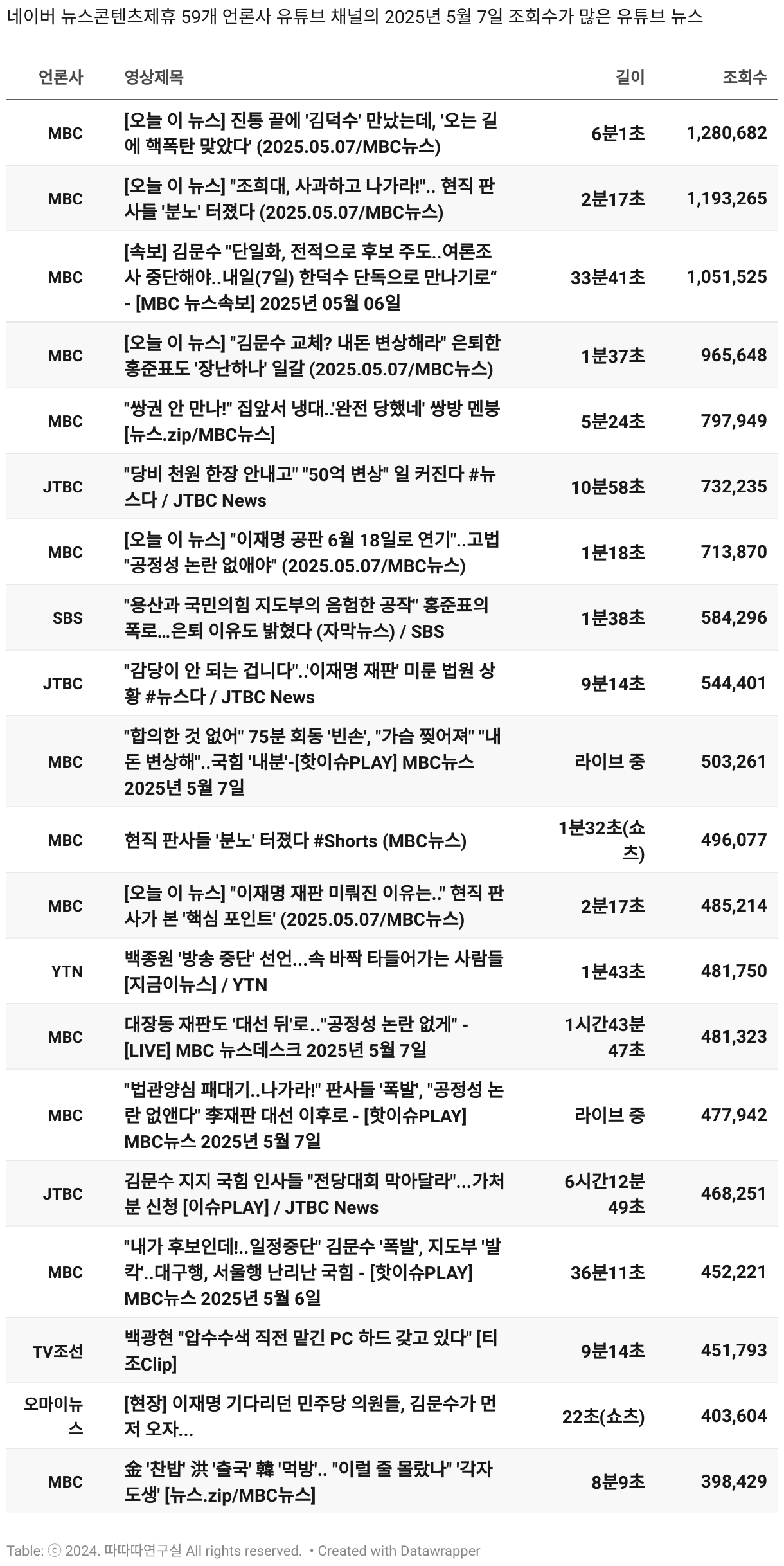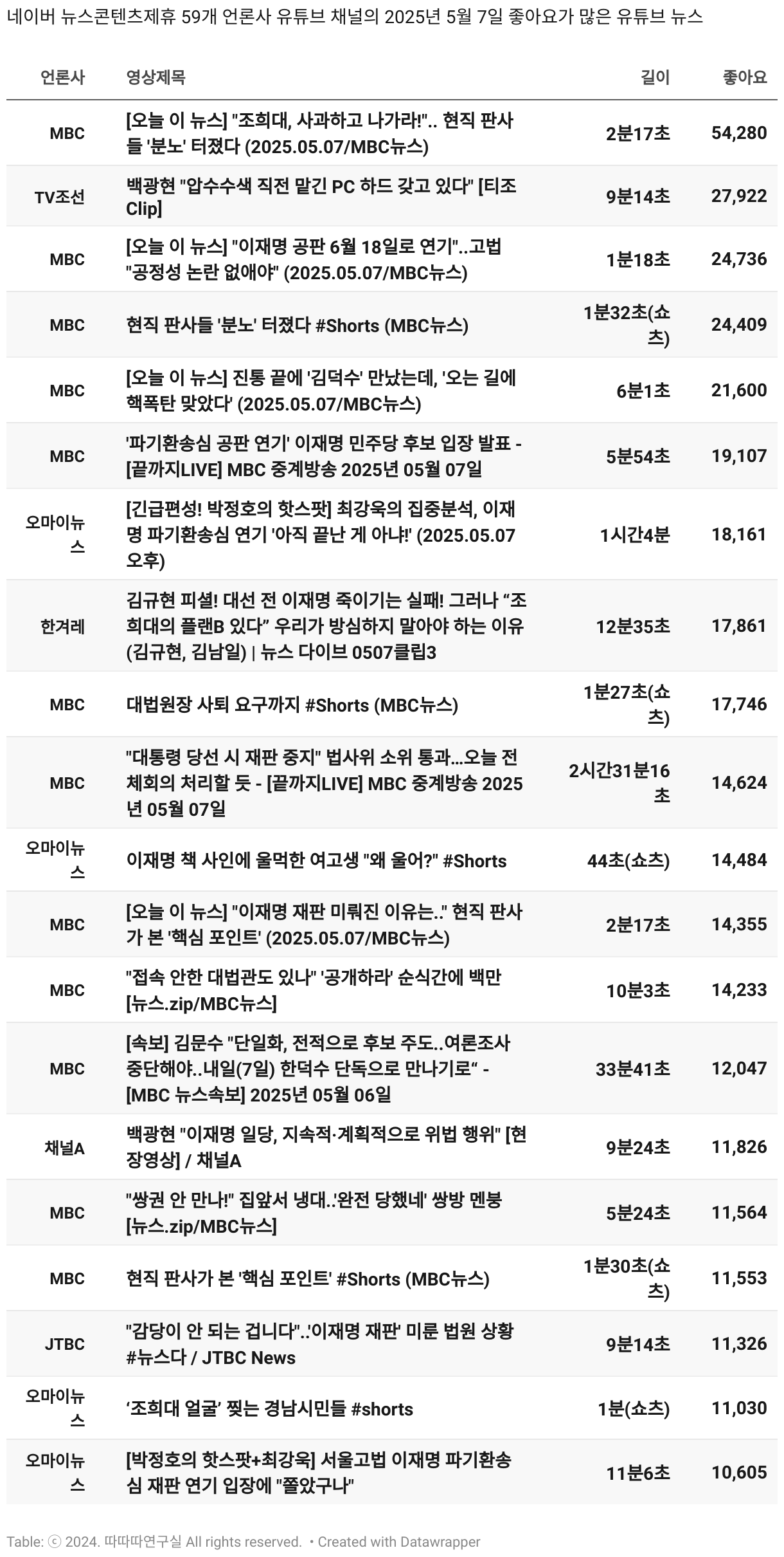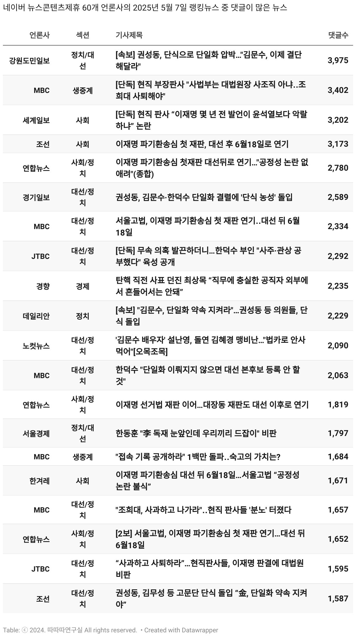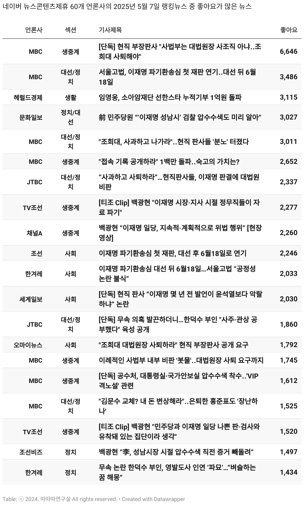*데이터 수집 기간 : 2024년 6월 10일 *데이터 수집 대상 : 네이버 뉴스콘텐츠제휴 60개 언론사. 종합일간지 10개(경향신문, 국민일보, 동아일보, 문화일보, 서울신문, 세계일보, 조선일보, 중앙일보, 한겨레신문, 한국일보), 방송/통신사 14개(뉴스1, 뉴시스, 연합뉴스, 연합뉴스TV, 채널A, 한국경제TV, JTBC, KBS, MBC, MBN, SBS, SBS BIZ, TV조선, YTN), 경제지 11개(매일경제, 머니투데이, 비즈워치, 서울경제, 아시아경제, 이데일리, 조선비즈, 조세일보, 파이낸셜뉴스, 한국경제(유튜브제외), 헤럴드경제) 인터넷 8개(노컷뉴스, 더팩트, 데일리안, 머니S, 미디어오늘, 아이뉴스24, 오마이뉴스, 프레시안), IT 5개(디지털데일리,디지털타임스, 블로터, 전자신문, 지디넷코리아), 지역 12개(강원도민일보, 강원일보, 경기일보, 국제신문, 대구MBC, 대전일보, 매일신문, 부산일보, 전주MBC, CJB청주방송, JIBS, kbc광주방송)