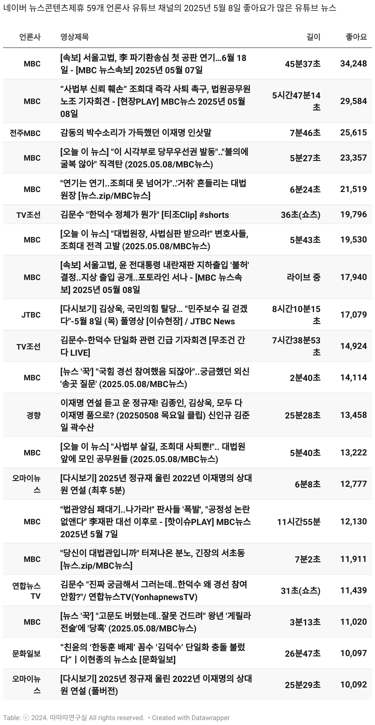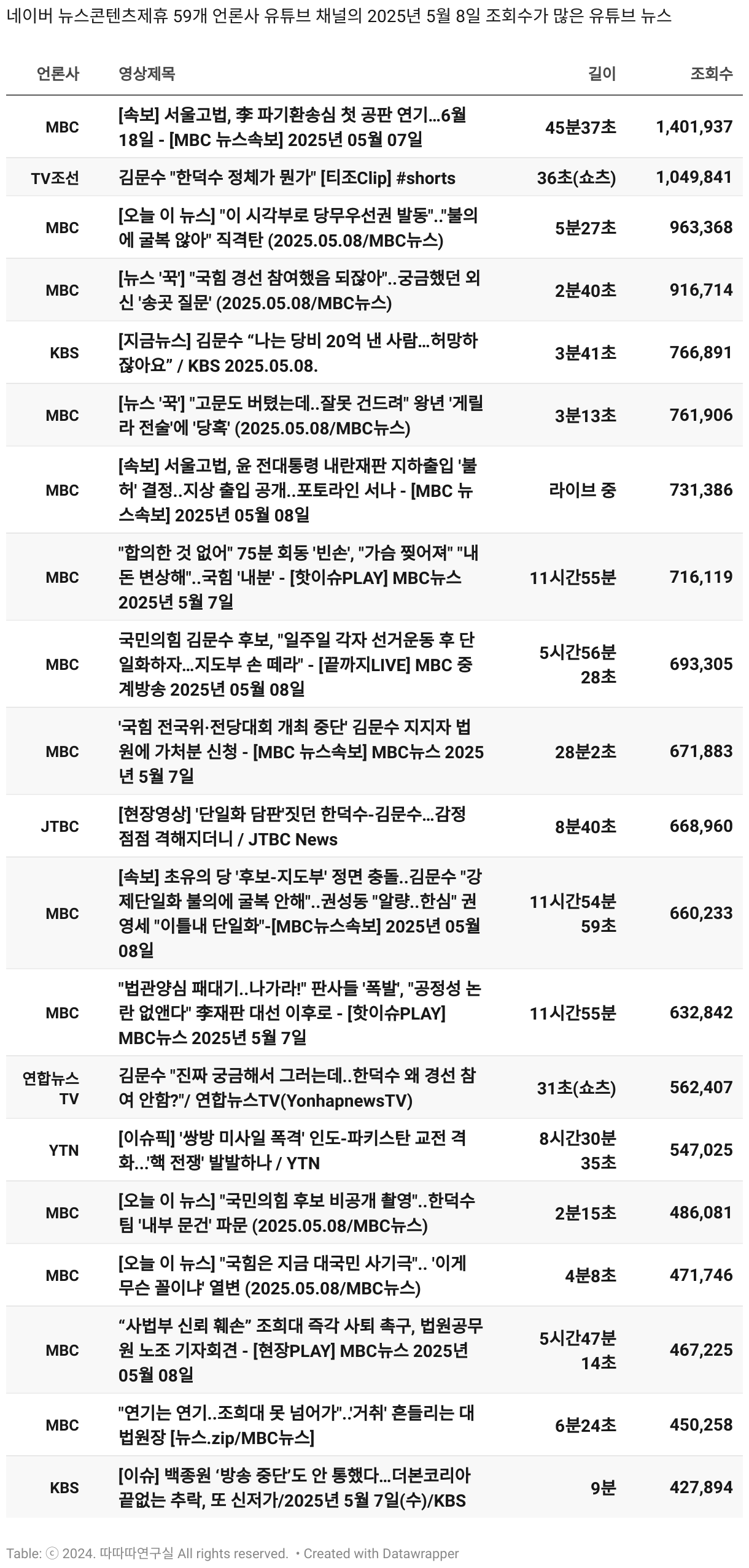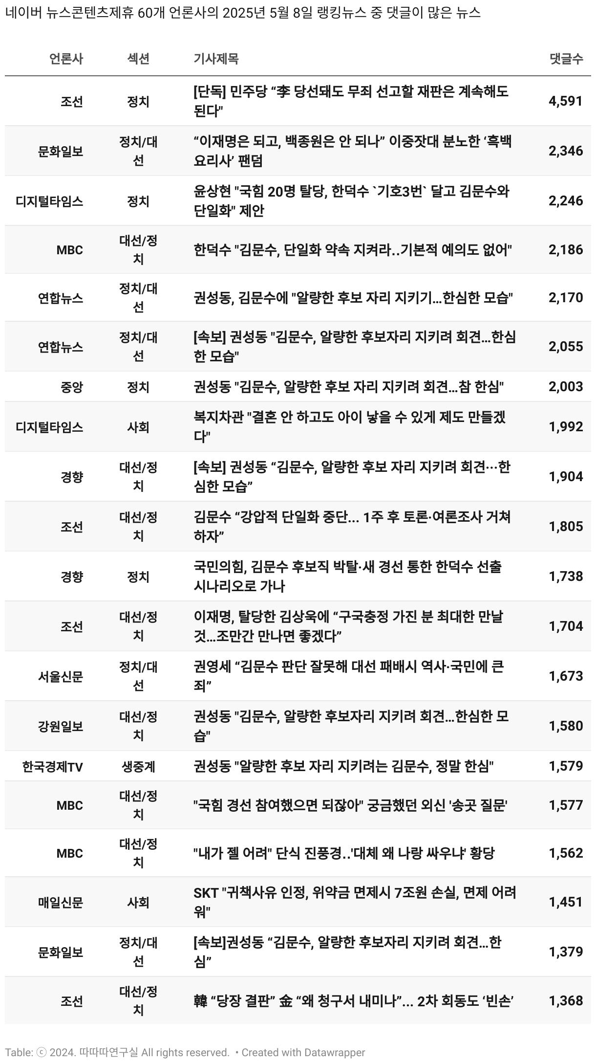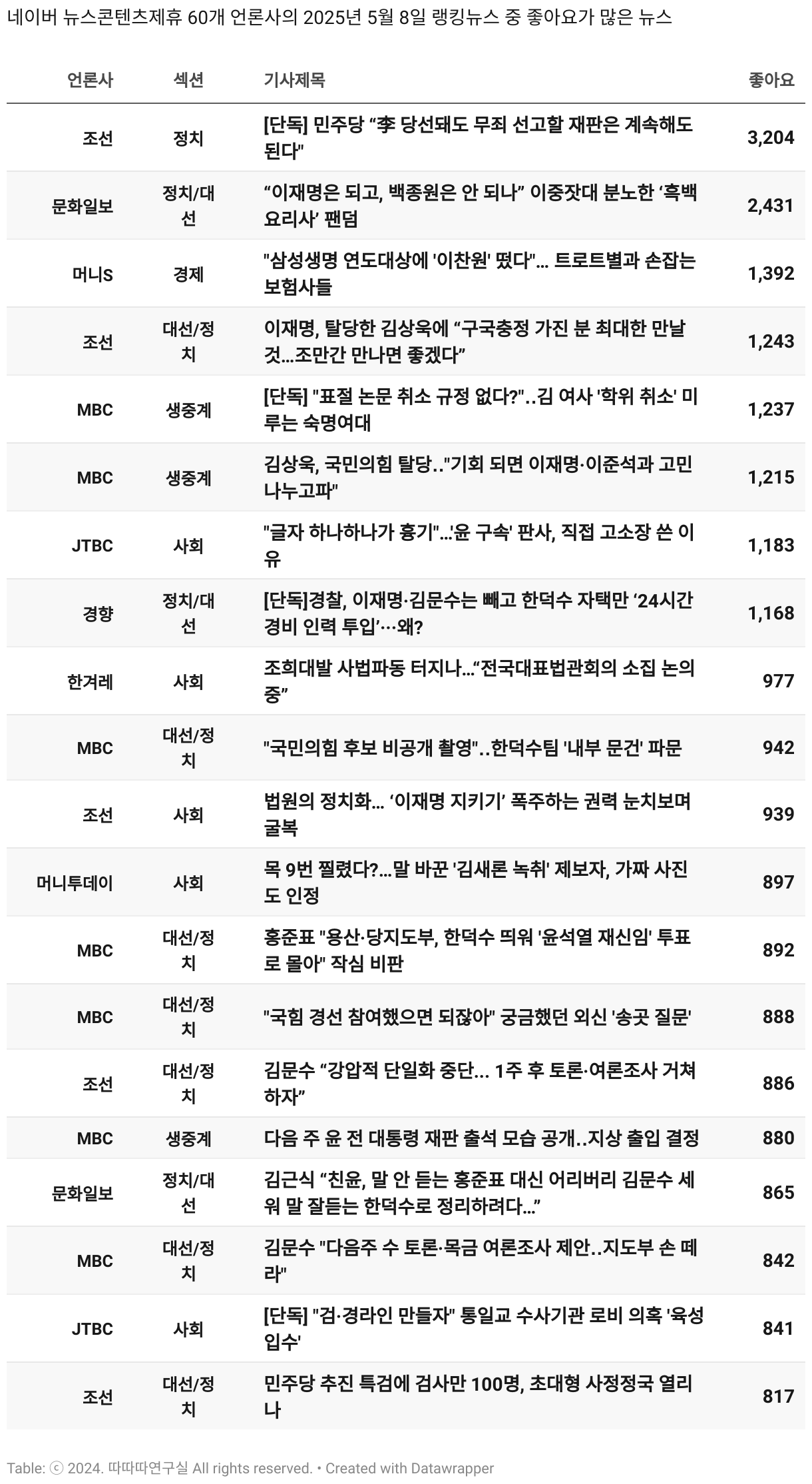 *데이터 수집 기간 : 2024년 6월 10일 *데이터 수집 대상 : 네이버 뉴스콘텐츠제휴 60개 언론사. 종합일간지 10개(경향신문, 국민일보, 동아일보, 문화일보, 서울신문, 세계일보, 조선일보, 중앙일보, 한겨레신문, 한국일보), 방송/통신사 14개(뉴스1, 뉴시스, 연합뉴스, 연합뉴스TV, 채널A, 한국경제TV, JTBC, KBS, MBC, MBN, SBS, SBS BIZ, TV조선, YTN), 경제지 11개(매일경제, 머니투데이, 비즈워치, 서울경제, 아시아경제, 이데일리, 조선비즈, 조세일보, 파이낸셜뉴스, 한국경제(유튜브제외), 헤럴드경제) 인터넷 8개(노컷뉴스, 더팩트, 데일리안, 머니S, 미디어오늘, 아이뉴스24, 오마이뉴스, 프레시안), IT 5개(디지털데일리,디지털타임스, 블로터, 전자신문, 지디넷코리아), 지역 12개(강원도민일보, 강원일보, 경기일보, 국제신문, 대구MBC, 대전일보, 매일신문, 부산일보, 전주MBC, CJB청주방송, JIBS, kbc광주방송)