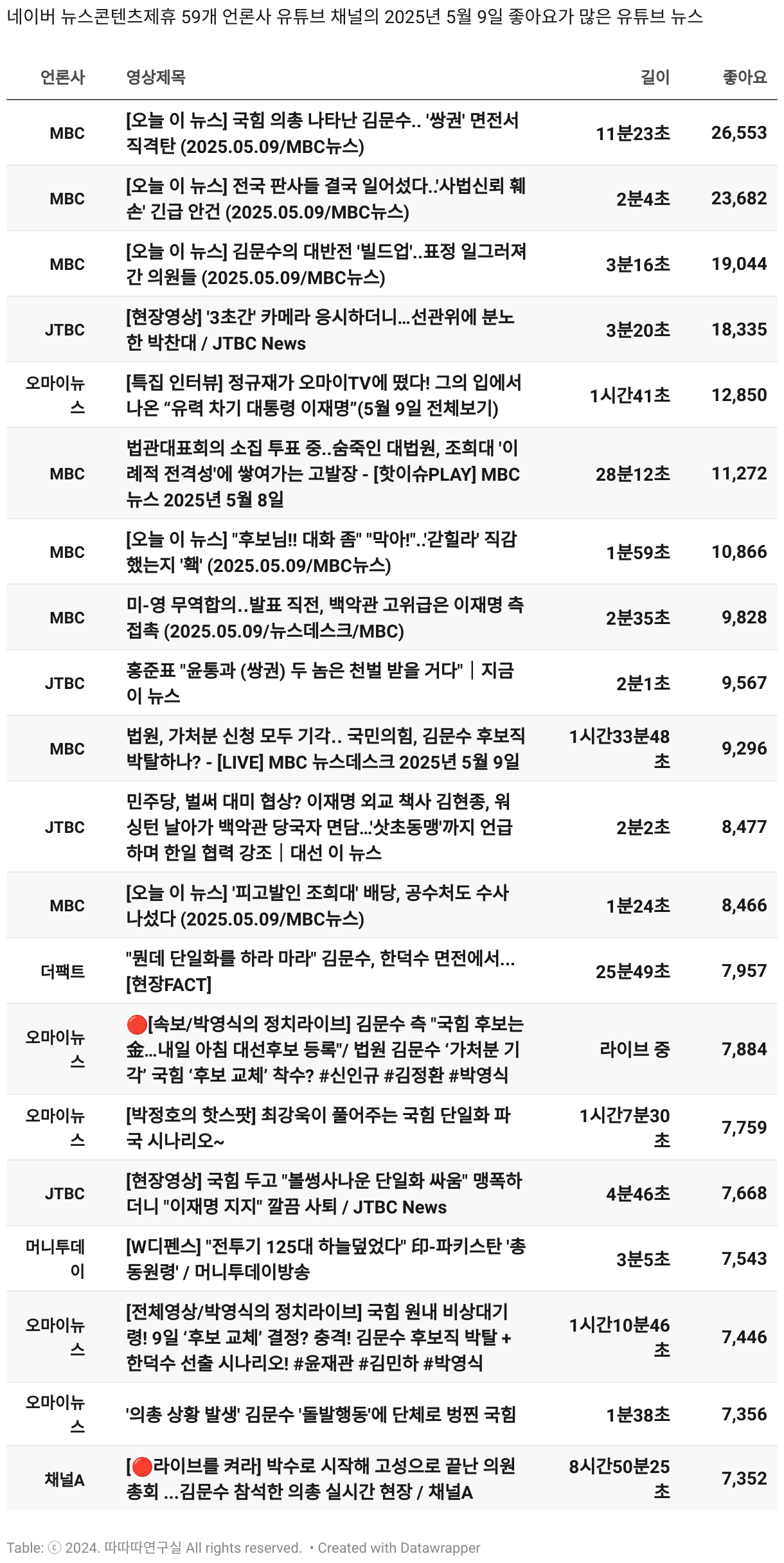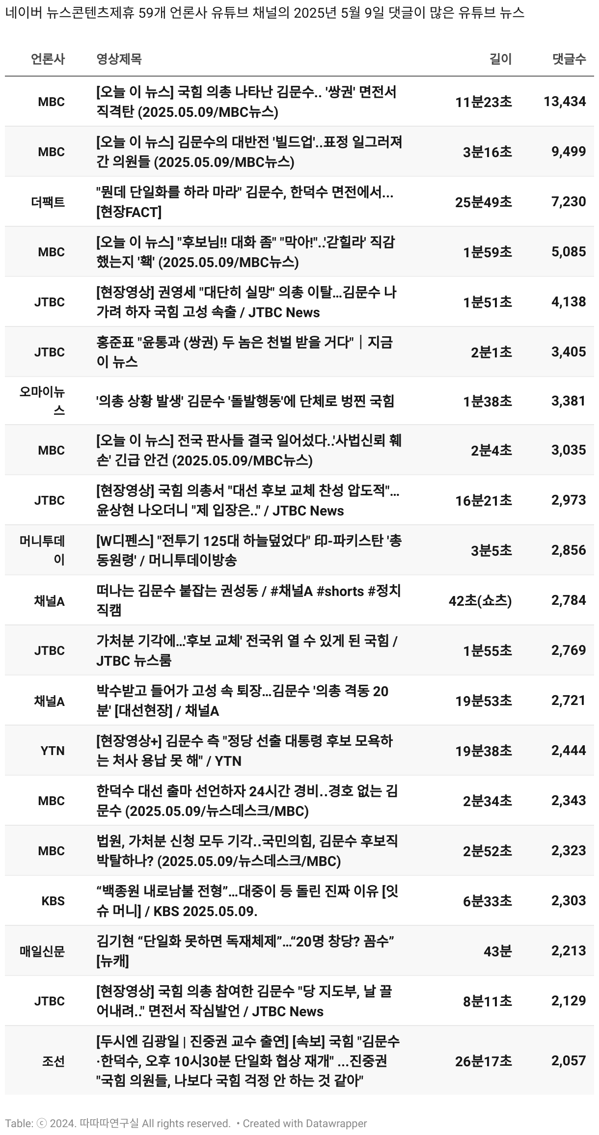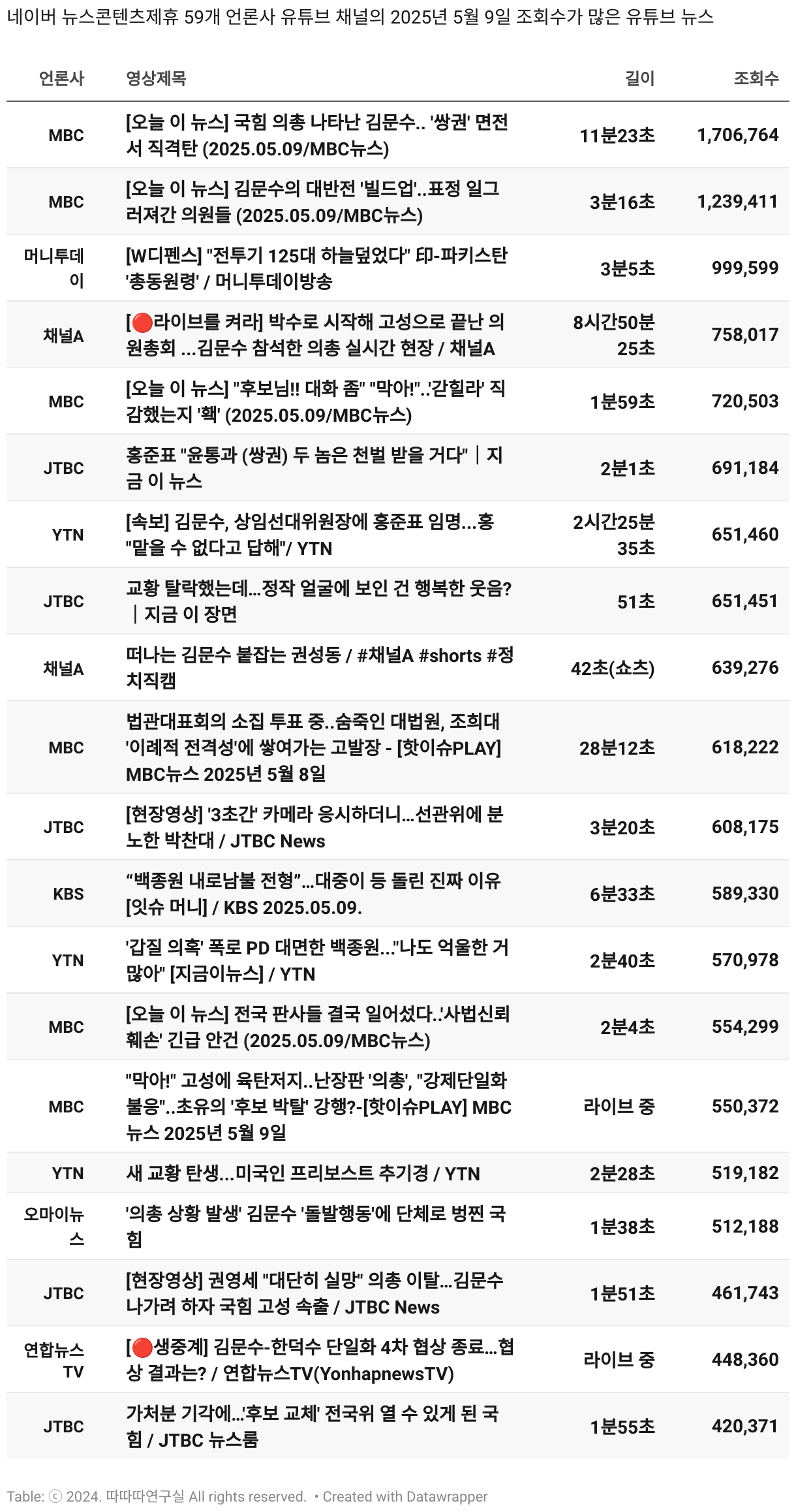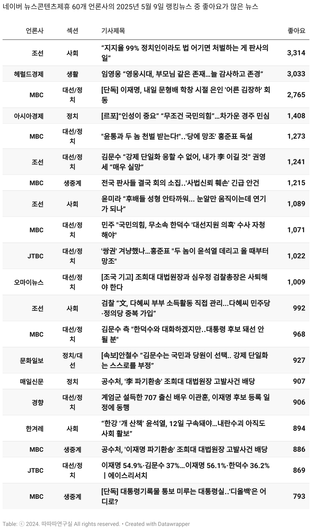 *데이터 수집 기간 : 2024년 6월 10일 *데이터 수집 대상 : 네이버 뉴스콘텐츠제휴 60개 언론사. 종합일간지 10개(경향신문, 국민일보, 동아일보, 문화일보, 서울신문, 세계일보, 조선일보, 중앙일보, 한겨레신문, 한국일보), 방송/통신사 14개(뉴스1, 뉴시스, 연합뉴스, 연합뉴스TV, 채널A, 한국경제TV, JTBC, KBS, MBC, MBN, SBS, SBS BIZ, TV조선, YTN), 경제지 11개(매일경제, 머니투데이, 비즈워치, 서울경제, 아시아경제, 이데일리, 조선비즈, 조세일보, 파이낸셜뉴스, 한국경제(유튜브제외), 헤럴드경제) 인터넷 8개(노컷뉴스, 더팩트, 데일리안, 머니S, 미디어오늘, 아이뉴스24, 오마이뉴스, 프레시안), IT 5개(디지털데일리,디지털타임스, 블로터, 전자신문, 지디넷코리아), 지역 12개(강원도민일보, 강원일보, 경기일보, 국제신문, 대구MBC, 대전일보, 매일신문, 부산일보, 전주MBC, CJB청주방송, JIBS, kbc광주방송)