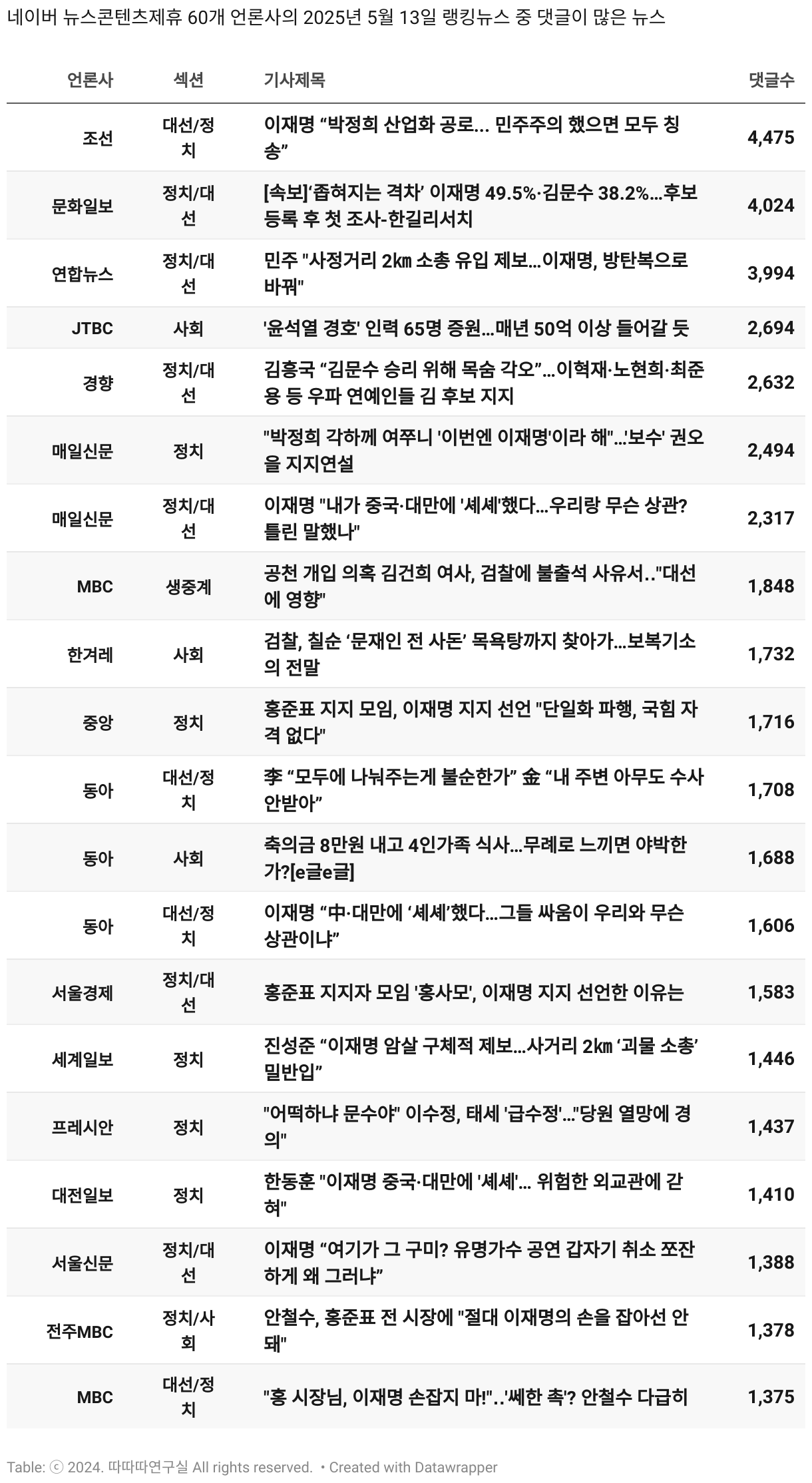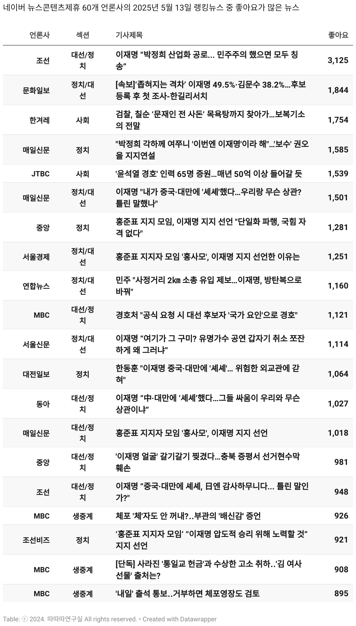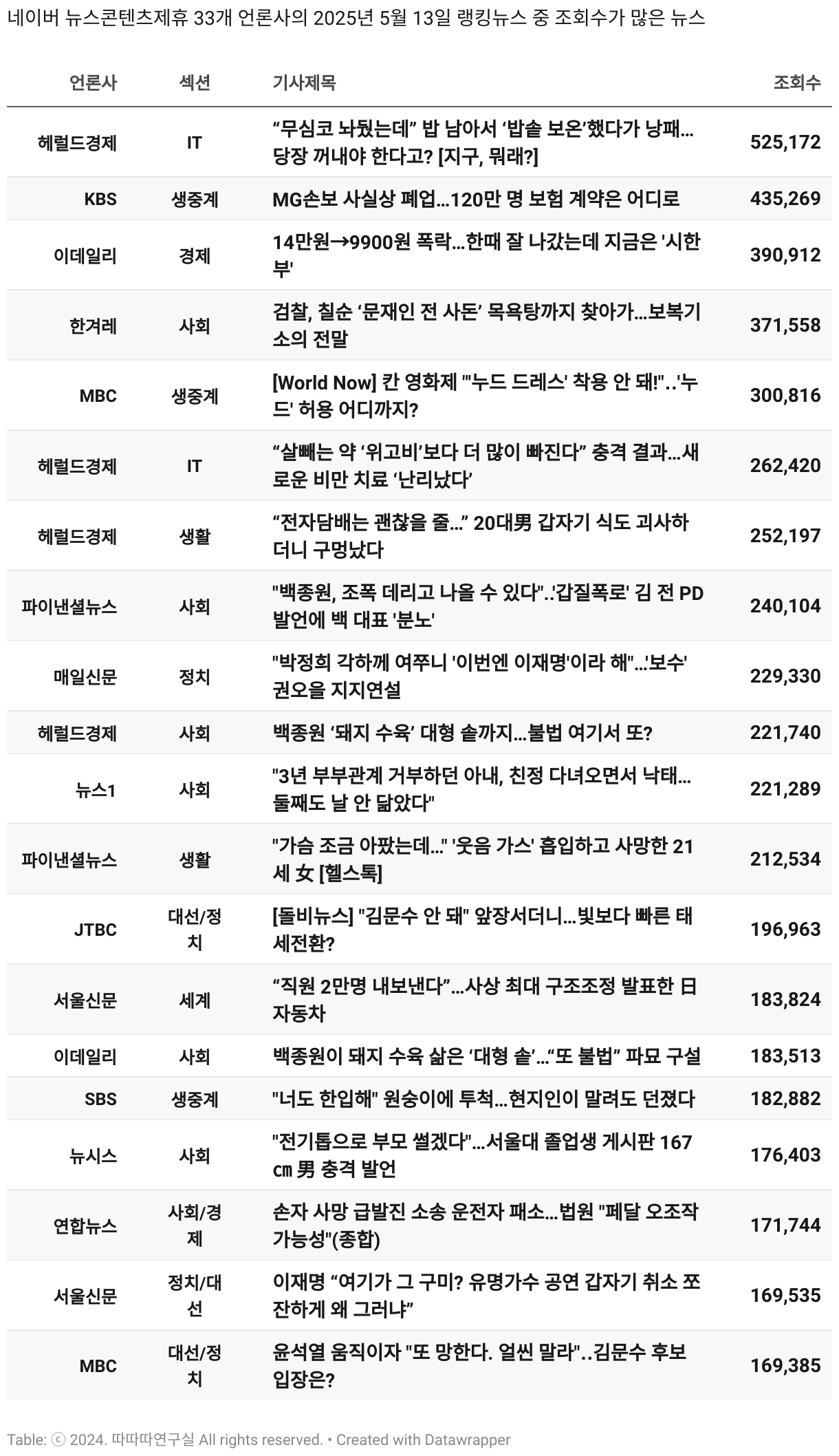 *데이터 수집 기간 : 2024년 6월 10일 *데이터 수집 대상 : 네이버 뉴스콘텐츠제휴 60개 언론사. 종합일간지 10개(경향신문, 국민일보, 동아일보, 문화일보, 서울신문, 세계일보, 조선일보, 중앙일보, 한겨레신문, 한국일보), 방송/통신사 14개(뉴스1, 뉴시스, 연합뉴스, 연합뉴스TV, 채널A, 한국경제TV, JTBC, KBS, MBC, MBN, SBS, SBS BIZ, TV조선, YTN), 경제지 11개(매일경제, 머니투데이, 비즈워치, 서울경제, 아시아경제, 이데일리, 조선비즈, 조세일보, 파이낸셜뉴스, 한국경제(유튜브제외), 헤럴드경제) 인터넷 8개(노컷뉴스, 더팩트, 데일리안, 머니S, 미디어오늘, 아이뉴스24, 오마이뉴스, 프레시안), IT 5개(디지털데일리,디지털타임스, 블로터, 전자신문, 지디넷코리아), 지역 12개(강원도민일보, 강원일보, 경기일보, 국제신문, 대구MBC, 대전일보, 매일신문, 부산일보, 전주MBC, CJB청주방송, JIBS, kbc광주방송)