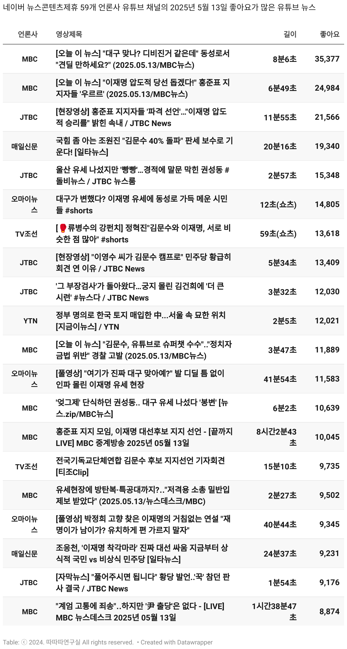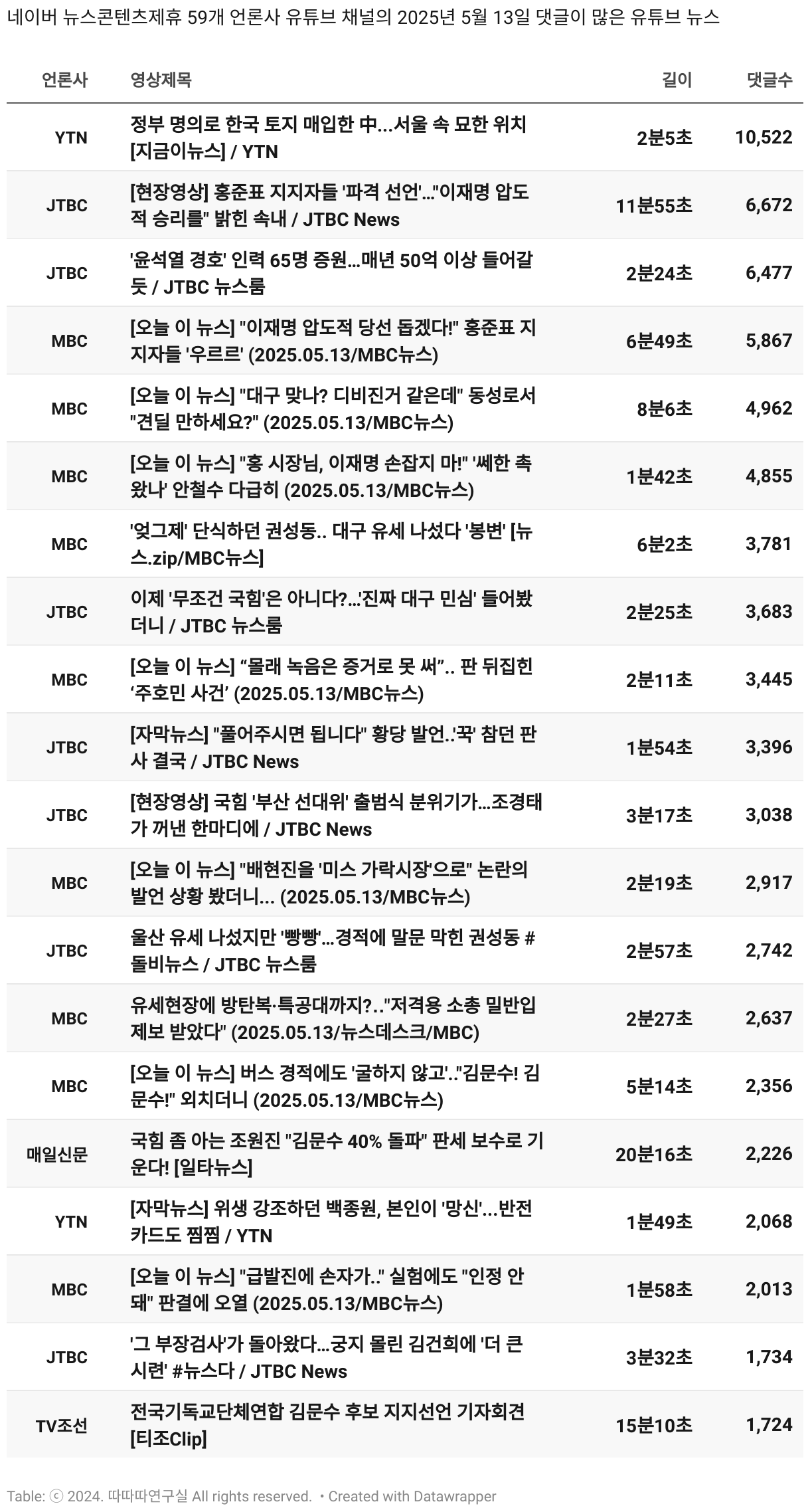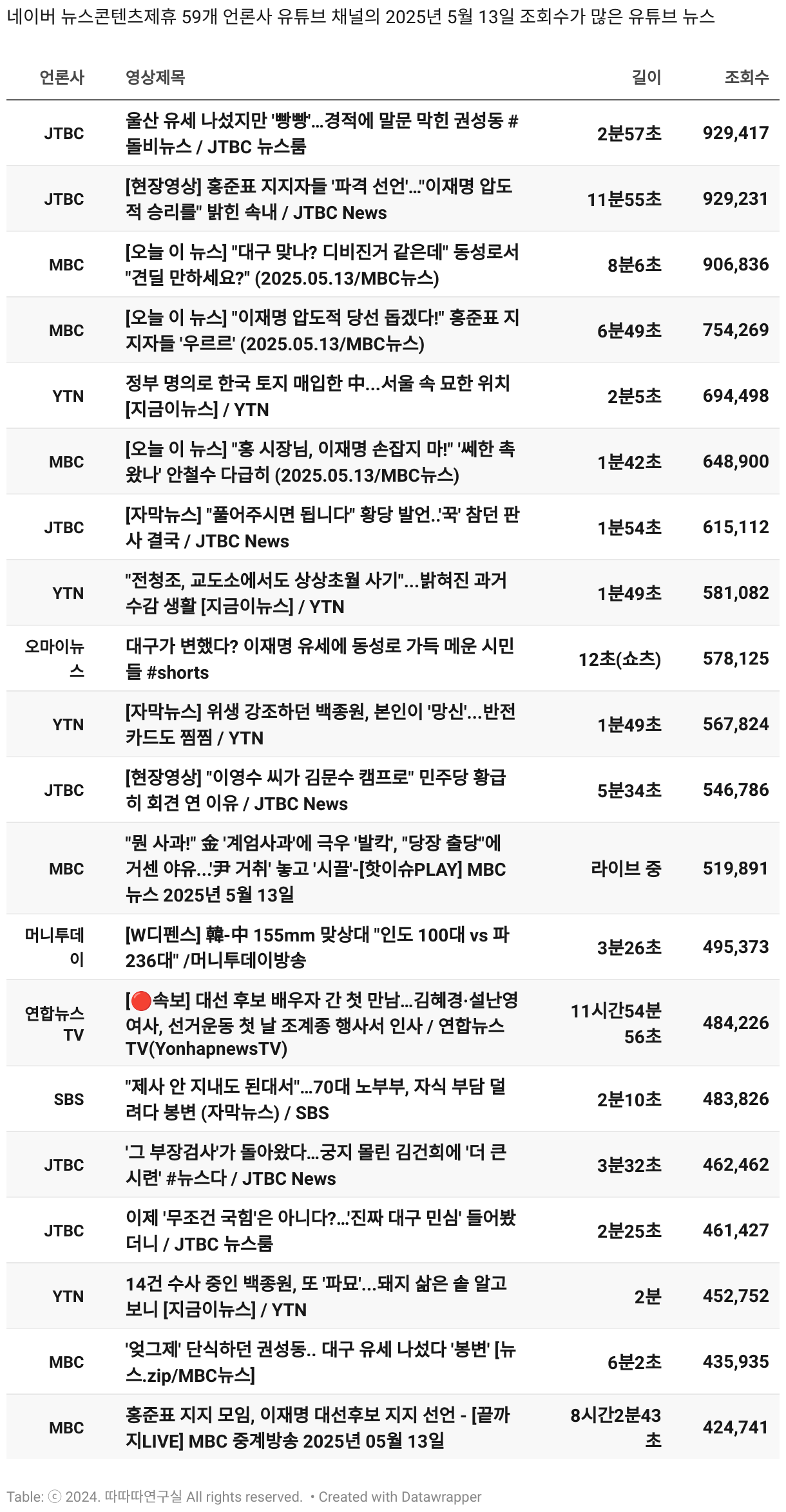 *데이터 수집 기간 : 2024년 6월 10일 *데이터 수집 대상 : 네이버 뉴스콘텐츠제휴 60개 언론사. 종합일간지 10개(경향신문, 국민일보, 동아일보, 문화일보, 서울신문, 세계일보, 조선일보, 중앙일보, 한겨레신문, 한국일보), 방송/통신사 14개(뉴스1, 뉴시스, 연합뉴스, 연합뉴스TV, 채널A, 한국경제TV, JTBC, KBS, MBC, MBN, SBS, SBS BIZ, TV조선, YTN), 경제지 11개(매일경제, 머니투데이, 비즈워치, 서울경제, 아시아경제, 이데일리, 조선비즈, 조세일보, 파이낸셜뉴스, 한국경제(유튜브제외), 헤럴드경제) 인터넷 8개(노컷뉴스, 더팩트, 데일리안, 머니S, 미디어오늘, 아이뉴스24, 오마이뉴스, 프레시안), IT 5개(디지털데일리,디지털타임스, 블로터, 전자신문, 지디넷코리아), 지역 12개(강원도민일보, 강원일보, 경기일보, 국제신문, 대구MBC, 대전일보, 매일신문, 부산일보, 전주MBC, CJB청주방송, JIBS, kbc광주방송)