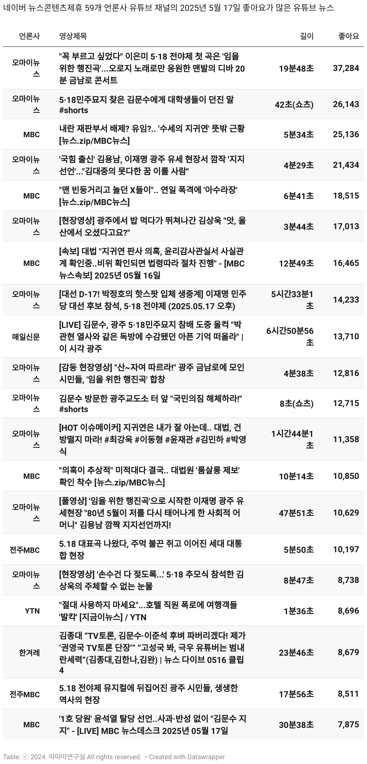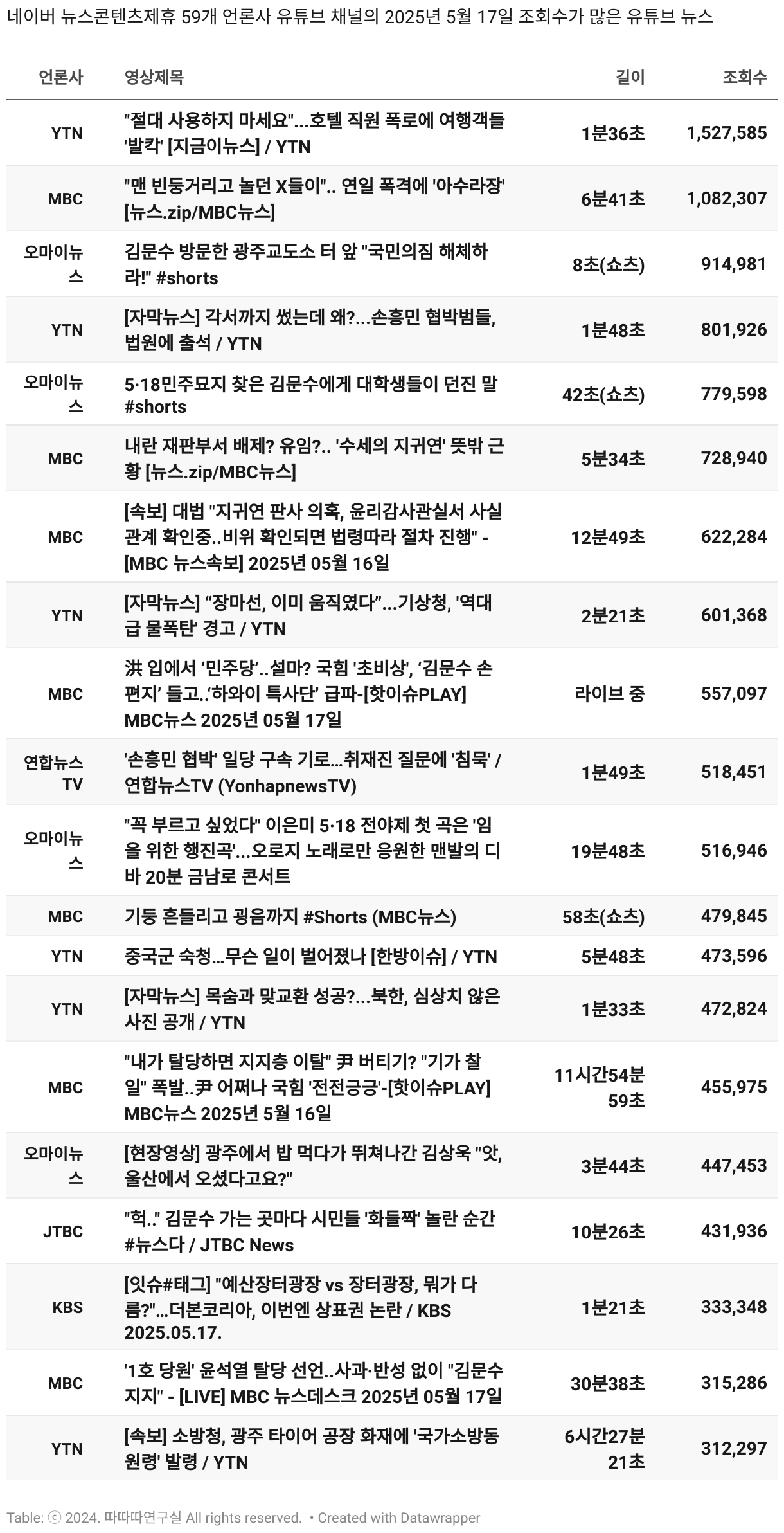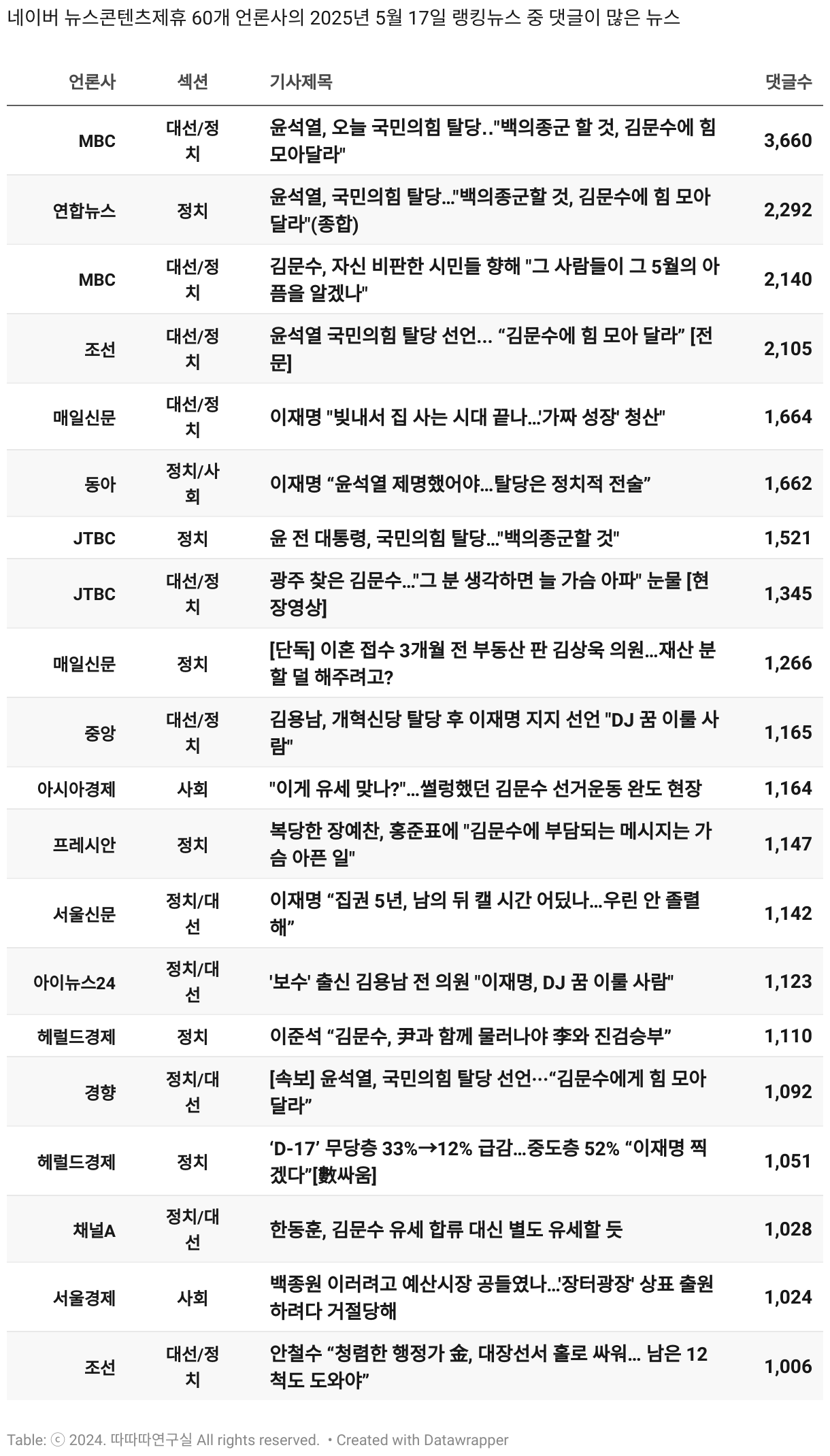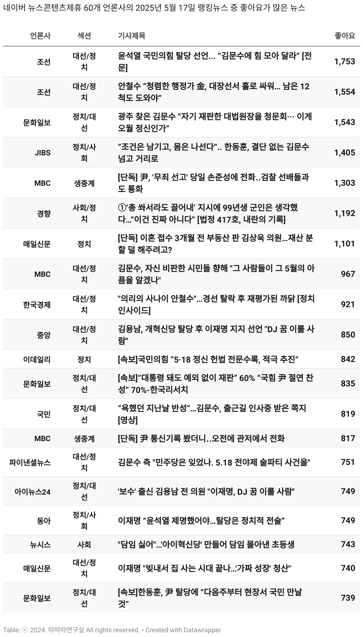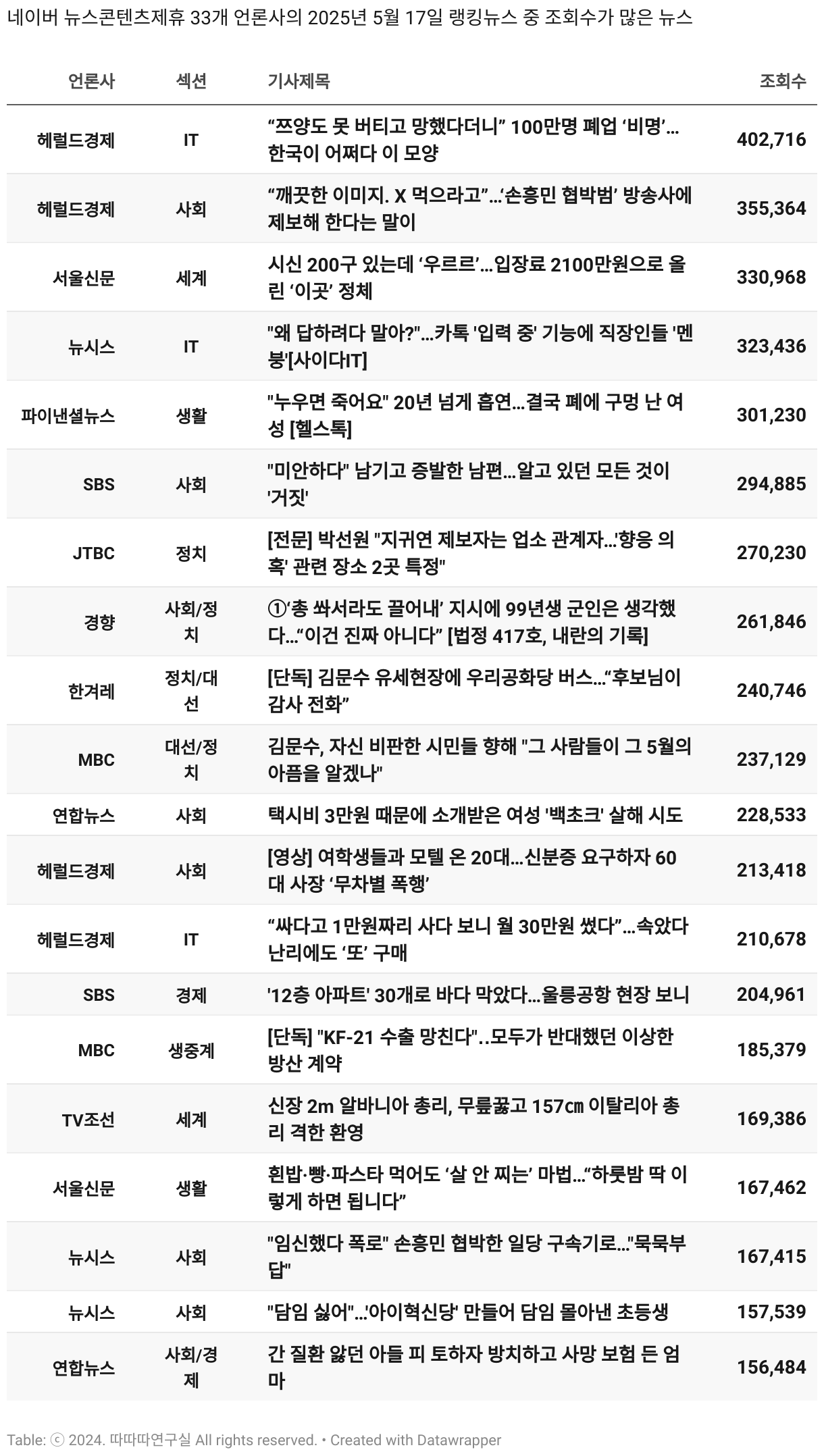 *데이터 수집 기간 : 2024년 6월 10일 *데이터 수집 대상 : 네이버 뉴스콘텐츠제휴 60개 언론사. 종합일간지 10개(경향신문, 국민일보, 동아일보, 문화일보, 서울신문, 세계일보, 조선일보, 중앙일보, 한겨레신문, 한국일보), 방송/통신사 14개(뉴스1, 뉴시스, 연합뉴스, 연합뉴스TV, 채널A, 한국경제TV, JTBC, KBS, MBC, MBN, SBS, SBS BIZ, TV조선, YTN), 경제지 11개(매일경제, 머니투데이, 비즈워치, 서울경제, 아시아경제, 이데일리, 조선비즈, 조세일보, 파이낸셜뉴스, 한국경제(유튜브제외), 헤럴드경제) 인터넷 8개(노컷뉴스, 더팩트, 데일리안, 머니S, 미디어오늘, 아이뉴스24, 오마이뉴스, 프레시안), IT 5개(디지털데일리,디지털타임스, 블로터, 전자신문, 지디넷코리아), 지역 12개(강원도민일보, 강원일보, 경기일보, 국제신문, 대구MBC, 대전일보, 매일신문, 부산일보, 전주MBC, CJB청주방송, JIBS, kbc광주방송)