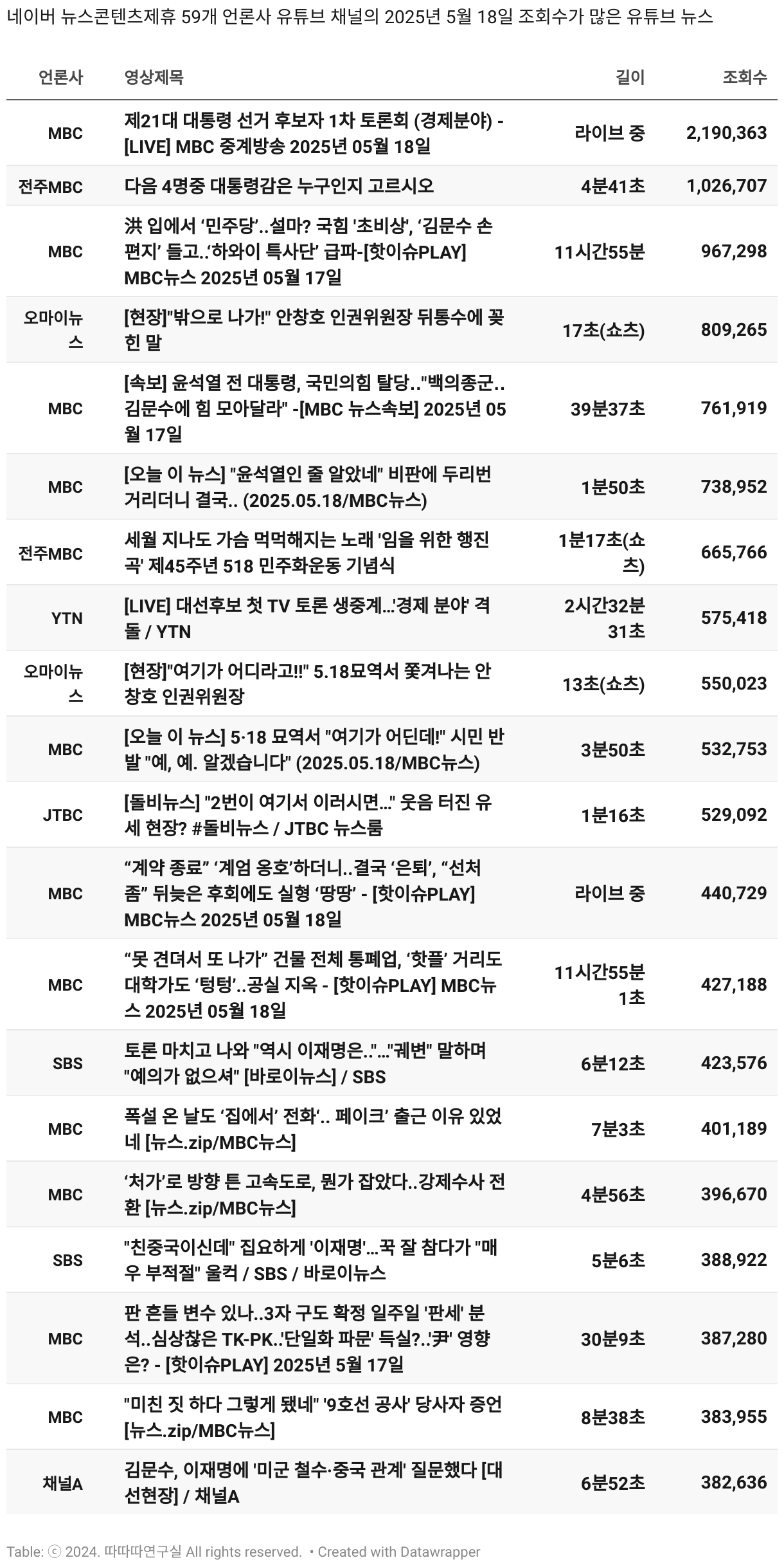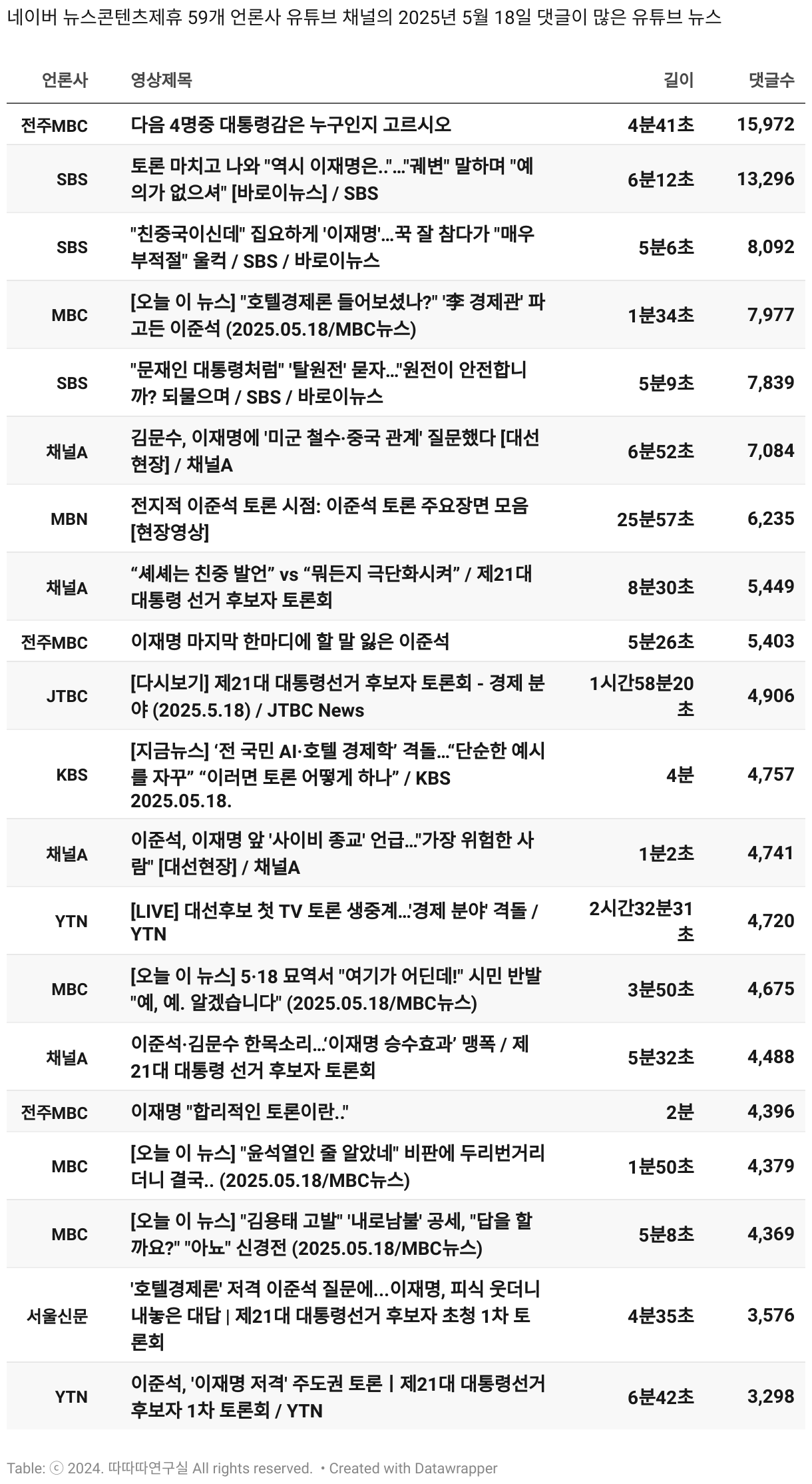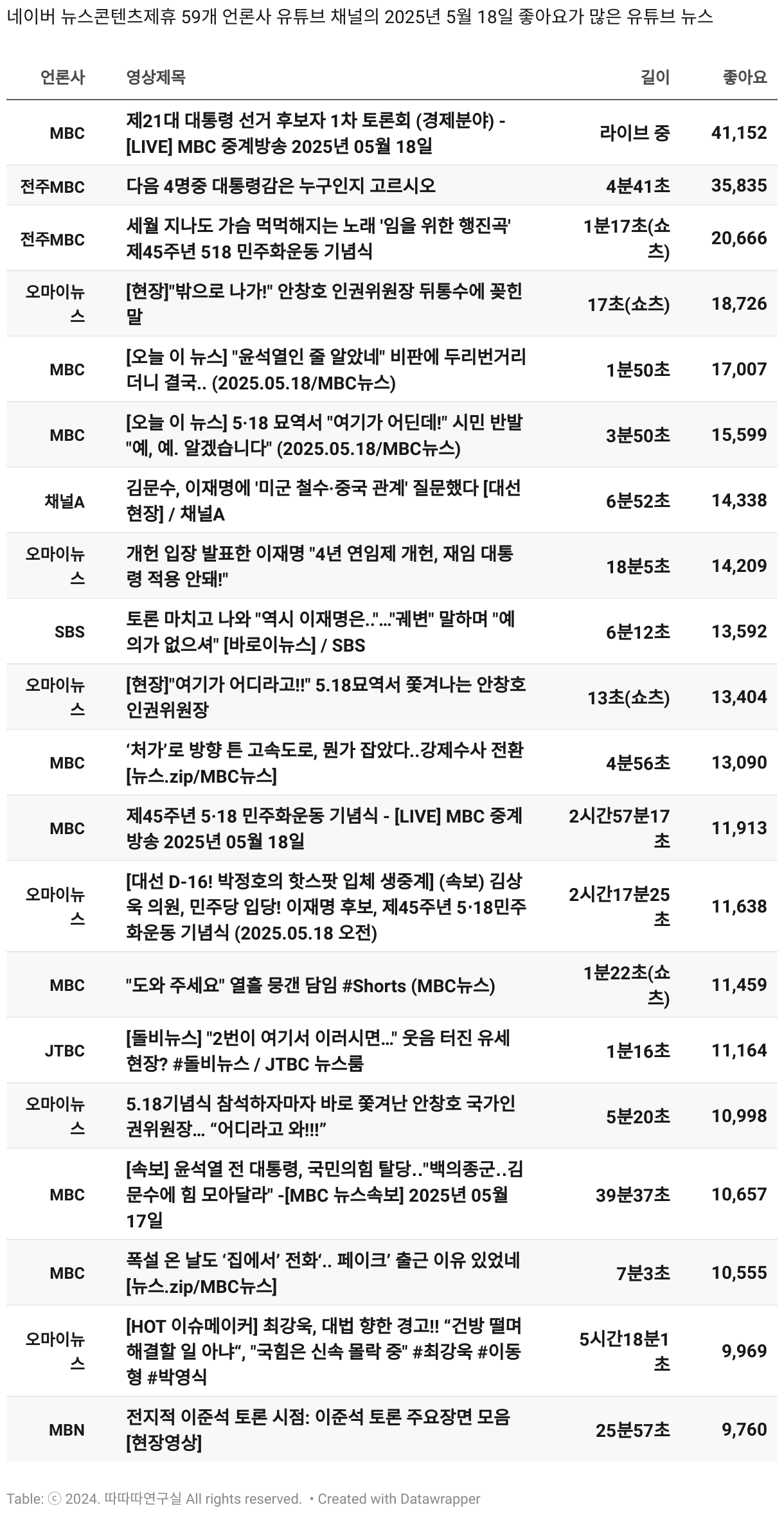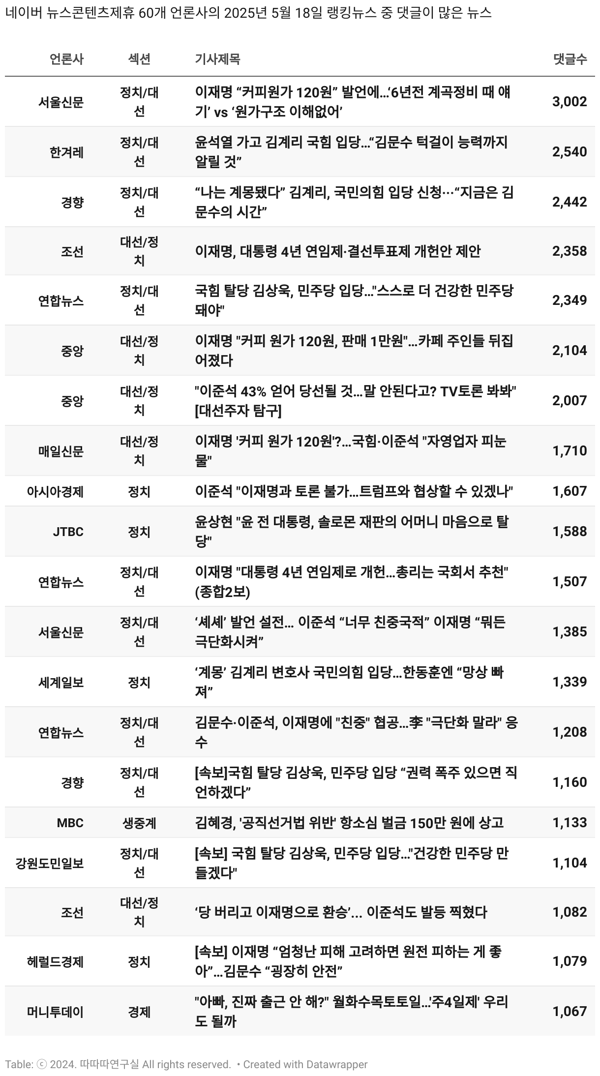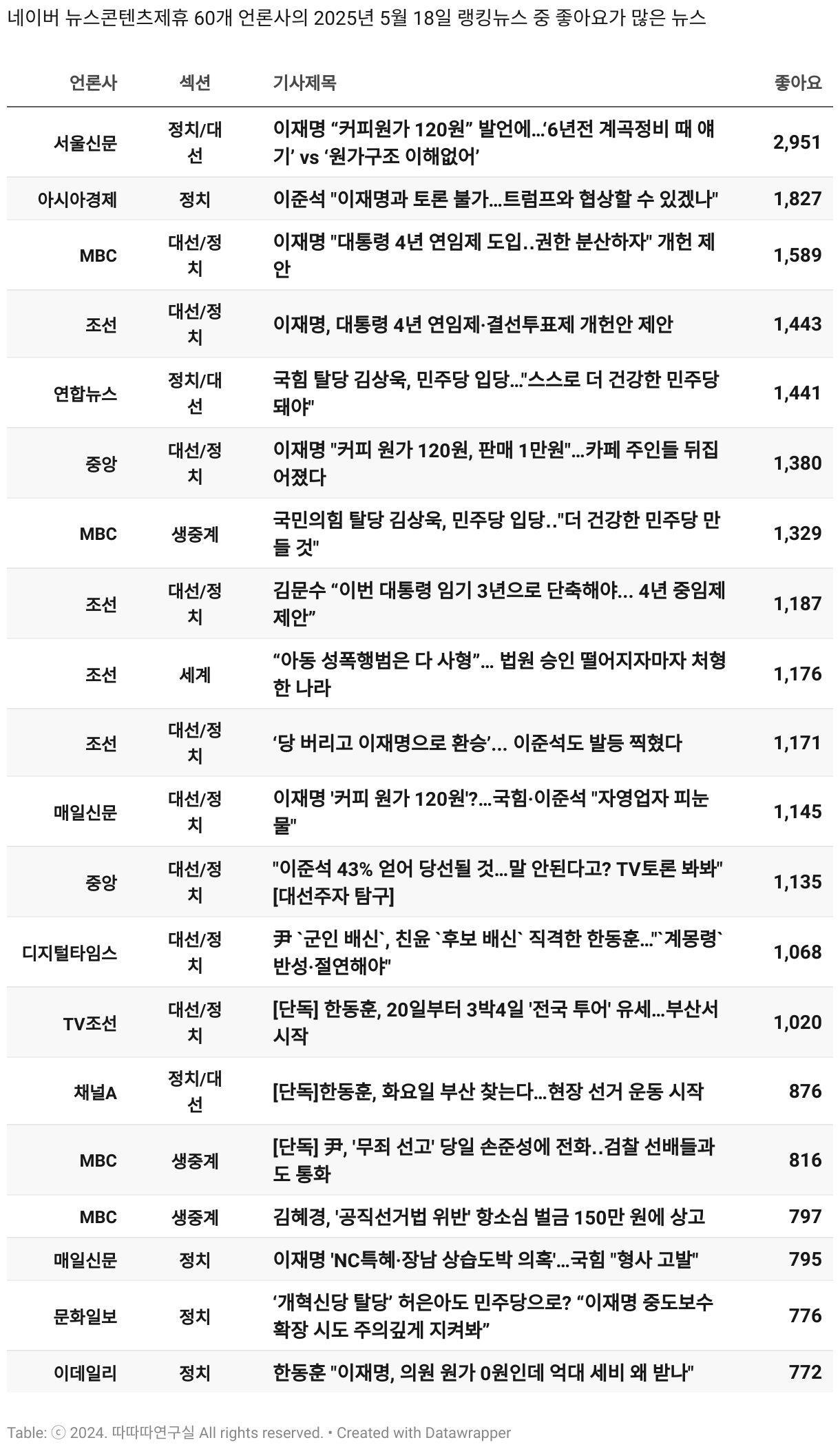 *데이터 수집 기간 : 2024년 6월 10일 *데이터 수집 대상 : 네이버 뉴스콘텐츠제휴 60개 언론사. 종합일간지 10개(경향신문, 국민일보, 동아일보, 문화일보, 서울신문, 세계일보, 조선일보, 중앙일보, 한겨레신문, 한국일보), 방송/통신사 14개(뉴스1, 뉴시스, 연합뉴스, 연합뉴스TV, 채널A, 한국경제TV, JTBC, KBS, MBC, MBN, SBS, SBS BIZ, TV조선, YTN), 경제지 11개(매일경제, 머니투데이, 비즈워치, 서울경제, 아시아경제, 이데일리, 조선비즈, 조세일보, 파이낸셜뉴스, 한국경제(유튜브제외), 헤럴드경제) 인터넷 8개(노컷뉴스, 더팩트, 데일리안, 머니S, 미디어오늘, 아이뉴스24, 오마이뉴스, 프레시안), IT 5개(디지털데일리,디지털타임스, 블로터, 전자신문, 지디넷코리아), 지역 12개(강원도민일보, 강원일보, 경기일보, 국제신문, 대구MBC, 대전일보, 매일신문, 부산일보, 전주MBC, CJB청주방송, JIBS, kbc광주방송)