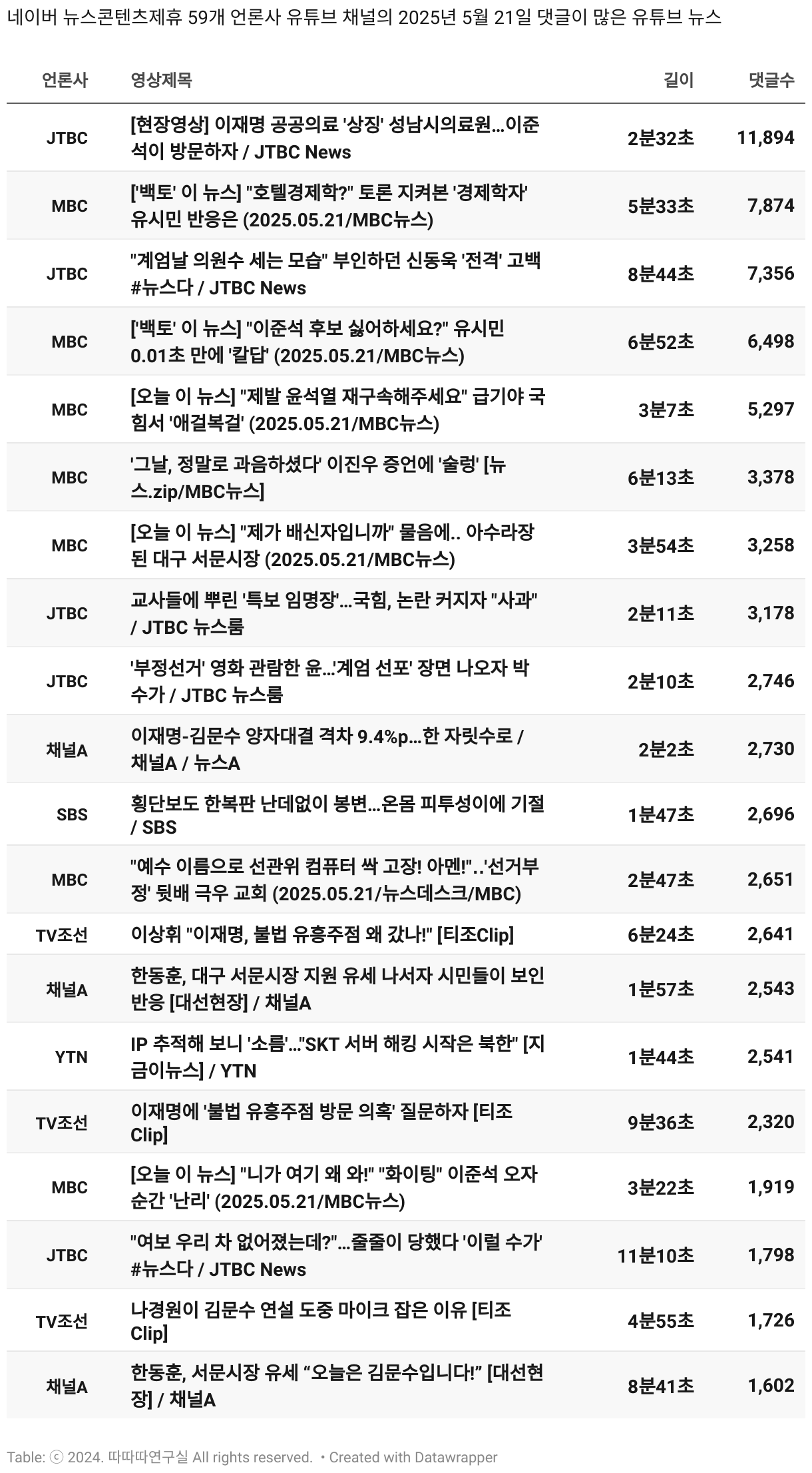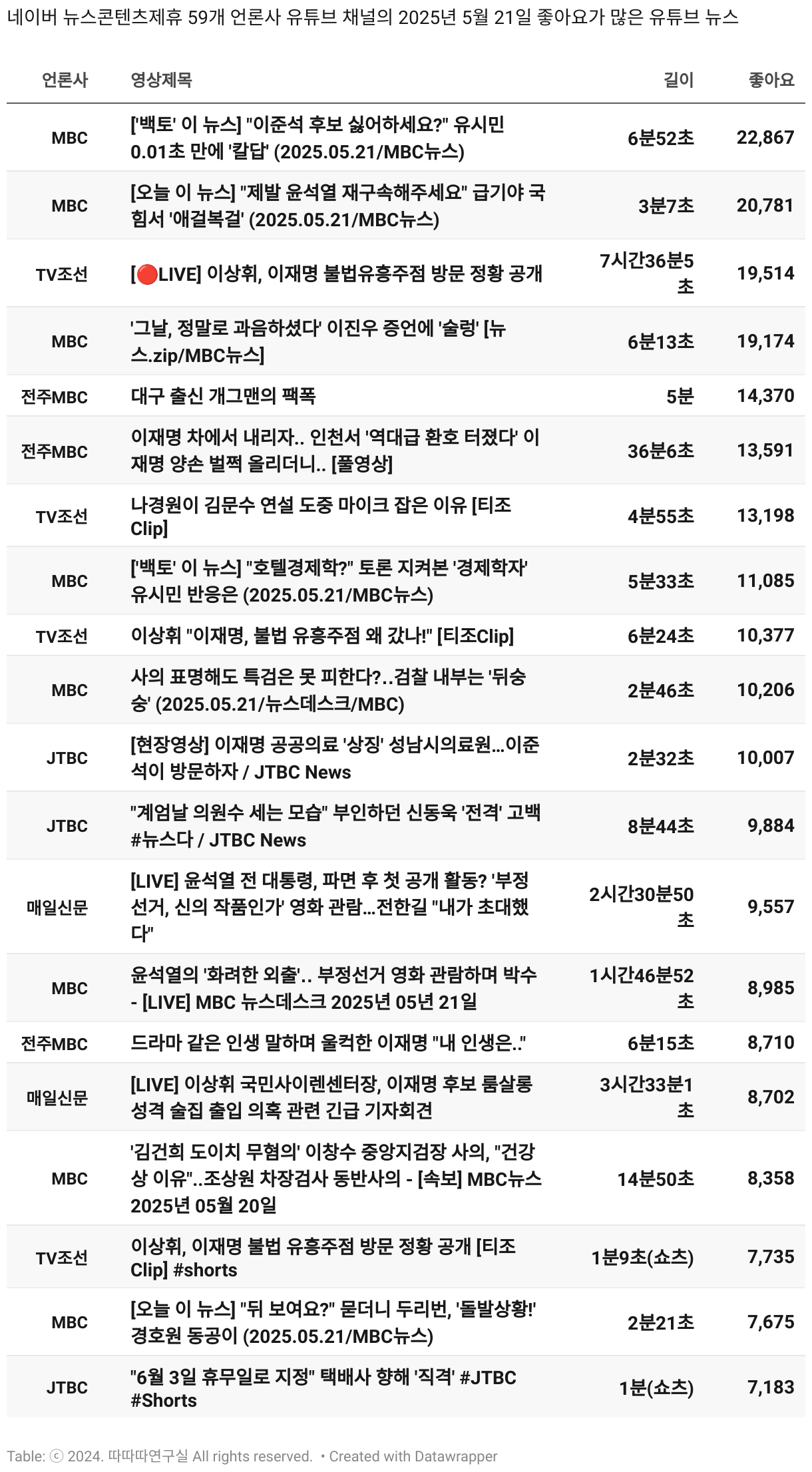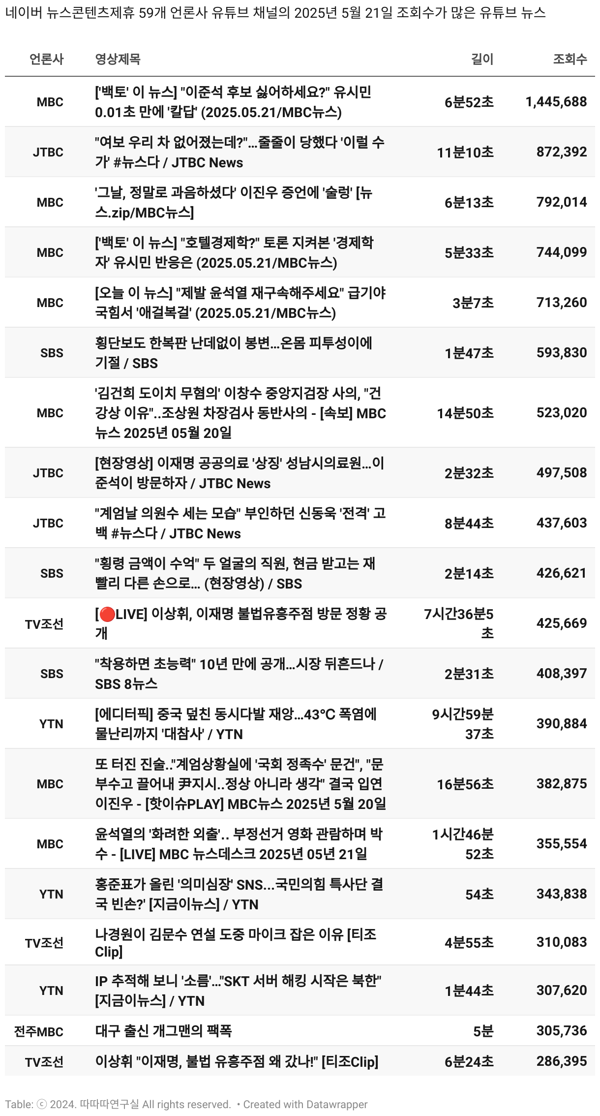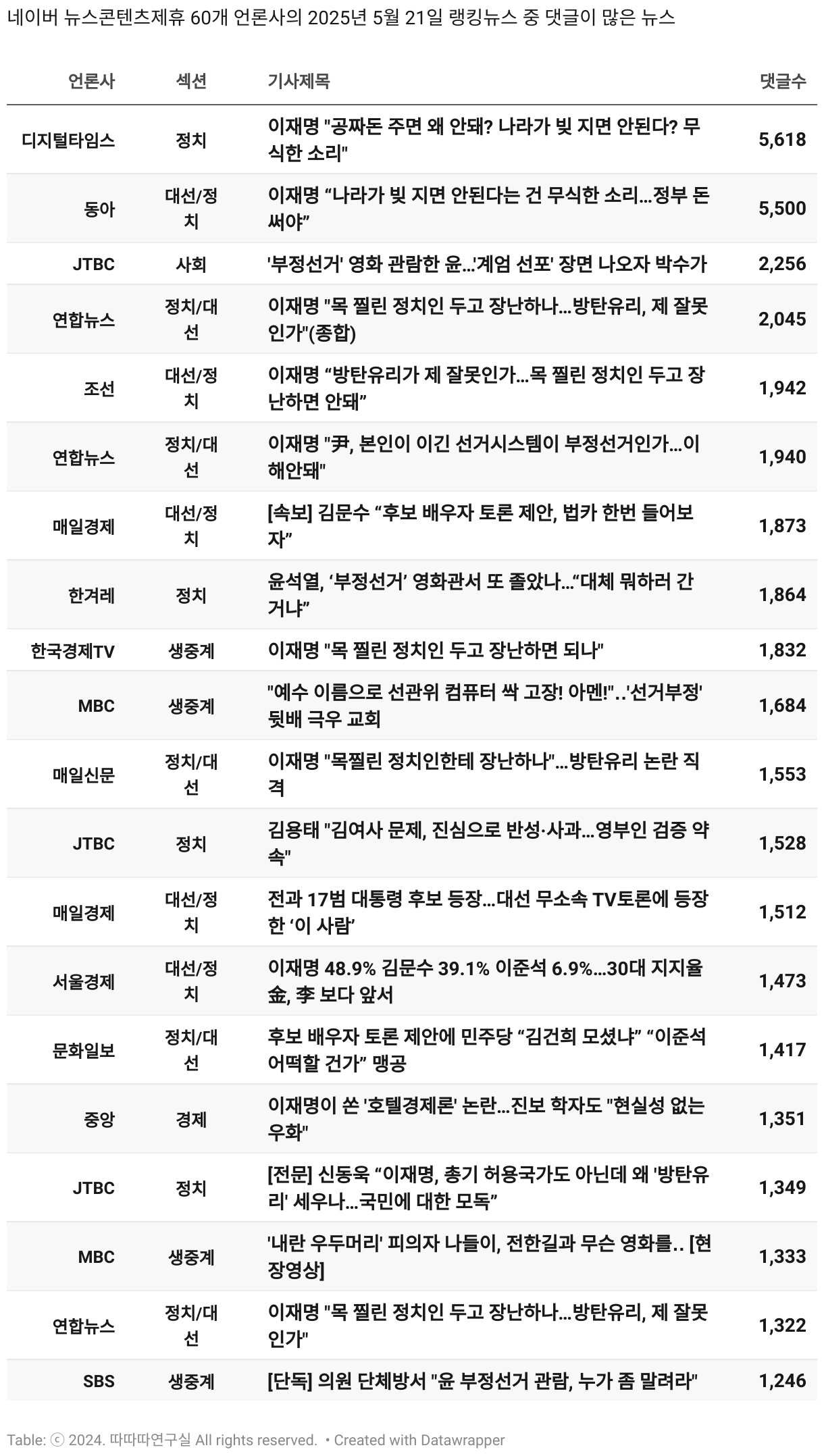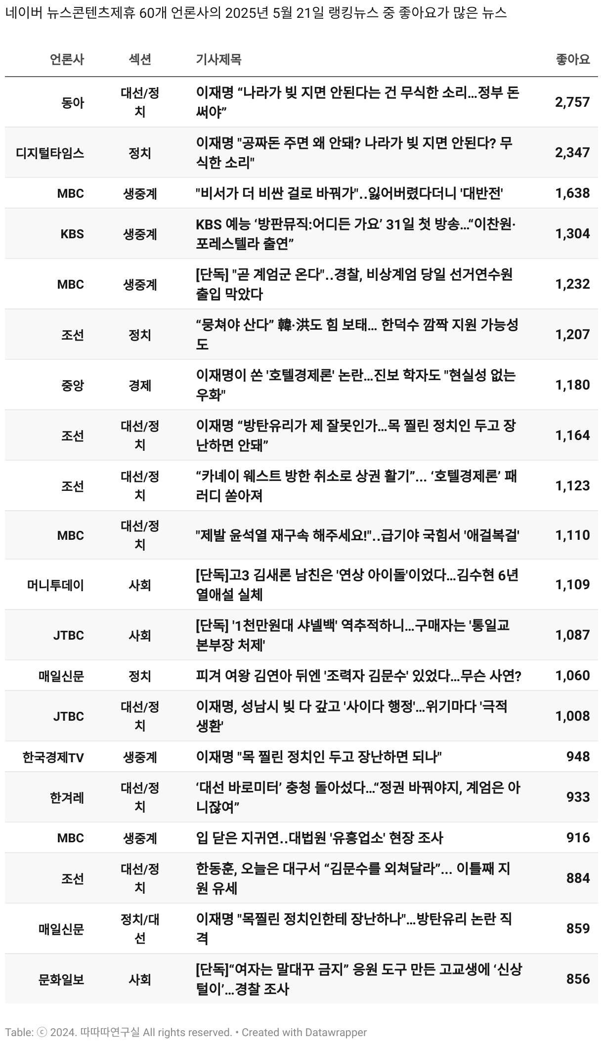 *데이터 수집 기간 : 2024년 6월 10일 *데이터 수집 대상 : 네이버 뉴스콘텐츠제휴 60개 언론사. 종합일간지 10개(경향신문, 국민일보, 동아일보, 문화일보, 서울신문, 세계일보, 조선일보, 중앙일보, 한겨레신문, 한국일보), 방송/통신사 14개(뉴스1, 뉴시스, 연합뉴스, 연합뉴스TV, 채널A, 한국경제TV, JTBC, KBS, MBC, MBN, SBS, SBS BIZ, TV조선, YTN), 경제지 11개(매일경제, 머니투데이, 비즈워치, 서울경제, 아시아경제, 이데일리, 조선비즈, 조세일보, 파이낸셜뉴스, 한국경제(유튜브제외), 헤럴드경제) 인터넷 8개(노컷뉴스, 더팩트, 데일리안, 머니S, 미디어오늘, 아이뉴스24, 오마이뉴스, 프레시안), IT 5개(디지털데일리,디지털타임스, 블로터, 전자신문, 지디넷코리아), 지역 12개(강원도민일보, 강원일보, 경기일보, 국제신문, 대구MBC, 대전일보, 매일신문, 부산일보, 전주MBC, CJB청주방송, JIBS, kbc광주방송)