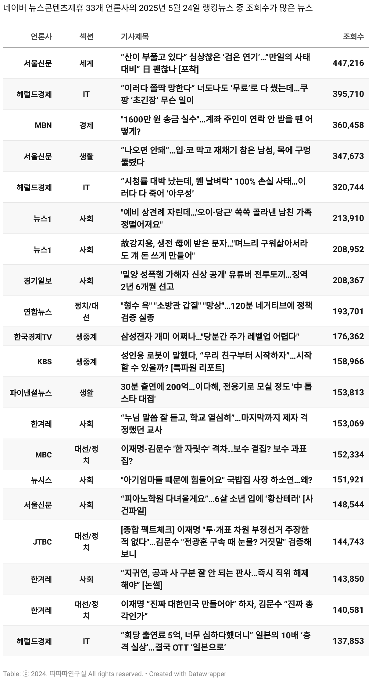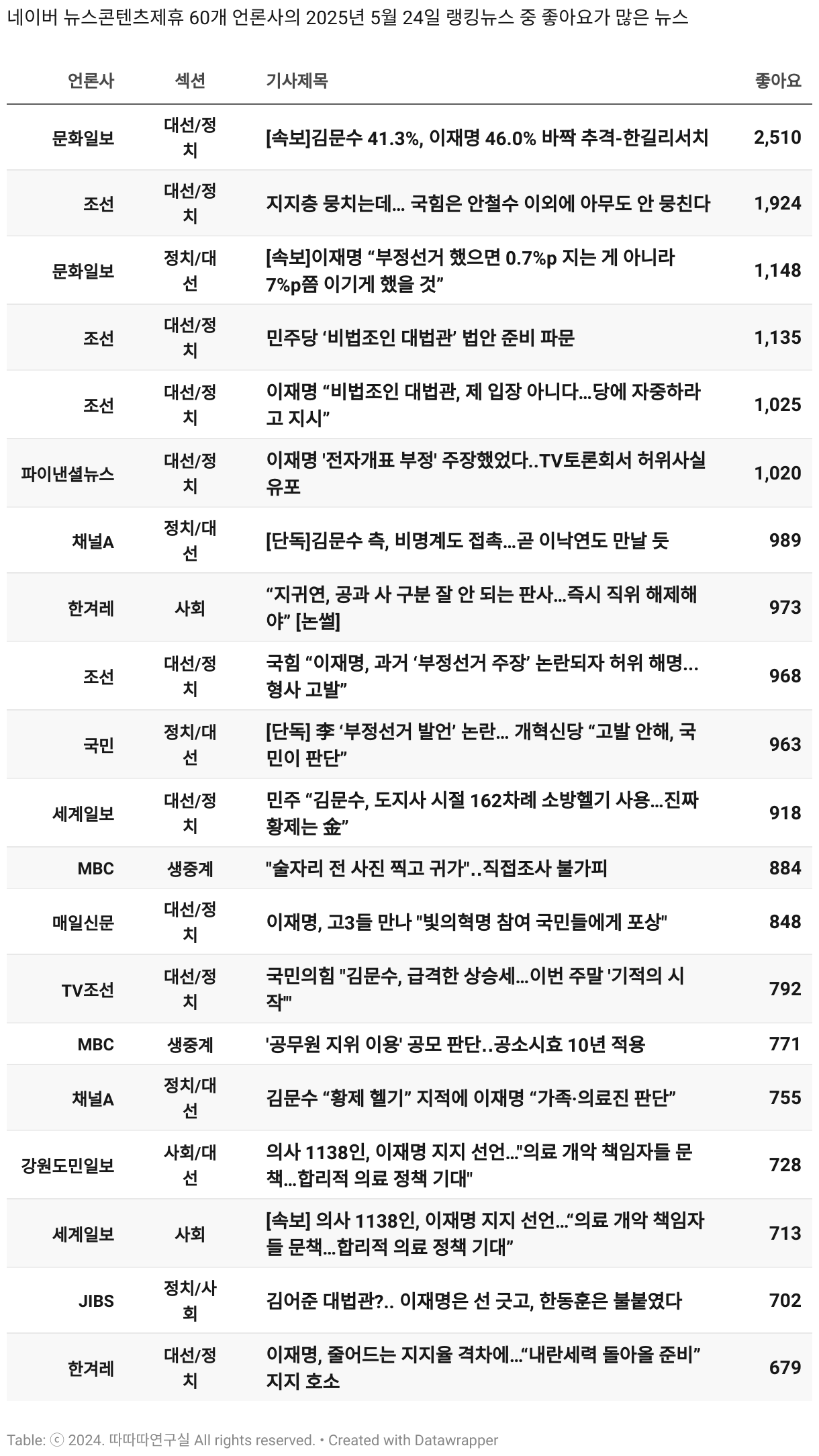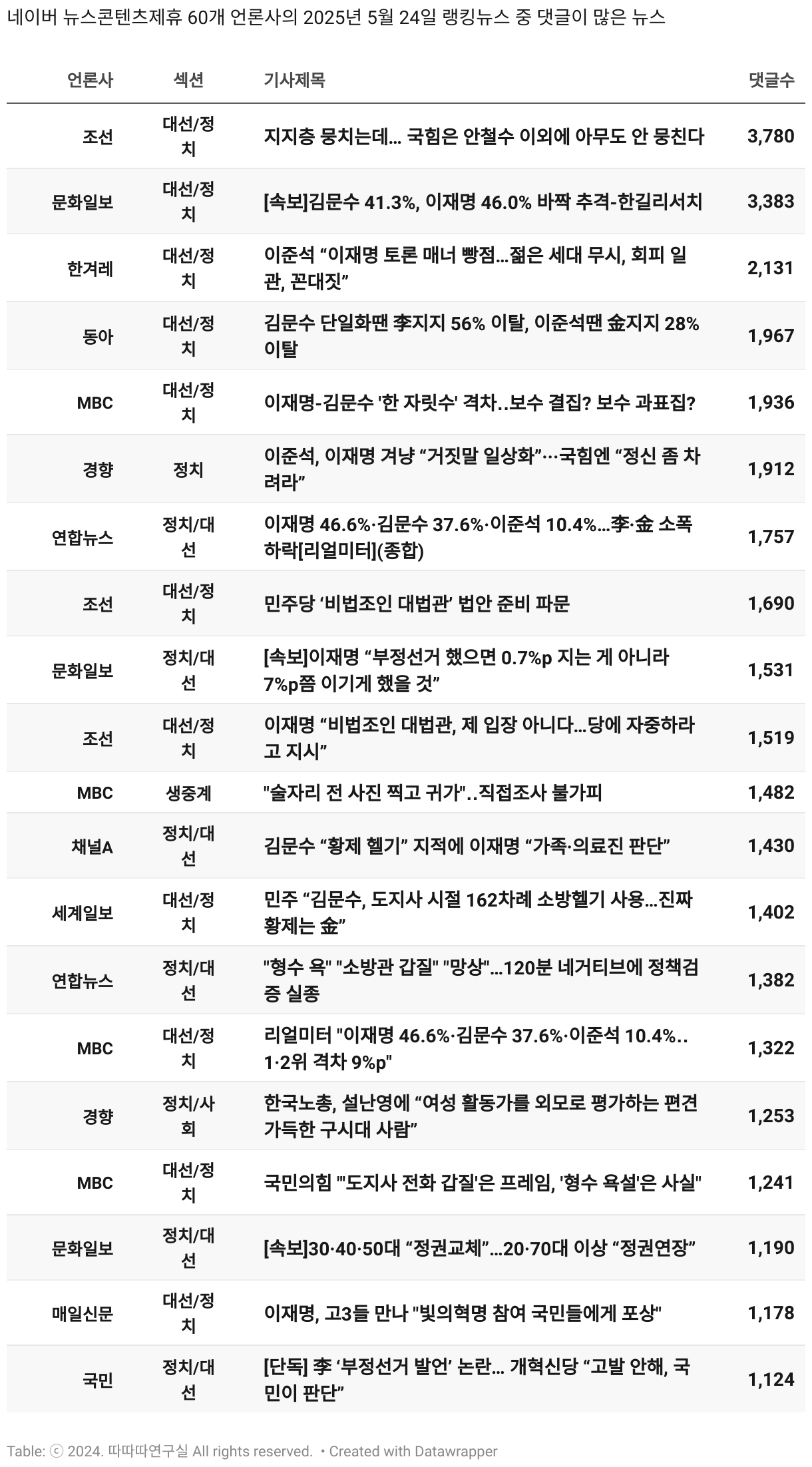 *데이터 수집 기간 : 2024년 6월 10일 *데이터 수집 대상 : 네이버 뉴스콘텐츠제휴 60개 언론사. 종합일간지 10개(경향신문, 국민일보, 동아일보, 문화일보, 서울신문, 세계일보, 조선일보, 중앙일보, 한겨레신문, 한국일보), 방송/통신사 14개(뉴스1, 뉴시스, 연합뉴스, 연합뉴스TV, 채널A, 한국경제TV, JTBC, KBS, MBC, MBN, SBS, SBS BIZ, TV조선, YTN), 경제지 11개(매일경제, 머니투데이, 비즈워치, 서울경제, 아시아경제, 이데일리, 조선비즈, 조세일보, 파이낸셜뉴스, 한국경제(유튜브제외), 헤럴드경제) 인터넷 8개(노컷뉴스, 더팩트, 데일리안, 머니S, 미디어오늘, 아이뉴스24, 오마이뉴스, 프레시안), IT 5개(디지털데일리,디지털타임스, 블로터, 전자신문, 지디넷코리아), 지역 12개(강원도민일보, 강원일보, 경기일보, 국제신문, 대구MBC, 대전일보, 매일신문, 부산일보, 전주MBC, CJB청주방송, JIBS, kbc광주방송)