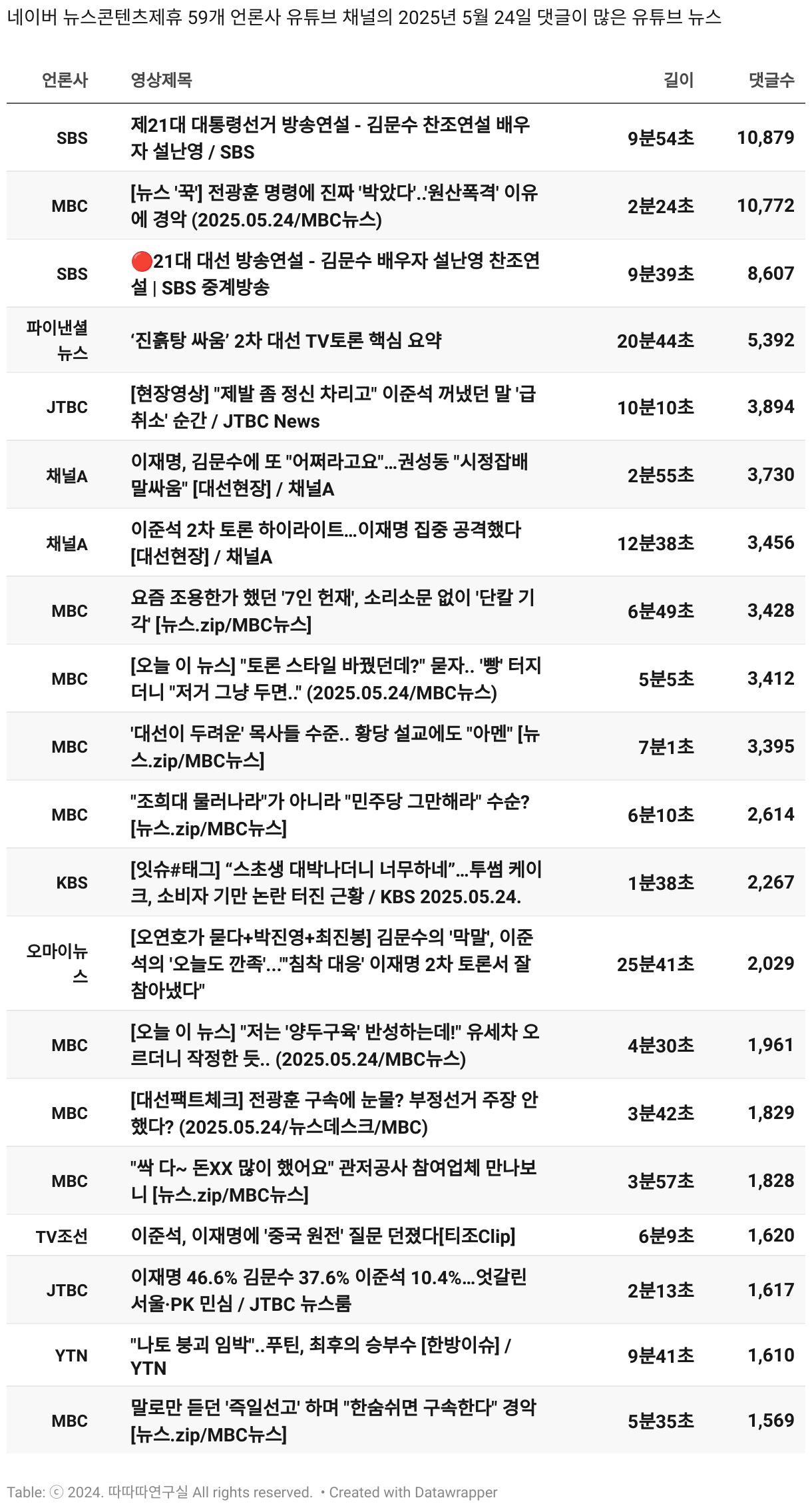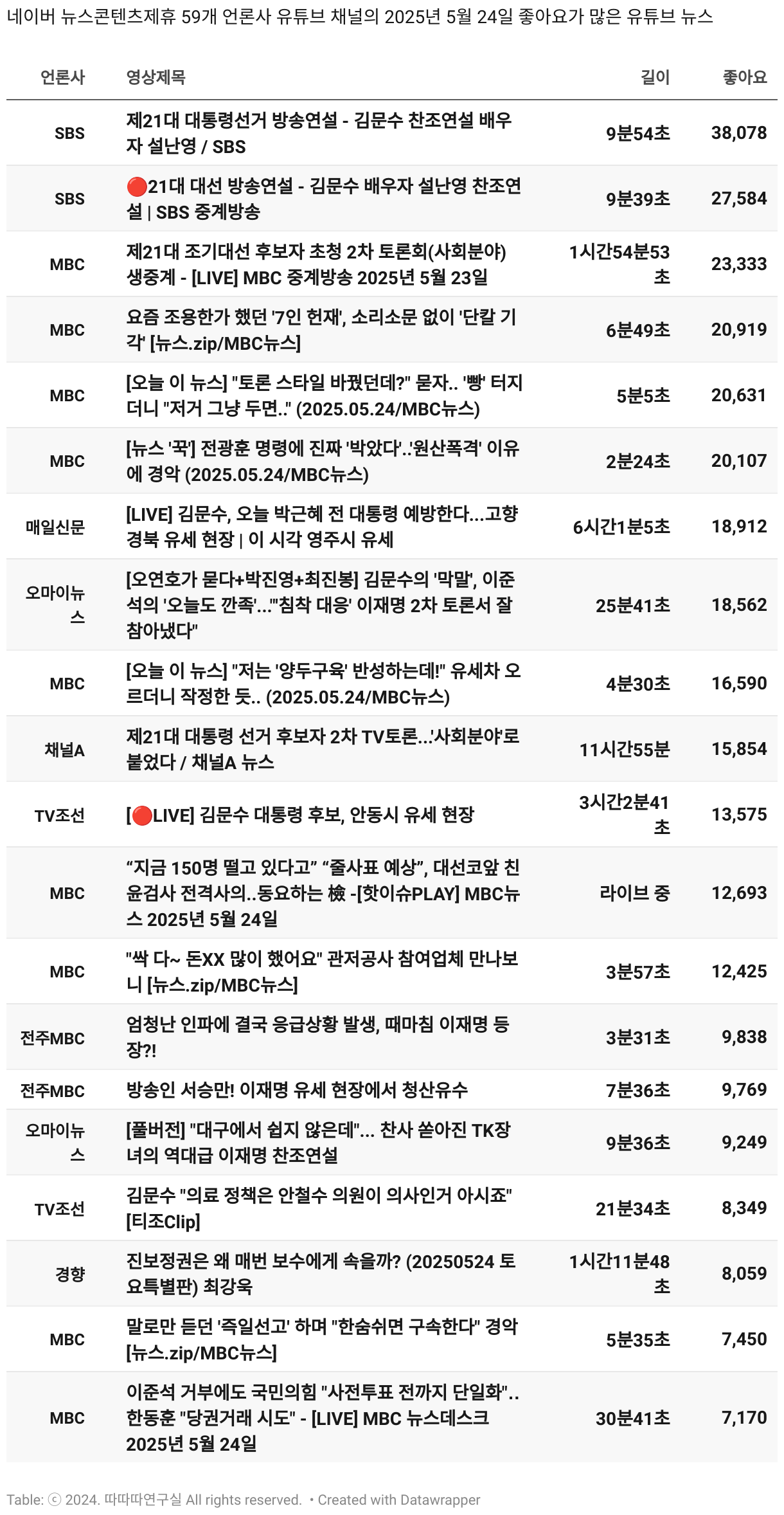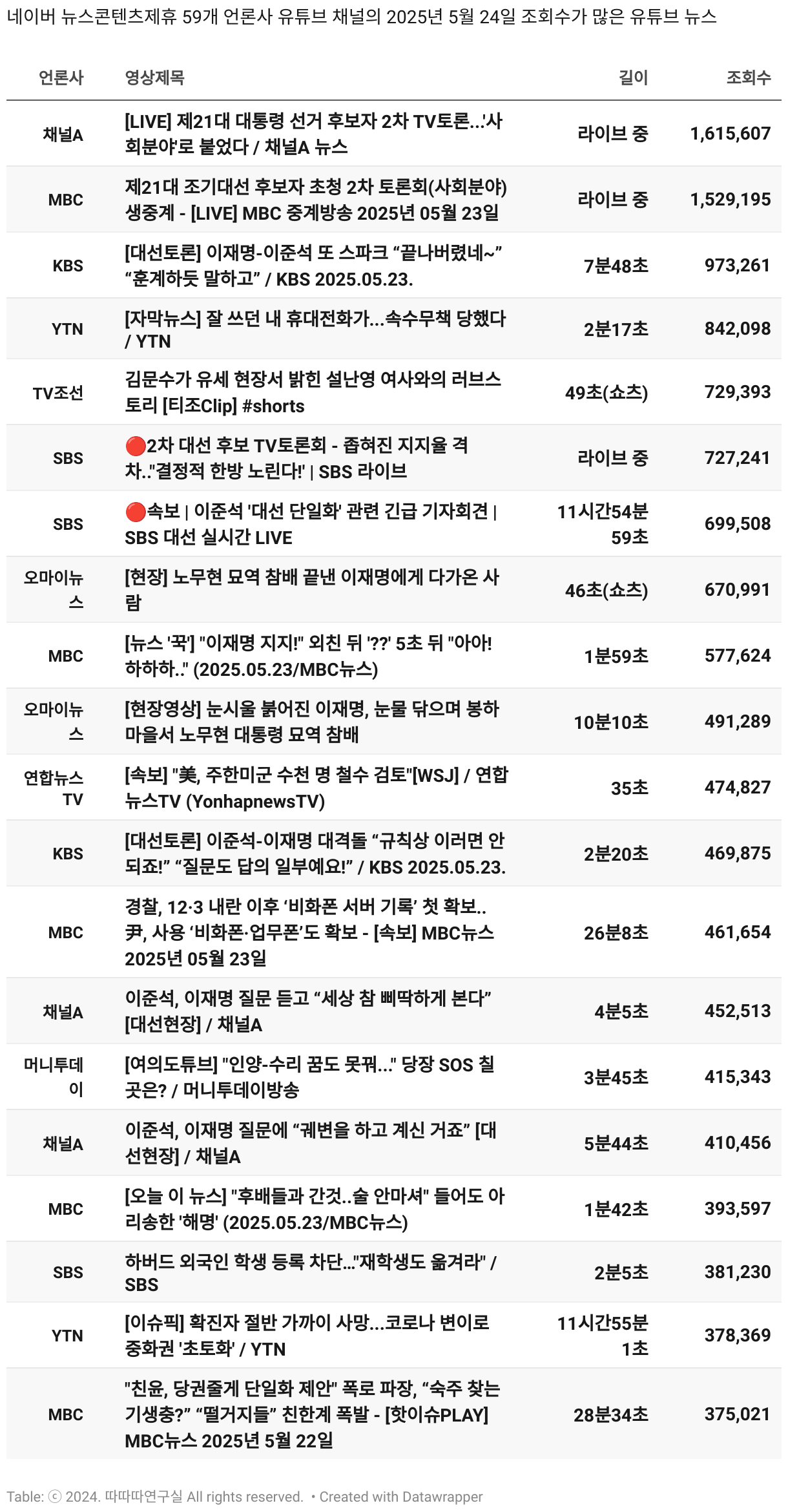 *데이터 수집 기간 : 2024년 6월 10일 *데이터 수집 대상 : 네이버 뉴스콘텐츠제휴 60개 언론사. 종합일간지 10개(경향신문, 국민일보, 동아일보, 문화일보, 서울신문, 세계일보, 조선일보, 중앙일보, 한겨레신문, 한국일보), 방송/통신사 14개(뉴스1, 뉴시스, 연합뉴스, 연합뉴스TV, 채널A, 한국경제TV, JTBC, KBS, MBC, MBN, SBS, SBS BIZ, TV조선, YTN), 경제지 11개(매일경제, 머니투데이, 비즈워치, 서울경제, 아시아경제, 이데일리, 조선비즈, 조세일보, 파이낸셜뉴스, 한국경제(유튜브제외), 헤럴드경제) 인터넷 8개(노컷뉴스, 더팩트, 데일리안, 머니S, 미디어오늘, 아이뉴스24, 오마이뉴스, 프레시안), IT 5개(디지털데일리,디지털타임스, 블로터, 전자신문, 지디넷코리아), 지역 12개(강원도민일보, 강원일보, 경기일보, 국제신문, 대구MBC, 대전일보, 매일신문, 부산일보, 전주MBC, CJB청주방송, JIBS, kbc광주방송)