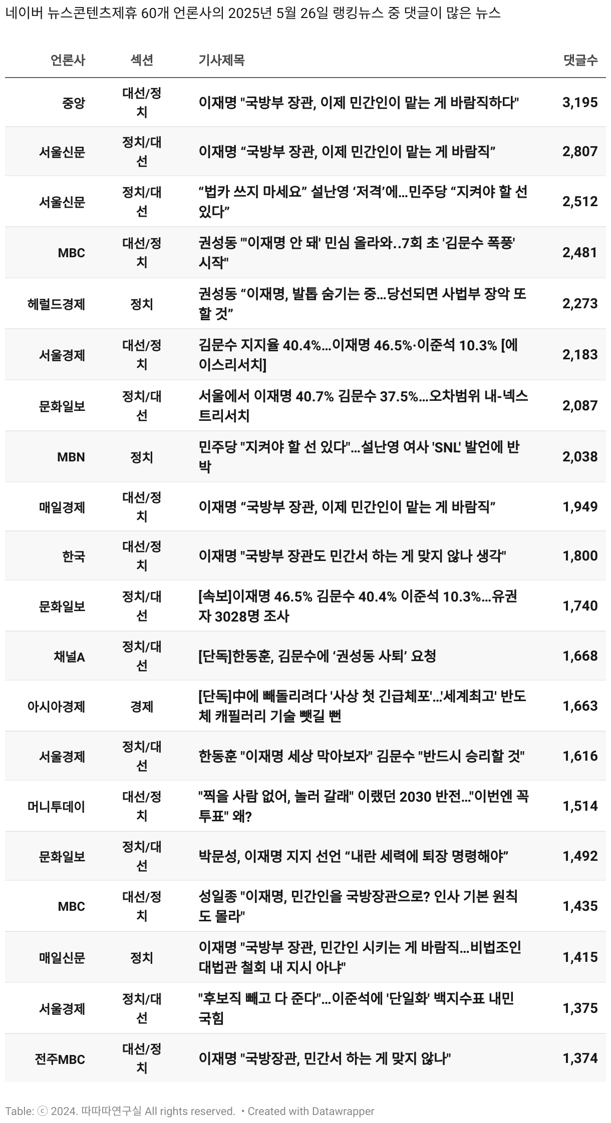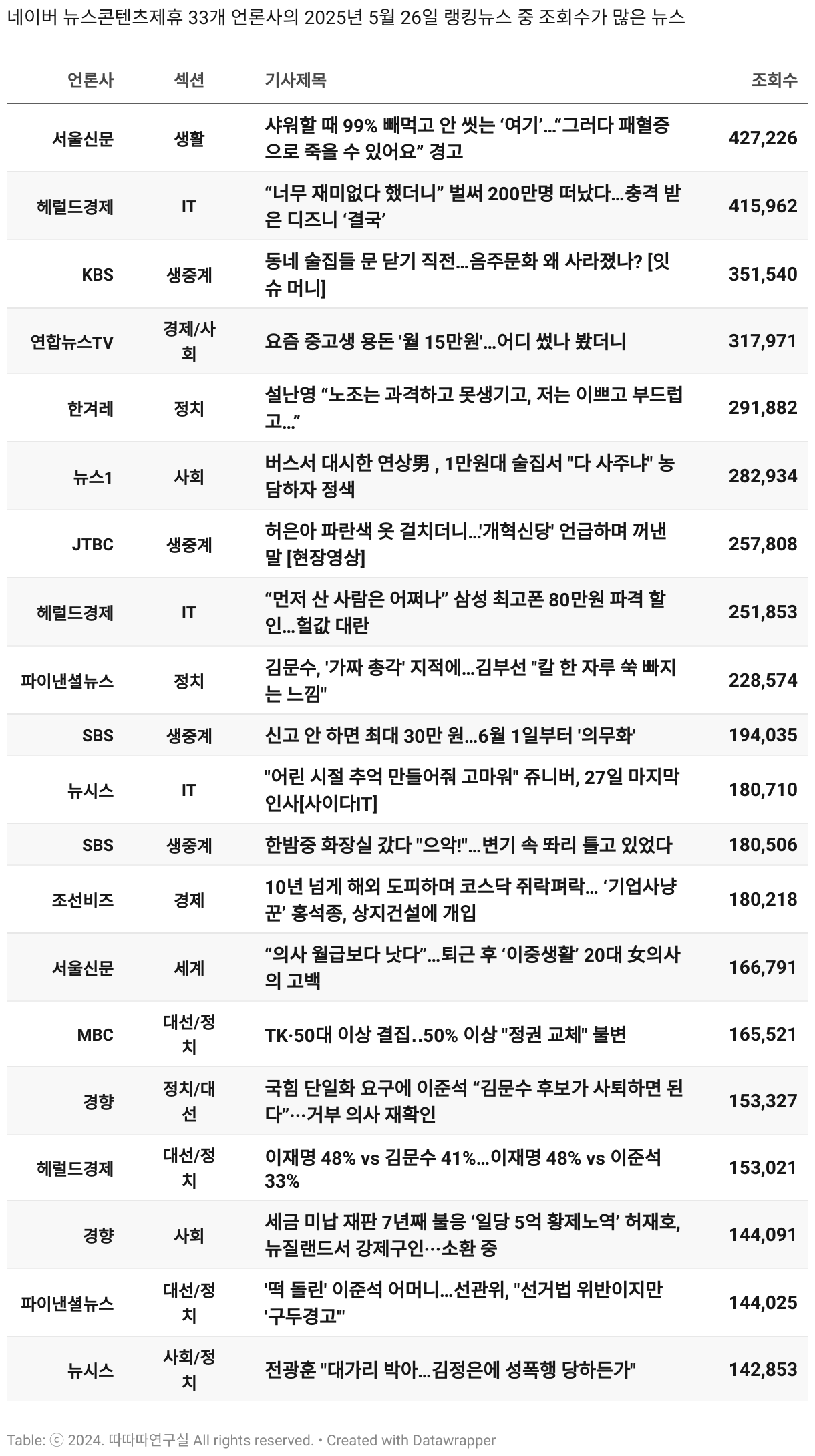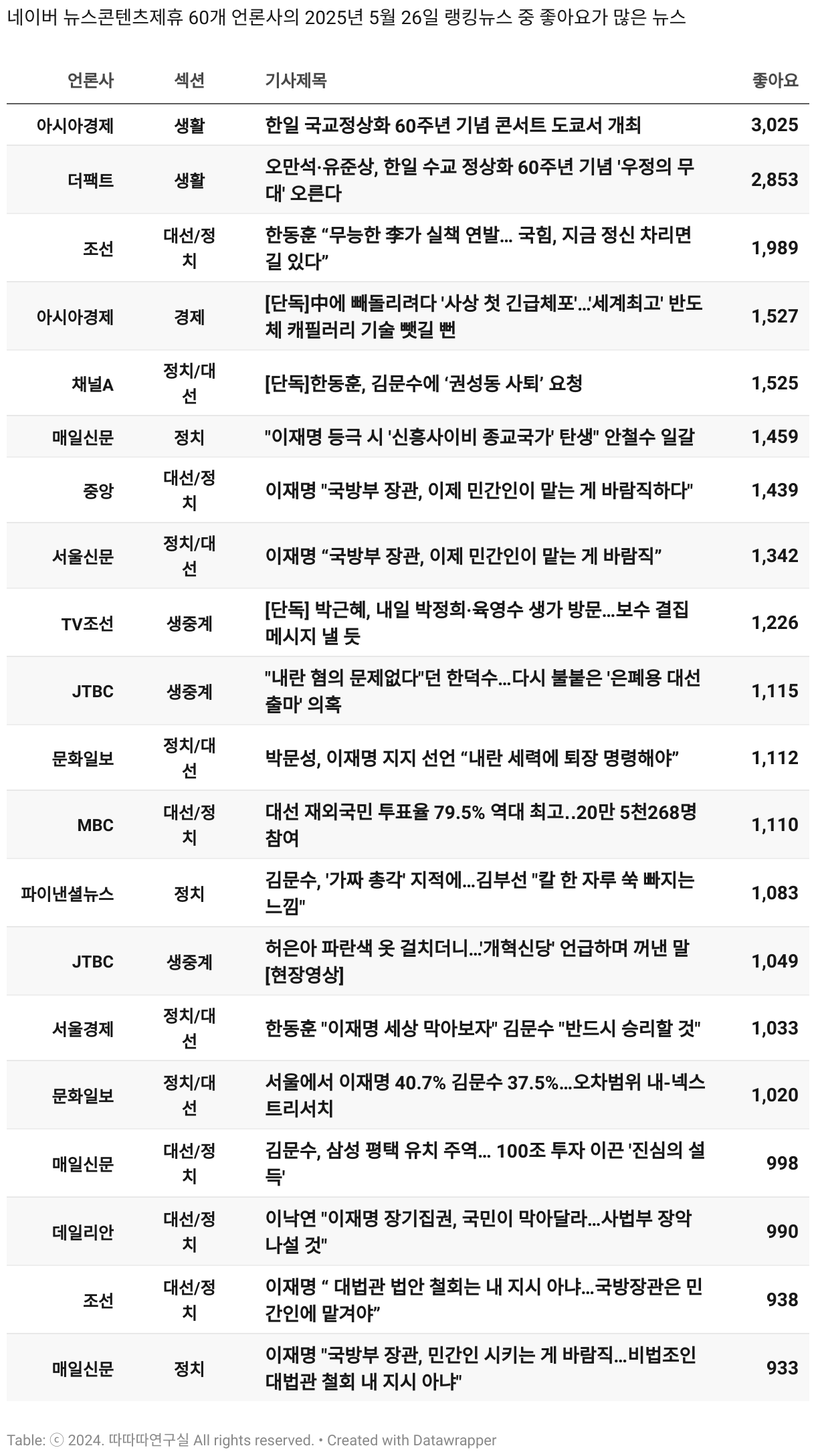 *데이터 수집 기간 : 2024년 6월 10일 *데이터 수집 대상 : 네이버 뉴스콘텐츠제휴 60개 언론사. 종합일간지 10개(경향신문, 국민일보, 동아일보, 문화일보, 서울신문, 세계일보, 조선일보, 중앙일보, 한겨레신문, 한국일보), 방송/통신사 14개(뉴스1, 뉴시스, 연합뉴스, 연합뉴스TV, 채널A, 한국경제TV, JTBC, KBS, MBC, MBN, SBS, SBS BIZ, TV조선, YTN), 경제지 11개(매일경제, 머니투데이, 비즈워치, 서울경제, 아시아경제, 이데일리, 조선비즈, 조세일보, 파이낸셜뉴스, 한국경제(유튜브제외), 헤럴드경제) 인터넷 8개(노컷뉴스, 더팩트, 데일리안, 머니S, 미디어오늘, 아이뉴스24, 오마이뉴스, 프레시안), IT 5개(디지털데일리,디지털타임스, 블로터, 전자신문, 지디넷코리아), 지역 12개(강원도민일보, 강원일보, 경기일보, 국제신문, 대구MBC, 대전일보, 매일신문, 부산일보, 전주MBC, CJB청주방송, JIBS, kbc광주방송)