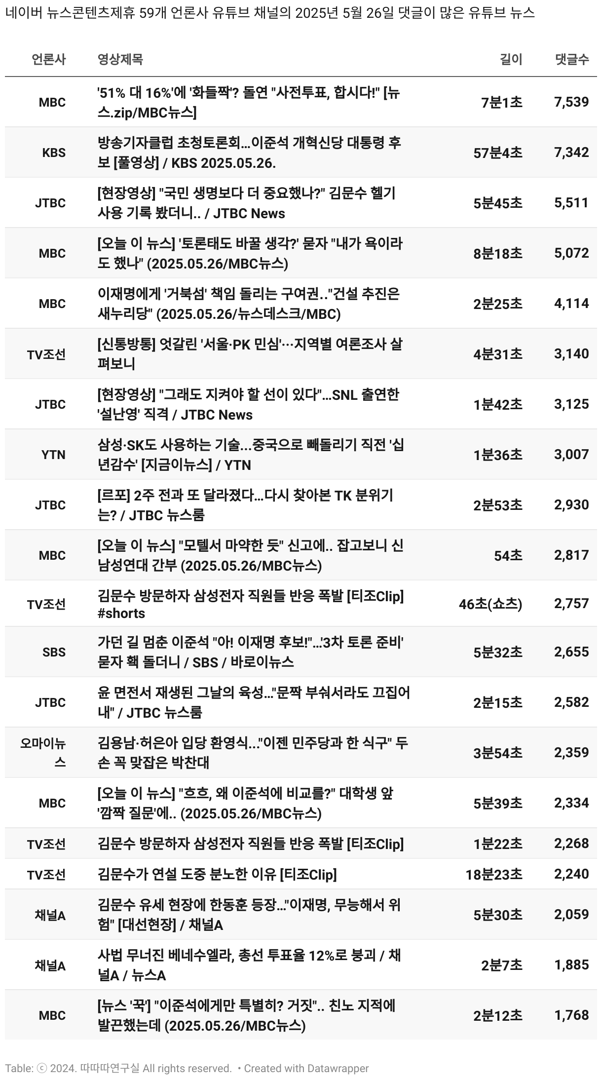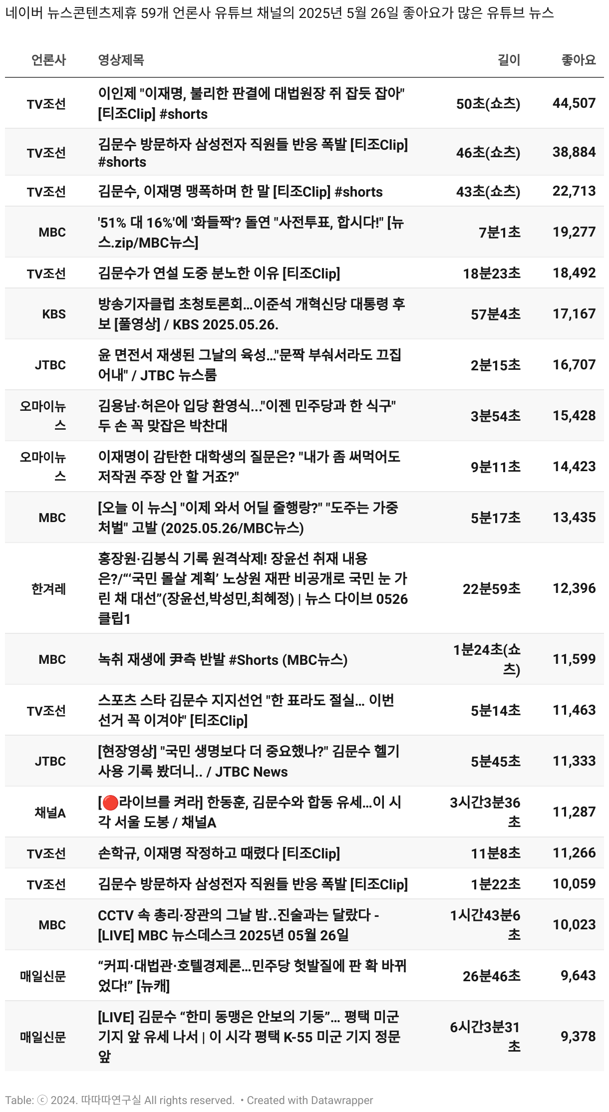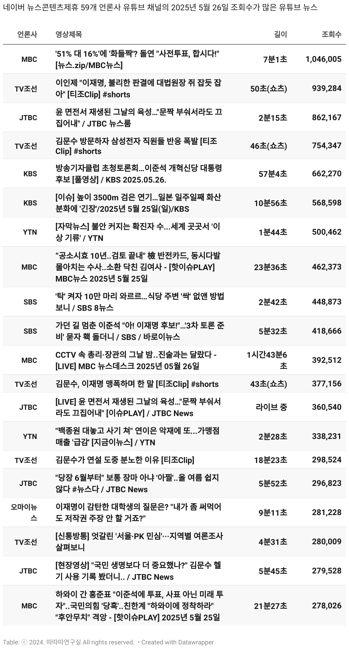 *데이터 수집 기간 : 2024년 6월 10일 *데이터 수집 대상 : 네이버 뉴스콘텐츠제휴 60개 언론사. 종합일간지 10개(경향신문, 국민일보, 동아일보, 문화일보, 서울신문, 세계일보, 조선일보, 중앙일보, 한겨레신문, 한국일보), 방송/통신사 14개(뉴스1, 뉴시스, 연합뉴스, 연합뉴스TV, 채널A, 한국경제TV, JTBC, KBS, MBC, MBN, SBS, SBS BIZ, TV조선, YTN), 경제지 11개(매일경제, 머니투데이, 비즈워치, 서울경제, 아시아경제, 이데일리, 조선비즈, 조세일보, 파이낸셜뉴스, 한국경제(유튜브제외), 헤럴드경제) 인터넷 8개(노컷뉴스, 더팩트, 데일리안, 머니S, 미디어오늘, 아이뉴스24, 오마이뉴스, 프레시안), IT 5개(디지털데일리,디지털타임스, 블로터, 전자신문, 지디넷코리아), 지역 12개(강원도민일보, 강원일보, 경기일보, 국제신문, 대구MBC, 대전일보, 매일신문, 부산일보, 전주MBC, CJB청주방송, JIBS, kbc광주방송)