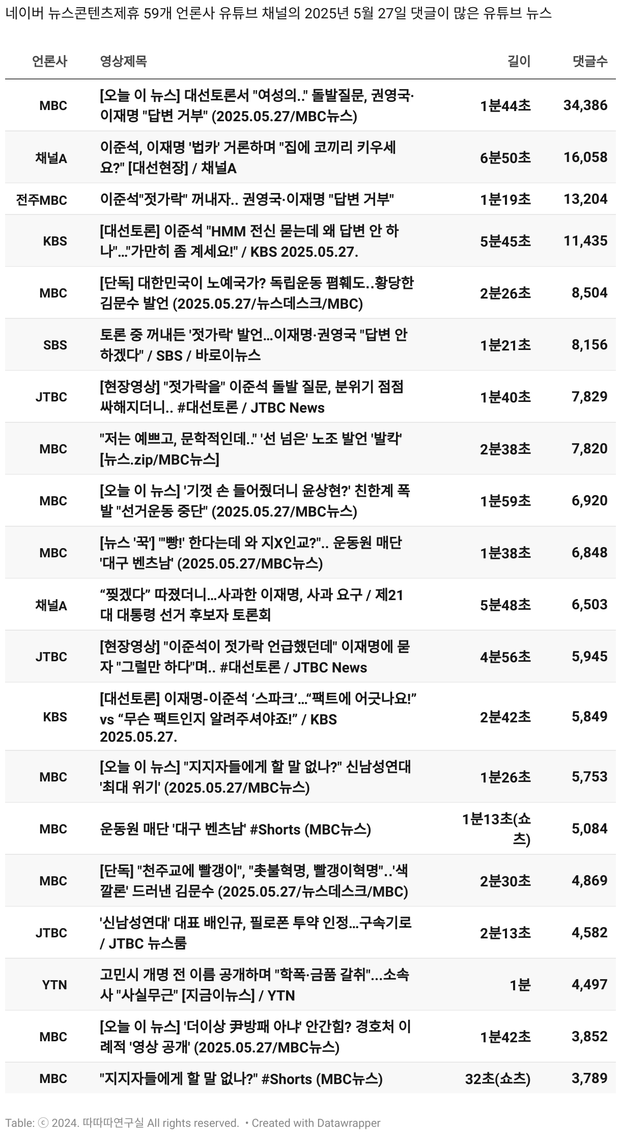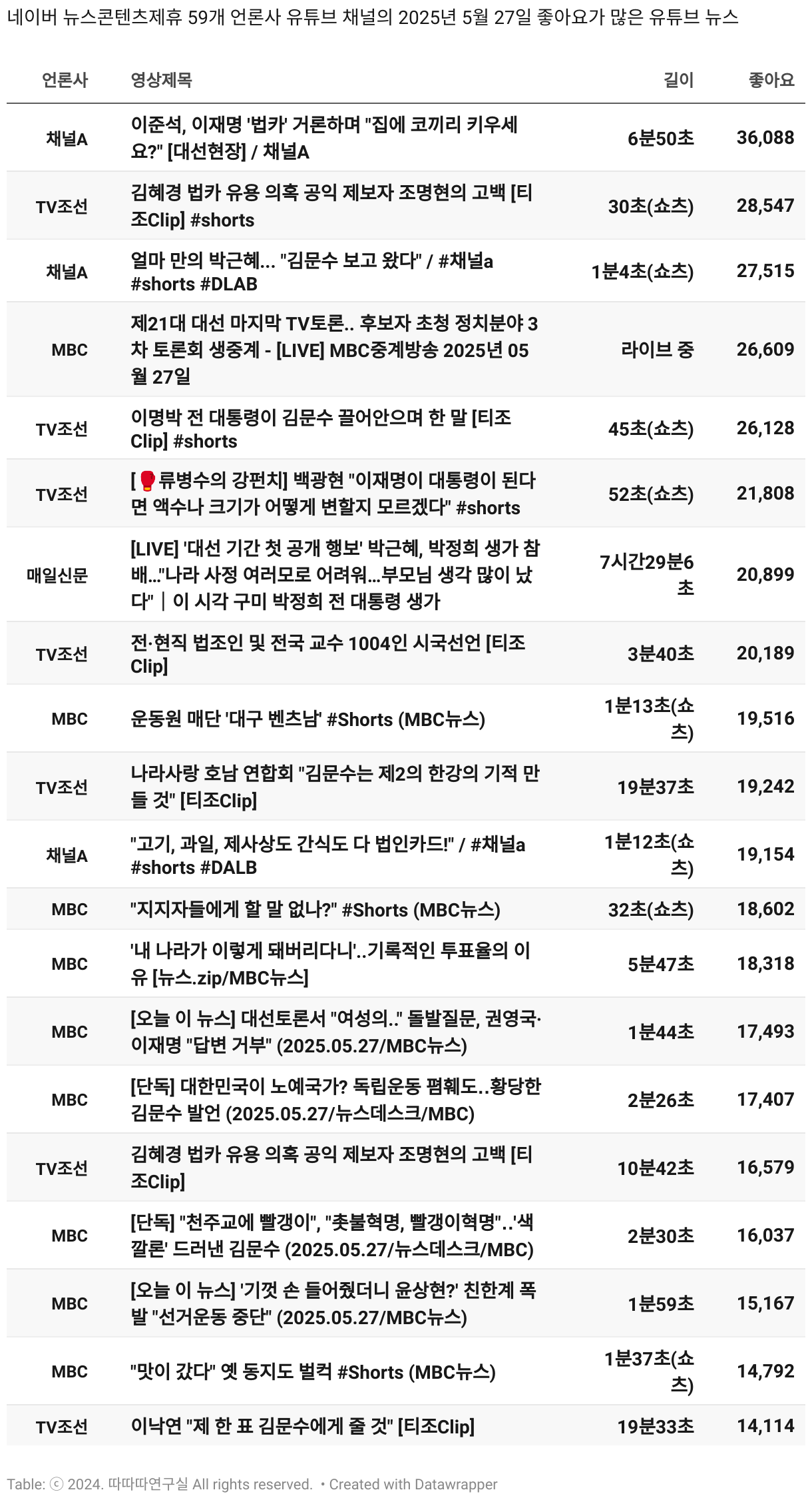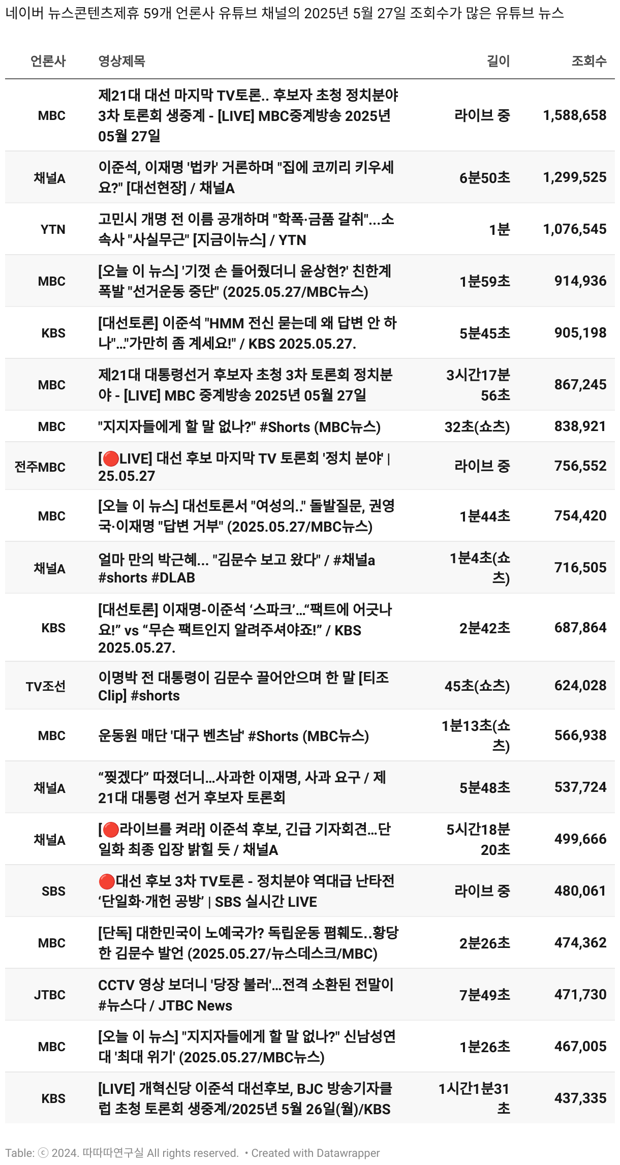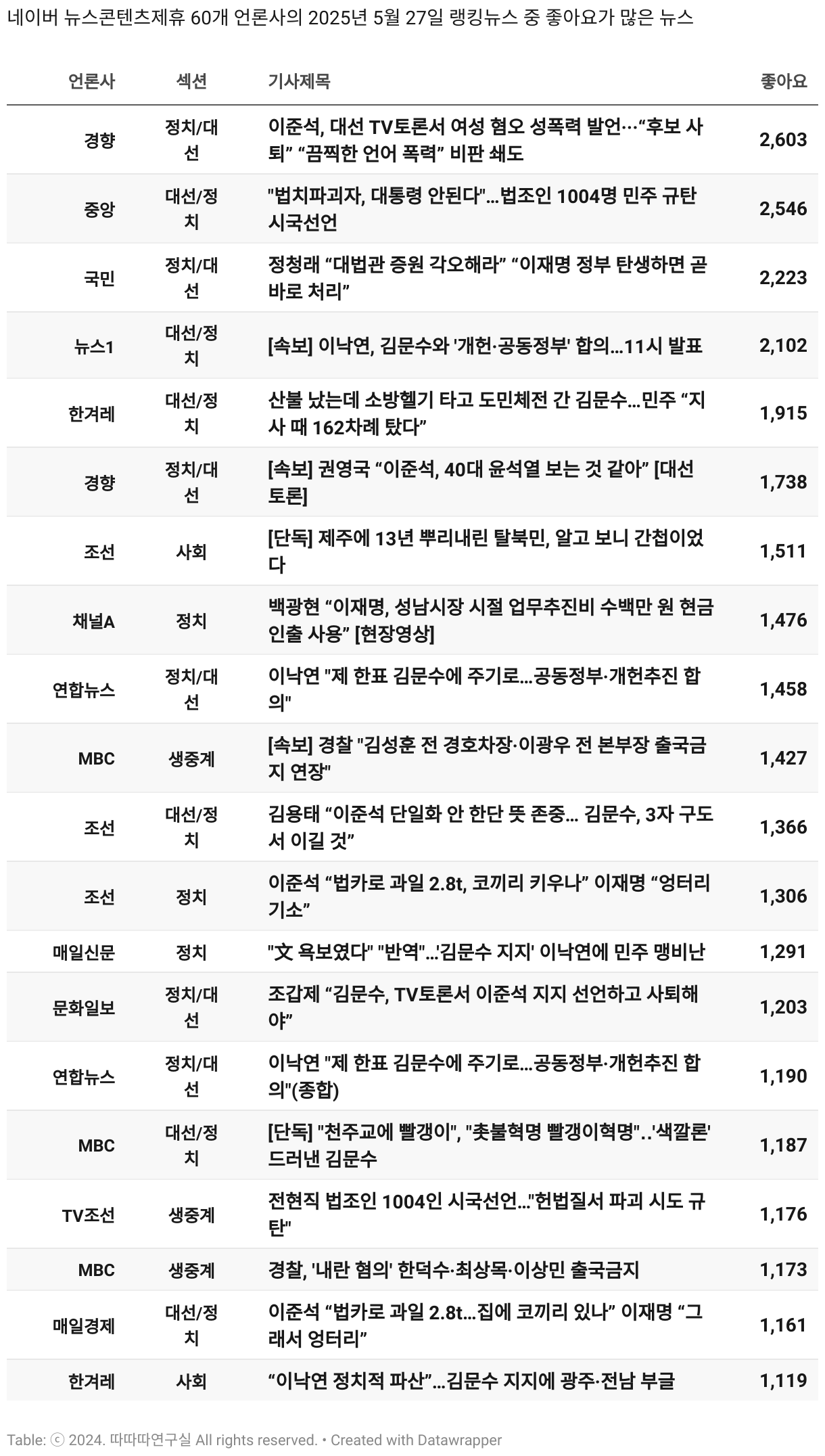 *데이터 수집 기간 : 2024년 6월 10일 *데이터 수집 대상 : 네이버 뉴스콘텐츠제휴 60개 언론사. 종합일간지 10개(경향신문, 국민일보, 동아일보, 문화일보, 서울신문, 세계일보, 조선일보, 중앙일보, 한겨레신문, 한국일보), 방송/통신사 14개(뉴스1, 뉴시스, 연합뉴스, 연합뉴스TV, 채널A, 한국경제TV, JTBC, KBS, MBC, MBN, SBS, SBS BIZ, TV조선, YTN), 경제지 11개(매일경제, 머니투데이, 비즈워치, 서울경제, 아시아경제, 이데일리, 조선비즈, 조세일보, 파이낸셜뉴스, 한국경제(유튜브제외), 헤럴드경제) 인터넷 8개(노컷뉴스, 더팩트, 데일리안, 머니S, 미디어오늘, 아이뉴스24, 오마이뉴스, 프레시안), IT 5개(디지털데일리,디지털타임스, 블로터, 전자신문, 지디넷코리아), 지역 12개(강원도민일보, 강원일보, 경기일보, 국제신문, 대구MBC, 대전일보, 매일신문, 부산일보, 전주MBC, CJB청주방송, JIBS, kbc광주방송)