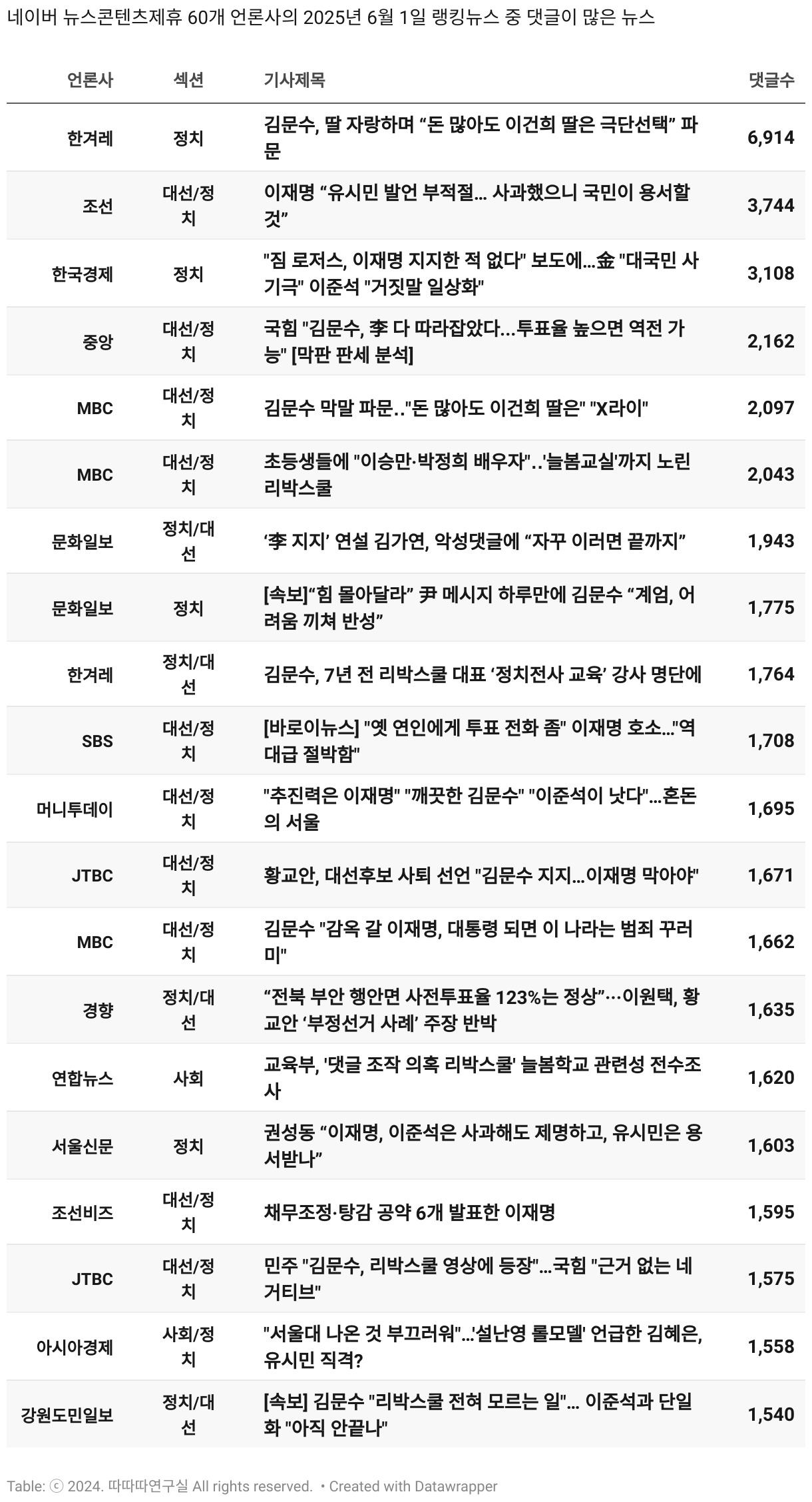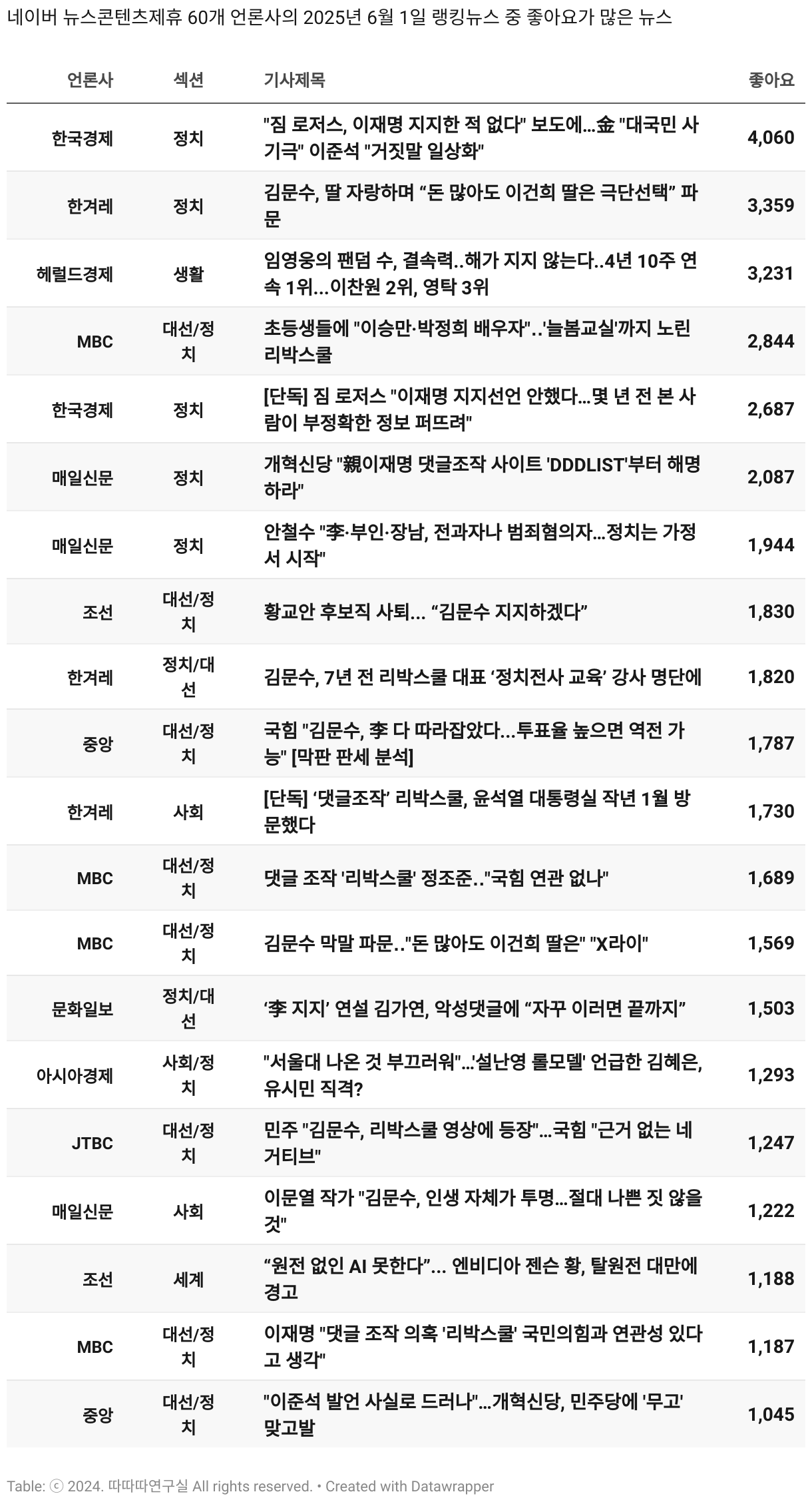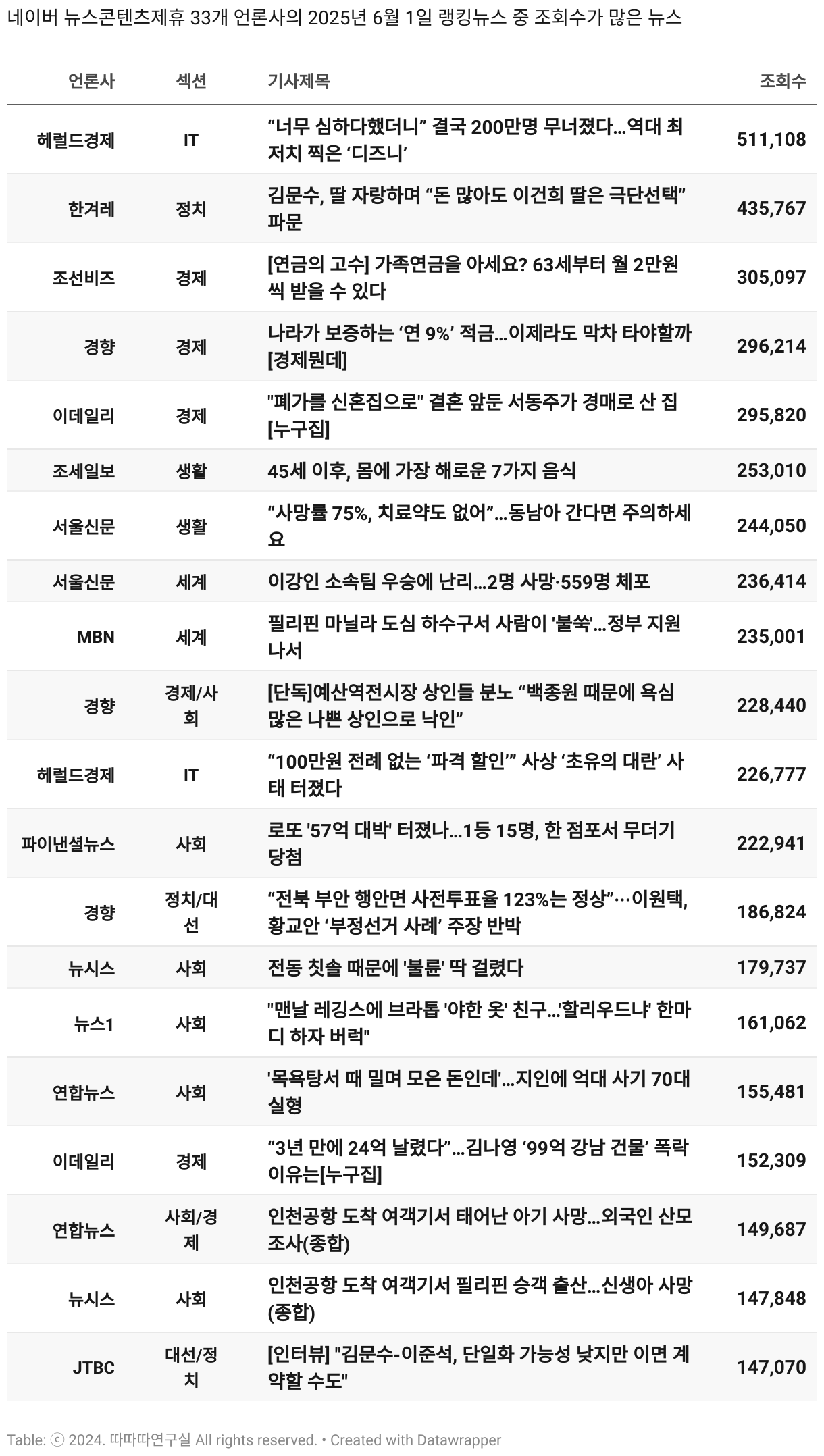 *데이터 수집 기간 : 2024년 6월 10일 *데이터 수집 대상 : 네이버 뉴스콘텐츠제휴 60개 언론사. 종합일간지 10개(경향신문, 국민일보, 동아일보, 문화일보, 서울신문, 세계일보, 조선일보, 중앙일보, 한겨레신문, 한국일보), 방송/통신사 14개(뉴스1, 뉴시스, 연합뉴스, 연합뉴스TV, 채널A, 한국경제TV, JTBC, KBS, MBC, MBN, SBS, SBS BIZ, TV조선, YTN), 경제지 11개(매일경제, 머니투데이, 비즈워치, 서울경제, 아시아경제, 이데일리, 조선비즈, 조세일보, 파이낸셜뉴스, 한국경제(유튜브제외), 헤럴드경제) 인터넷 8개(노컷뉴스, 더팩트, 데일리안, 머니S, 미디어오늘, 아이뉴스24, 오마이뉴스, 프레시안), IT 5개(디지털데일리,디지털타임스, 블로터, 전자신문, 지디넷코리아), 지역 12개(강원도민일보, 강원일보, 경기일보, 국제신문, 대구MBC, 대전일보, 매일신문, 부산일보, 전주MBC, CJB청주방송, JIBS, kbc광주방송)