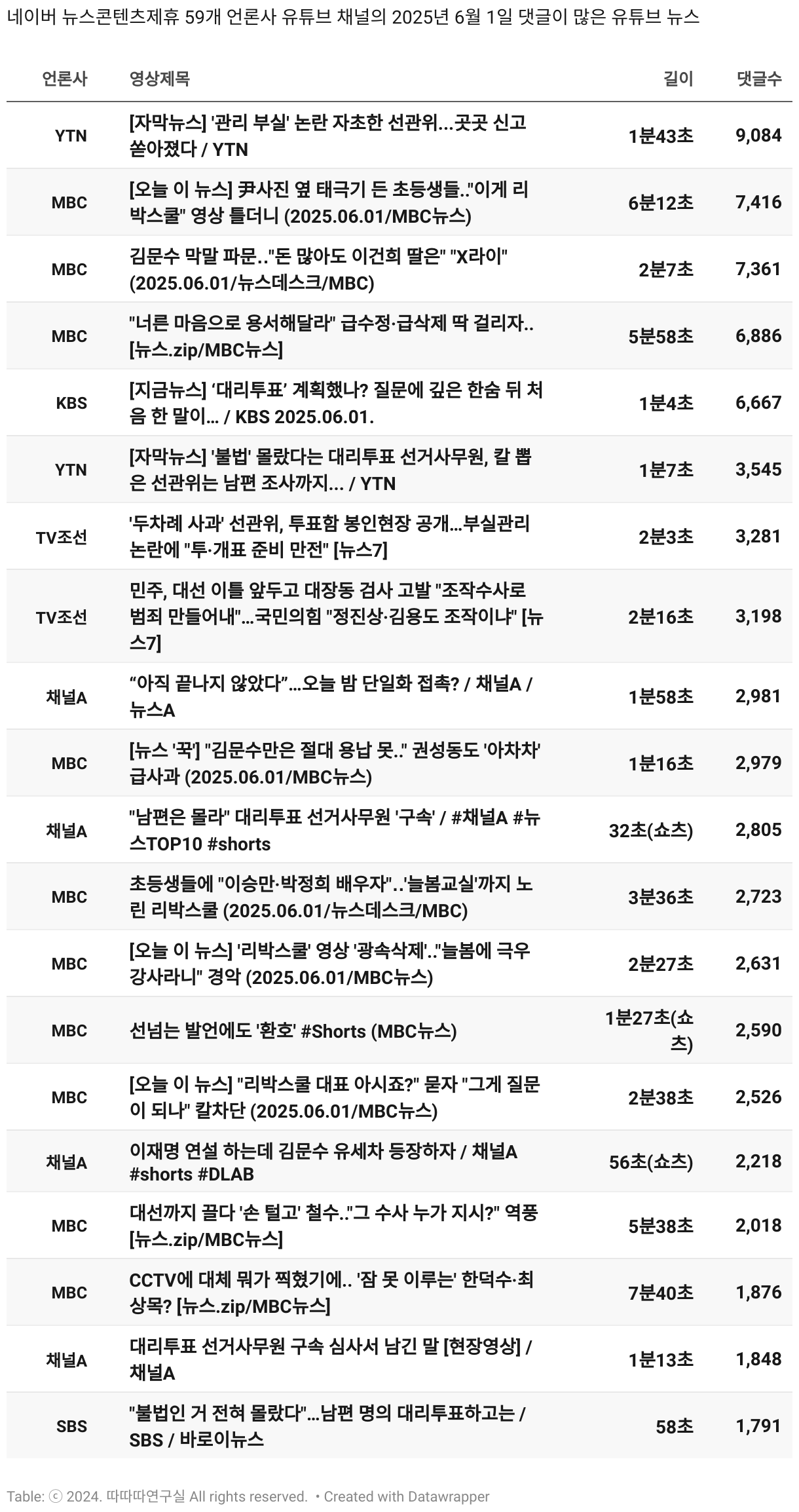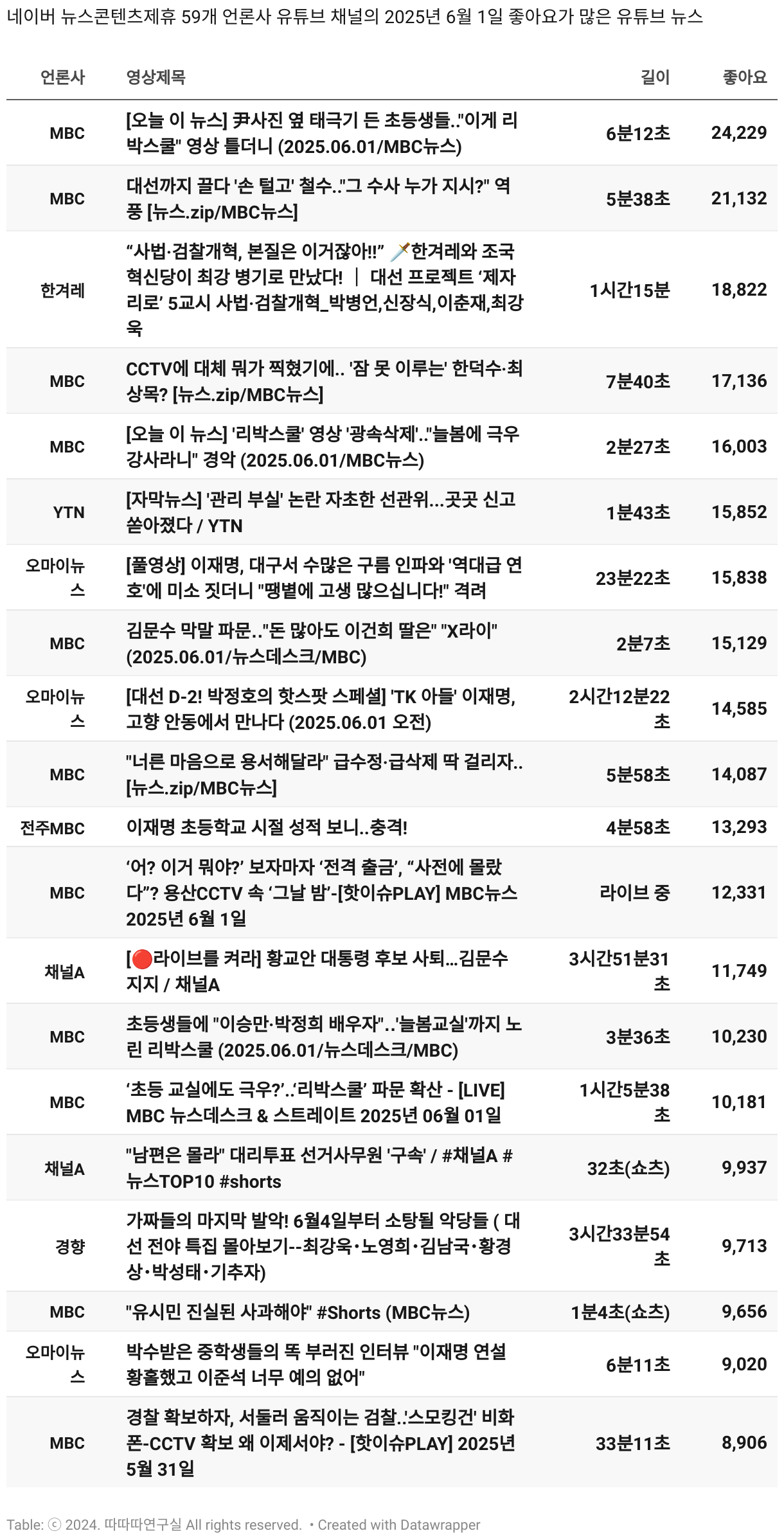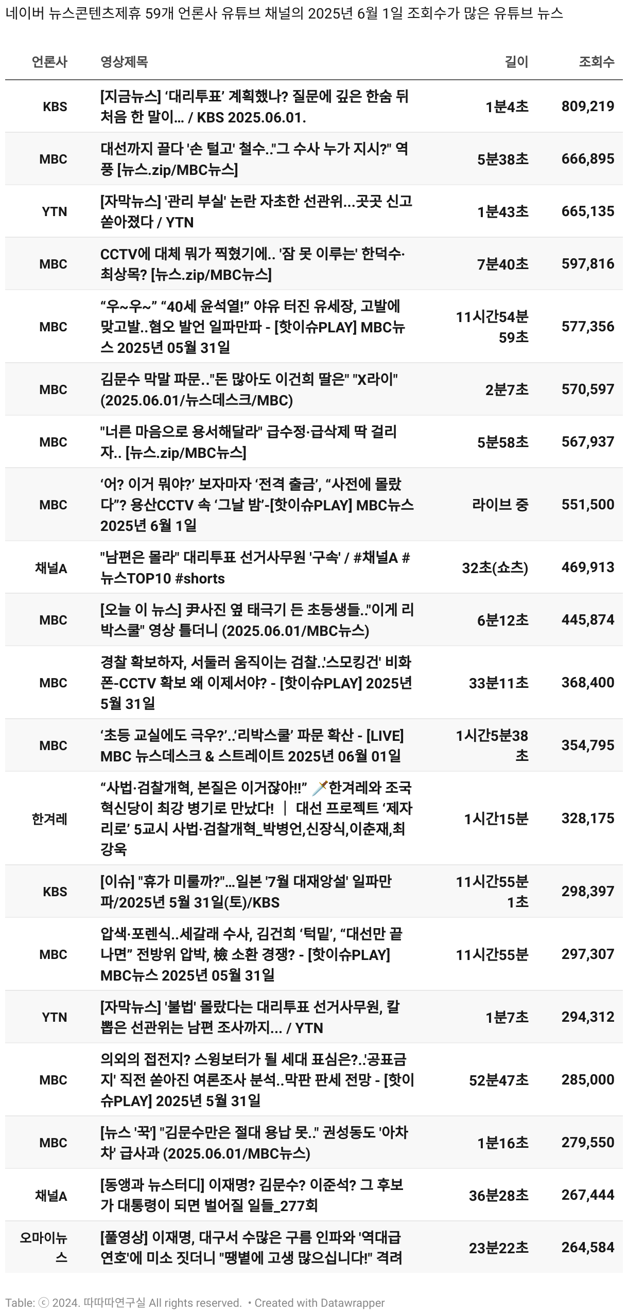 *데이터 수집 기간 : 2024년 6월 10일 *데이터 수집 대상 : 네이버 뉴스콘텐츠제휴 60개 언론사. 종합일간지 10개(경향신문, 국민일보, 동아일보, 문화일보, 서울신문, 세계일보, 조선일보, 중앙일보, 한겨레신문, 한국일보), 방송/통신사 14개(뉴스1, 뉴시스, 연합뉴스, 연합뉴스TV, 채널A, 한국경제TV, JTBC, KBS, MBC, MBN, SBS, SBS BIZ, TV조선, YTN), 경제지 11개(매일경제, 머니투데이, 비즈워치, 서울경제, 아시아경제, 이데일리, 조선비즈, 조세일보, 파이낸셜뉴스, 한국경제(유튜브제외), 헤럴드경제) 인터넷 8개(노컷뉴스, 더팩트, 데일리안, 머니S, 미디어오늘, 아이뉴스24, 오마이뉴스, 프레시안), IT 5개(디지털데일리,디지털타임스, 블로터, 전자신문, 지디넷코리아), 지역 12개(강원도민일보, 강원일보, 경기일보, 국제신문, 대구MBC, 대전일보, 매일신문, 부산일보, 전주MBC, CJB청주방송, JIBS, kbc광주방송)