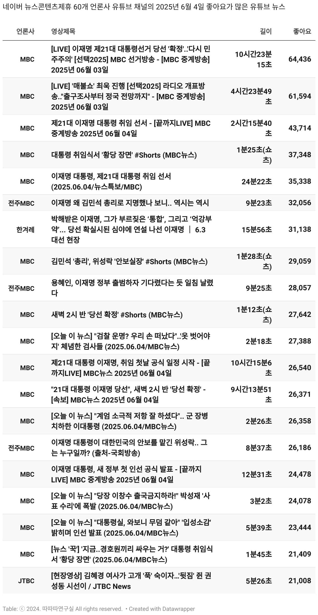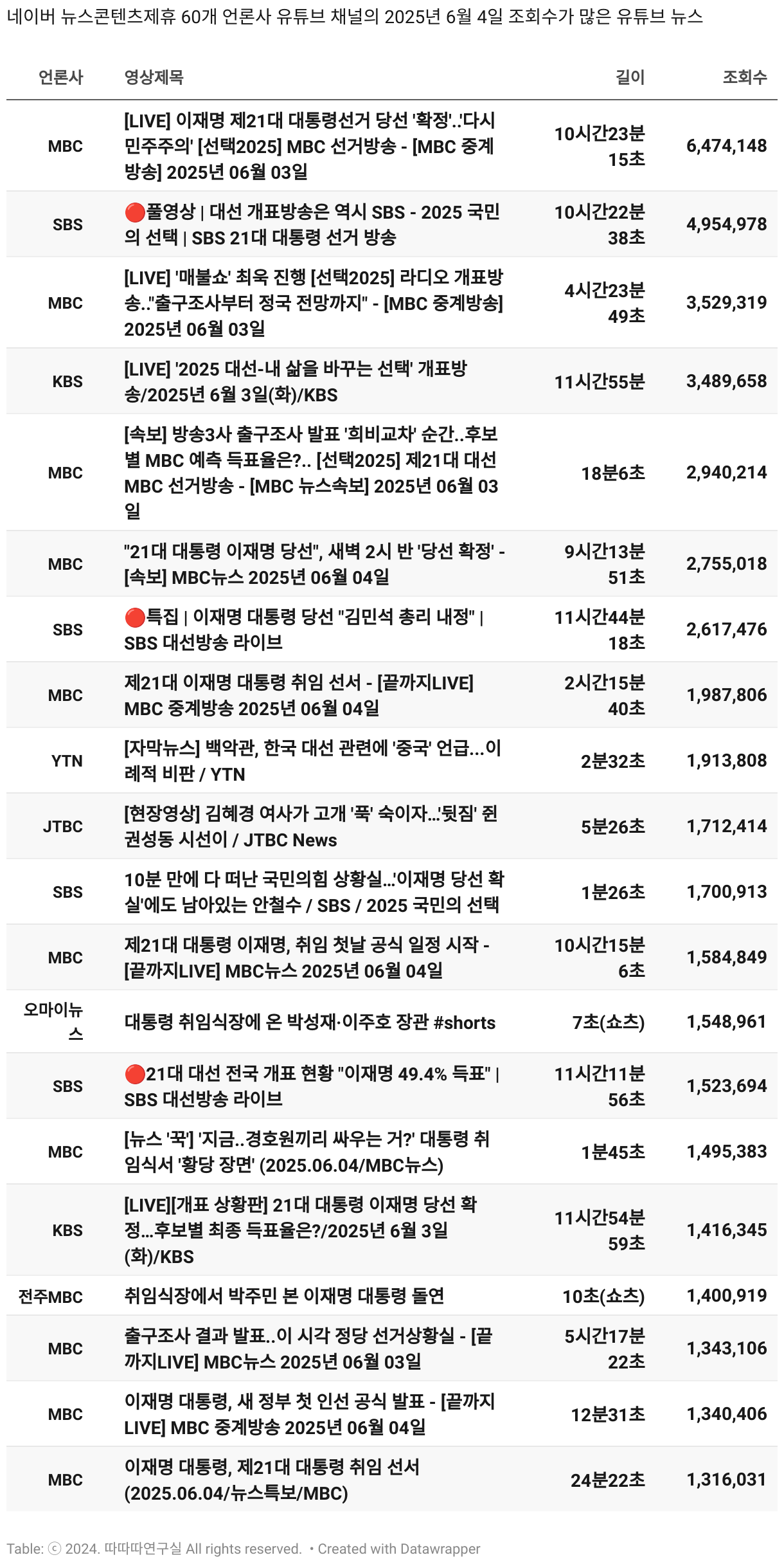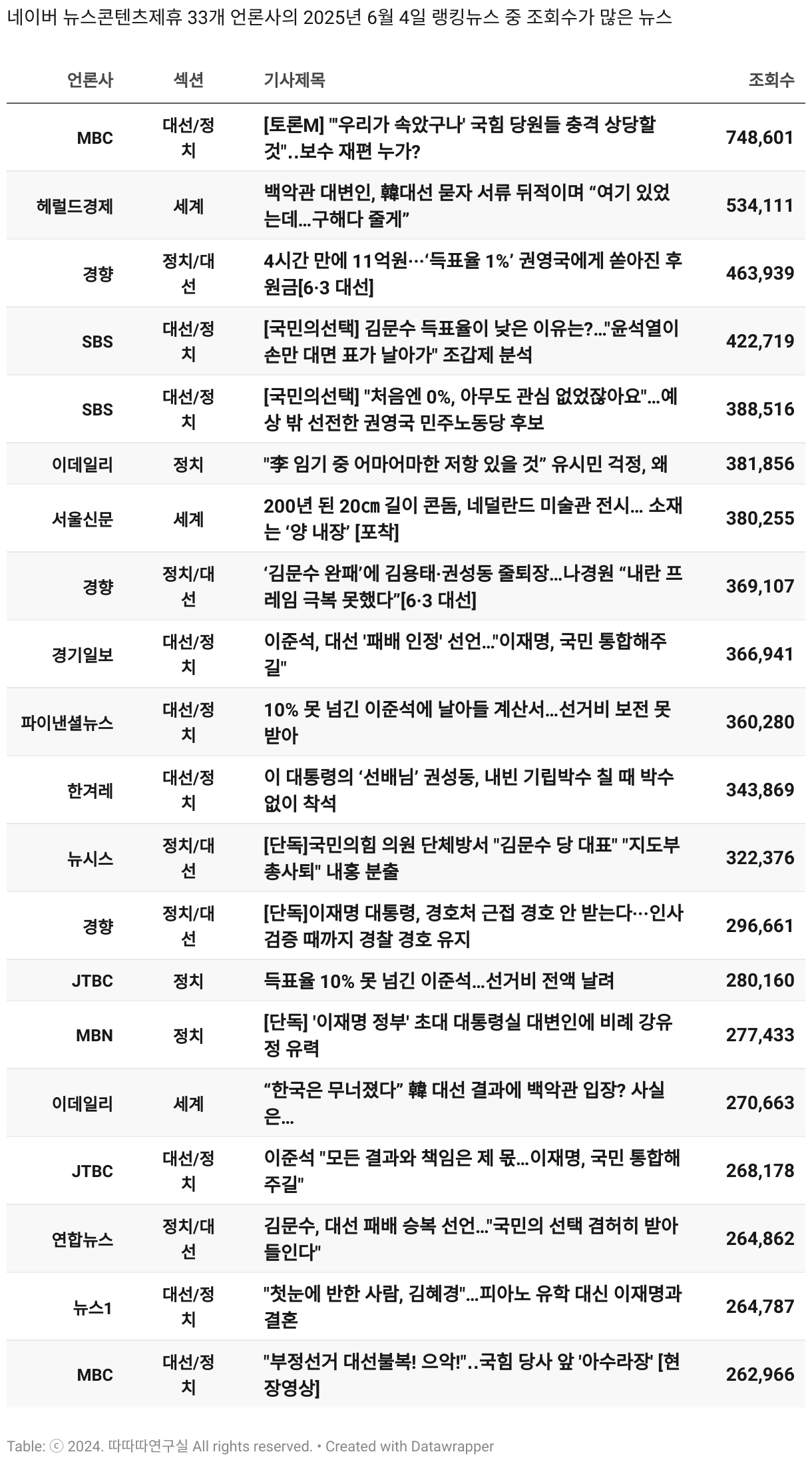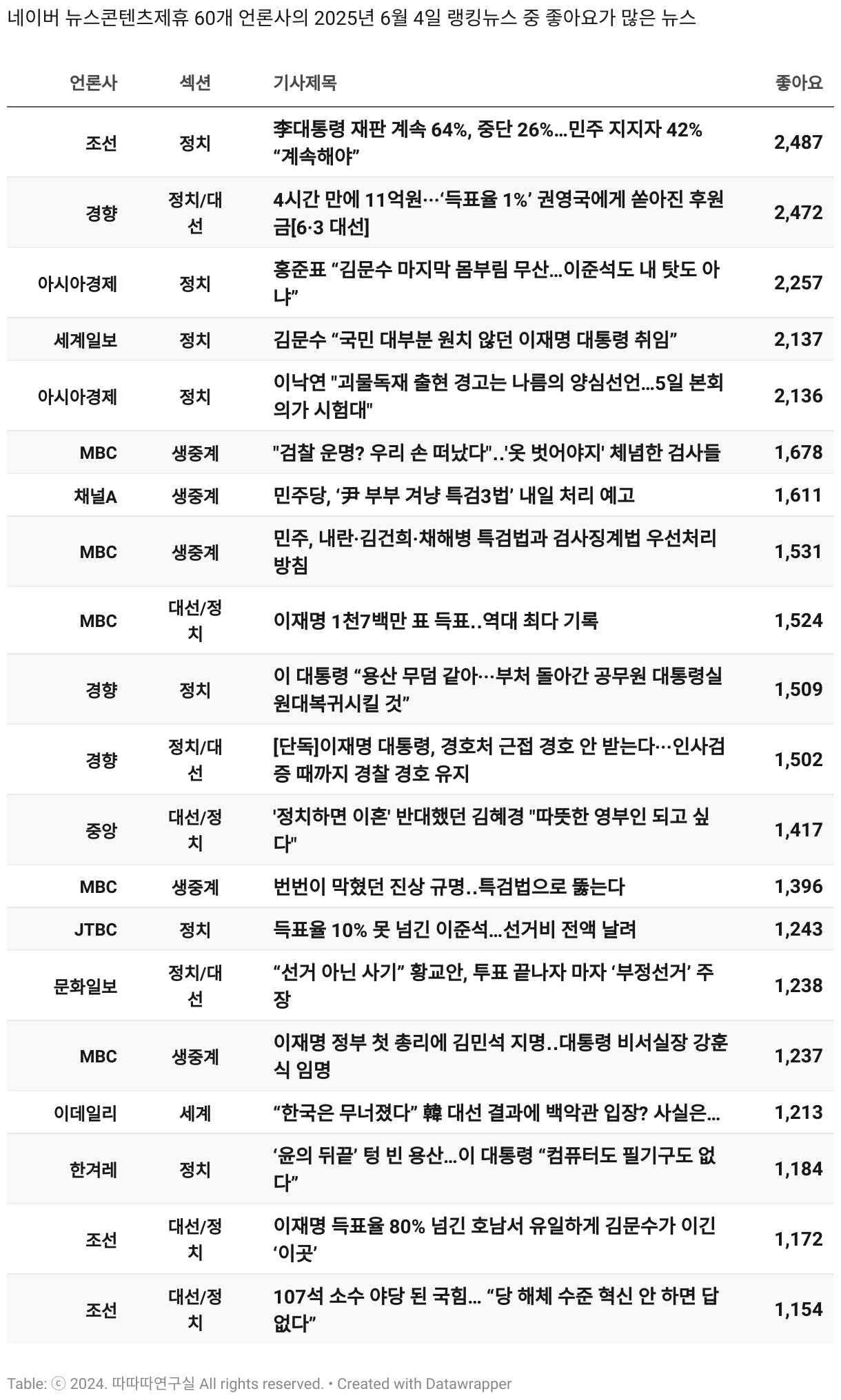 *데이터 수집 기간 : 2024년 6월 10일 *데이터 수집 대상 : 네이버 뉴스콘텐츠제휴 60개 언론사. 종합일간지 10개(경향신문, 국민일보, 동아일보, 문화일보, 서울신문, 세계일보, 조선일보, 중앙일보, 한겨레신문, 한국일보), 방송/통신사 14개(뉴스1, 뉴시스, 연합뉴스, 연합뉴스TV, 채널A, 한국경제TV, JTBC, KBS, MBC, MBN, SBS, SBS BIZ, TV조선, YTN), 경제지 11개(매일경제, 머니투데이, 비즈워치, 서울경제, 아시아경제, 이데일리, 조선비즈, 조세일보, 파이낸셜뉴스, 한국경제(유튜브제외), 헤럴드경제) 인터넷 8개(노컷뉴스, 더팩트, 데일리안, 머니S, 미디어오늘, 아이뉴스24, 오마이뉴스, 프레시안), IT 5개(디지털데일리,디지털타임스, 블로터, 전자신문, 지디넷코리아), 지역 12개(강원도민일보, 강원일보, 경기일보, 국제신문, 대구MBC, 대전일보, 매일신문, 부산일보, 전주MBC, CJB청주방송, JIBS, kbc광주방송)