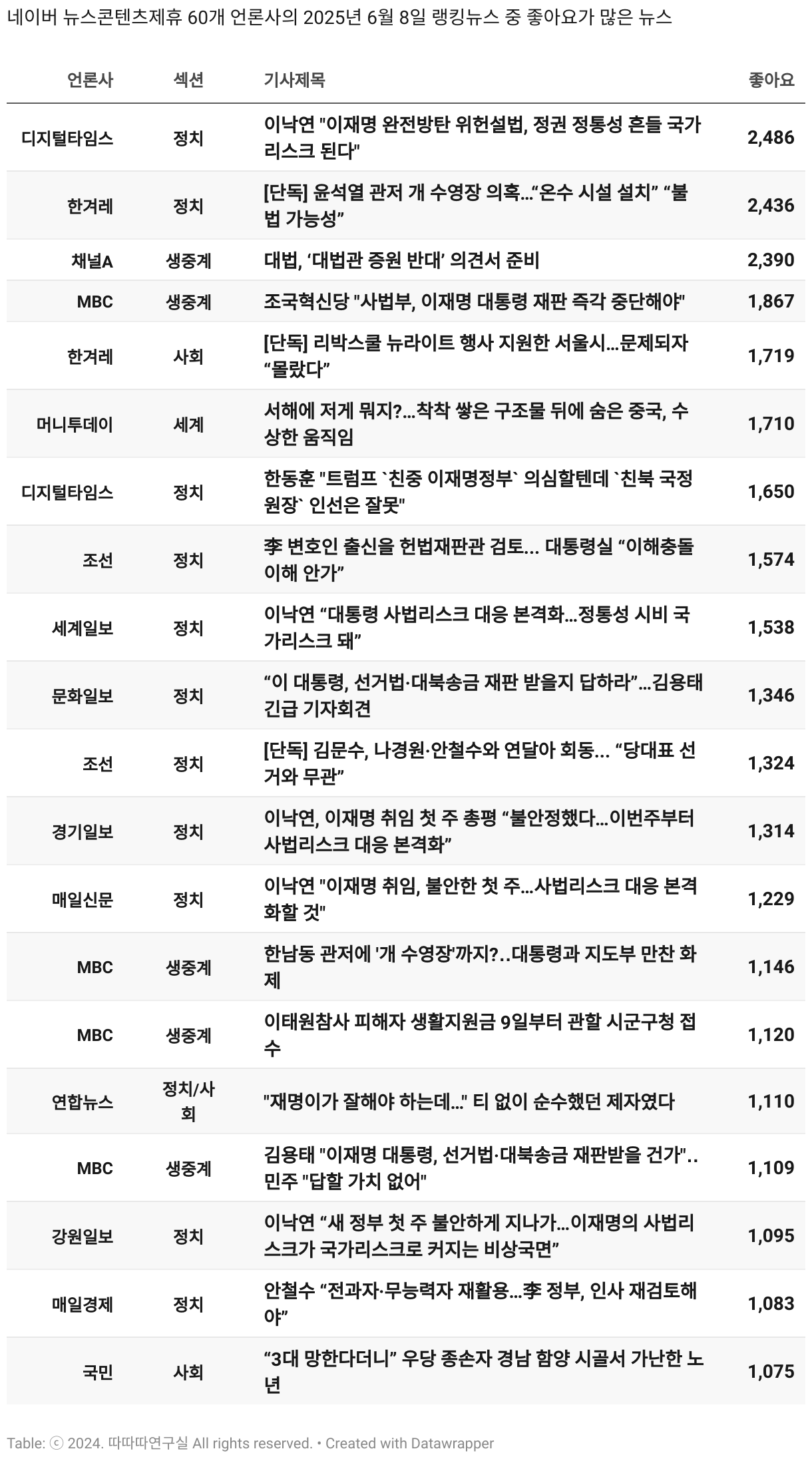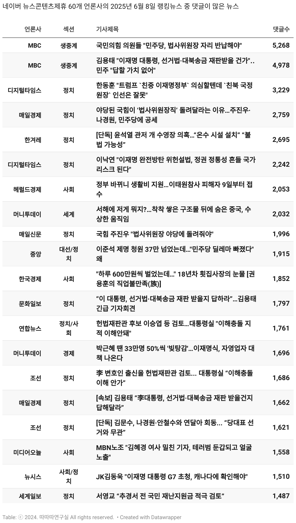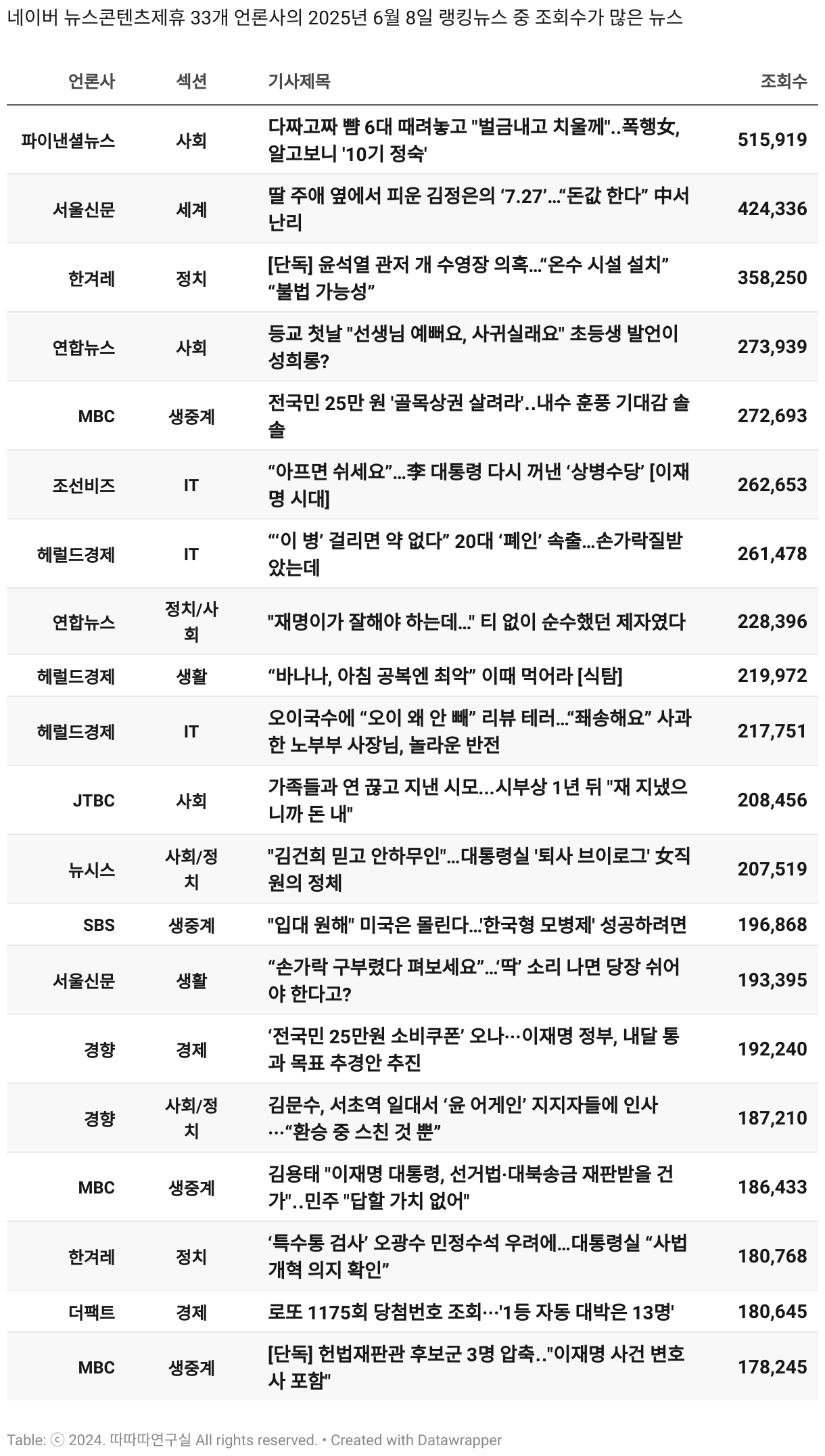 *데이터 수집 기간 : 2024년 6월 10일 *데이터 수집 대상 : 네이버 뉴스콘텐츠제휴 60개 언론사. 종합일간지 10개(경향신문, 국민일보, 동아일보, 문화일보, 서울신문, 세계일보, 조선일보, 중앙일보, 한겨레신문, 한국일보), 방송/통신사 14개(뉴스1, 뉴시스, 연합뉴스, 연합뉴스TV, 채널A, 한국경제TV, JTBC, KBS, MBC, MBN, SBS, SBS BIZ, TV조선, YTN), 경제지 11개(매일경제, 머니투데이, 비즈워치, 서울경제, 아시아경제, 이데일리, 조선비즈, 조세일보, 파이낸셜뉴스, 한국경제(유튜브제외), 헤럴드경제) 인터넷 8개(노컷뉴스, 더팩트, 데일리안, 머니S, 미디어오늘, 아이뉴스24, 오마이뉴스, 프레시안), IT 5개(디지털데일리,디지털타임스, 블로터, 전자신문, 지디넷코리아), 지역 12개(강원도민일보, 강원일보, 경기일보, 국제신문, 대구MBC, 대전일보, 매일신문, 부산일보, 전주MBC, CJB청주방송, JIBS, kbc광주방송)
