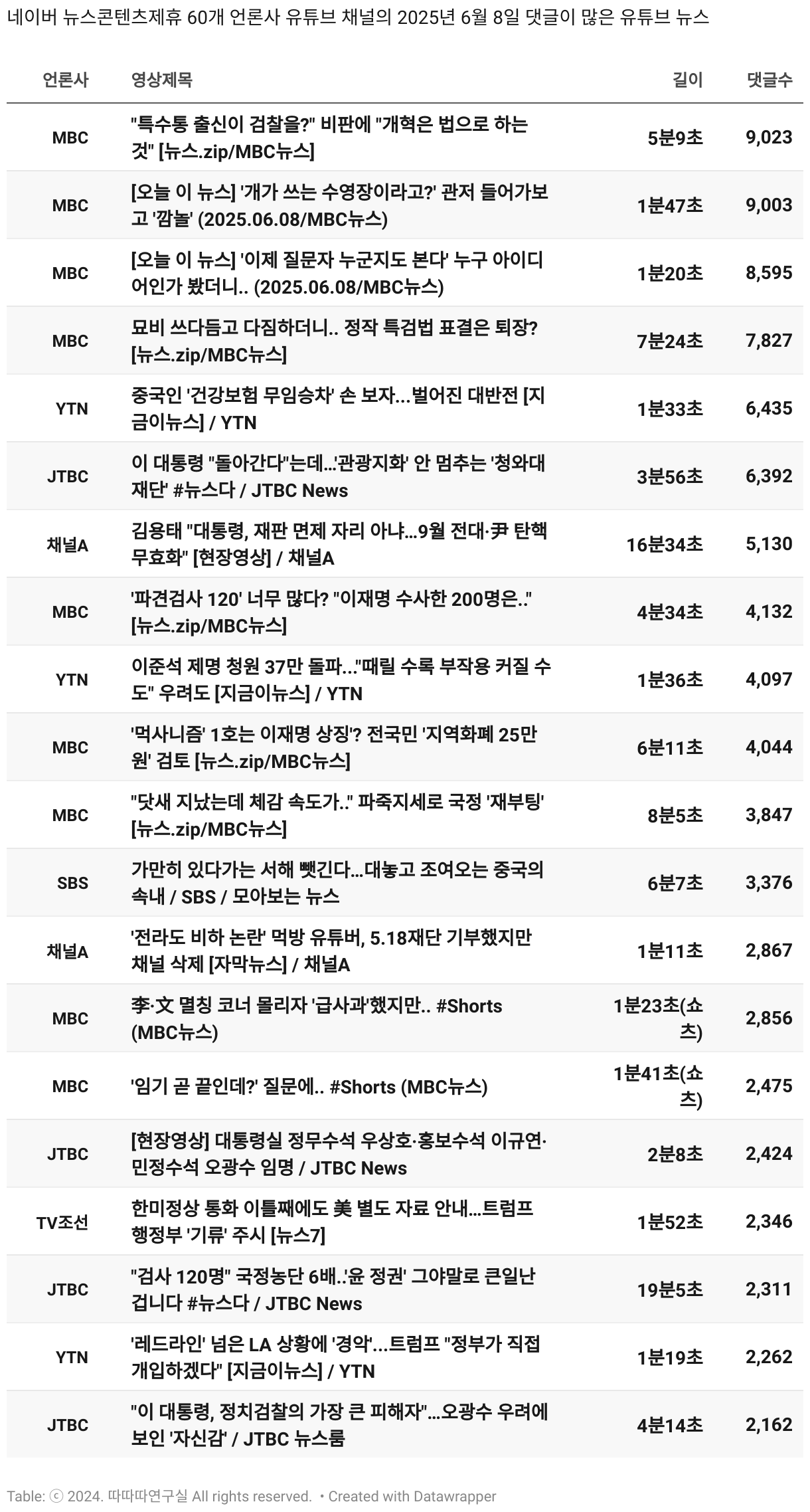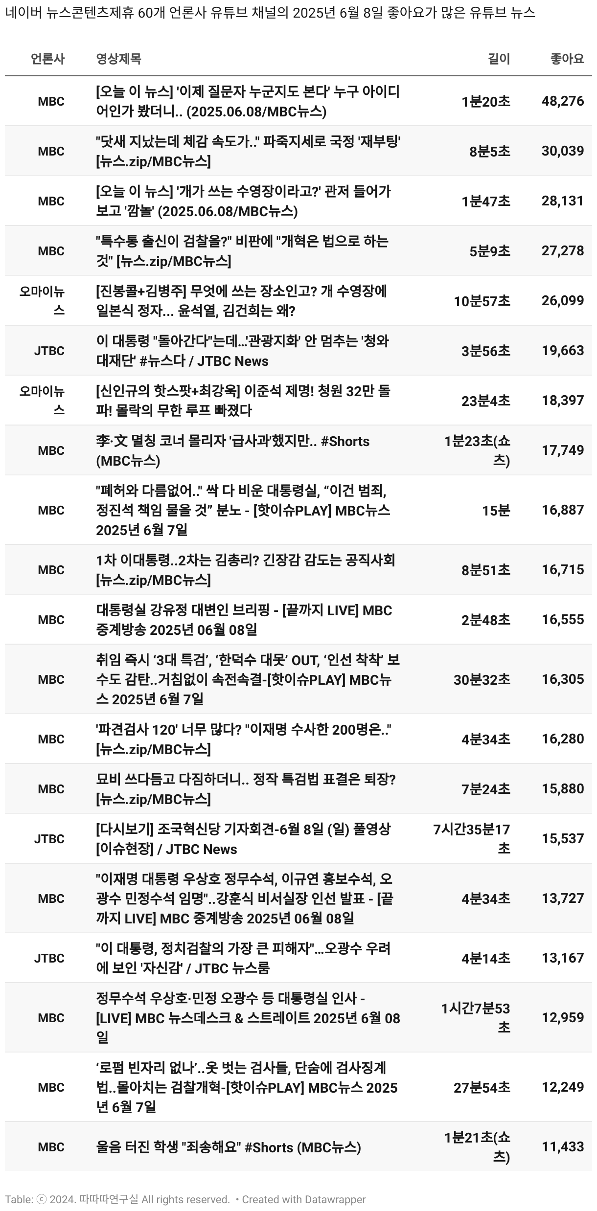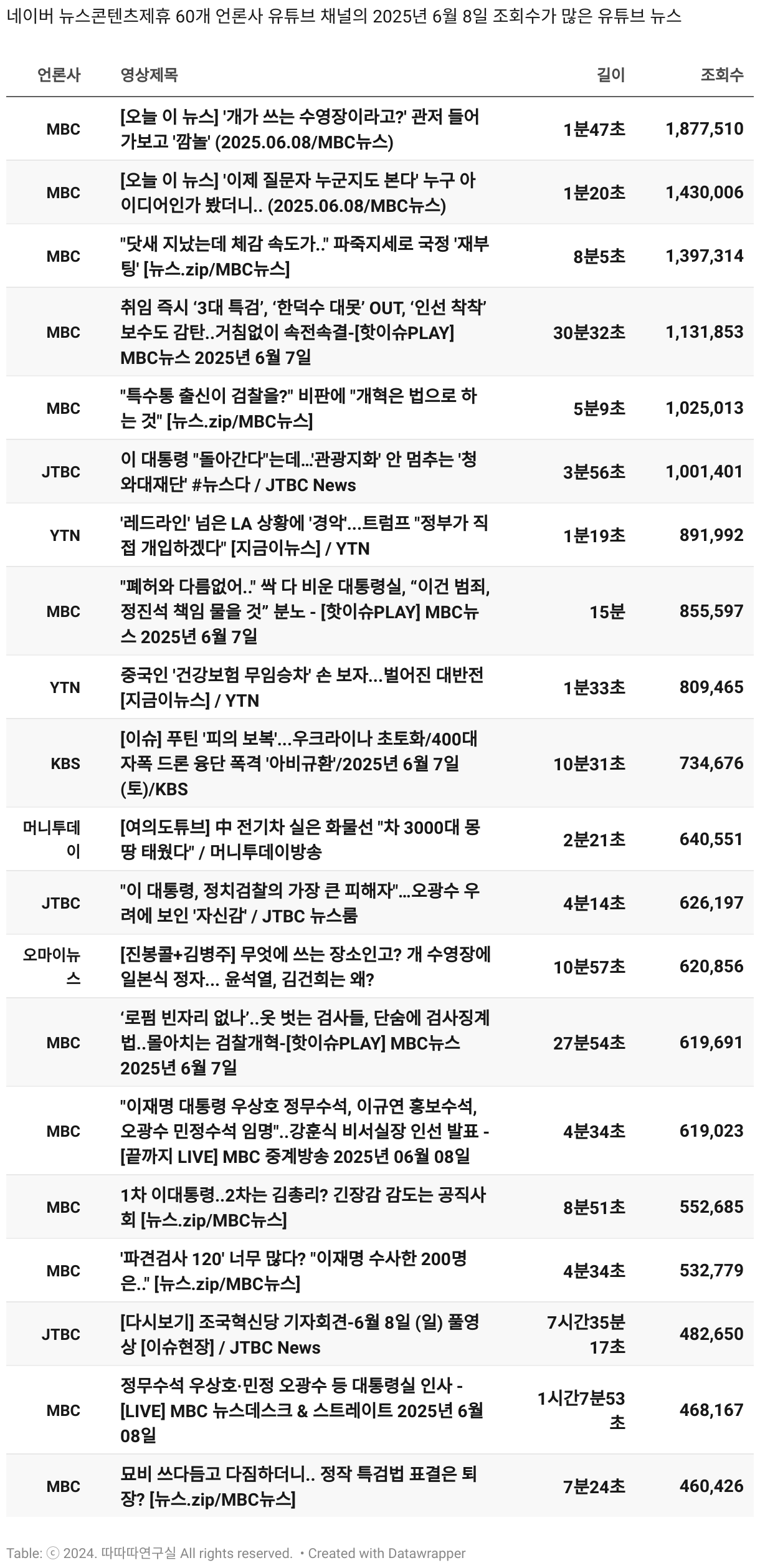 *데이터 수집 기간 : 2024년 6월 10일 *데이터 수집 대상 : 네이버 뉴스콘텐츠제휴 60개 언론사. 종합일간지 10개(경향신문, 국민일보, 동아일보, 문화일보, 서울신문, 세계일보, 조선일보, 중앙일보, 한겨레신문, 한국일보), 방송/통신사 14개(뉴스1, 뉴시스, 연합뉴스, 연합뉴스TV, 채널A, 한국경제TV, JTBC, KBS, MBC, MBN, SBS, SBS BIZ, TV조선, YTN), 경제지 11개(매일경제, 머니투데이, 비즈워치, 서울경제, 아시아경제, 이데일리, 조선비즈, 조세일보, 파이낸셜뉴스, 한국경제(유튜브제외), 헤럴드경제) 인터넷 8개(노컷뉴스, 더팩트, 데일리안, 머니S, 미디어오늘, 아이뉴스24, 오마이뉴스, 프레시안), IT 5개(디지털데일리,디지털타임스, 블로터, 전자신문, 지디넷코리아), 지역 12개(강원도민일보, 강원일보, 경기일보, 국제신문, 대구MBC, 대전일보, 매일신문, 부산일보, 전주MBC, CJB청주방송, JIBS, kbc광주방송)