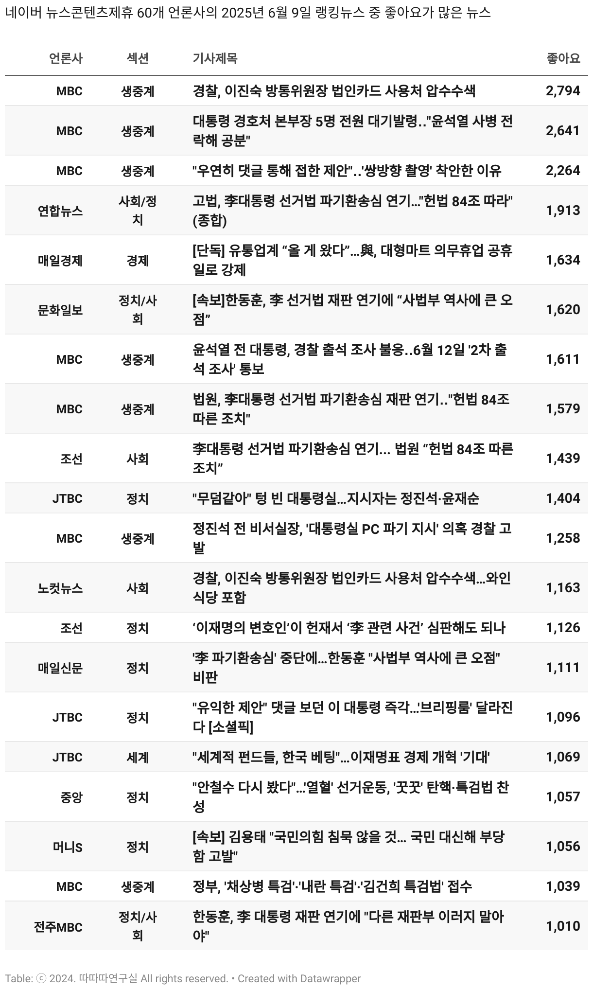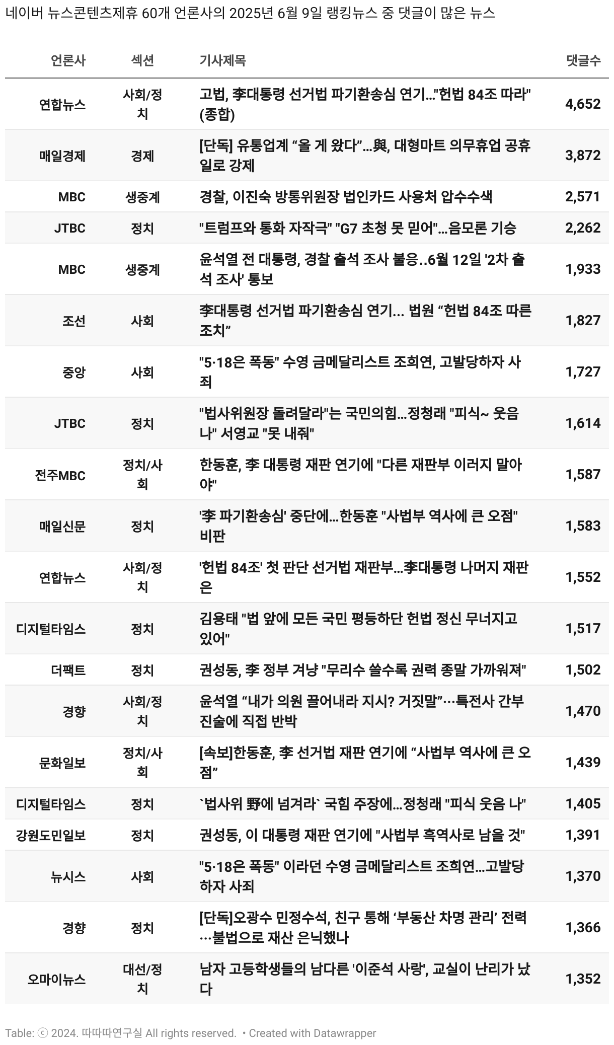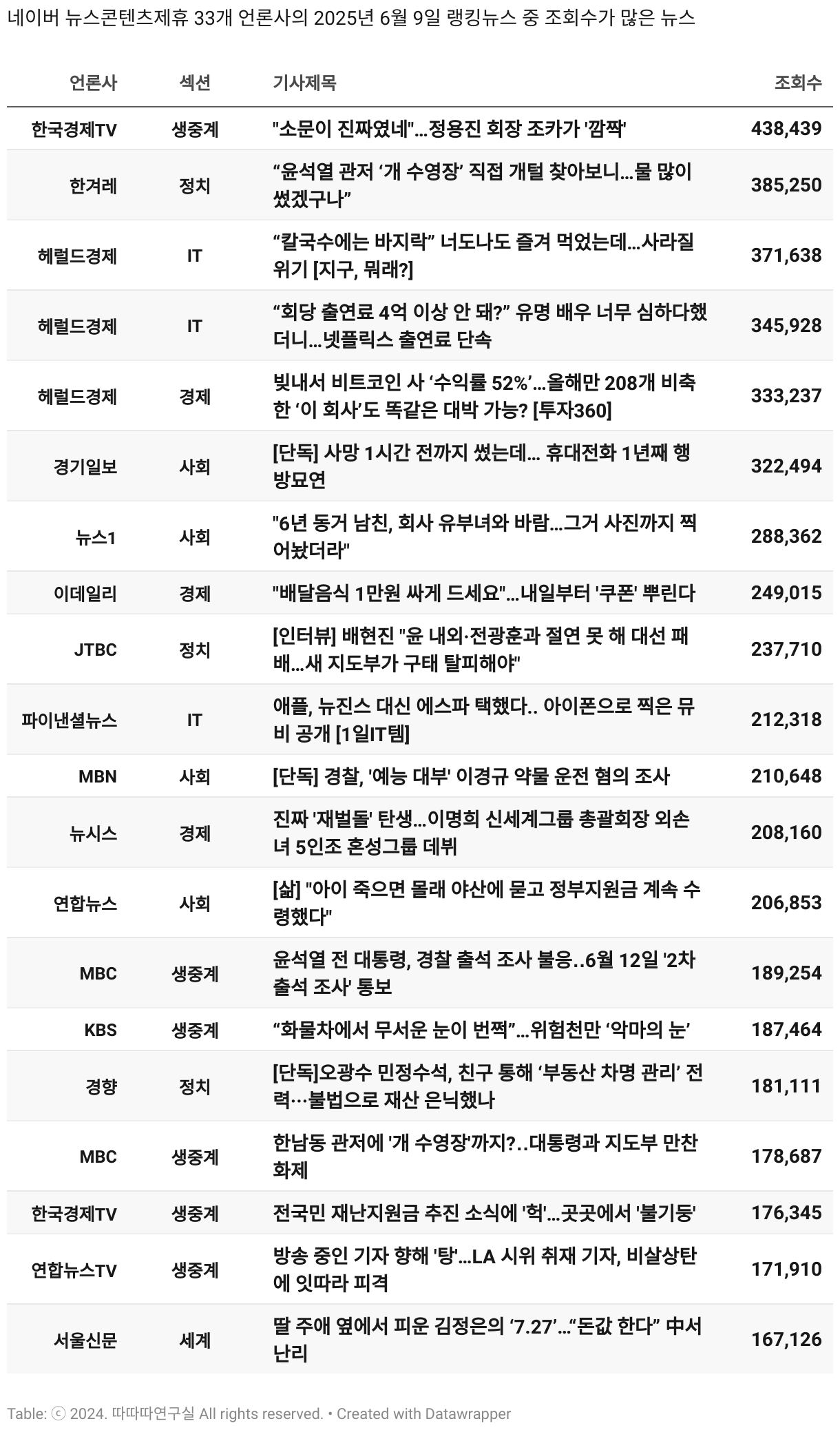 *데이터 수집 기간 : 2024년 6월 10일 *데이터 수집 대상 : 네이버 뉴스콘텐츠제휴 60개 언론사. 종합일간지 10개(경향신문, 국민일보, 동아일보, 문화일보, 서울신문, 세계일보, 조선일보, 중앙일보, 한겨레신문, 한국일보), 방송/통신사 14개(뉴스1, 뉴시스, 연합뉴스, 연합뉴스TV, 채널A, 한국경제TV, JTBC, KBS, MBC, MBN, SBS, SBS BIZ, TV조선, YTN), 경제지 11개(매일경제, 머니투데이, 비즈워치, 서울경제, 아시아경제, 이데일리, 조선비즈, 조세일보, 파이낸셜뉴스, 한국경제(유튜브제외), 헤럴드경제) 인터넷 8개(노컷뉴스, 더팩트, 데일리안, 머니S, 미디어오늘, 아이뉴스24, 오마이뉴스, 프레시안), IT 5개(디지털데일리,디지털타임스, 블로터, 전자신문, 지디넷코리아), 지역 12개(강원도민일보, 강원일보, 경기일보, 국제신문, 대구MBC, 대전일보, 매일신문, 부산일보, 전주MBC, CJB청주방송, JIBS, kbc광주방송)