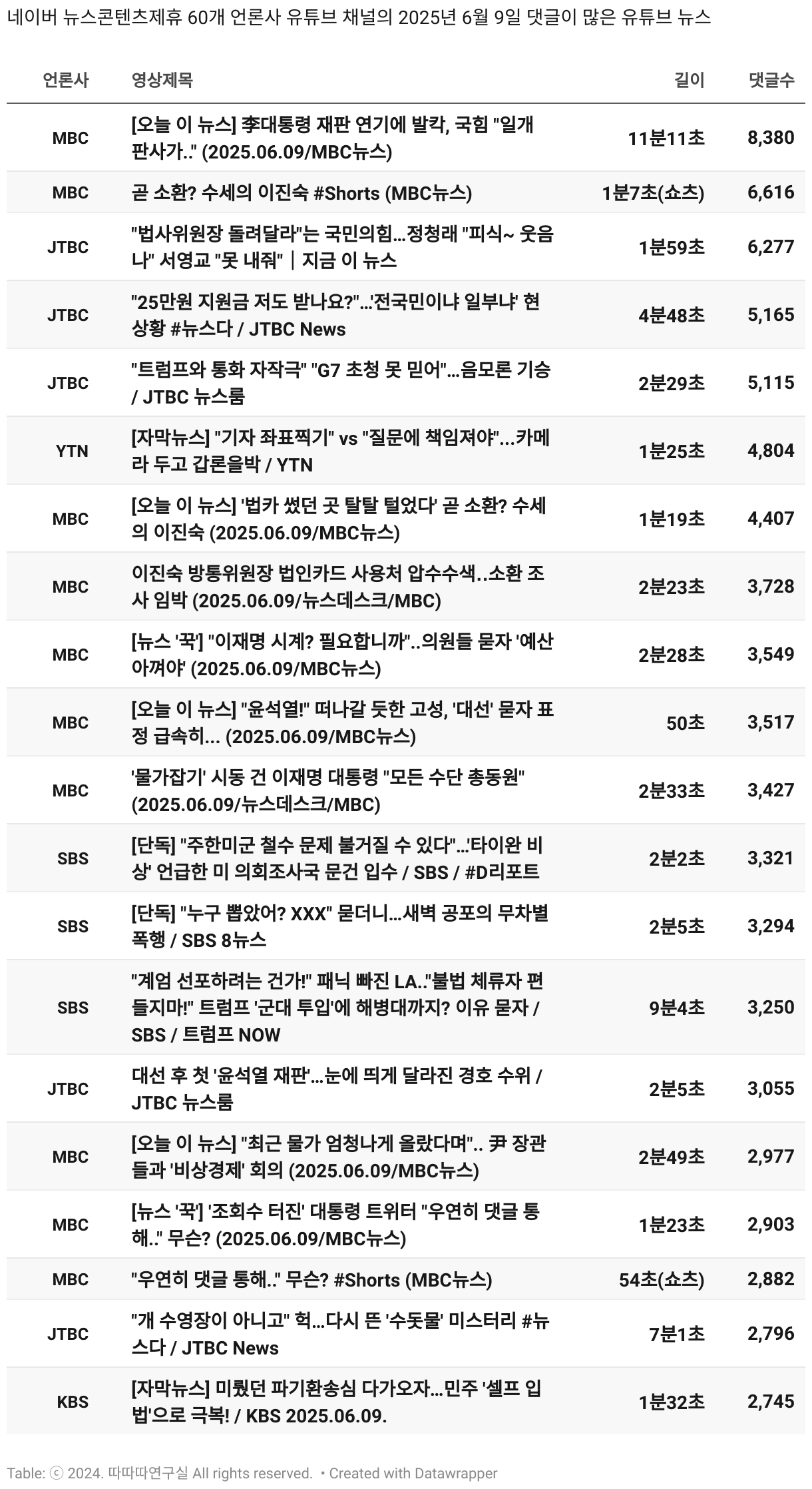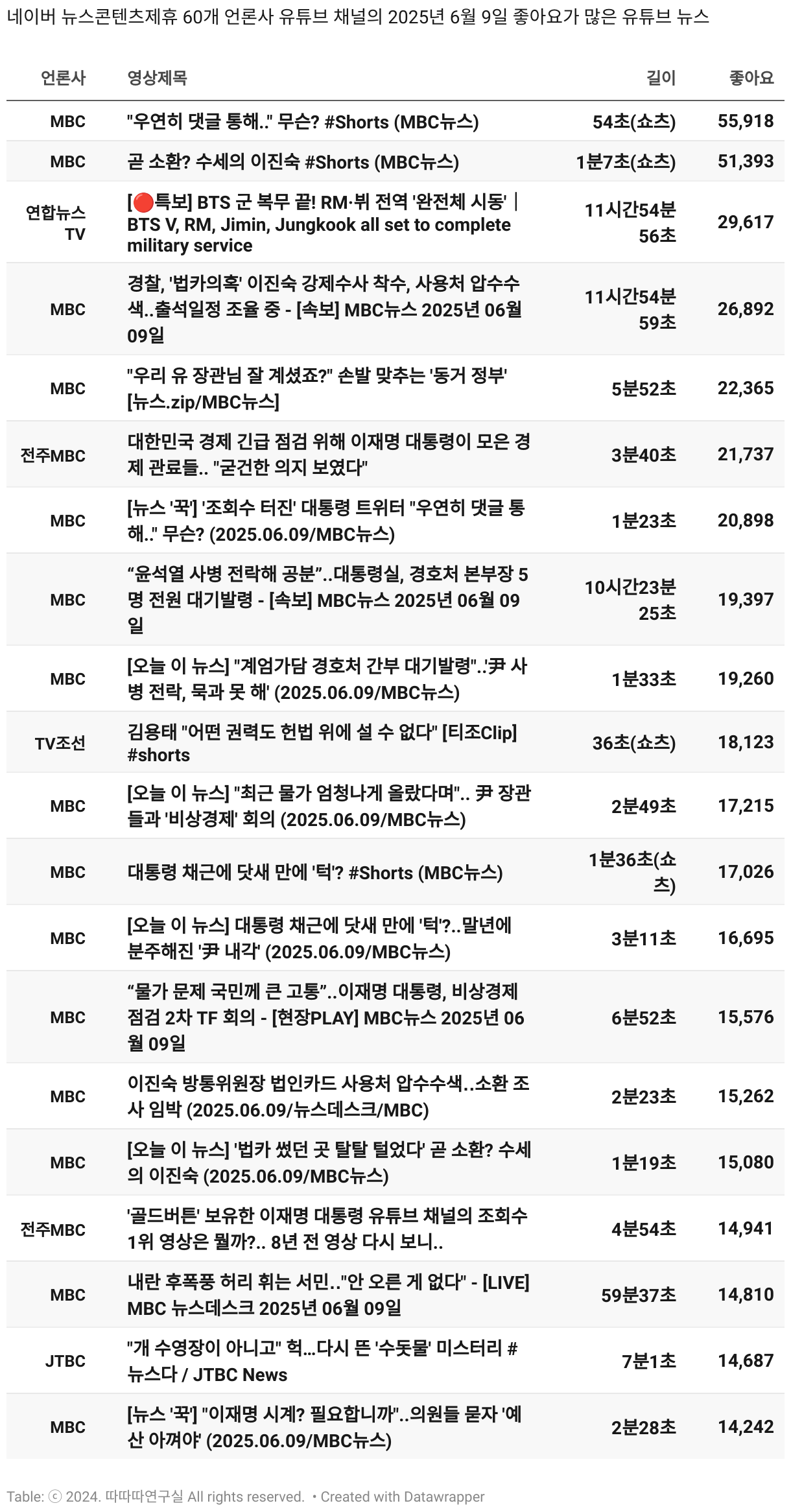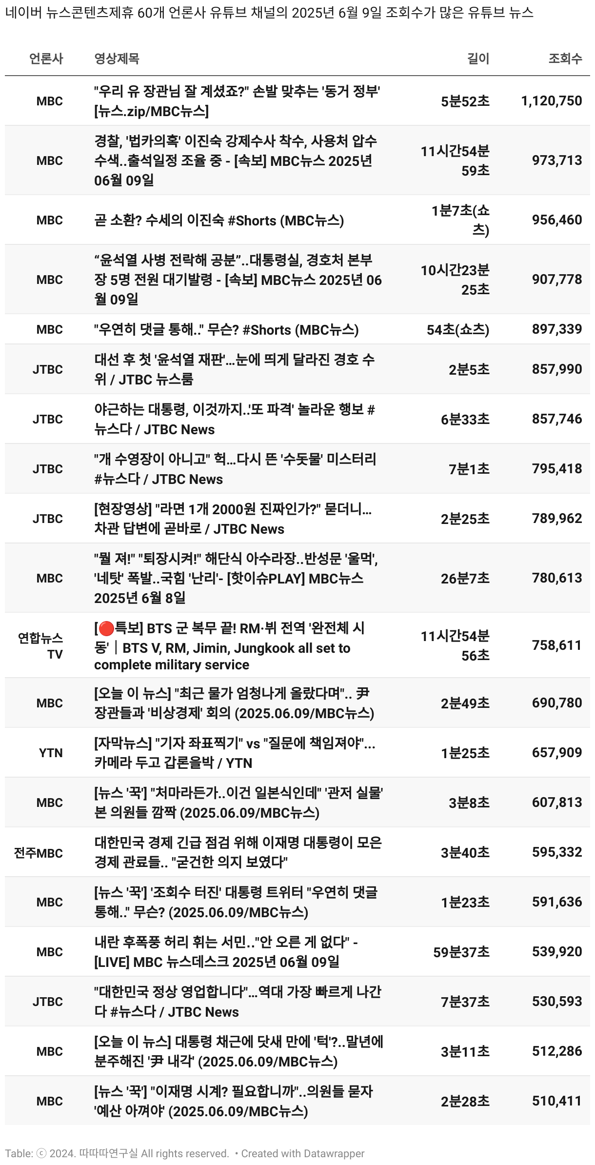 *데이터 수집 기간 : 2024년 6월 10일 *데이터 수집 대상 : 네이버 뉴스콘텐츠제휴 60개 언론사. 종합일간지 10개(경향신문, 국민일보, 동아일보, 문화일보, 서울신문, 세계일보, 조선일보, 중앙일보, 한겨레신문, 한국일보), 방송/통신사 14개(뉴스1, 뉴시스, 연합뉴스, 연합뉴스TV, 채널A, 한국경제TV, JTBC, KBS, MBC, MBN, SBS, SBS BIZ, TV조선, YTN), 경제지 11개(매일경제, 머니투데이, 비즈워치, 서울경제, 아시아경제, 이데일리, 조선비즈, 조세일보, 파이낸셜뉴스, 한국경제(유튜브제외), 헤럴드경제) 인터넷 8개(노컷뉴스, 더팩트, 데일리안, 머니S, 미디어오늘, 아이뉴스24, 오마이뉴스, 프레시안), IT 5개(디지털데일리,디지털타임스, 블로터, 전자신문, 지디넷코리아), 지역 12개(강원도민일보, 강원일보, 경기일보, 국제신문, 대구MBC, 대전일보, 매일신문, 부산일보, 전주MBC, CJB청주방송, JIBS, kbc광주방송)