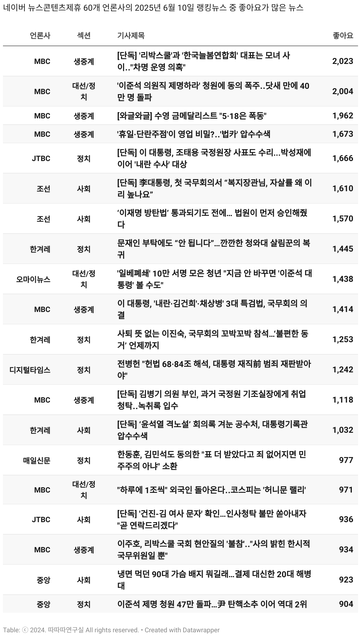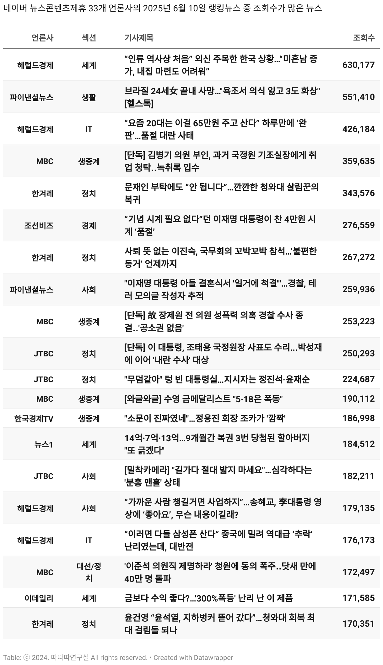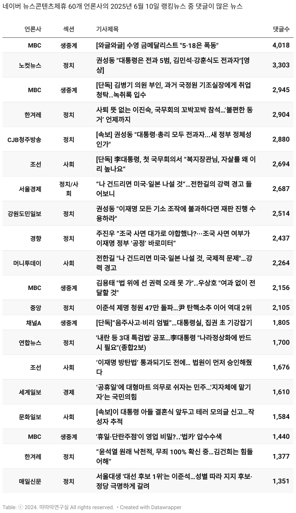 *데이터 수집 기간 : 2024년 6월 10일 *데이터 수집 대상 : 네이버 뉴스콘텐츠제휴 60개 언론사. 종합일간지 10개(경향신문, 국민일보, 동아일보, 문화일보, 서울신문, 세계일보, 조선일보, 중앙일보, 한겨레신문, 한국일보), 방송/통신사 14개(뉴스1, 뉴시스, 연합뉴스, 연합뉴스TV, 채널A, 한국경제TV, JTBC, KBS, MBC, MBN, SBS, SBS BIZ, TV조선, YTN), 경제지 11개(매일경제, 머니투데이, 비즈워치, 서울경제, 아시아경제, 이데일리, 조선비즈, 조세일보, 파이낸셜뉴스, 한국경제(유튜브제외), 헤럴드경제) 인터넷 8개(노컷뉴스, 더팩트, 데일리안, 머니S, 미디어오늘, 아이뉴스24, 오마이뉴스, 프레시안), IT 5개(디지털데일리,디지털타임스, 블로터, 전자신문, 지디넷코리아), 지역 12개(강원도민일보, 강원일보, 경기일보, 국제신문, 대구MBC, 대전일보, 매일신문, 부산일보, 전주MBC, CJB청주방송, JIBS, kbc광주방송)