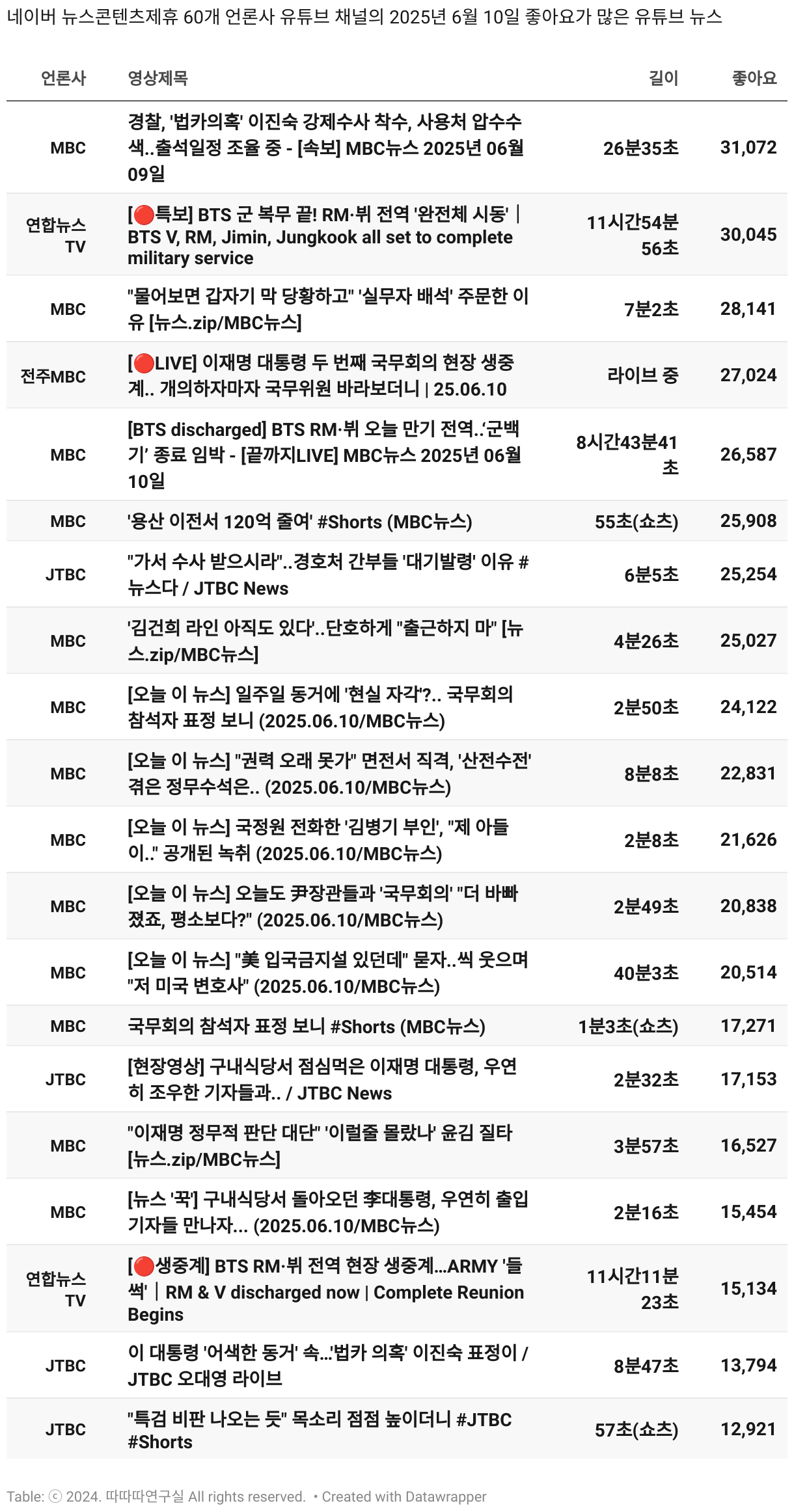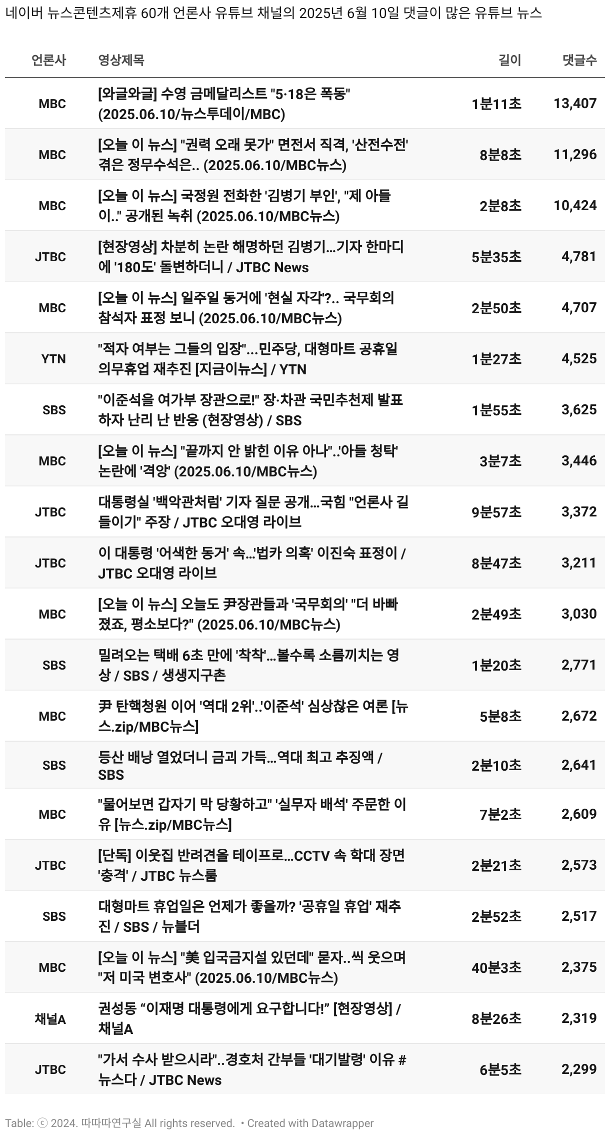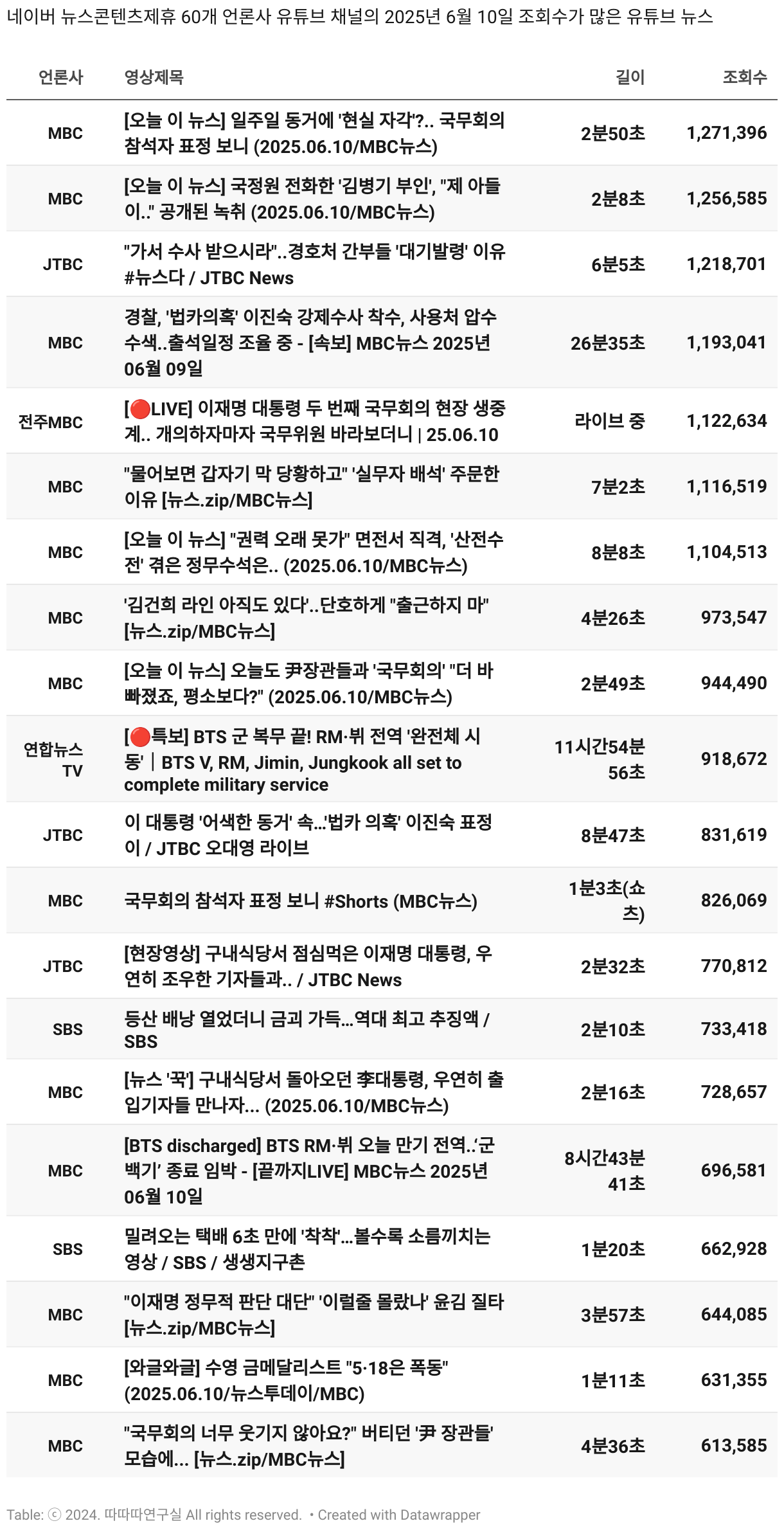 *데이터 수집 기간 : 2024년 6월 10일 *데이터 수집 대상 : 네이버 뉴스콘텐츠제휴 60개 언론사. 종합일간지 10개(경향신문, 국민일보, 동아일보, 문화일보, 서울신문, 세계일보, 조선일보, 중앙일보, 한겨레신문, 한국일보), 방송/통신사 14개(뉴스1, 뉴시스, 연합뉴스, 연합뉴스TV, 채널A, 한국경제TV, JTBC, KBS, MBC, MBN, SBS, SBS BIZ, TV조선, YTN), 경제지 11개(매일경제, 머니투데이, 비즈워치, 서울경제, 아시아경제, 이데일리, 조선비즈, 조세일보, 파이낸셜뉴스, 한국경제(유튜브제외), 헤럴드경제) 인터넷 8개(노컷뉴스, 더팩트, 데일리안, 머니S, 미디어오늘, 아이뉴스24, 오마이뉴스, 프레시안), IT 5개(디지털데일리,디지털타임스, 블로터, 전자신문, 지디넷코리아), 지역 12개(강원도민일보, 강원일보, 경기일보, 국제신문, 대구MBC, 대전일보, 매일신문, 부산일보, 전주MBC, CJB청주방송, JIBS, kbc광주방송)
