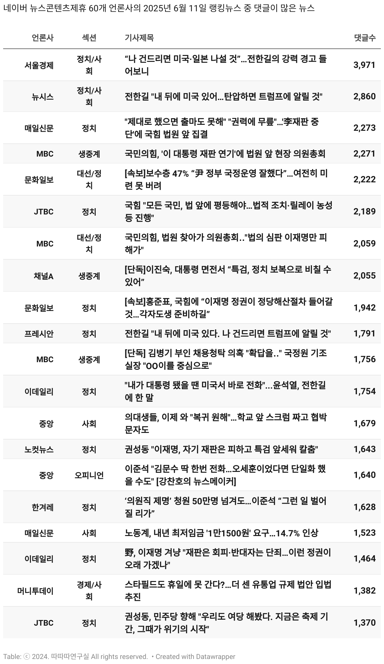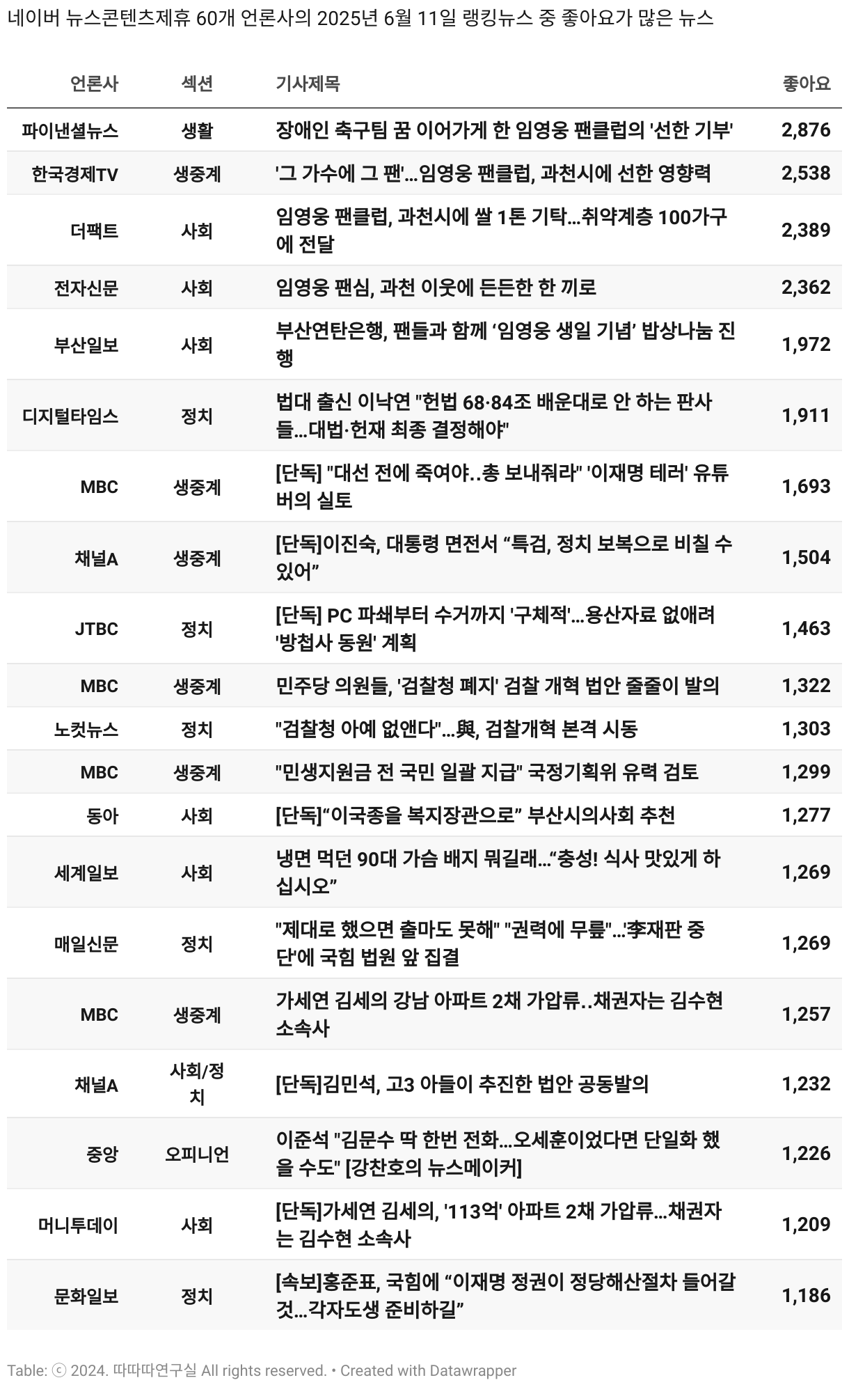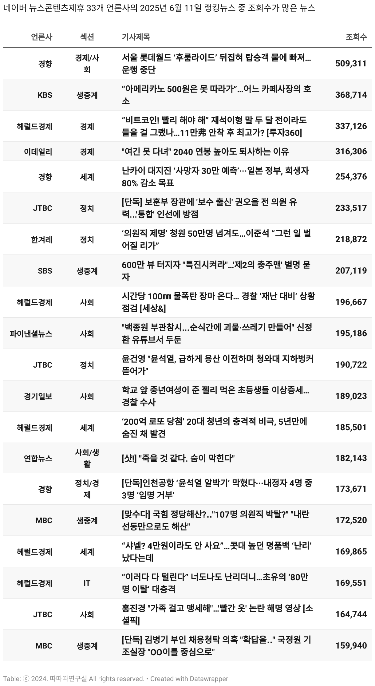 *데이터 수집 기간 : 2024년 6월 10일 *데이터 수집 대상 : 네이버 뉴스콘텐츠제휴 60개 언론사. 종합일간지 10개(경향신문, 국민일보, 동아일보, 문화일보, 서울신문, 세계일보, 조선일보, 중앙일보, 한겨레신문, 한국일보), 방송/통신사 14개(뉴스1, 뉴시스, 연합뉴스, 연합뉴스TV, 채널A, 한국경제TV, JTBC, KBS, MBC, MBN, SBS, SBS BIZ, TV조선, YTN), 경제지 11개(매일경제, 머니투데이, 비즈워치, 서울경제, 아시아경제, 이데일리, 조선비즈, 조세일보, 파이낸셜뉴스, 한국경제(유튜브제외), 헤럴드경제) 인터넷 8개(노컷뉴스, 더팩트, 데일리안, 머니S, 미디어오늘, 아이뉴스24, 오마이뉴스, 프레시안), IT 5개(디지털데일리,디지털타임스, 블로터, 전자신문, 지디넷코리아), 지역 12개(강원도민일보, 강원일보, 경기일보, 국제신문, 대구MBC, 대전일보, 매일신문, 부산일보, 전주MBC, CJB청주방송, JIBS, kbc광주방송)