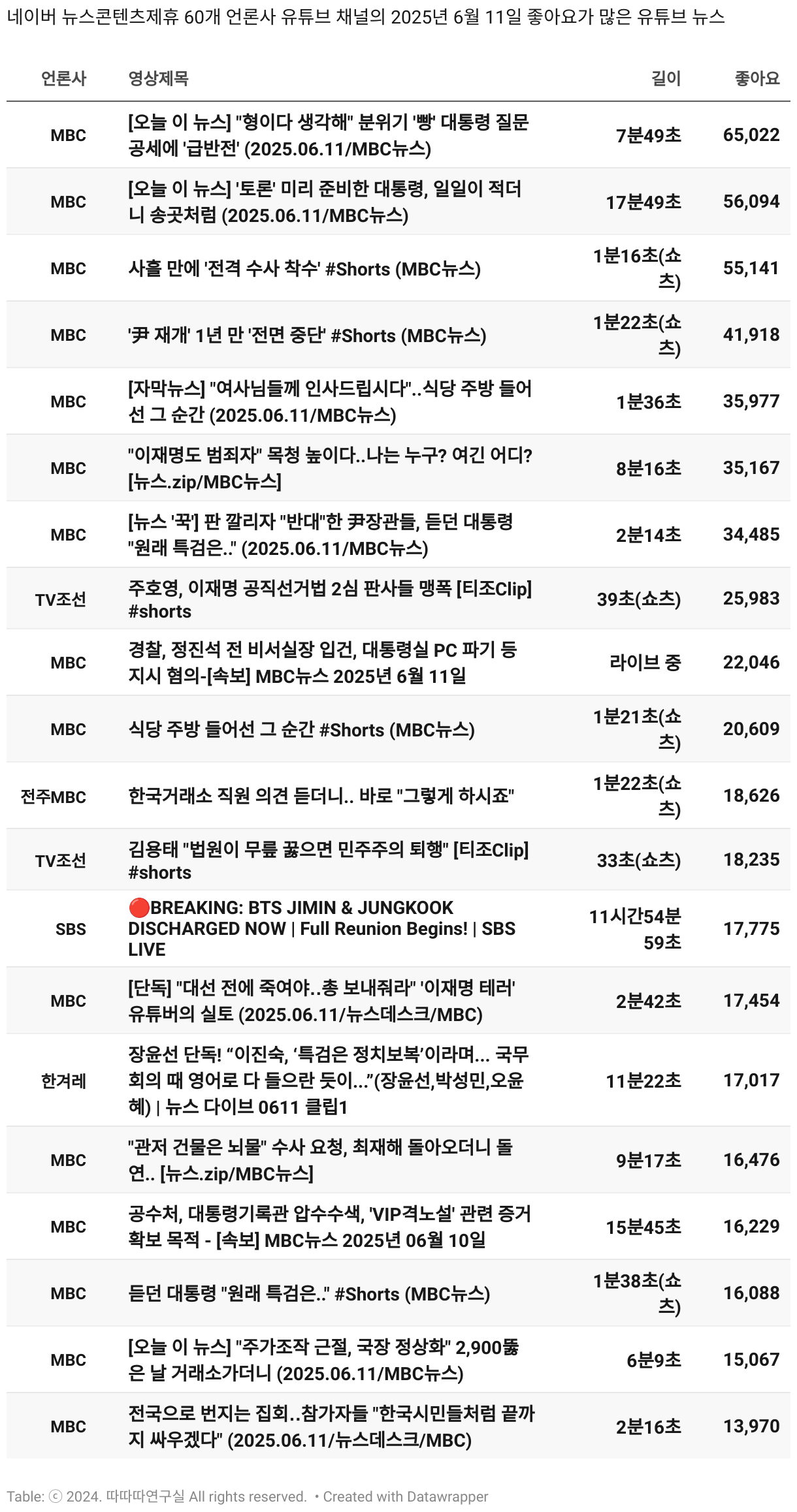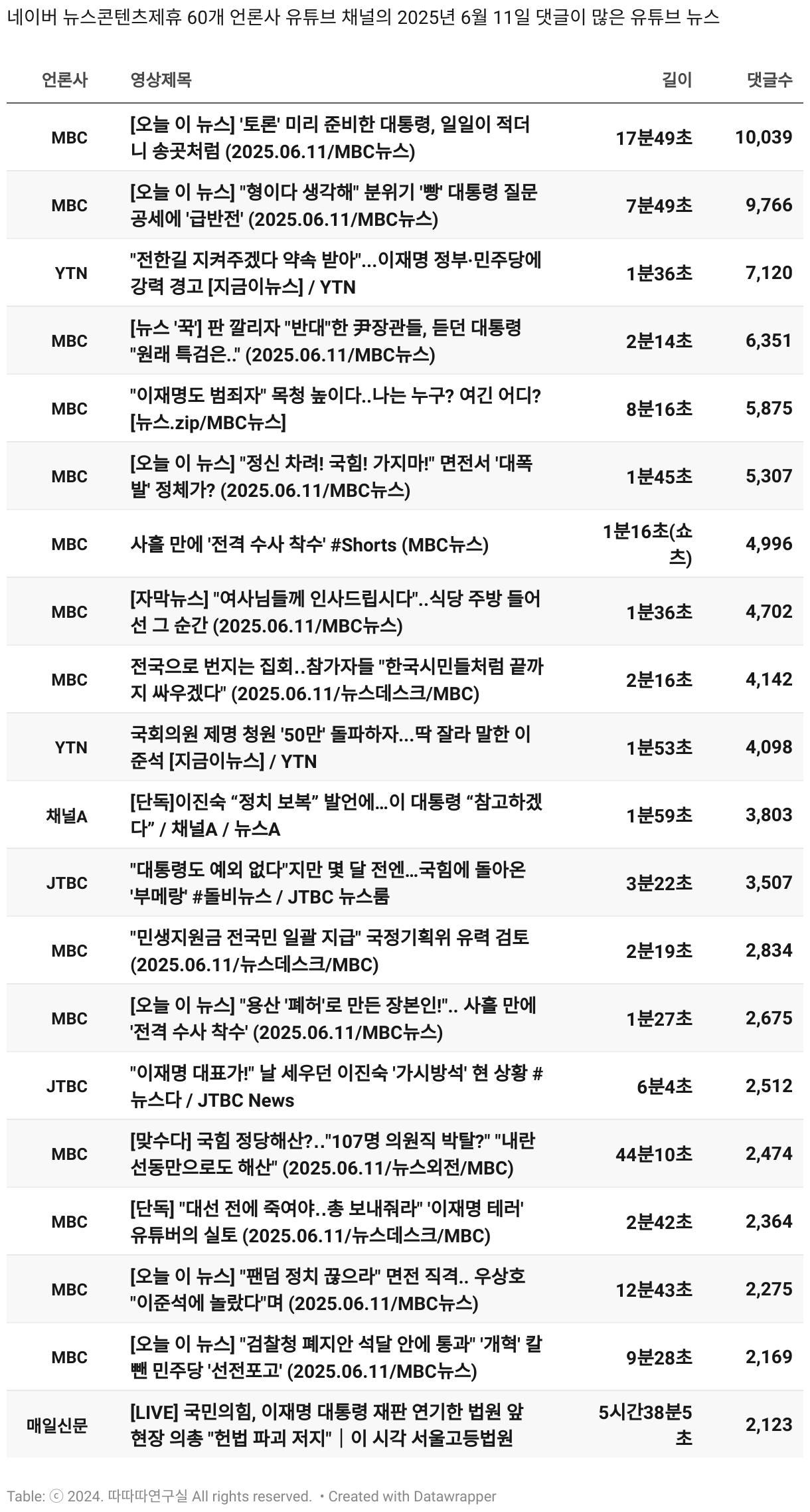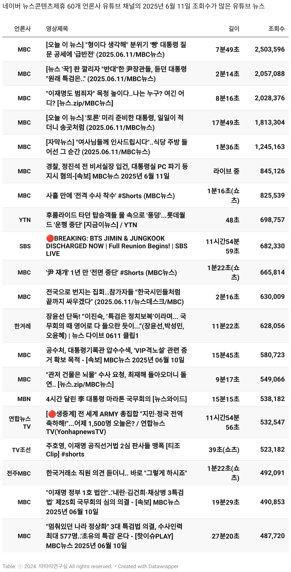 *데이터 수집 기간 : 2024년 6월 10일 *데이터 수집 대상 : 네이버 뉴스콘텐츠제휴 60개 언론사. 종합일간지 10개(경향신문, 국민일보, 동아일보, 문화일보, 서울신문, 세계일보, 조선일보, 중앙일보, 한겨레신문, 한국일보), 방송/통신사 14개(뉴스1, 뉴시스, 연합뉴스, 연합뉴스TV, 채널A, 한국경제TV, JTBC, KBS, MBC, MBN, SBS, SBS BIZ, TV조선, YTN), 경제지 11개(매일경제, 머니투데이, 비즈워치, 서울경제, 아시아경제, 이데일리, 조선비즈, 조세일보, 파이낸셜뉴스, 한국경제(유튜브제외), 헤럴드경제) 인터넷 8개(노컷뉴스, 더팩트, 데일리안, 머니S, 미디어오늘, 아이뉴스24, 오마이뉴스, 프레시안), IT 5개(디지털데일리,디지털타임스, 블로터, 전자신문, 지디넷코리아), 지역 12개(강원도민일보, 강원일보, 경기일보, 국제신문, 대구MBC, 대전일보, 매일신문, 부산일보, 전주MBC, CJB청주방송, JIBS, kbc광주방송)