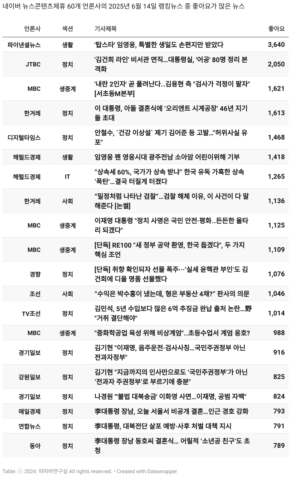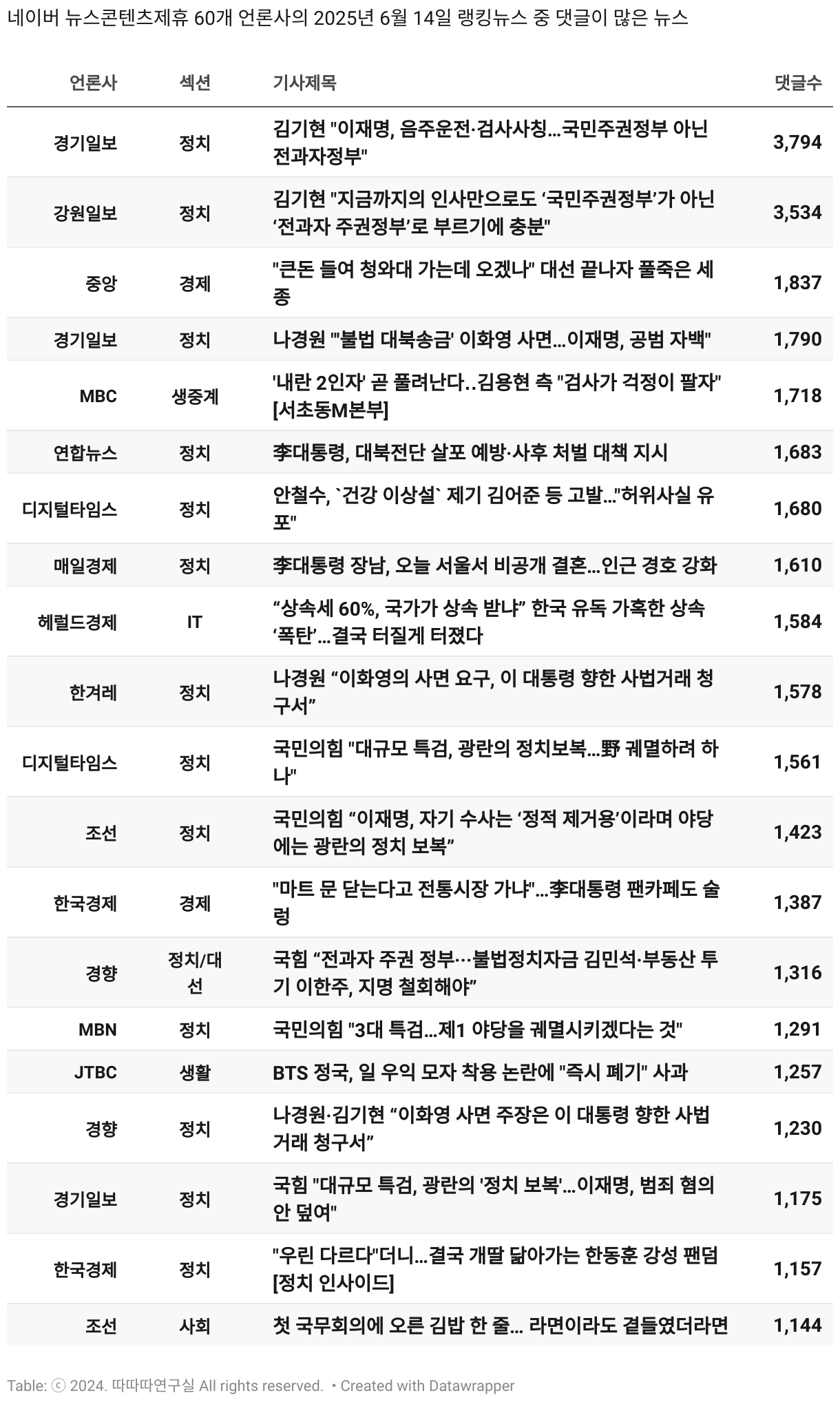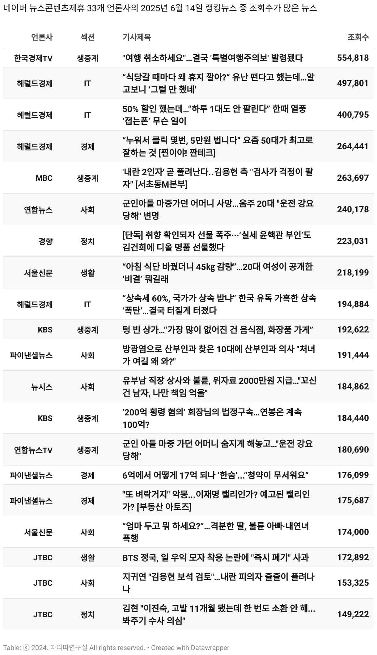*데이터 수집 기간 : 2024년 6월 10일 *데이터 수집 대상 : 네이버 뉴스콘텐츠제휴 60개 언론사. 종합일간지 10개(경향신문, 국민일보, 동아일보, 문화일보, 서울신문, 세계일보, 조선일보, 중앙일보, 한겨레신문, 한국일보), 방송/통신사 14개(뉴스1, 뉴시스, 연합뉴스, 연합뉴스TV, 채널A, 한국경제TV, JTBC, KBS, MBC, MBN, SBS, SBS BIZ, TV조선, YTN), 경제지 11개(매일경제, 머니투데이, 비즈워치, 서울경제, 아시아경제, 이데일리, 조선비즈, 조세일보, 파이낸셜뉴스, 한국경제(유튜브제외), 헤럴드경제) 인터넷 8개(노컷뉴스, 더팩트, 데일리안, 머니S, 미디어오늘, 아이뉴스24, 오마이뉴스, 프레시안), IT 5개(디지털데일리,디지털타임스, 블로터, 전자신문, 지디넷코리아), 지역 12개(강원도민일보, 강원일보, 경기일보, 국제신문, 대구MBC, 대전일보, 매일신문, 부산일보, 전주MBC, CJB청주방송, JIBS, kbc광주방송)