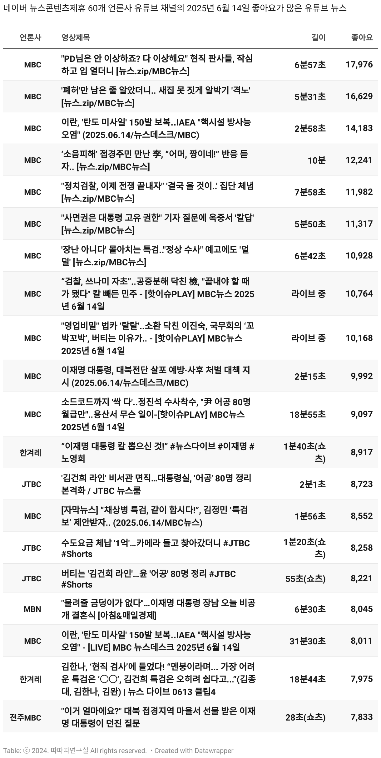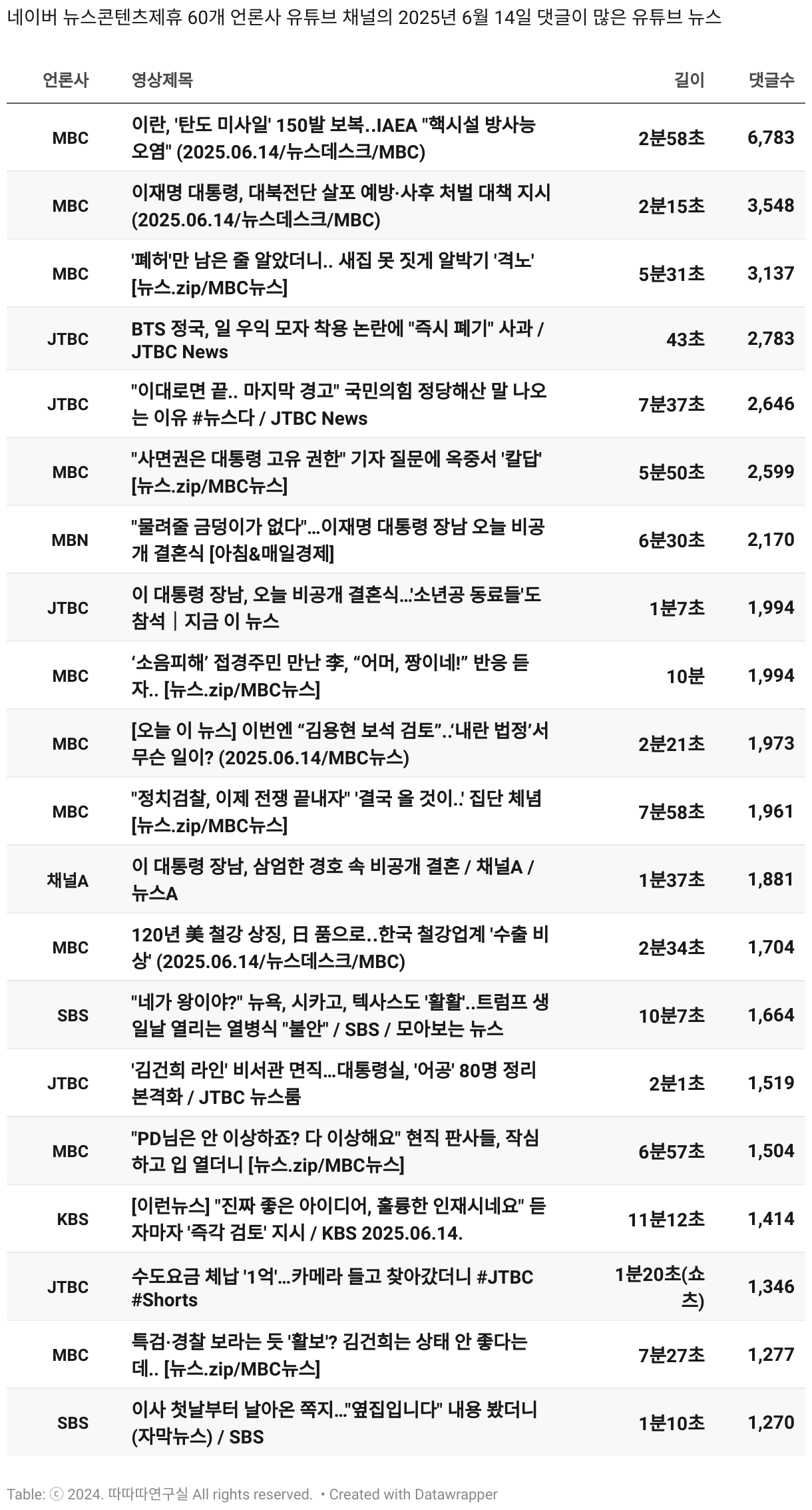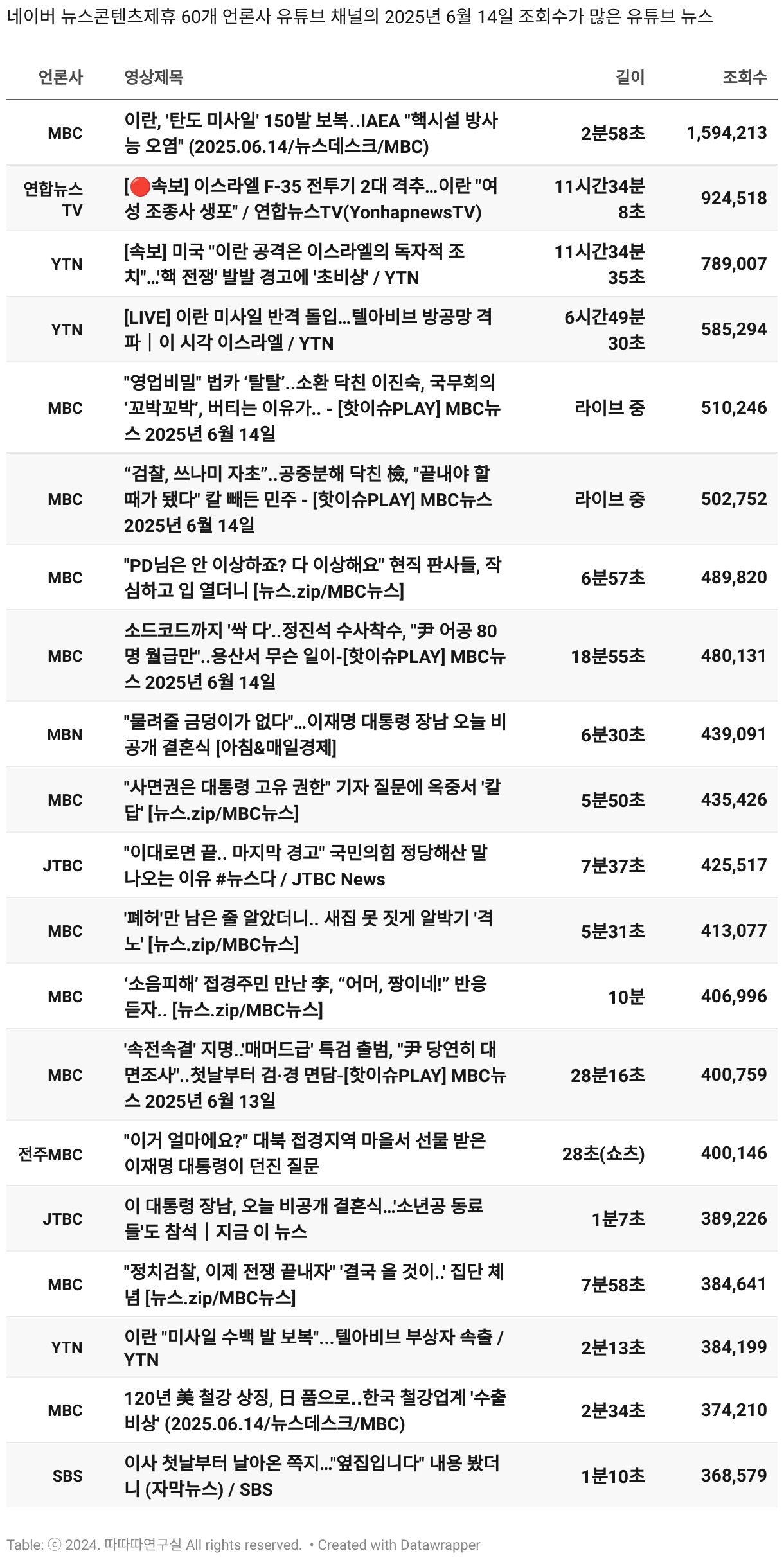 *데이터 수집 기간 : 2024년 6월 10일 *데이터 수집 대상 : 네이버 뉴스콘텐츠제휴 60개 언론사. 종합일간지 10개(경향신문, 국민일보, 동아일보, 문화일보, 서울신문, 세계일보, 조선일보, 중앙일보, 한겨레신문, 한국일보), 방송/통신사 14개(뉴스1, 뉴시스, 연합뉴스, 연합뉴스TV, 채널A, 한국경제TV, JTBC, KBS, MBC, MBN, SBS, SBS BIZ, TV조선, YTN), 경제지 11개(매일경제, 머니투데이, 비즈워치, 서울경제, 아시아경제, 이데일리, 조선비즈, 조세일보, 파이낸셜뉴스, 한국경제(유튜브제외), 헤럴드경제) 인터넷 8개(노컷뉴스, 더팩트, 데일리안, 머니S, 미디어오늘, 아이뉴스24, 오마이뉴스, 프레시안), IT 5개(디지털데일리,디지털타임스, 블로터, 전자신문, 지디넷코리아), 지역 12개(강원도민일보, 강원일보, 경기일보, 국제신문, 대구MBC, 대전일보, 매일신문, 부산일보, 전주MBC, CJB청주방송, JIBS, kbc광주방송)