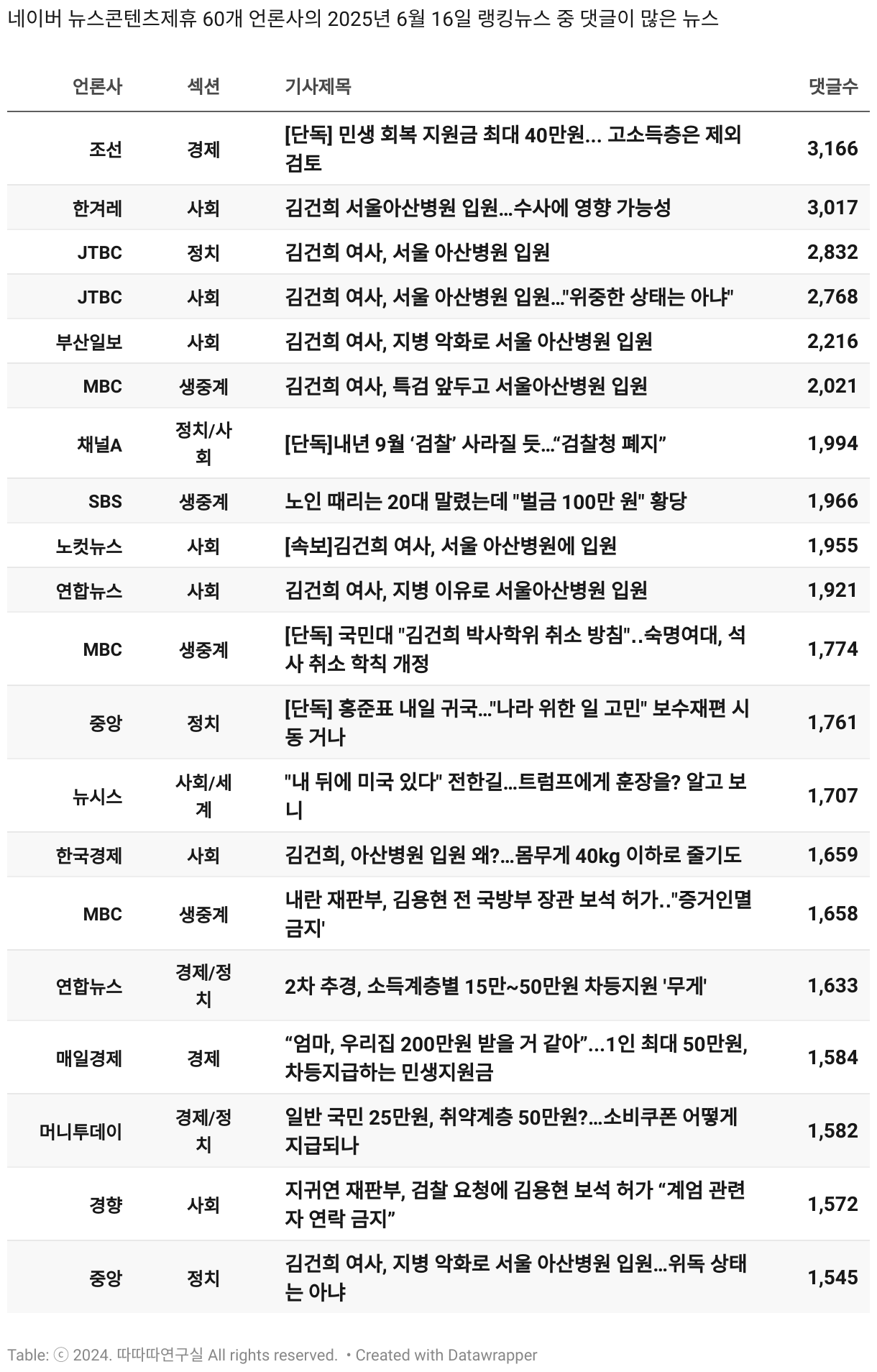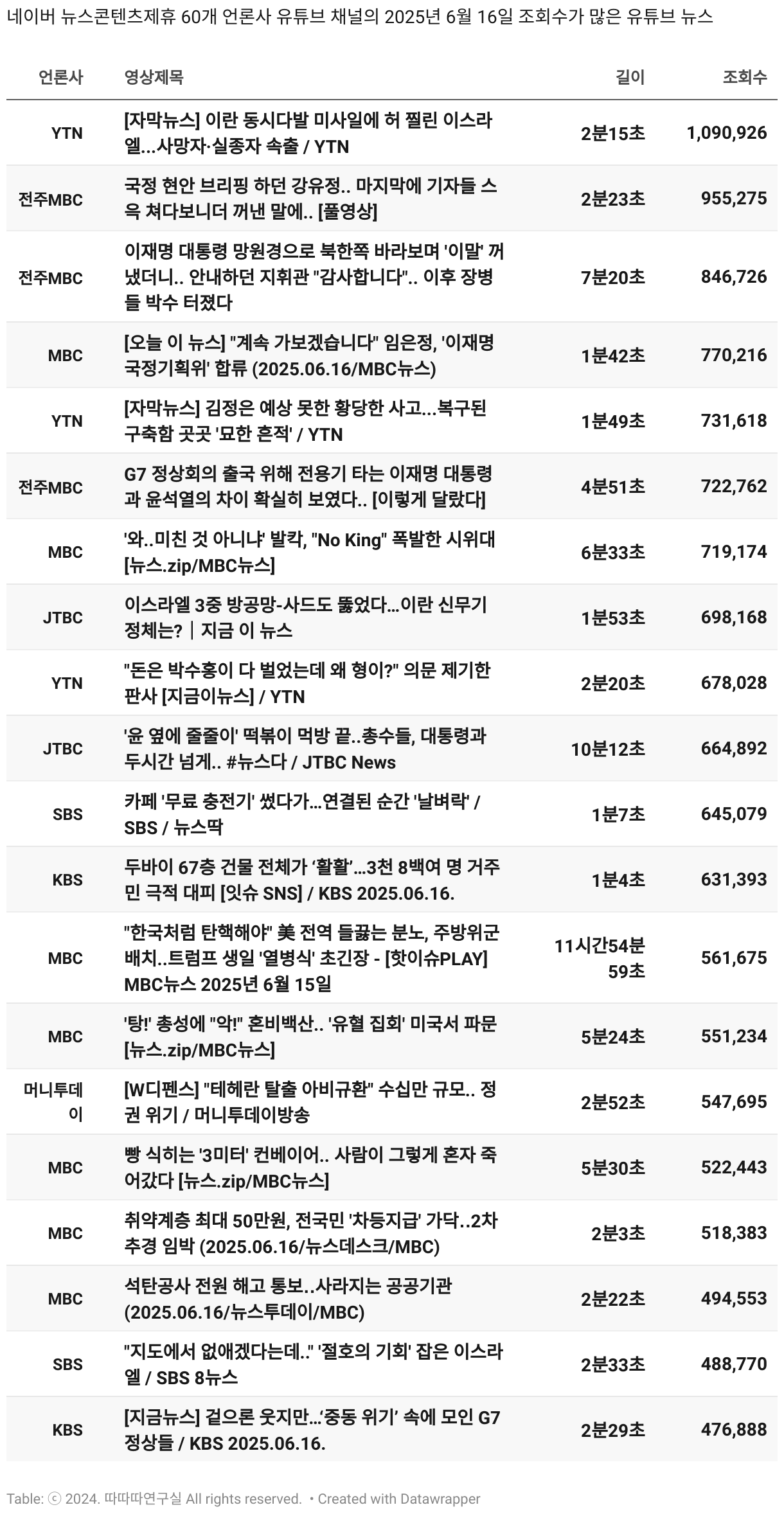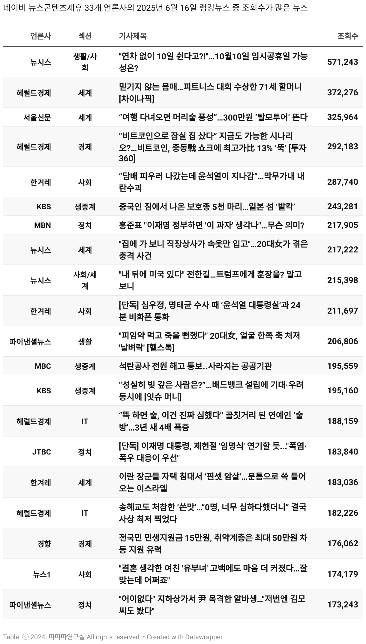 *데이터 수집 기간 : 2024년 6월 10일 *데이터 수집 대상 : 네이버 뉴스콘텐츠제휴 60개 언론사. 종합일간지 10개(경향신문, 국민일보, 동아일보, 문화일보, 서울신문, 세계일보, 조선일보, 중앙일보, 한겨레신문, 한국일보), 방송/통신사 14개(뉴스1, 뉴시스, 연합뉴스, 연합뉴스TV, 채널A, 한국경제TV, JTBC, KBS, MBC, MBN, SBS, SBS BIZ, TV조선, YTN), 경제지 11개(매일경제, 머니투데이, 비즈워치, 서울경제, 아시아경제, 이데일리, 조선비즈, 조세일보, 파이낸셜뉴스, 한국경제(유튜브제외), 헤럴드경제) 인터넷 8개(노컷뉴스, 더팩트, 데일리안, 머니S, 미디어오늘, 아이뉴스24, 오마이뉴스, 프레시안), IT 5개(디지털데일리,디지털타임스, 블로터, 전자신문, 지디넷코리아), 지역 12개(강원도민일보, 강원일보, 경기일보, 국제신문, 대구MBC, 대전일보, 매일신문, 부산일보, 전주MBC, CJB청주방송, JIBS, kbc광주방송)