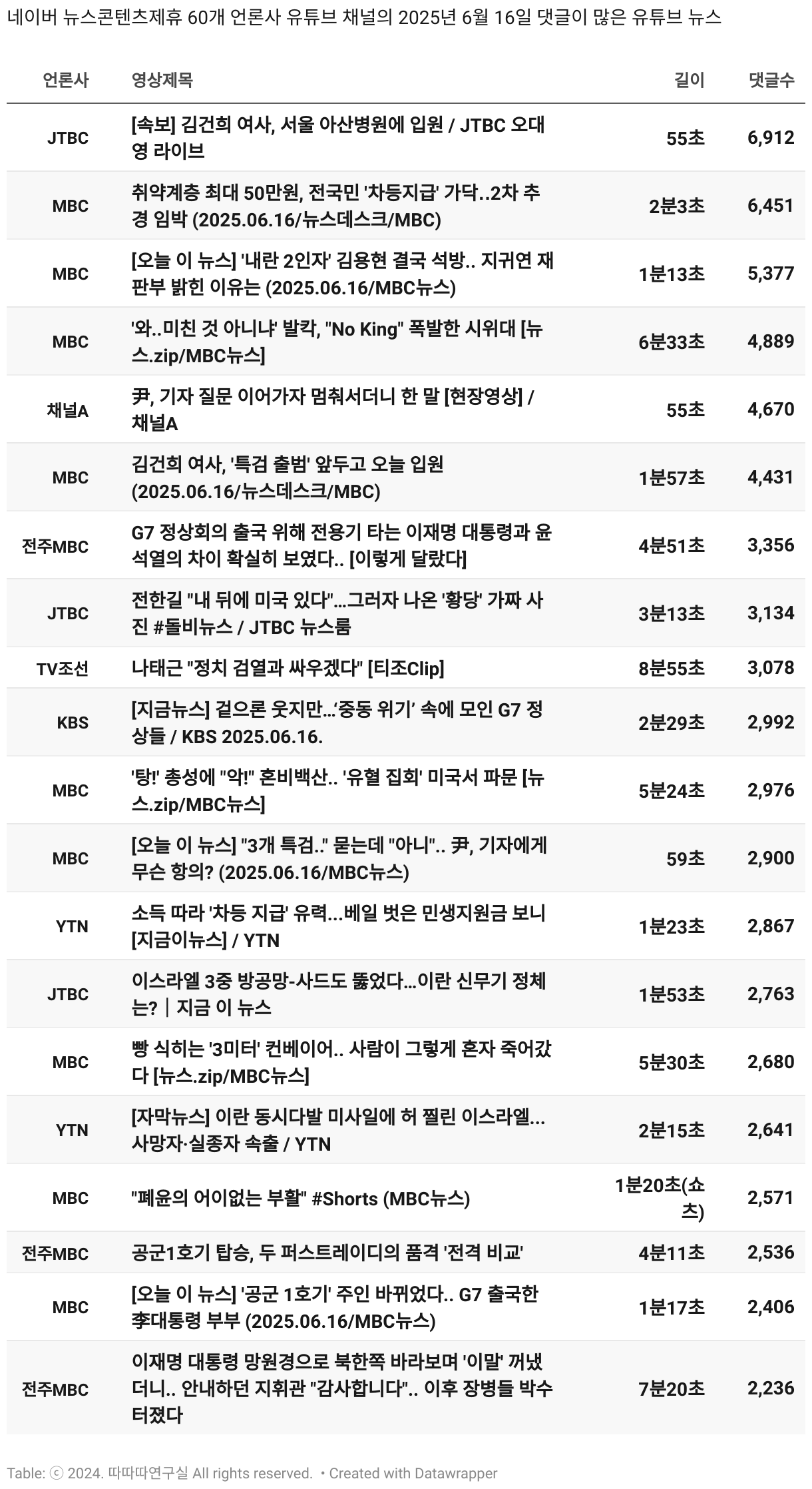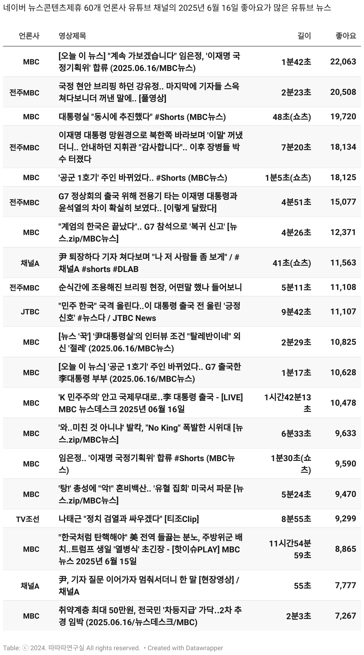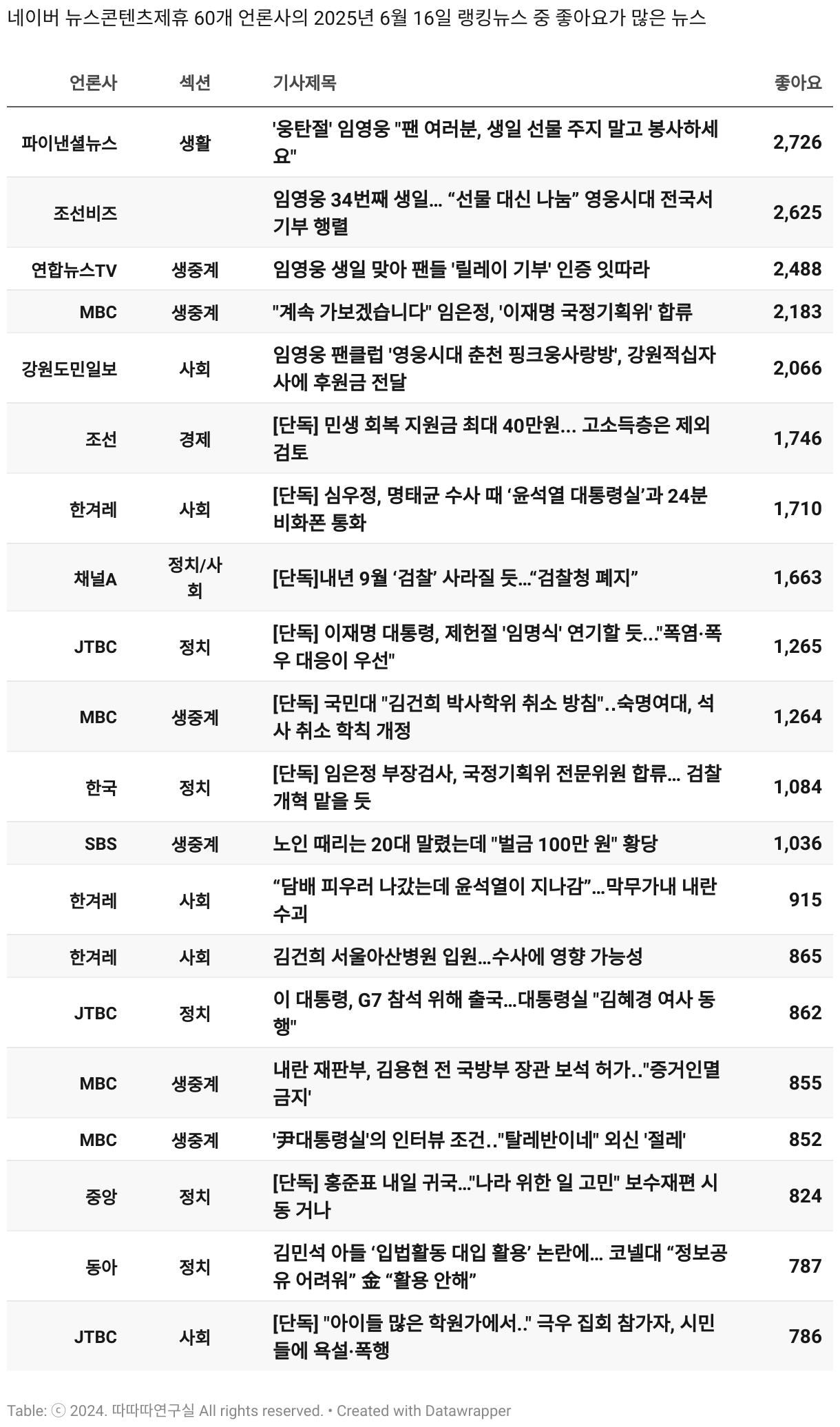 *데이터 수집 기간 : 2024년 6월 10일 *데이터 수집 대상 : 네이버 뉴스콘텐츠제휴 60개 언론사. 종합일간지 10개(경향신문, 국민일보, 동아일보, 문화일보, 서울신문, 세계일보, 조선일보, 중앙일보, 한겨레신문, 한국일보), 방송/통신사 14개(뉴스1, 뉴시스, 연합뉴스, 연합뉴스TV, 채널A, 한국경제TV, JTBC, KBS, MBC, MBN, SBS, SBS BIZ, TV조선, YTN), 경제지 11개(매일경제, 머니투데이, 비즈워치, 서울경제, 아시아경제, 이데일리, 조선비즈, 조세일보, 파이낸셜뉴스, 한국경제(유튜브제외), 헤럴드경제) 인터넷 8개(노컷뉴스, 더팩트, 데일리안, 머니S, 미디어오늘, 아이뉴스24, 오마이뉴스, 프레시안), IT 5개(디지털데일리,디지털타임스, 블로터, 전자신문, 지디넷코리아), 지역 12개(강원도민일보, 강원일보, 경기일보, 국제신문, 대구MBC, 대전일보, 매일신문, 부산일보, 전주MBC, CJB청주방송, JIBS, kbc광주방송)