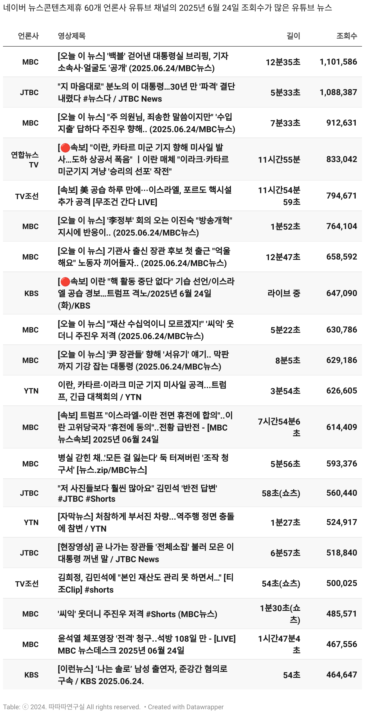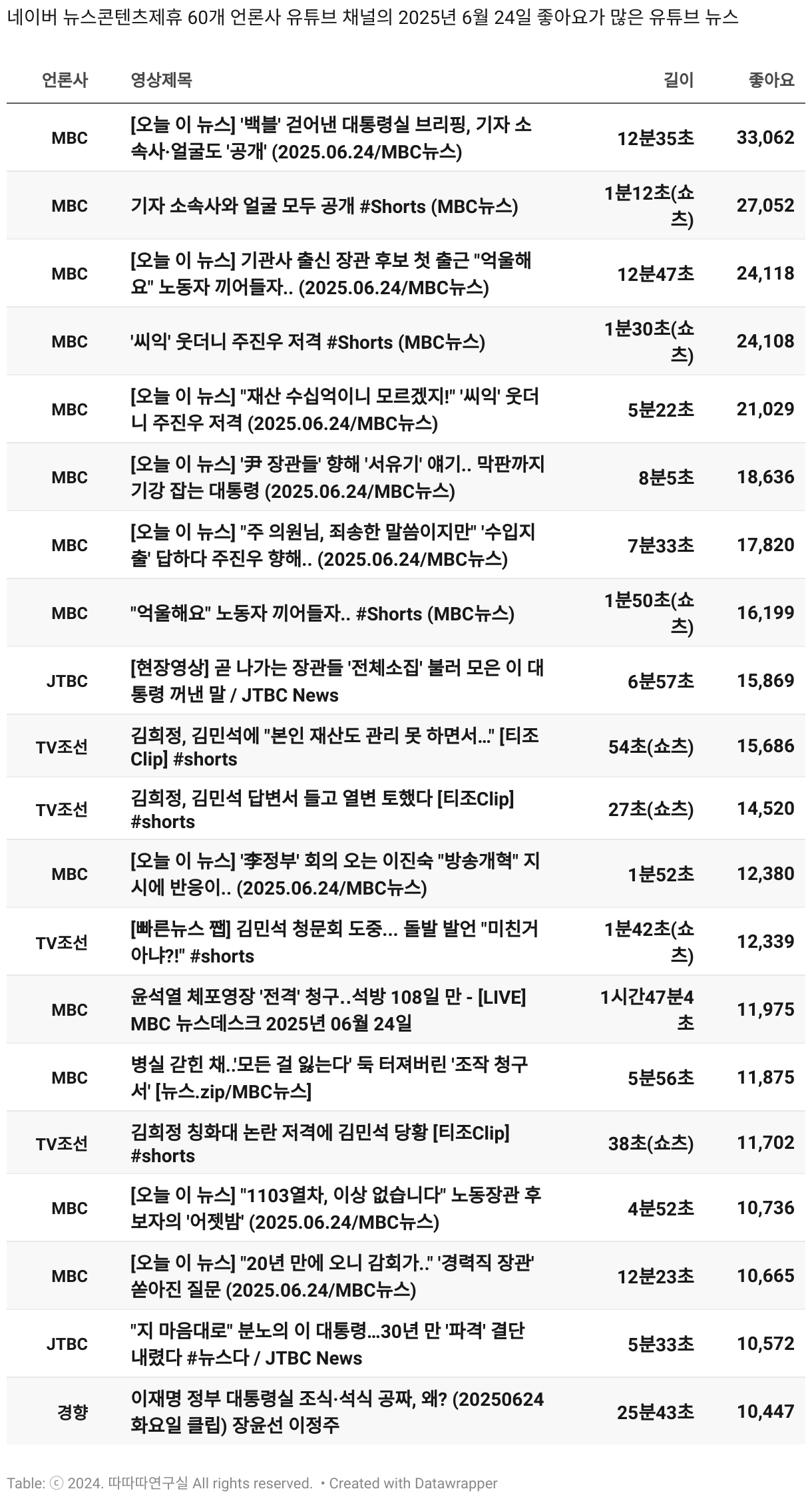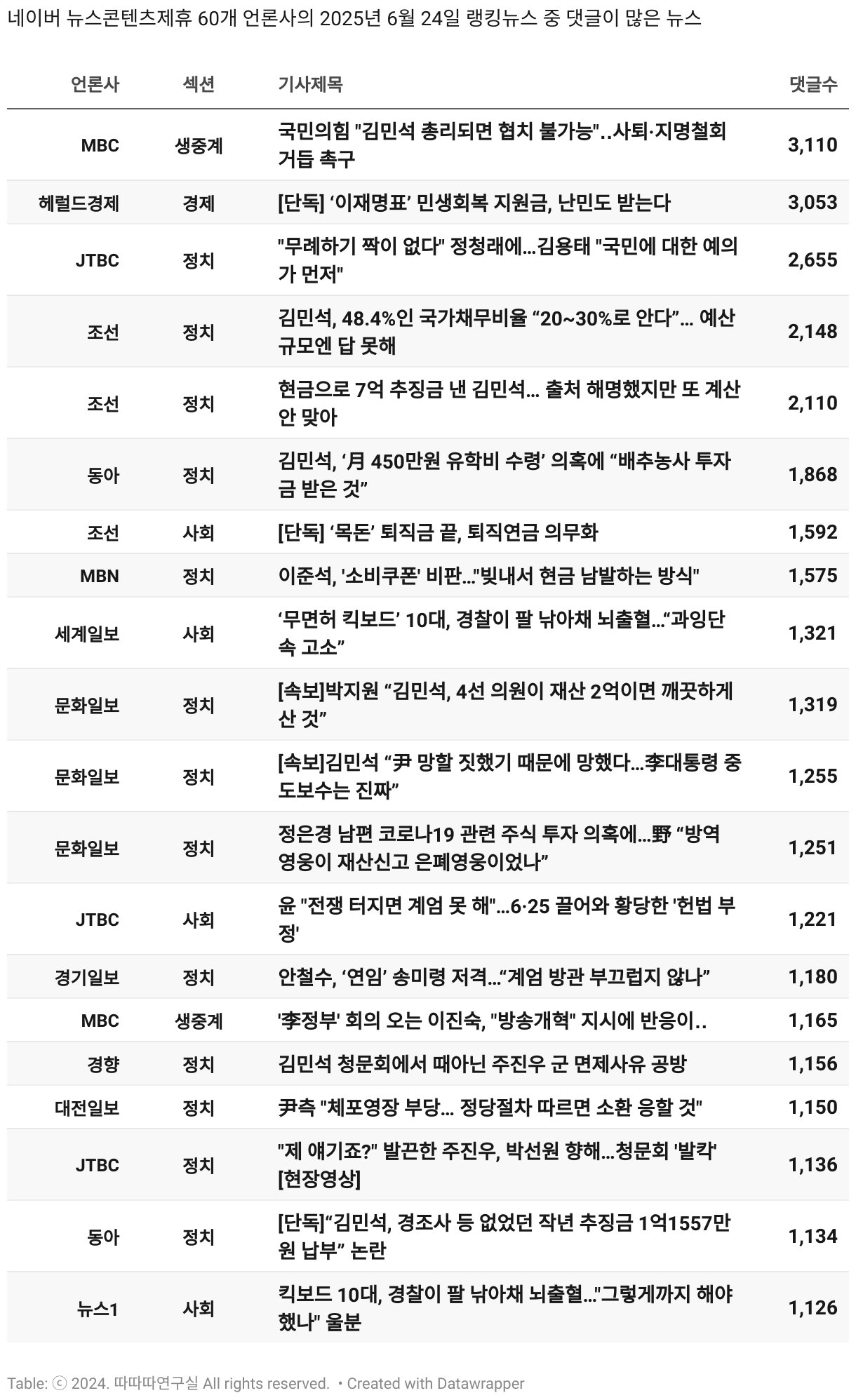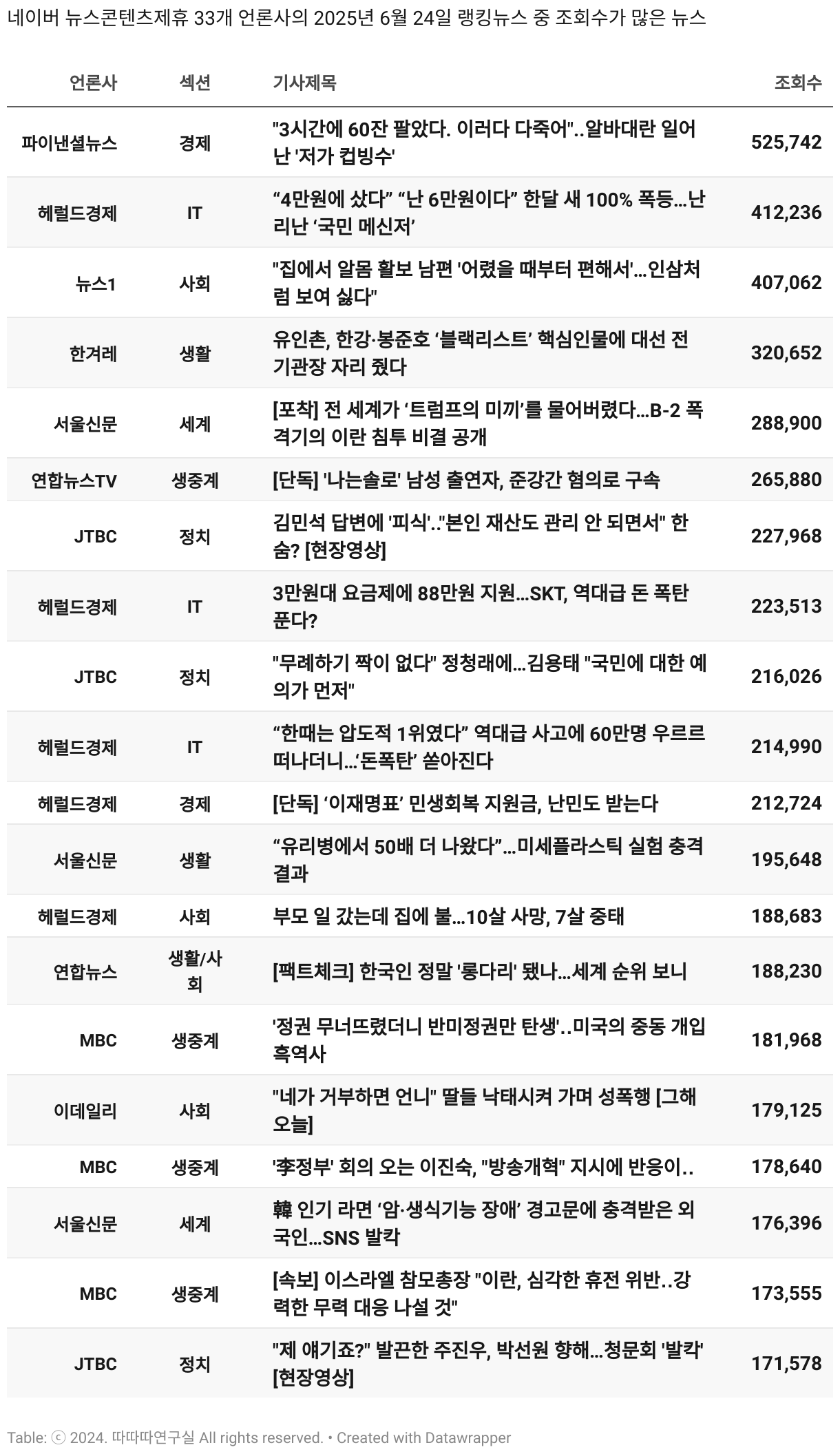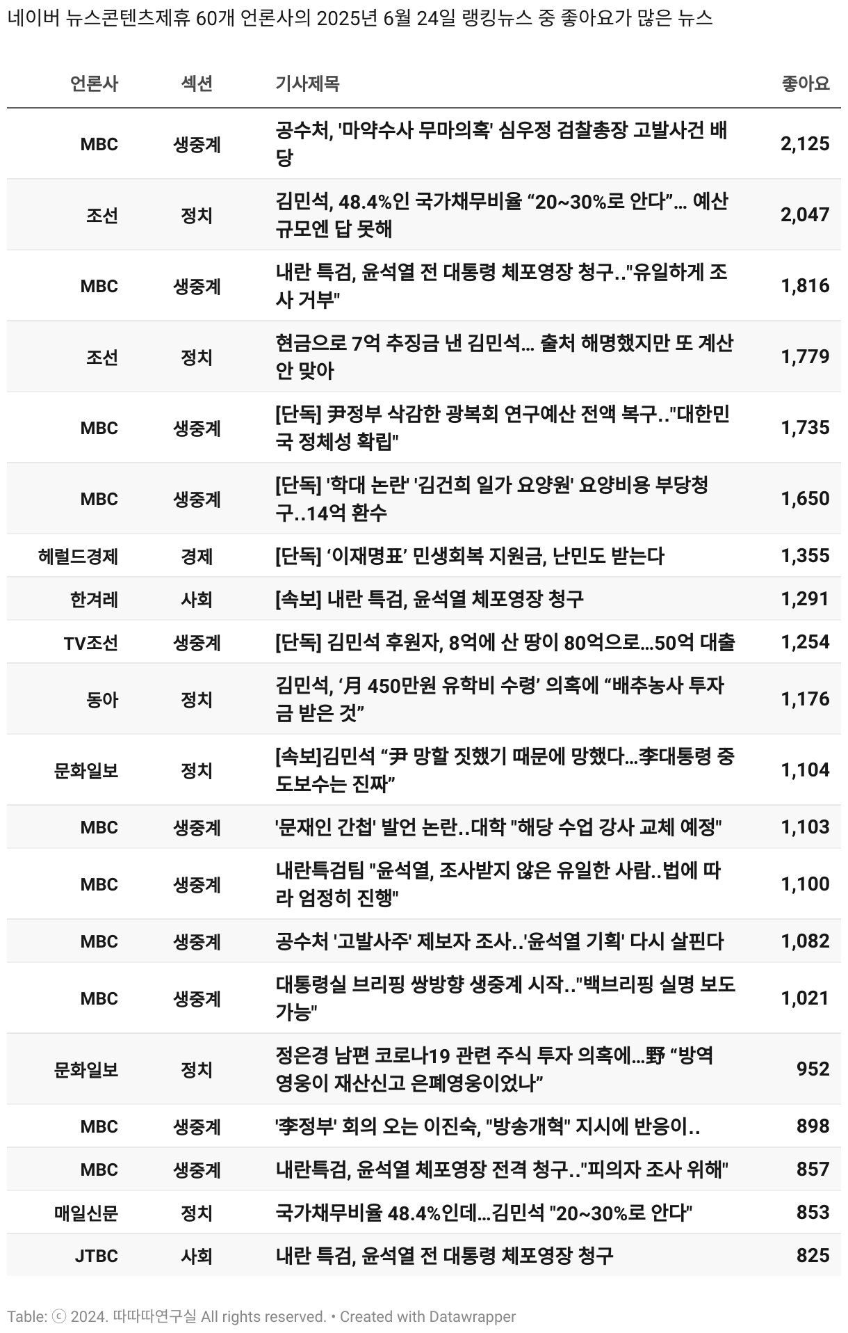 *데이터 수집 기간 : 2024년 6월 10일 *데이터 수집 대상 : 네이버 뉴스콘텐츠제휴 60개 언론사. 종합일간지 10개(경향신문, 국민일보, 동아일보, 문화일보, 서울신문, 세계일보, 조선일보, 중앙일보, 한겨레신문, 한국일보), 방송/통신사 14개(뉴스1, 뉴시스, 연합뉴스, 연합뉴스TV, 채널A, 한국경제TV, JTBC, KBS, MBC, MBN, SBS, SBS BIZ, TV조선, YTN), 경제지 11개(매일경제, 머니투데이, 비즈워치, 서울경제, 아시아경제, 이데일리, 조선비즈, 조세일보, 파이낸셜뉴스, 한국경제(유튜브제외), 헤럴드경제) 인터넷 8개(노컷뉴스, 더팩트, 데일리안, 머니S, 미디어오늘, 아이뉴스24, 오마이뉴스, 프레시안), IT 5개(디지털데일리,디지털타임스, 블로터, 전자신문, 지디넷코리아), 지역 12개(강원도민일보, 강원일보, 경기일보, 국제신문, 대구MBC, 대전일보, 매일신문, 부산일보, 전주MBC, CJB청주방송, JIBS, kbc광주방송)