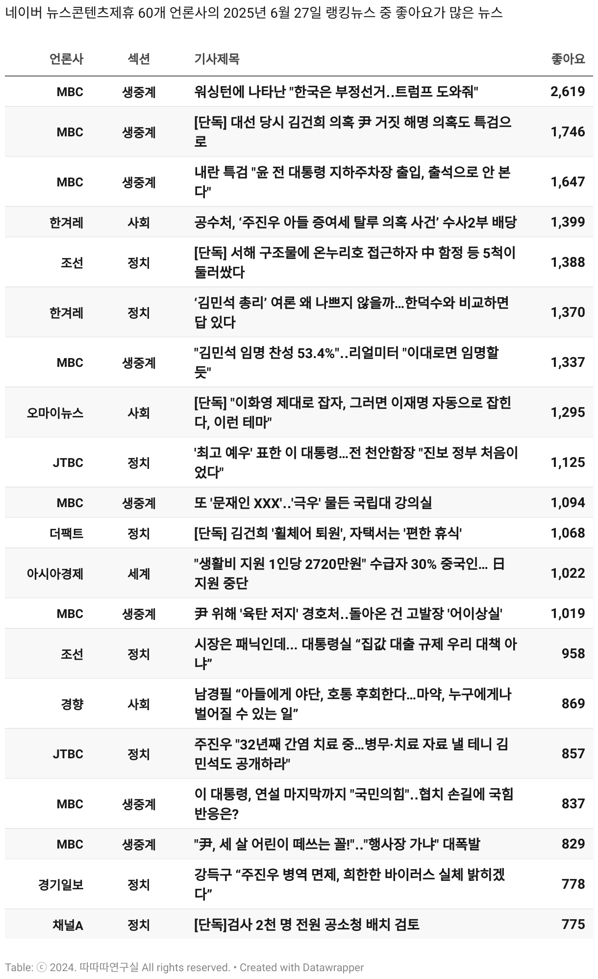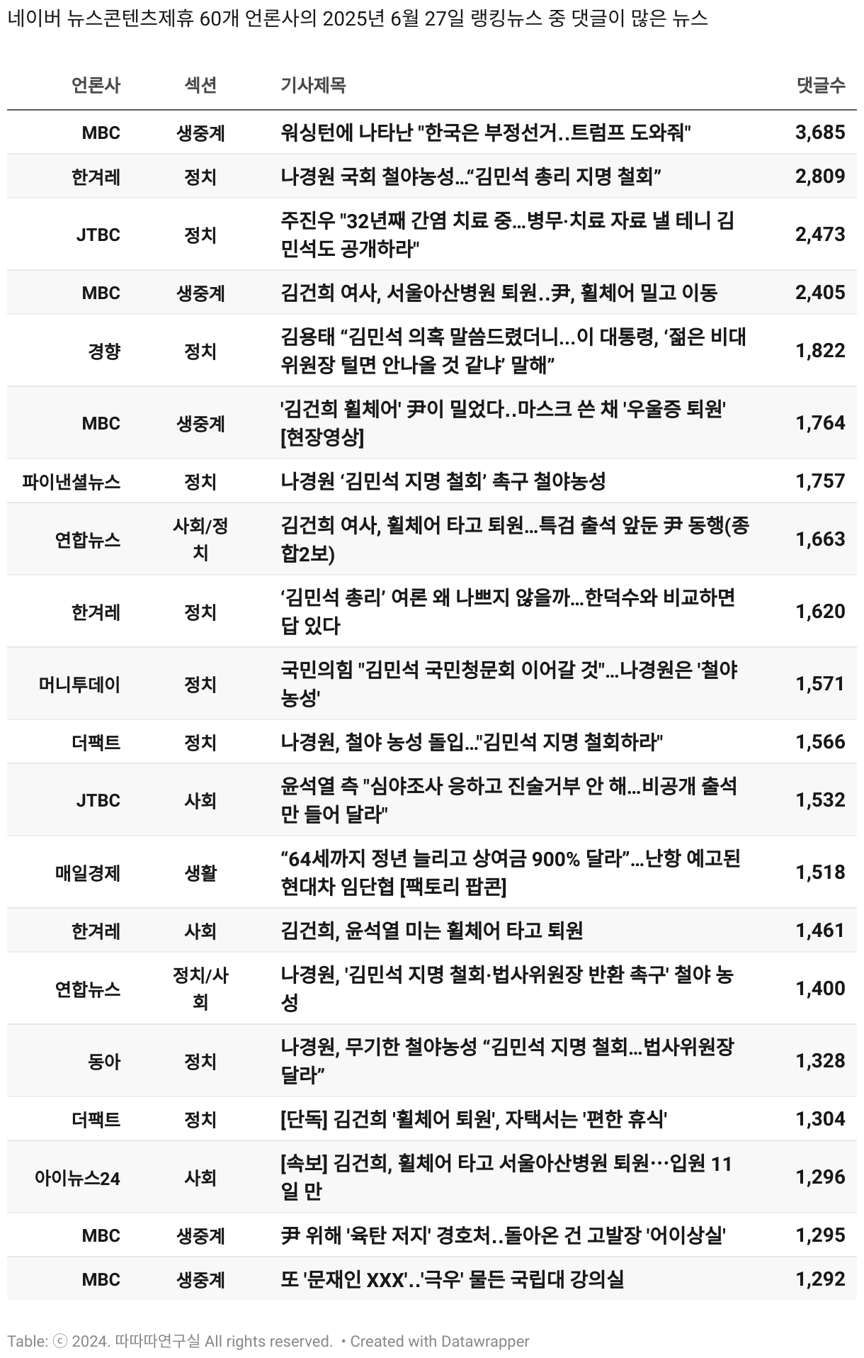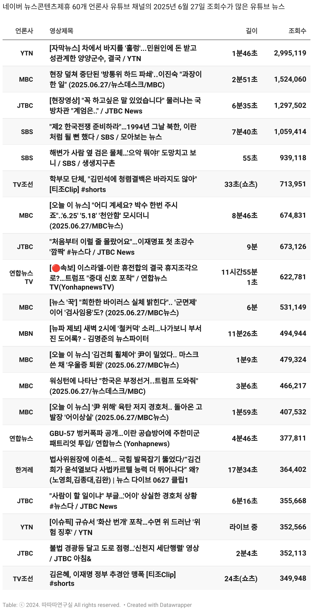 *데이터 수집 기간 : 2024년 6월 10일 *데이터 수집 대상 : 네이버 뉴스콘텐츠제휴 60개 언론사. 종합일간지 10개(경향신문, 국민일보, 동아일보, 문화일보, 서울신문, 세계일보, 조선일보, 중앙일보, 한겨레신문, 한국일보), 방송/통신사 14개(뉴스1, 뉴시스, 연합뉴스, 연합뉴스TV, 채널A, 한국경제TV, JTBC, KBS, MBC, MBN, SBS, SBS BIZ, TV조선, YTN), 경제지 11개(매일경제, 머니투데이, 비즈워치, 서울경제, 아시아경제, 이데일리, 조선비즈, 조세일보, 파이낸셜뉴스, 한국경제(유튜브제외), 헤럴드경제) 인터넷 8개(노컷뉴스, 더팩트, 데일리안, 머니S, 미디어오늘, 아이뉴스24, 오마이뉴스, 프레시안), IT 5개(디지털데일리,디지털타임스, 블로터, 전자신문, 지디넷코리아), 지역 12개(강원도민일보, 강원일보, 경기일보, 국제신문, 대구MBC, 대전일보, 매일신문, 부산일보, 전주MBC, CJB청주방송, JIBS, kbc광주방송)