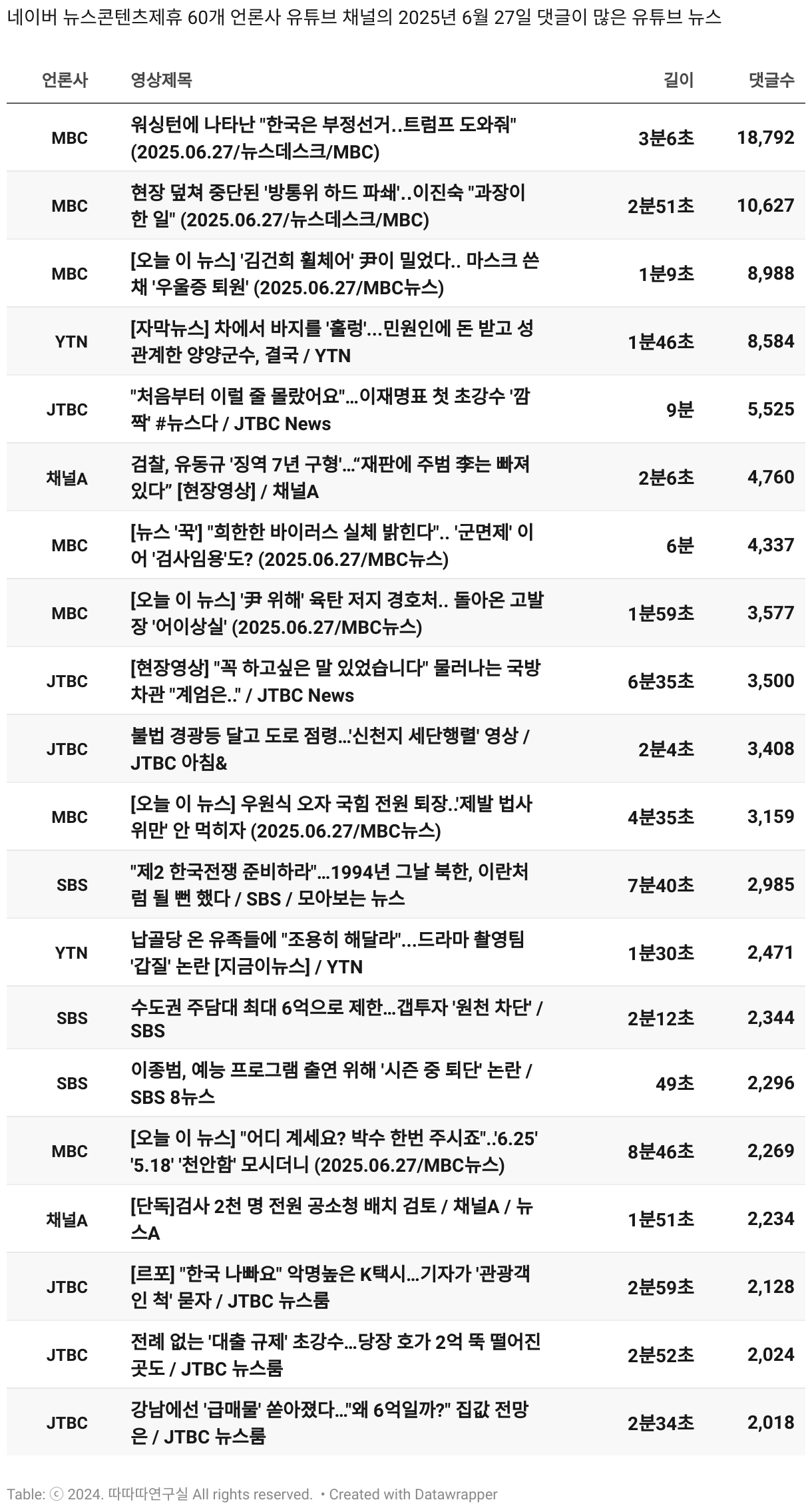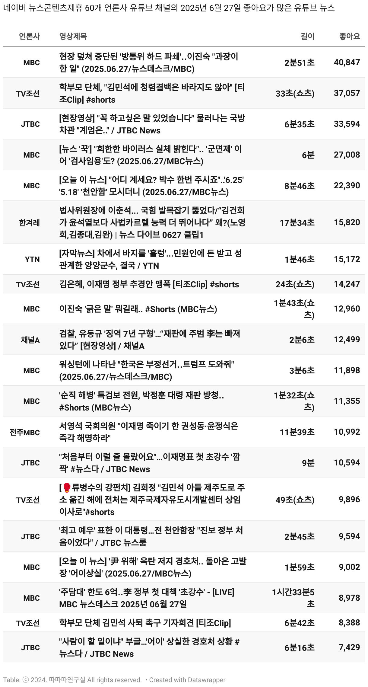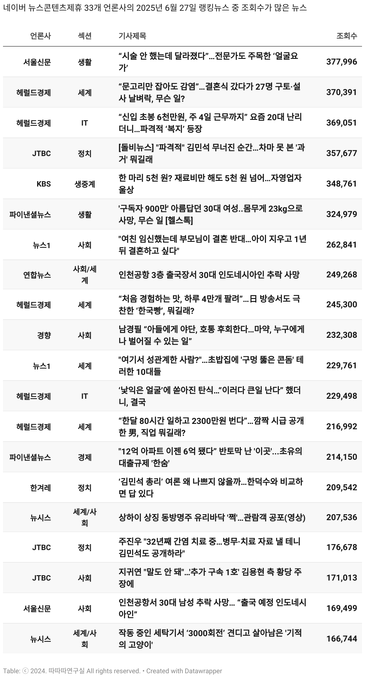 *데이터 수집 기간 : 2024년 6월 10일 *데이터 수집 대상 : 네이버 뉴스콘텐츠제휴 60개 언론사. 종합일간지 10개(경향신문, 국민일보, 동아일보, 문화일보, 서울신문, 세계일보, 조선일보, 중앙일보, 한겨레신문, 한국일보), 방송/통신사 14개(뉴스1, 뉴시스, 연합뉴스, 연합뉴스TV, 채널A, 한국경제TV, JTBC, KBS, MBC, MBN, SBS, SBS BIZ, TV조선, YTN), 경제지 11개(매일경제, 머니투데이, 비즈워치, 서울경제, 아시아경제, 이데일리, 조선비즈, 조세일보, 파이낸셜뉴스, 한국경제(유튜브제외), 헤럴드경제) 인터넷 8개(노컷뉴스, 더팩트, 데일리안, 머니S, 미디어오늘, 아이뉴스24, 오마이뉴스, 프레시안), IT 5개(디지털데일리,디지털타임스, 블로터, 전자신문, 지디넷코리아), 지역 12개(강원도민일보, 강원일보, 경기일보, 국제신문, 대구MBC, 대전일보, 매일신문, 부산일보, 전주MBC, CJB청주방송, JIBS, kbc광주방송)