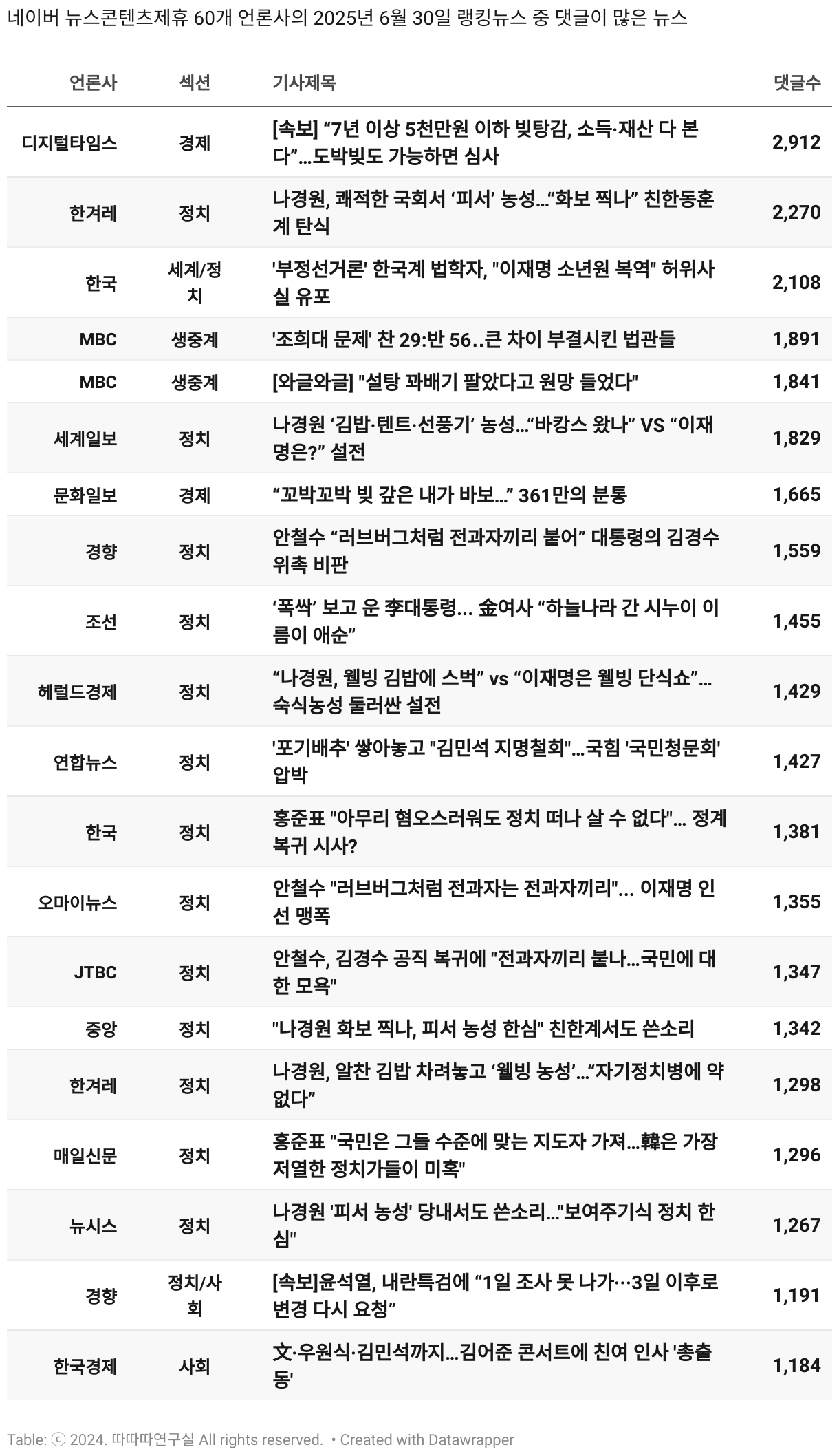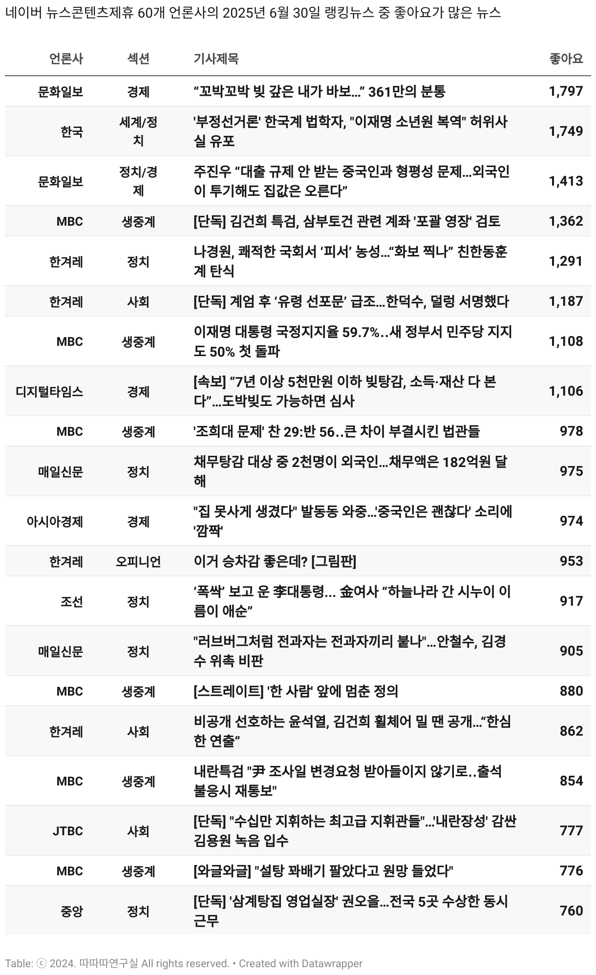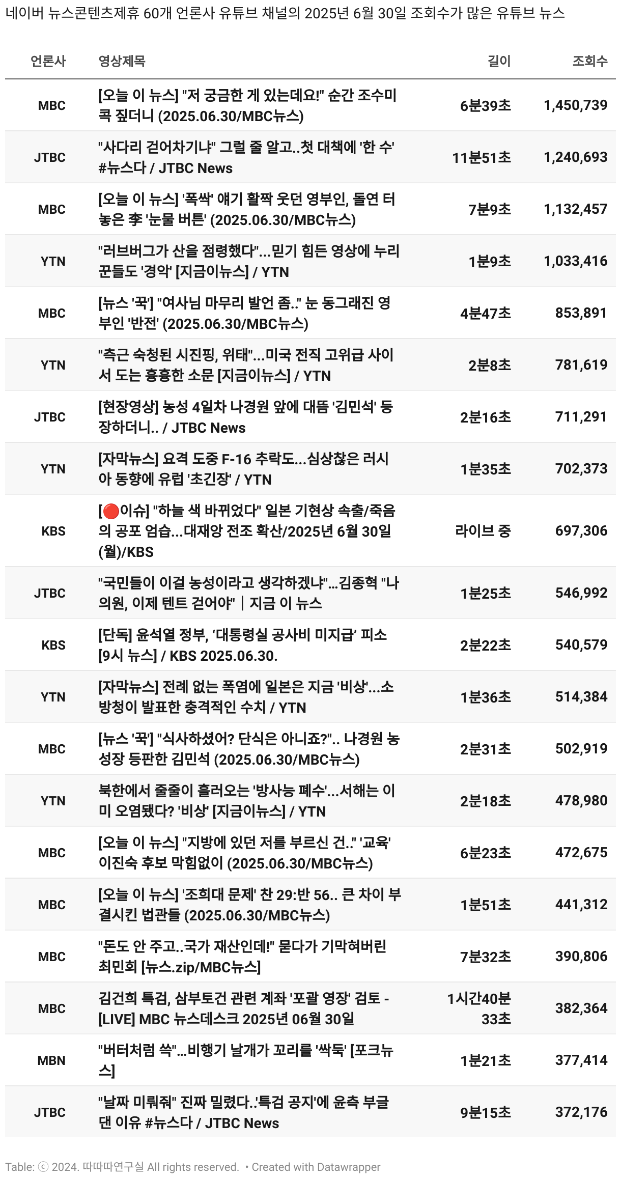 *데이터 수집 기간 : 2024년 6월 10일 *데이터 수집 대상 : 네이버 뉴스콘텐츠제휴 60개 언론사. 종합일간지 10개(경향신문, 국민일보, 동아일보, 문화일보, 서울신문, 세계일보, 조선일보, 중앙일보, 한겨레신문, 한국일보), 방송/통신사 14개(뉴스1, 뉴시스, 연합뉴스, 연합뉴스TV, 채널A, 한국경제TV, JTBC, KBS, MBC, MBN, SBS, SBS BIZ, TV조선, YTN), 경제지 11개(매일경제, 머니투데이, 비즈워치, 서울경제, 아시아경제, 이데일리, 조선비즈, 조세일보, 파이낸셜뉴스, 한국경제(유튜브제외), 헤럴드경제) 인터넷 8개(노컷뉴스, 더팩트, 데일리안, 머니S, 미디어오늘, 아이뉴스24, 오마이뉴스, 프레시안), IT 5개(디지털데일리,디지털타임스, 블로터, 전자신문, 지디넷코리아), 지역 12개(강원도민일보, 강원일보, 경기일보, 국제신문, 대구MBC, 대전일보, 매일신문, 부산일보, 전주MBC, CJB청주방송, JIBS, kbc광주방송)