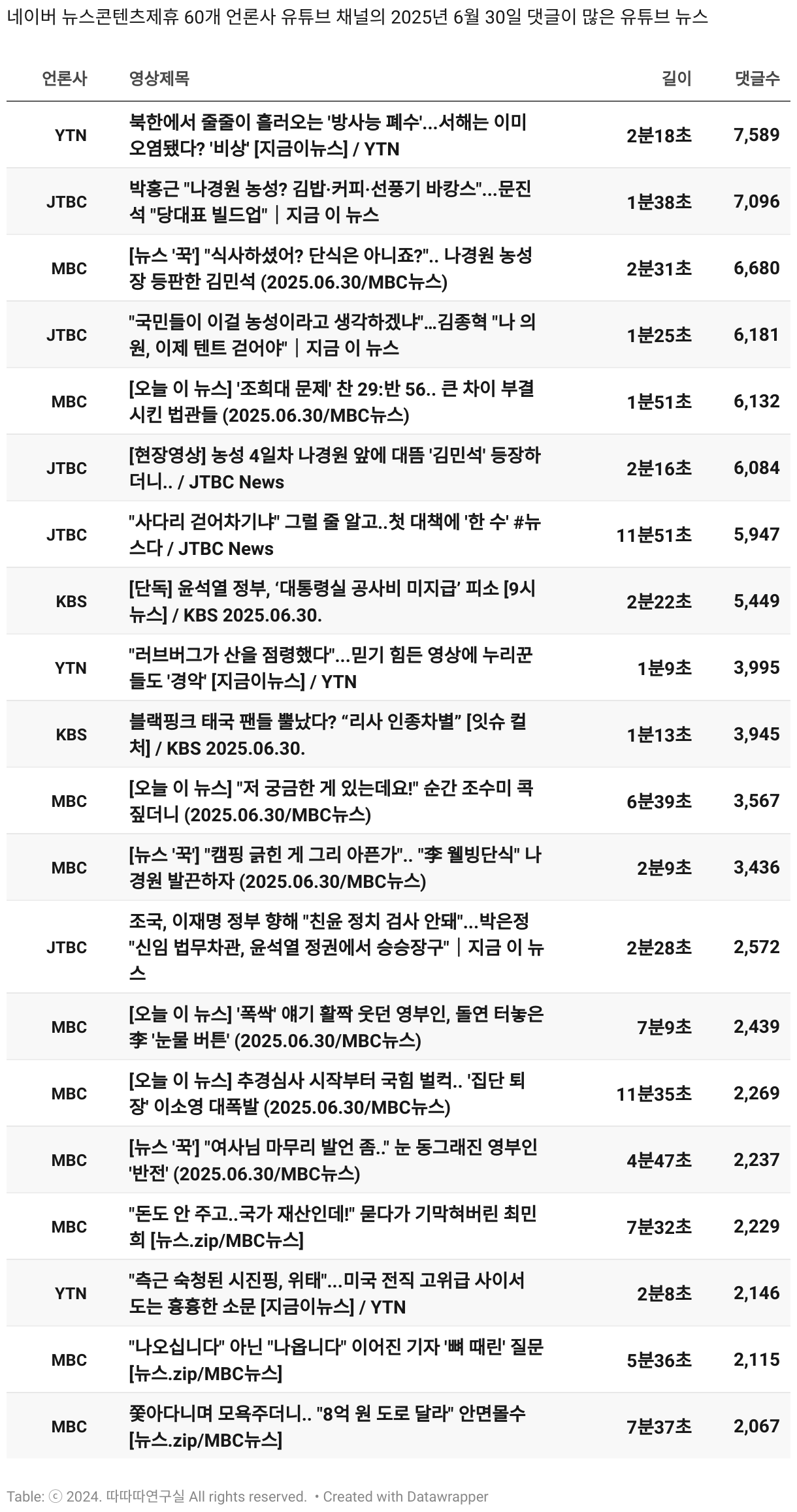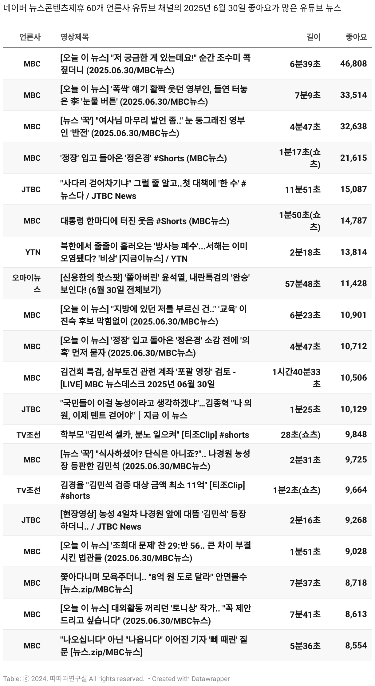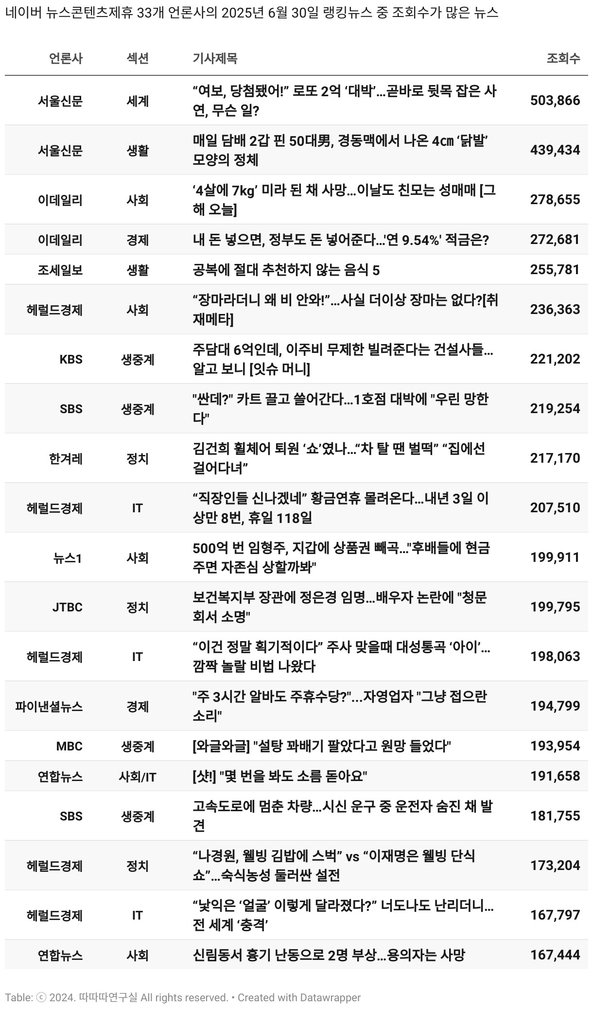 *데이터 수집 기간 : 2024년 6월 10일 *데이터 수집 대상 : 네이버 뉴스콘텐츠제휴 60개 언론사. 종합일간지 10개(경향신문, 국민일보, 동아일보, 문화일보, 서울신문, 세계일보, 조선일보, 중앙일보, 한겨레신문, 한국일보), 방송/통신사 14개(뉴스1, 뉴시스, 연합뉴스, 연합뉴스TV, 채널A, 한국경제TV, JTBC, KBS, MBC, MBN, SBS, SBS BIZ, TV조선, YTN), 경제지 11개(매일경제, 머니투데이, 비즈워치, 서울경제, 아시아경제, 이데일리, 조선비즈, 조세일보, 파이낸셜뉴스, 한국경제(유튜브제외), 헤럴드경제) 인터넷 8개(노컷뉴스, 더팩트, 데일리안, 머니S, 미디어오늘, 아이뉴스24, 오마이뉴스, 프레시안), IT 5개(디지털데일리,디지털타임스, 블로터, 전자신문, 지디넷코리아), 지역 12개(강원도민일보, 강원일보, 경기일보, 국제신문, 대구MBC, 대전일보, 매일신문, 부산일보, 전주MBC, CJB청주방송, JIBS, kbc광주방송)