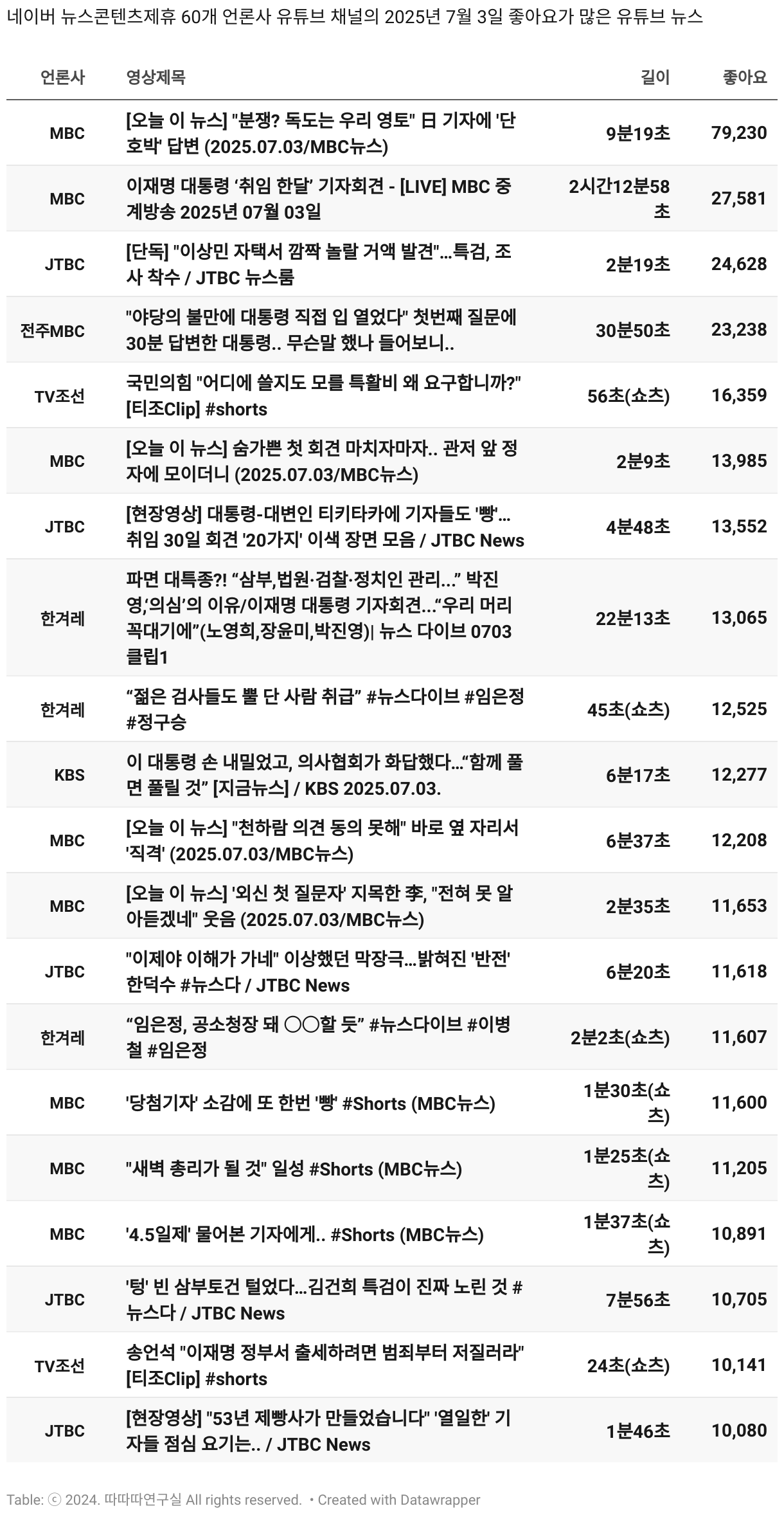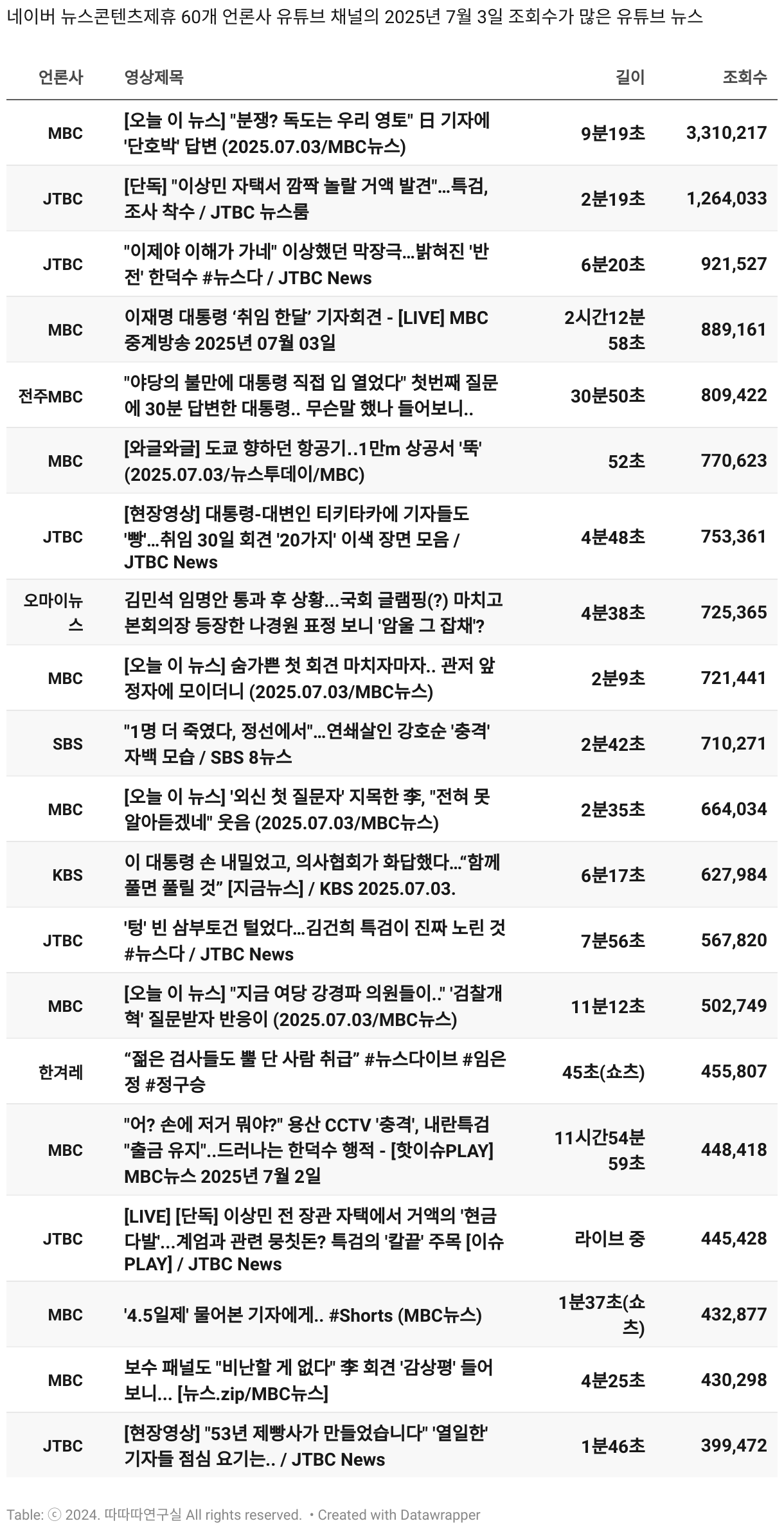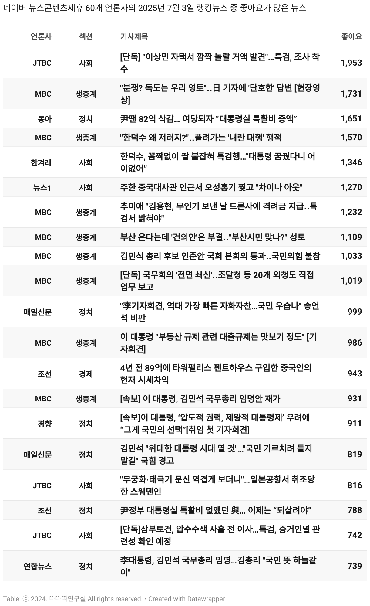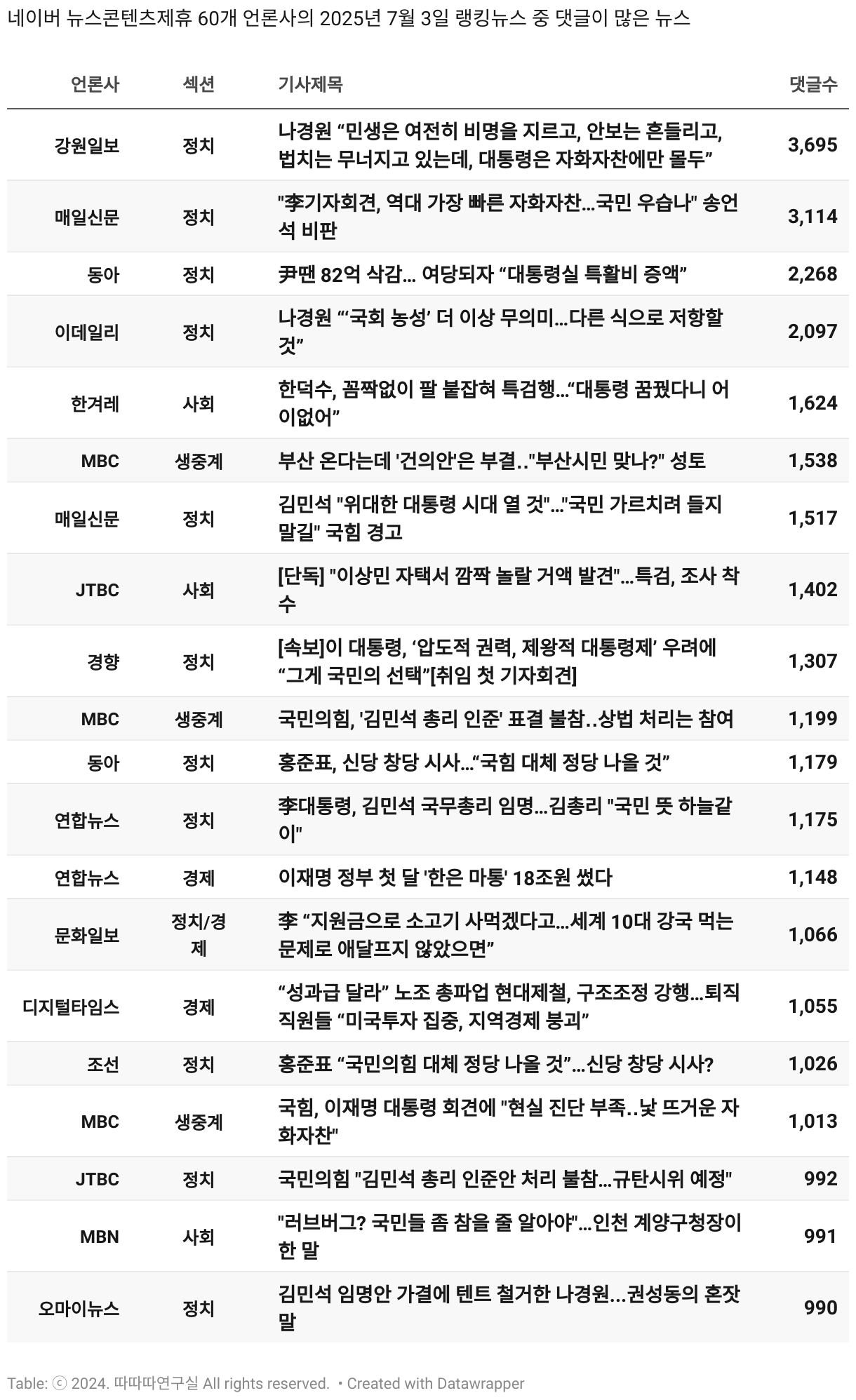 *데이터 수집 기간 : 2024년 6월 10일 *데이터 수집 대상 : 네이버 뉴스콘텐츠제휴 60개 언론사. 종합일간지 10개(경향신문, 국민일보, 동아일보, 문화일보, 서울신문, 세계일보, 조선일보, 중앙일보, 한겨레신문, 한국일보), 방송/통신사 14개(뉴스1, 뉴시스, 연합뉴스, 연합뉴스TV, 채널A, 한국경제TV, JTBC, KBS, MBC, MBN, SBS, SBS BIZ, TV조선, YTN), 경제지 11개(매일경제, 머니투데이, 비즈워치, 서울경제, 아시아경제, 이데일리, 조선비즈, 조세일보, 파이낸셜뉴스, 한국경제(유튜브제외), 헤럴드경제) 인터넷 8개(노컷뉴스, 더팩트, 데일리안, 머니S, 미디어오늘, 아이뉴스24, 오마이뉴스, 프레시안), IT 5개(디지털데일리,디지털타임스, 블로터, 전자신문, 지디넷코리아), 지역 12개(강원도민일보, 강원일보, 경기일보, 국제신문, 대구MBC, 대전일보, 매일신문, 부산일보, 전주MBC, CJB청주방송, JIBS, kbc광주방송)
