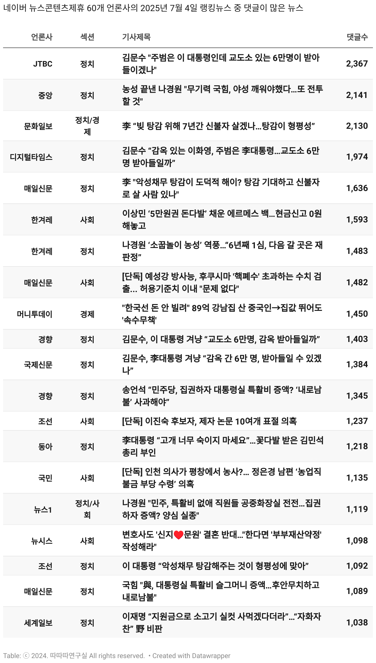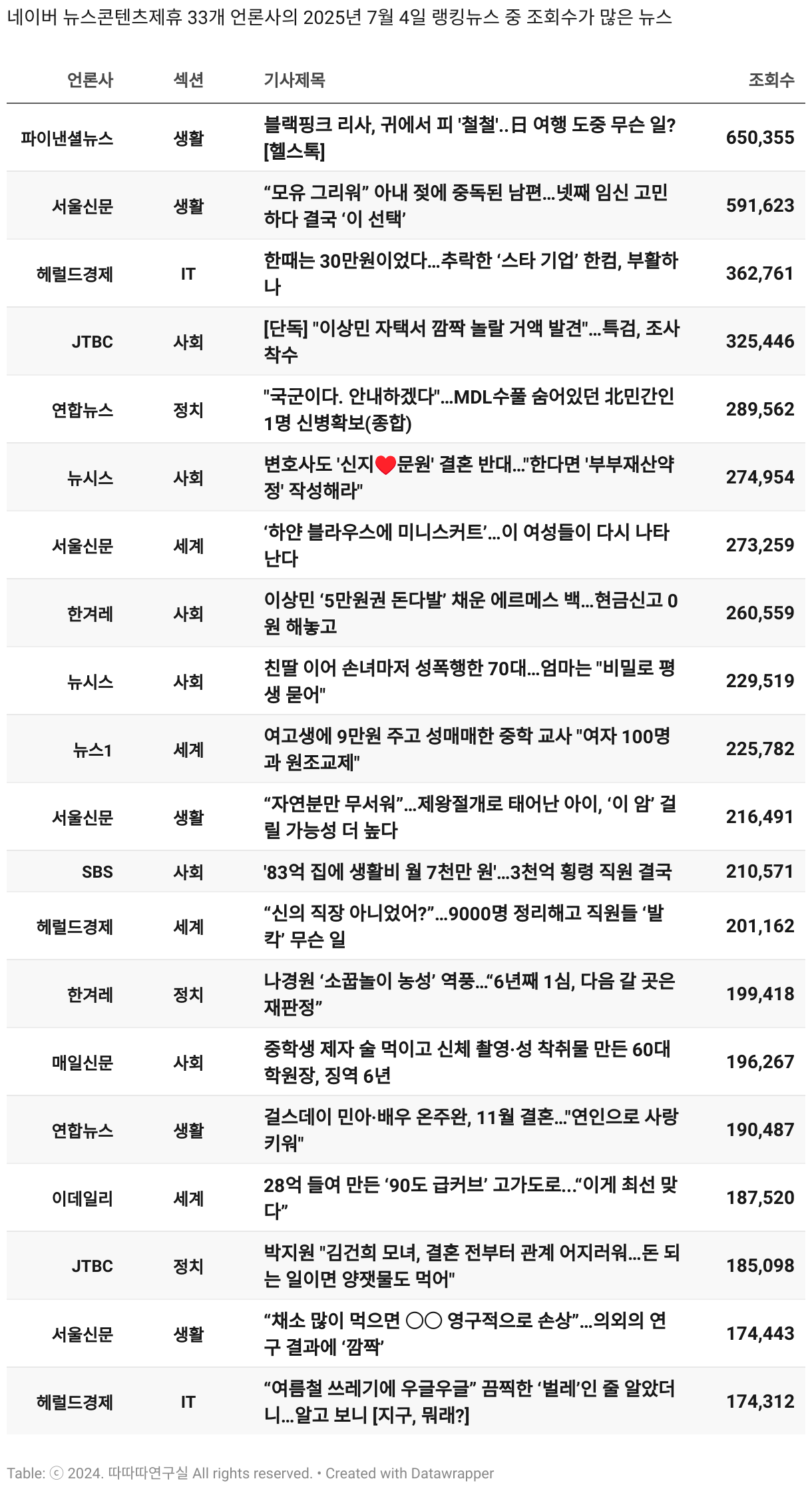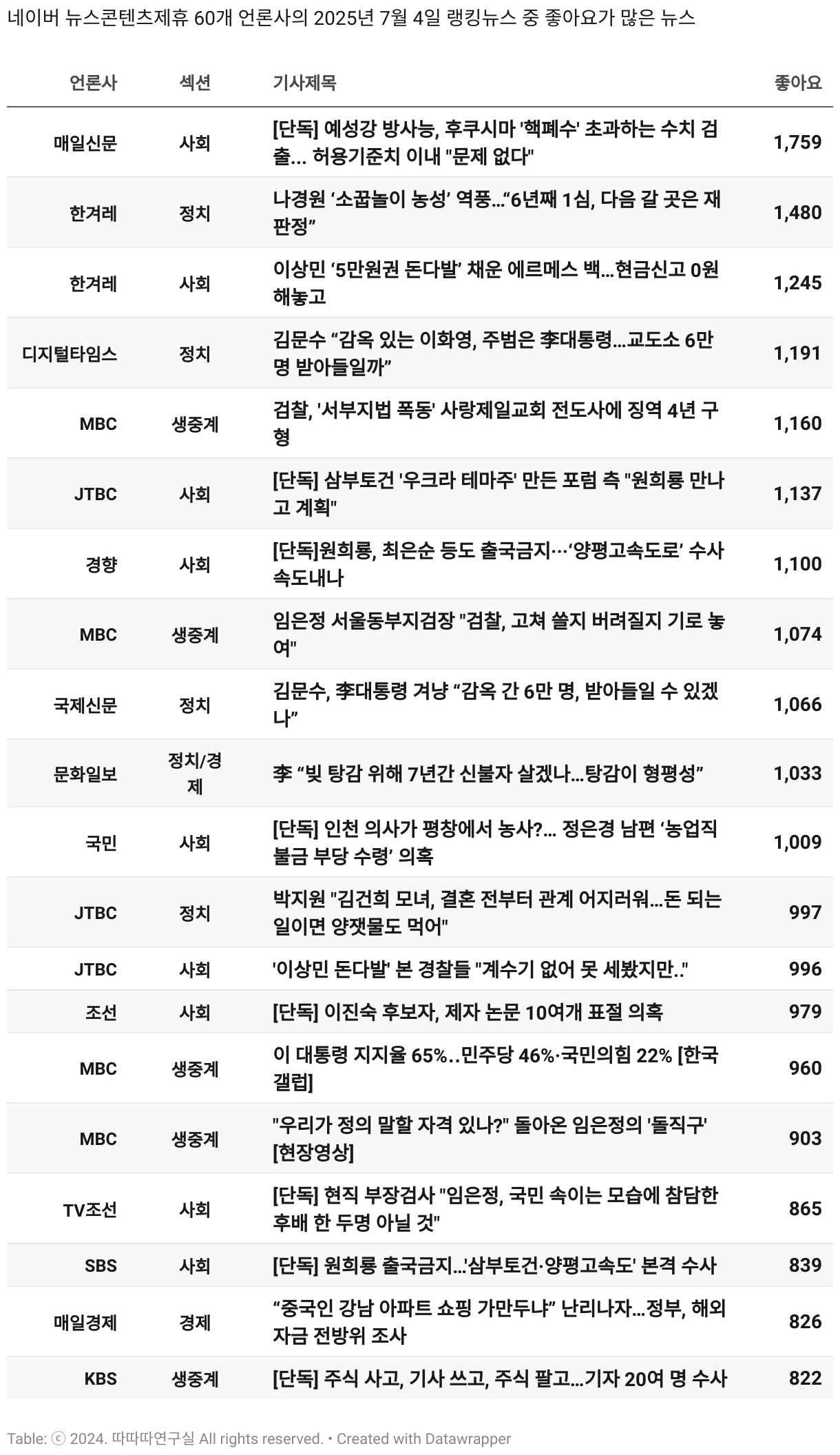 *데이터 수집 기간 : 2024년 6월 10일 *데이터 수집 대상 : 네이버 뉴스콘텐츠제휴 60개 언론사. 종합일간지 10개(경향신문, 국민일보, 동아일보, 문화일보, 서울신문, 세계일보, 조선일보, 중앙일보, 한겨레신문, 한국일보), 방송/통신사 14개(뉴스1, 뉴시스, 연합뉴스, 연합뉴스TV, 채널A, 한국경제TV, JTBC, KBS, MBC, MBN, SBS, SBS BIZ, TV조선, YTN), 경제지 11개(매일경제, 머니투데이, 비즈워치, 서울경제, 아시아경제, 이데일리, 조선비즈, 조세일보, 파이낸셜뉴스, 한국경제(유튜브제외), 헤럴드경제) 인터넷 8개(노컷뉴스, 더팩트, 데일리안, 머니S, 미디어오늘, 아이뉴스24, 오마이뉴스, 프레시안), IT 5개(디지털데일리,디지털타임스, 블로터, 전자신문, 지디넷코리아), 지역 12개(강원도민일보, 강원일보, 경기일보, 국제신문, 대구MBC, 대전일보, 매일신문, 부산일보, 전주MBC, CJB청주방송, JIBS, kbc광주방송)