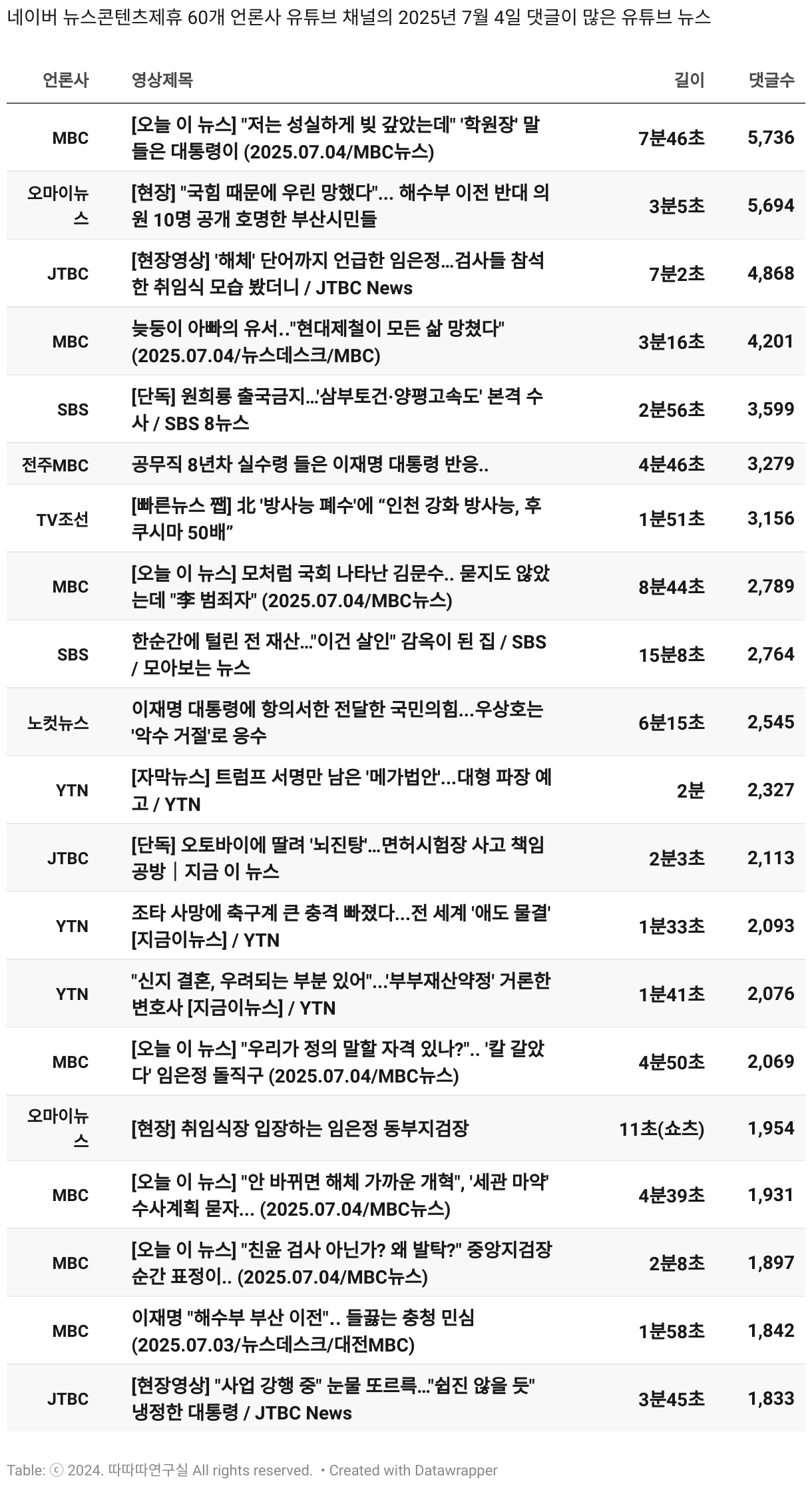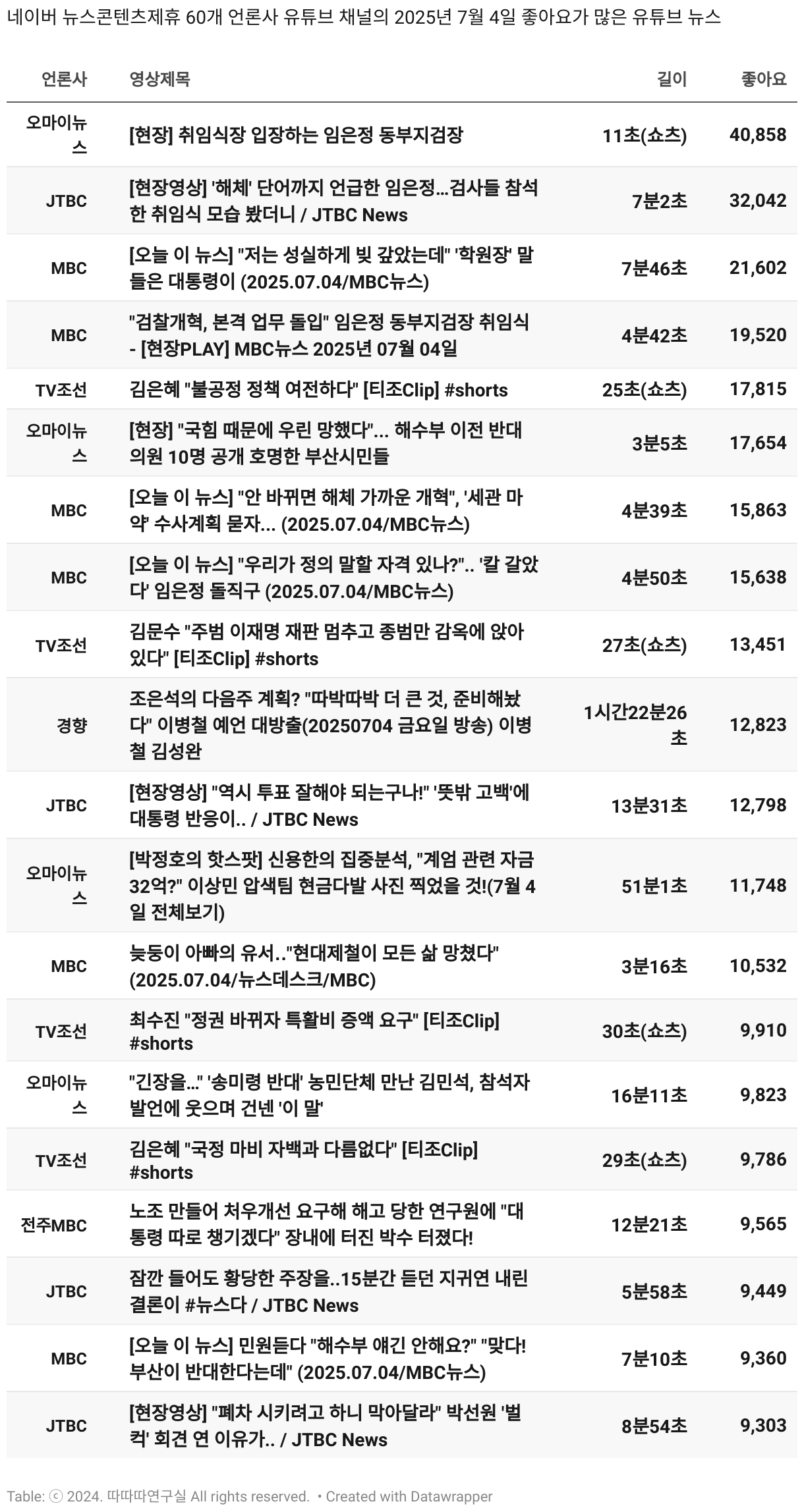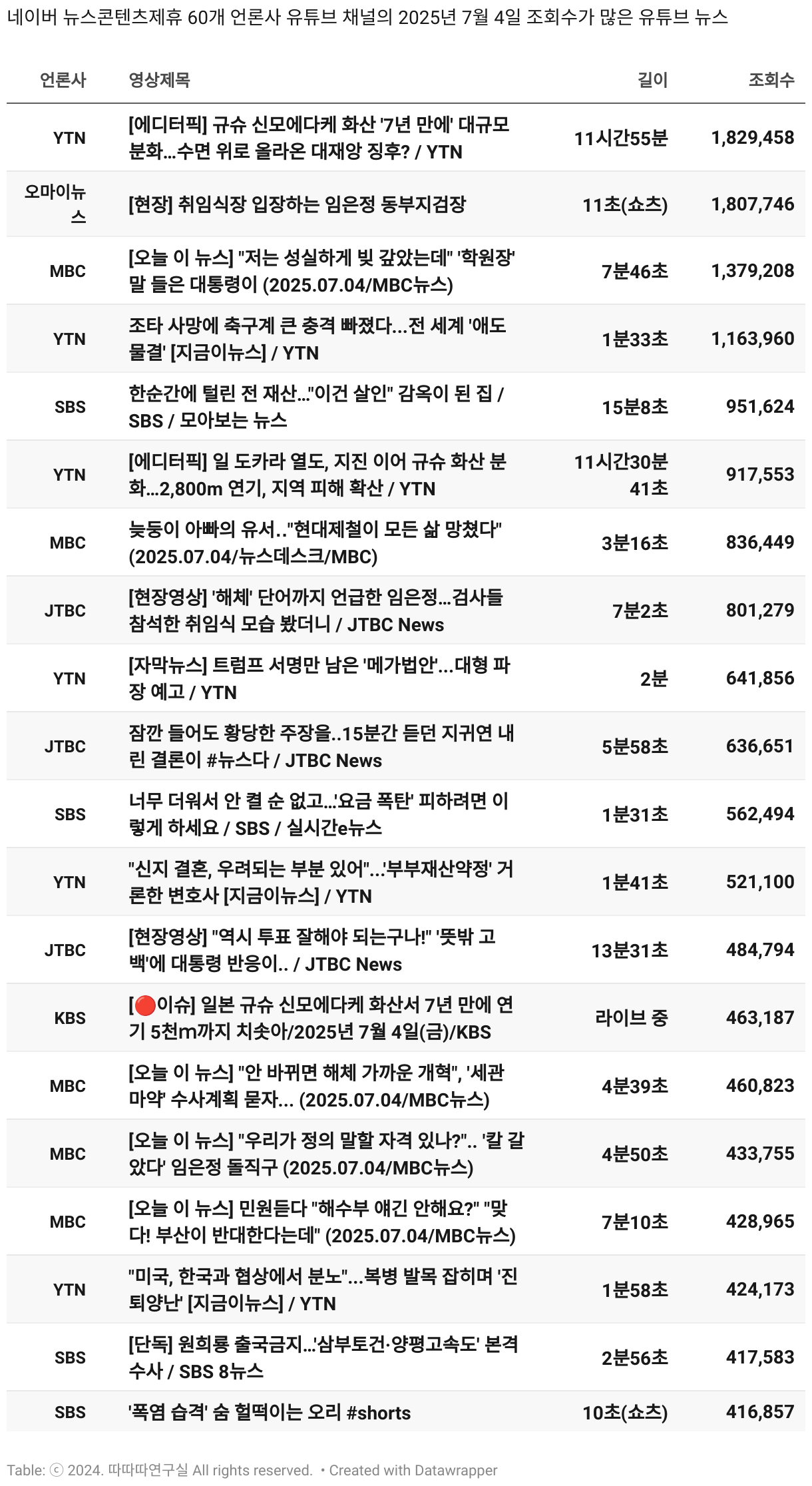 *데이터 수집 기간 : 2024년 6월 10일 *데이터 수집 대상 : 네이버 뉴스콘텐츠제휴 60개 언론사. 종합일간지 10개(경향신문, 국민일보, 동아일보, 문화일보, 서울신문, 세계일보, 조선일보, 중앙일보, 한겨레신문, 한국일보), 방송/통신사 14개(뉴스1, 뉴시스, 연합뉴스, 연합뉴스TV, 채널A, 한국경제TV, JTBC, KBS, MBC, MBN, SBS, SBS BIZ, TV조선, YTN), 경제지 11개(매일경제, 머니투데이, 비즈워치, 서울경제, 아시아경제, 이데일리, 조선비즈, 조세일보, 파이낸셜뉴스, 한국경제(유튜브제외), 헤럴드경제) 인터넷 8개(노컷뉴스, 더팩트, 데일리안, 머니S, 미디어오늘, 아이뉴스24, 오마이뉴스, 프레시안), IT 5개(디지털데일리,디지털타임스, 블로터, 전자신문, 지디넷코리아), 지역 12개(강원도민일보, 강원일보, 경기일보, 국제신문, 대구MBC, 대전일보, 매일신문, 부산일보, 전주MBC, CJB청주방송, JIBS, kbc광주방송)