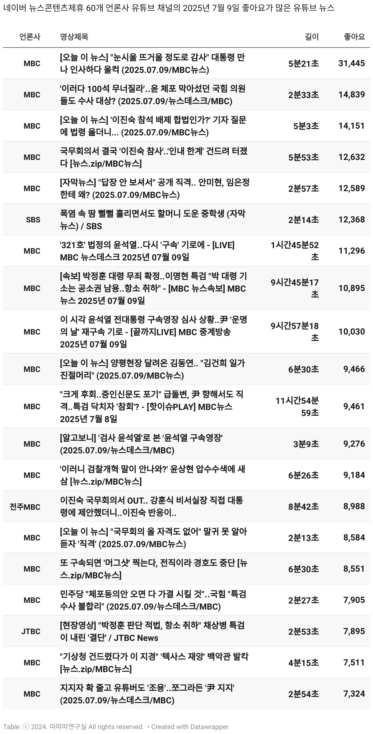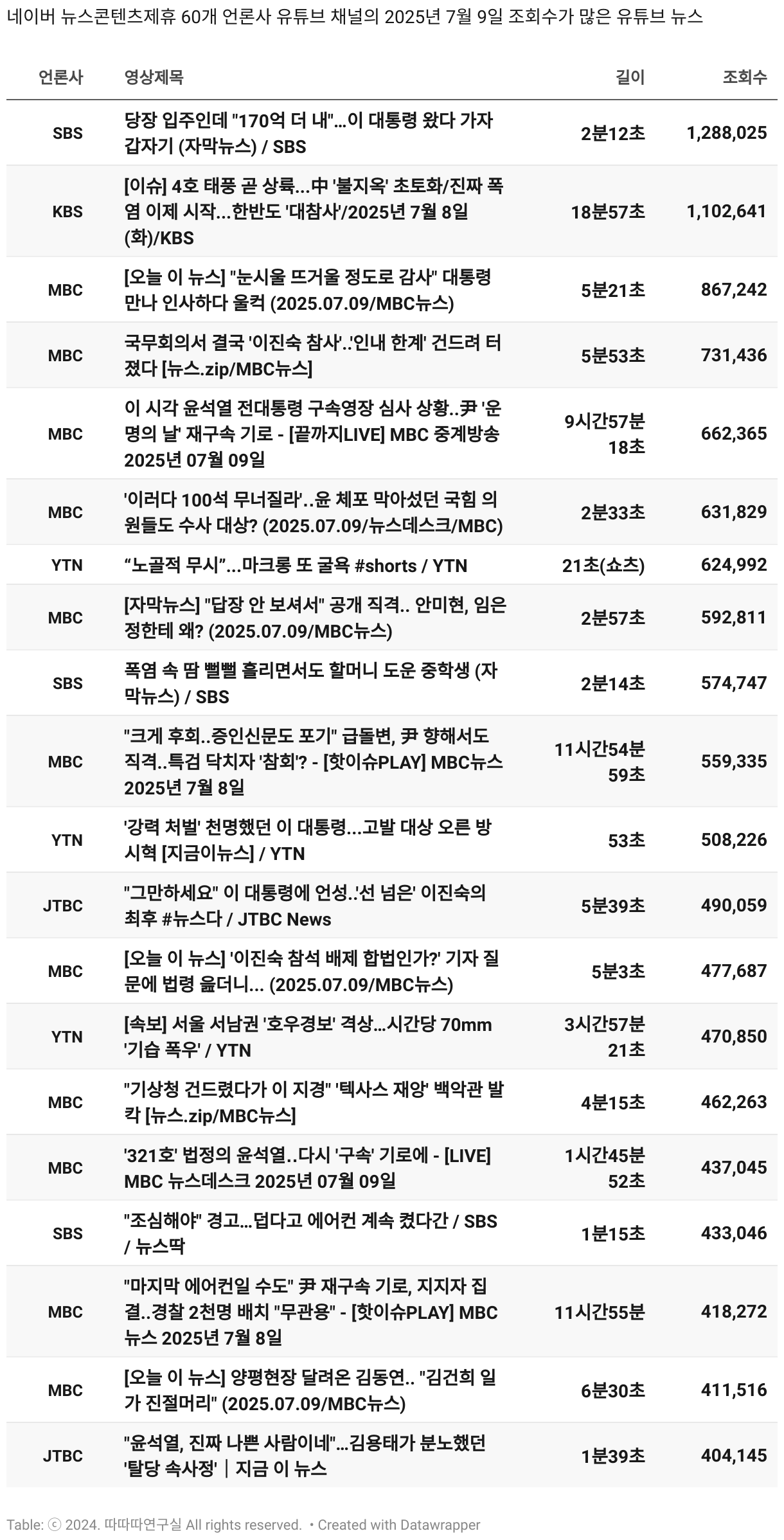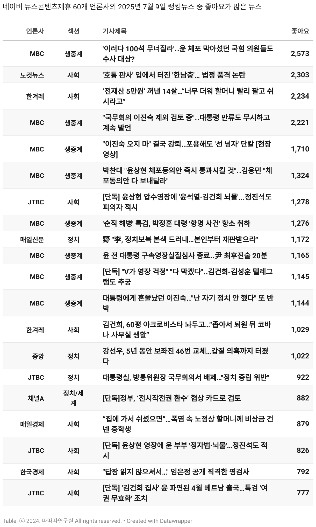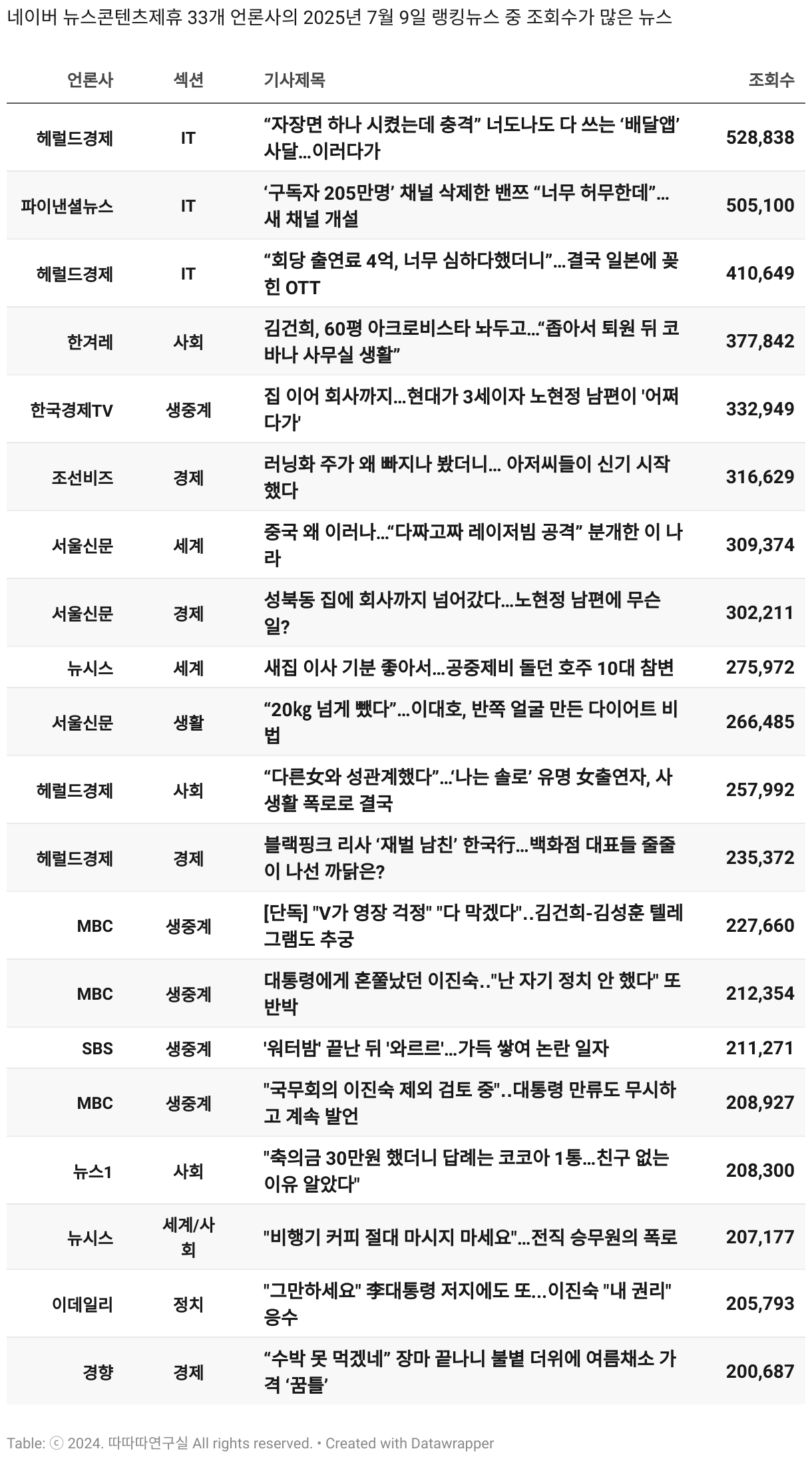 *데이터 수집 기간 : 2024년 6월 10일 *데이터 수집 대상 : 네이버 뉴스콘텐츠제휴 60개 언론사. 종합일간지 10개(경향신문, 국민일보, 동아일보, 문화일보, 서울신문, 세계일보, 조선일보, 중앙일보, 한겨레신문, 한국일보), 방송/통신사 14개(뉴스1, 뉴시스, 연합뉴스, 연합뉴스TV, 채널A, 한국경제TV, JTBC, KBS, MBC, MBN, SBS, SBS BIZ, TV조선, YTN), 경제지 11개(매일경제, 머니투데이, 비즈워치, 서울경제, 아시아경제, 이데일리, 조선비즈, 조세일보, 파이낸셜뉴스, 한국경제(유튜브제외), 헤럴드경제) 인터넷 8개(노컷뉴스, 더팩트, 데일리안, 머니S, 미디어오늘, 아이뉴스24, 오마이뉴스, 프레시안), IT 5개(디지털데일리,디지털타임스, 블로터, 전자신문, 지디넷코리아), 지역 12개(강원도민일보, 강원일보, 경기일보, 국제신문, 대구MBC, 대전일보, 매일신문, 부산일보, 전주MBC, CJB청주방송, JIBS, kbc광주방송)