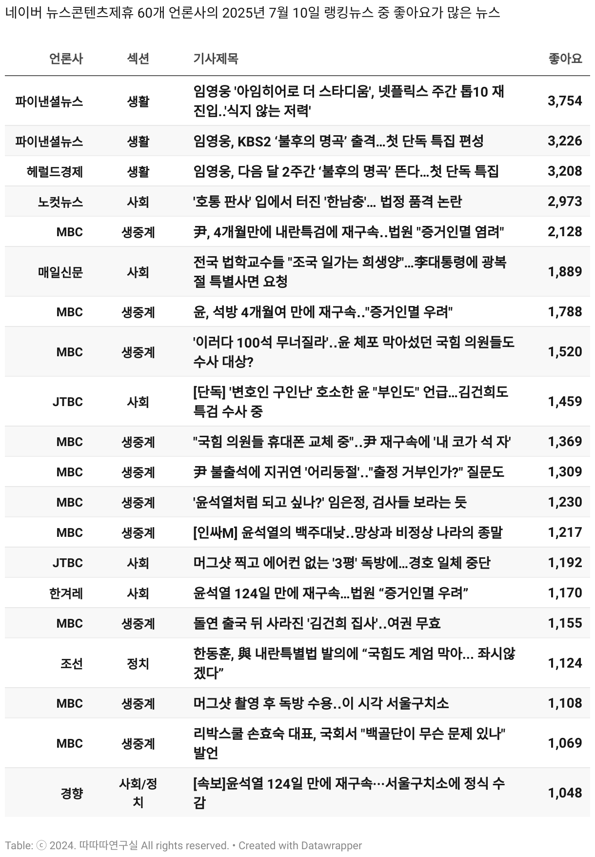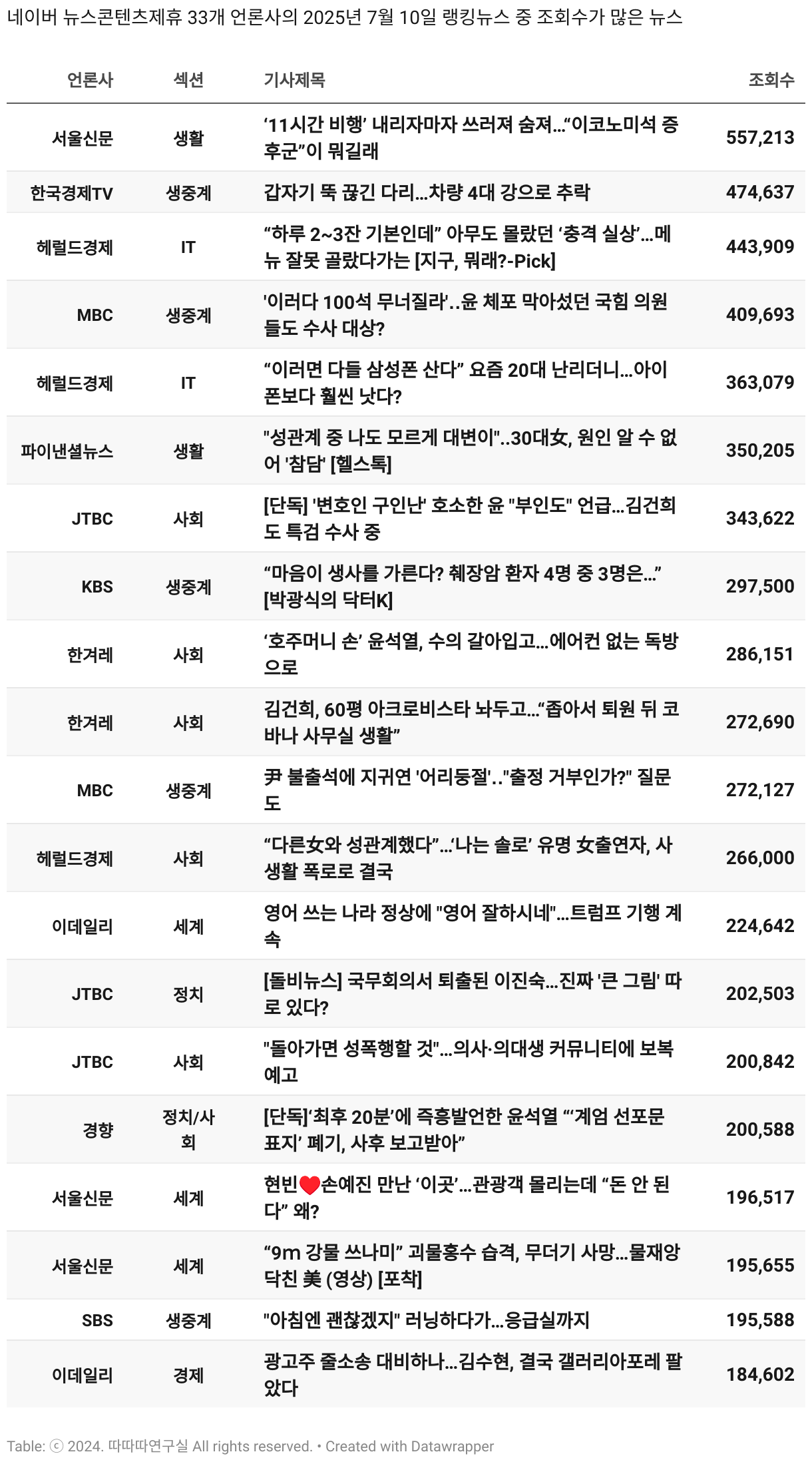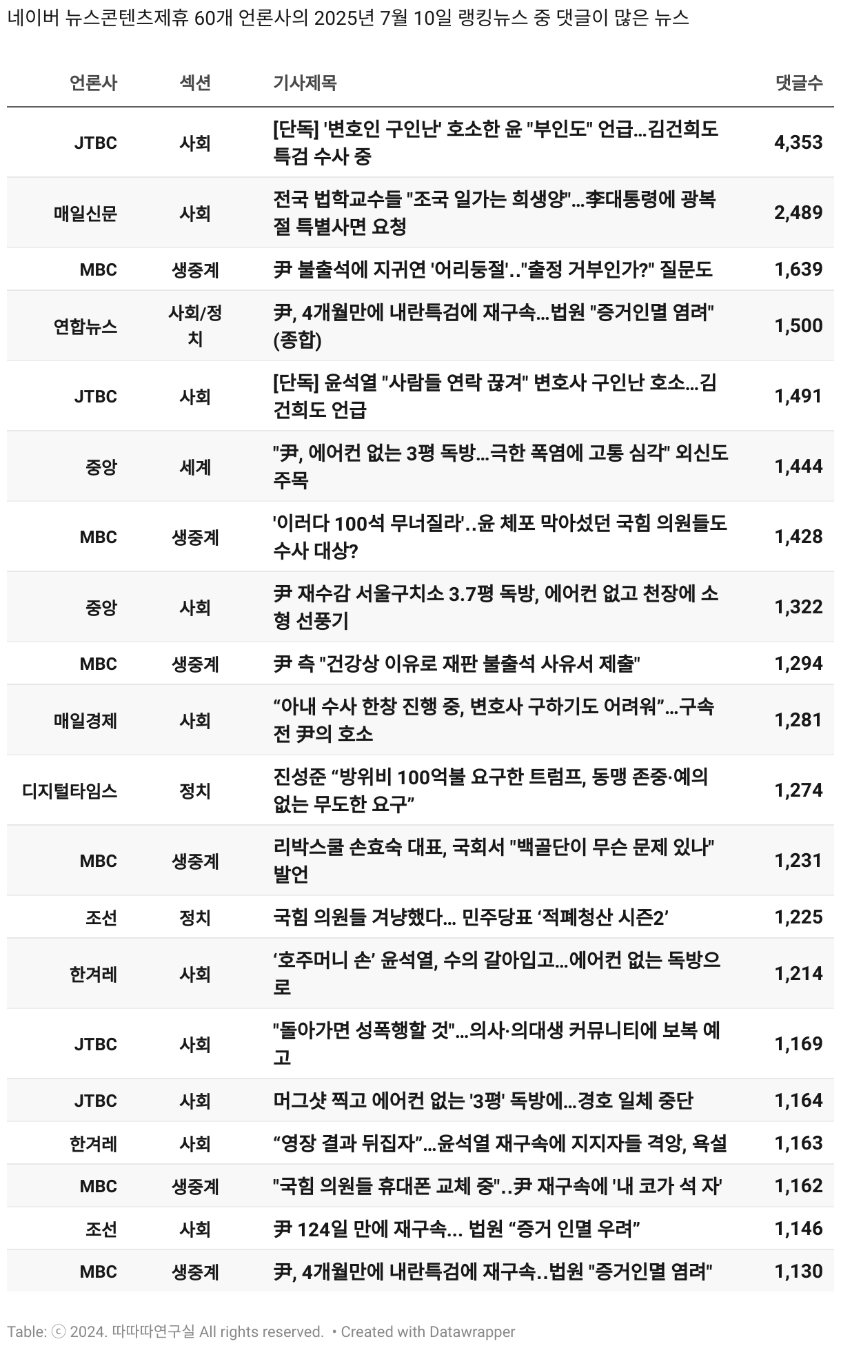 *데이터 수집 기간 : 2024년 6월 10일 *데이터 수집 대상 : 네이버 뉴스콘텐츠제휴 60개 언론사. 종합일간지 10개(경향신문, 국민일보, 동아일보, 문화일보, 서울신문, 세계일보, 조선일보, 중앙일보, 한겨레신문, 한국일보), 방송/통신사 14개(뉴스1, 뉴시스, 연합뉴스, 연합뉴스TV, 채널A, 한국경제TV, JTBC, KBS, MBC, MBN, SBS, SBS BIZ, TV조선, YTN), 경제지 11개(매일경제, 머니투데이, 비즈워치, 서울경제, 아시아경제, 이데일리, 조선비즈, 조세일보, 파이낸셜뉴스, 한국경제(유튜브제외), 헤럴드경제) 인터넷 8개(노컷뉴스, 더팩트, 데일리안, 머니S, 미디어오늘, 아이뉴스24, 오마이뉴스, 프레시안), IT 5개(디지털데일리,디지털타임스, 블로터, 전자신문, 지디넷코리아), 지역 12개(강원도민일보, 강원일보, 경기일보, 국제신문, 대구MBC, 대전일보, 매일신문, 부산일보, 전주MBC, CJB청주방송, JIBS, kbc광주방송)