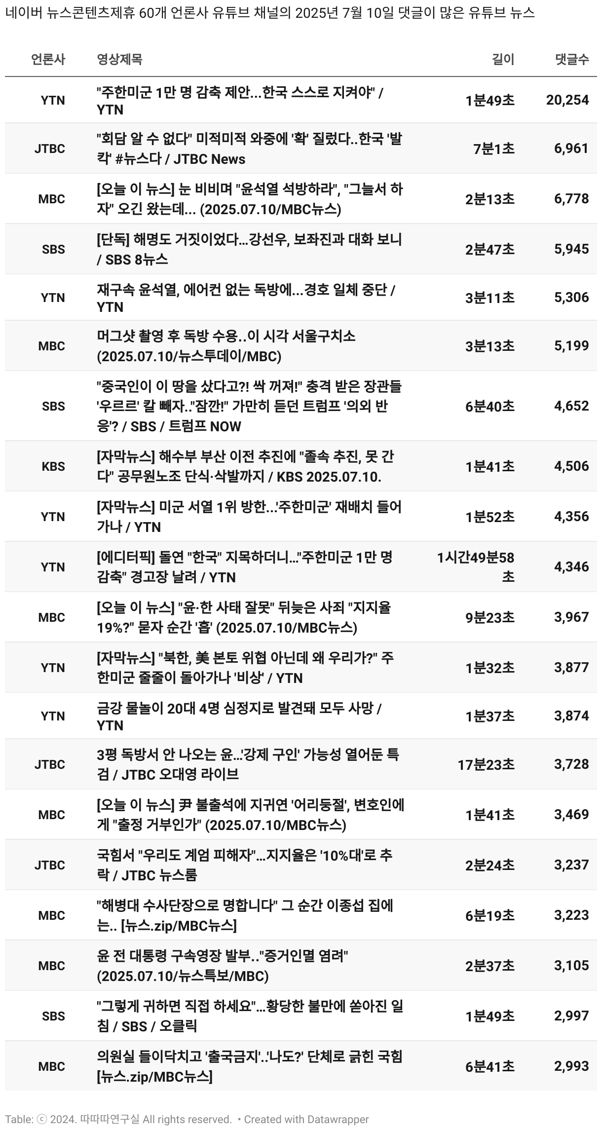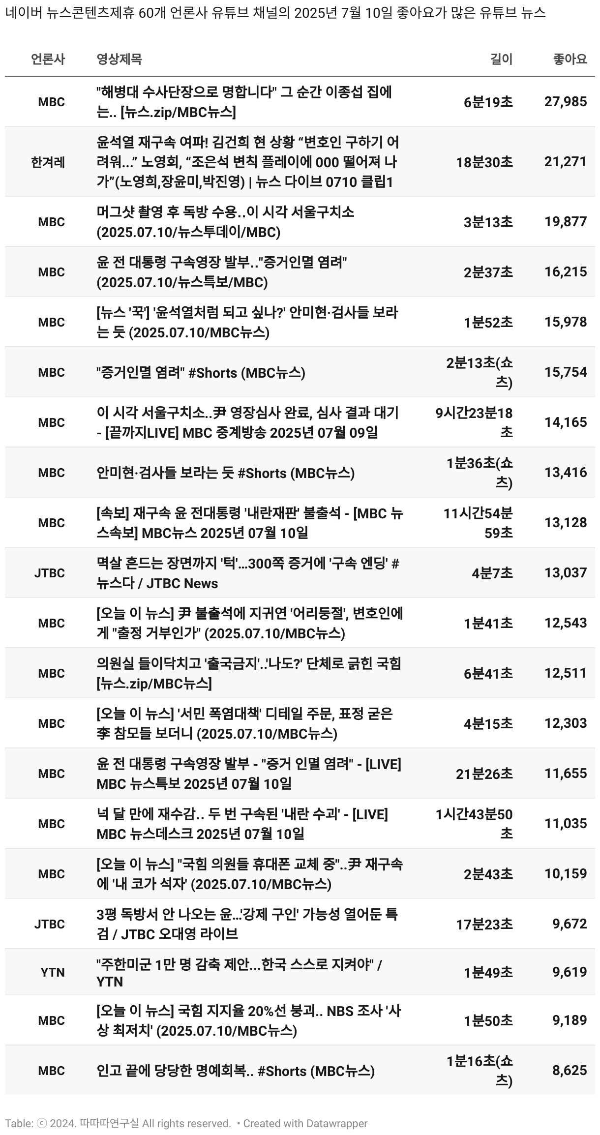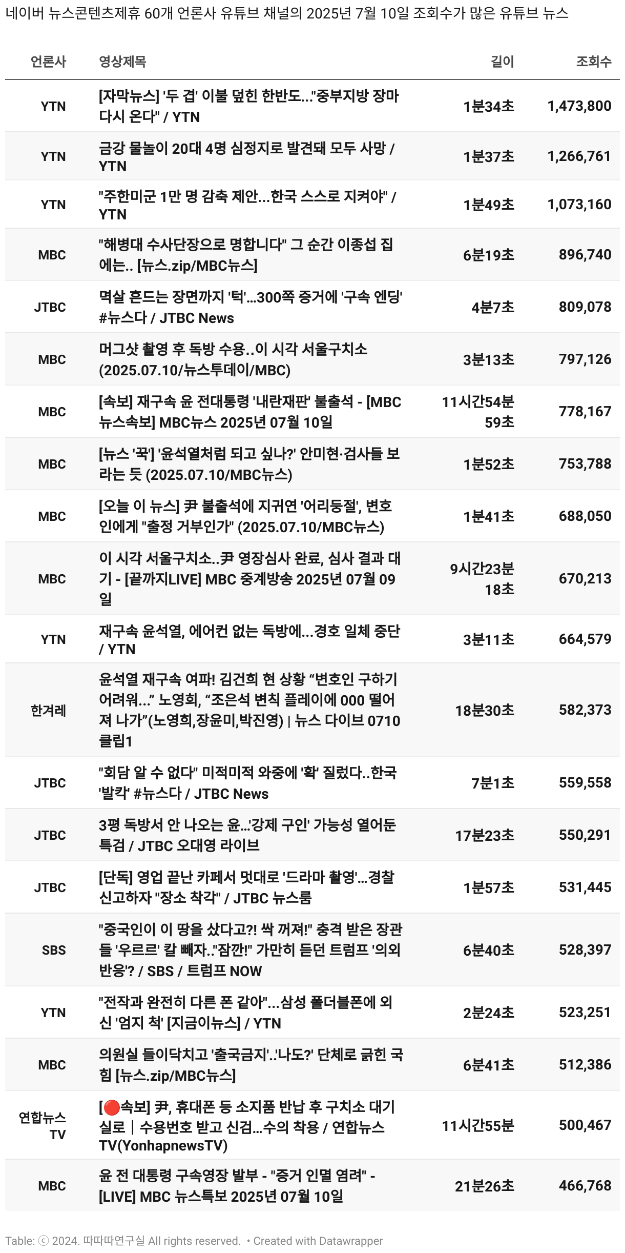 *데이터 수집 기간 : 2024년 6월 10일 *데이터 수집 대상 : 네이버 뉴스콘텐츠제휴 60개 언론사. 종합일간지 10개(경향신문, 국민일보, 동아일보, 문화일보, 서울신문, 세계일보, 조선일보, 중앙일보, 한겨레신문, 한국일보), 방송/통신사 14개(뉴스1, 뉴시스, 연합뉴스, 연합뉴스TV, 채널A, 한국경제TV, JTBC, KBS, MBC, MBN, SBS, SBS BIZ, TV조선, YTN), 경제지 11개(매일경제, 머니투데이, 비즈워치, 서울경제, 아시아경제, 이데일리, 조선비즈, 조세일보, 파이낸셜뉴스, 한국경제(유튜브제외), 헤럴드경제) 인터넷 8개(노컷뉴스, 더팩트, 데일리안, 머니S, 미디어오늘, 아이뉴스24, 오마이뉴스, 프레시안), IT 5개(디지털데일리,디지털타임스, 블로터, 전자신문, 지디넷코리아), 지역 12개(강원도민일보, 강원일보, 경기일보, 국제신문, 대구MBC, 대전일보, 매일신문, 부산일보, 전주MBC, CJB청주방송, JIBS, kbc광주방송)